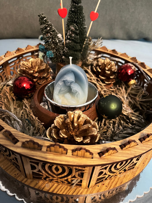 Porte bougie nativité avec déco sapins, pommes de pin, fleurs….