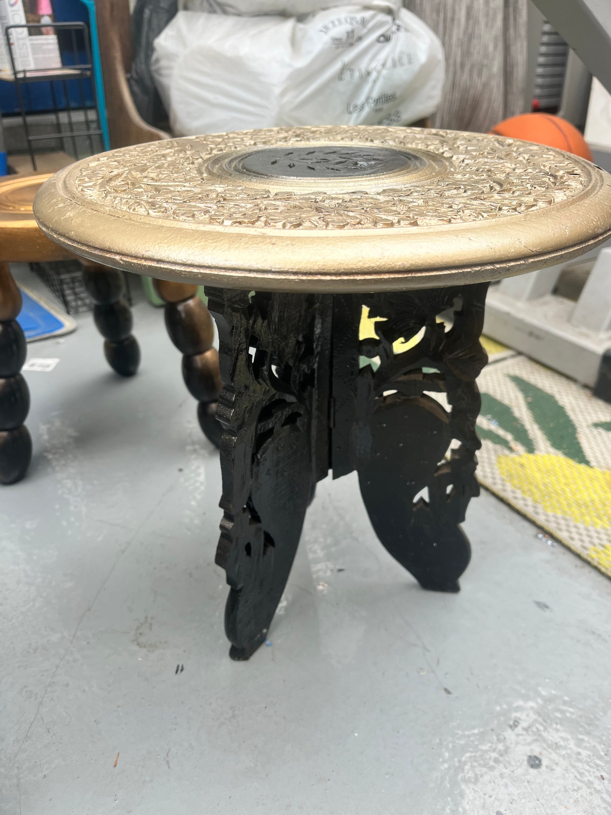 Petit banc style oriental noir et or, pouvant servir de porte plantes ou autres. Ou même de banc pour un petit enfant. Il est très beau
