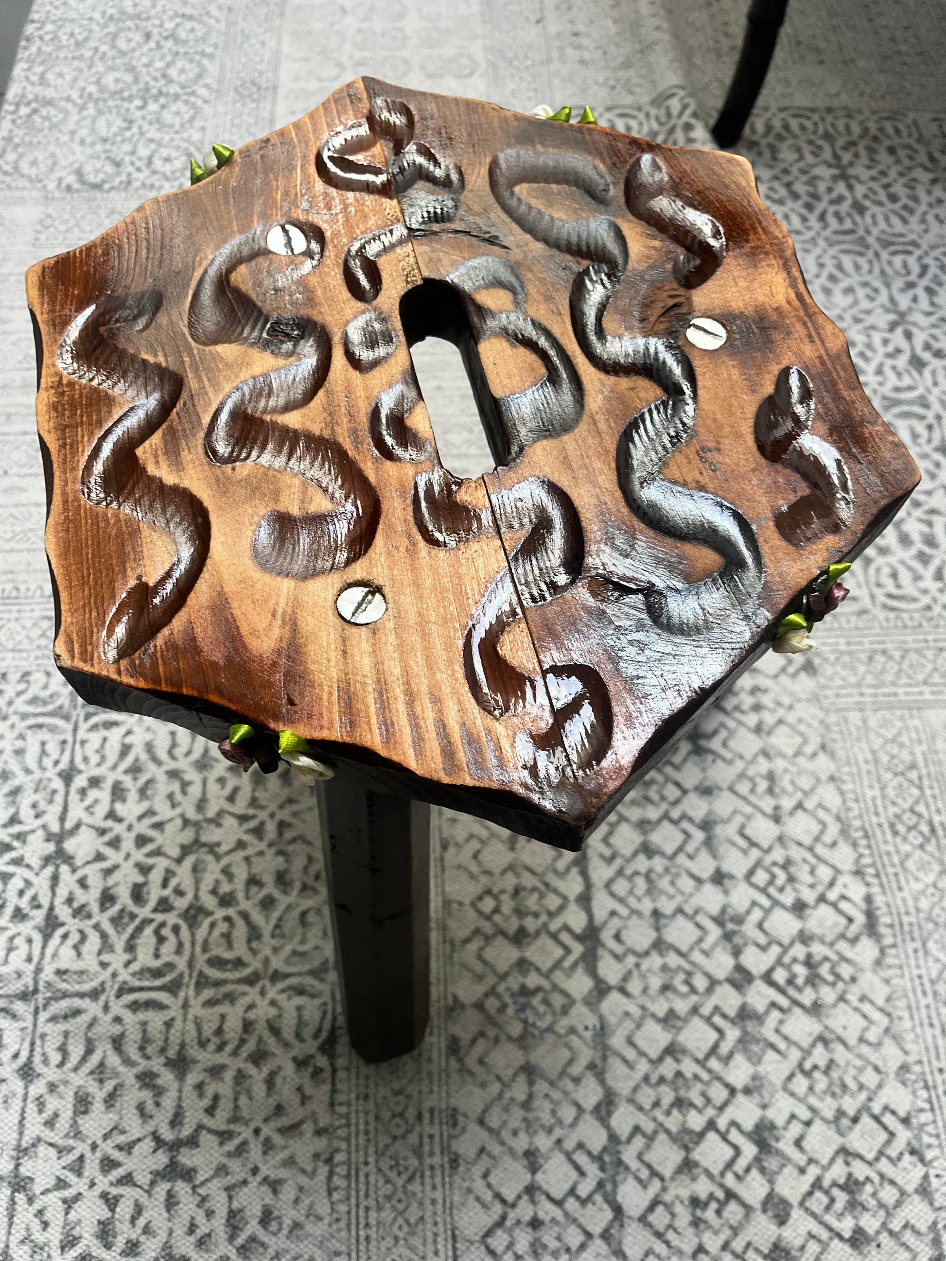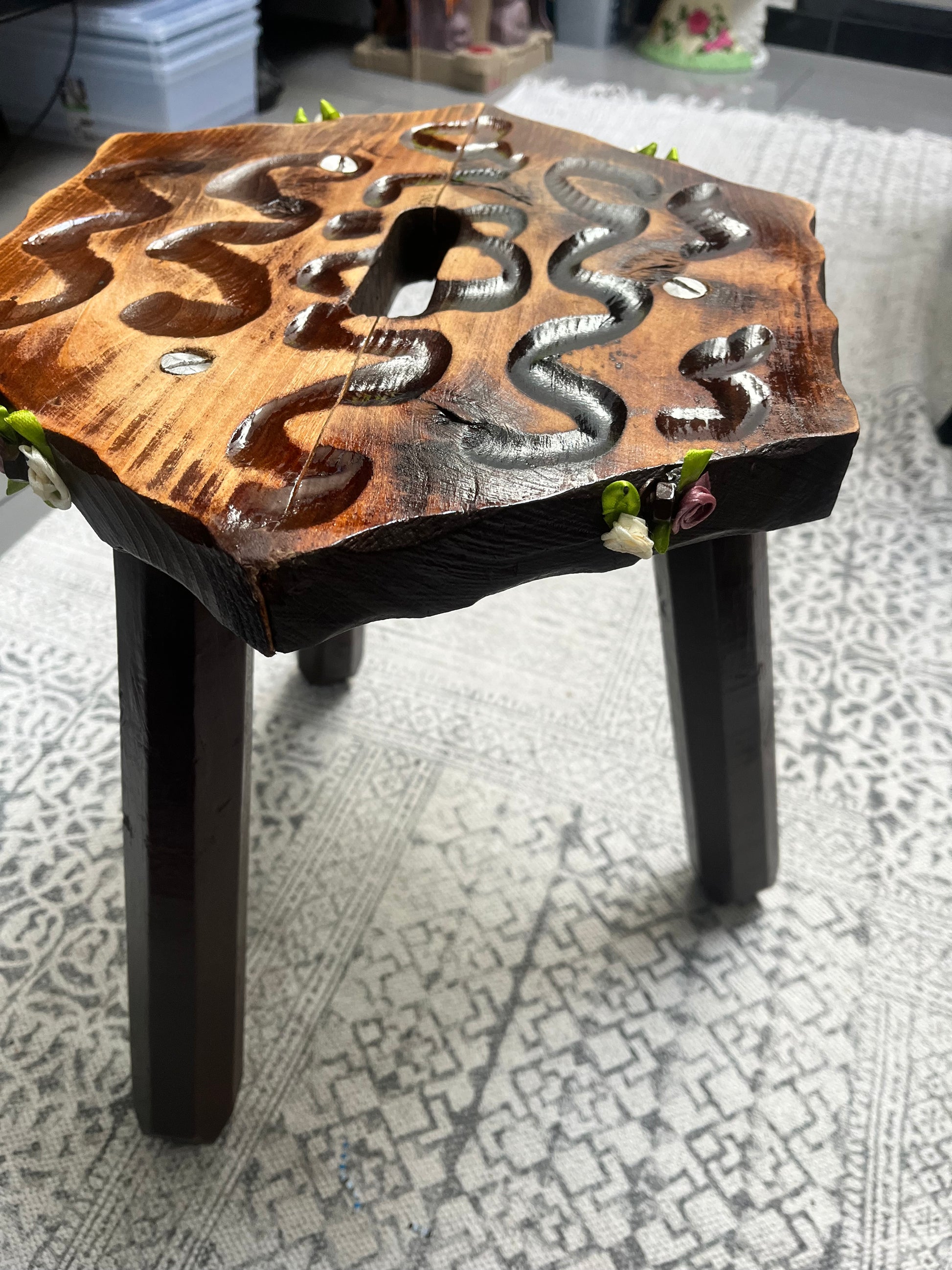 Petit banc octogonal en bois marron avec petits décors fleurs sur les côtés.
