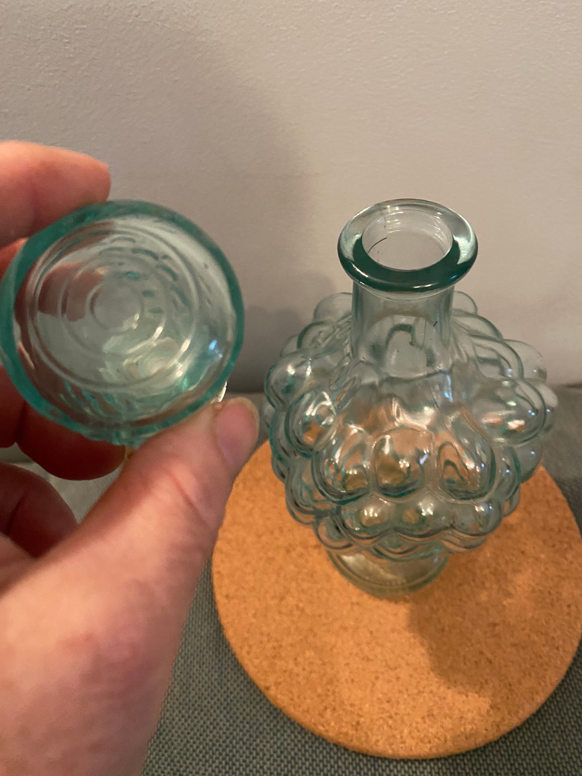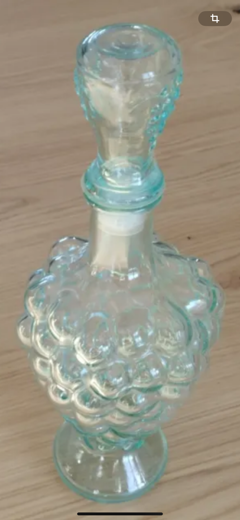 Très belle carafe en verre légèrement teintée de couleur verte, millésime année 50, peut contenir 500ml de liquide.