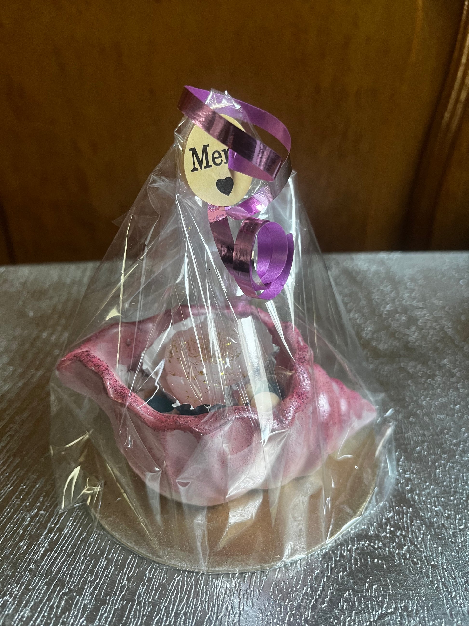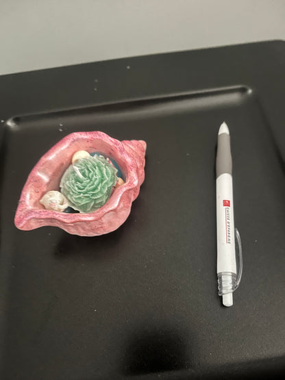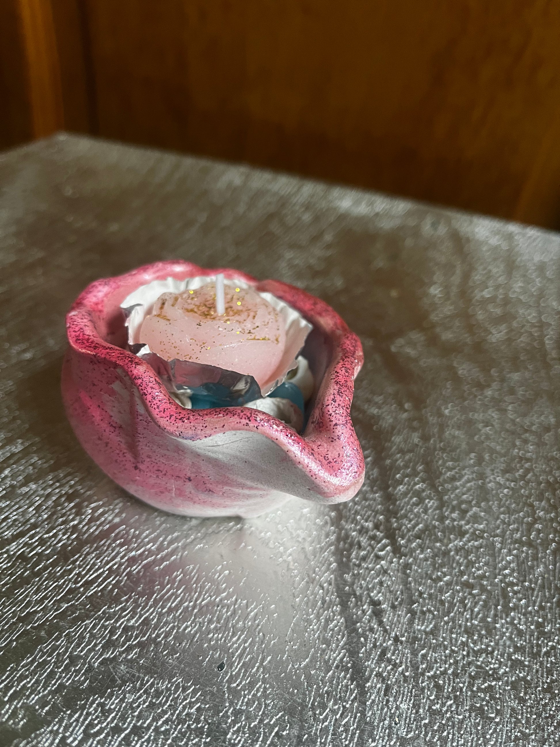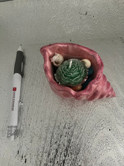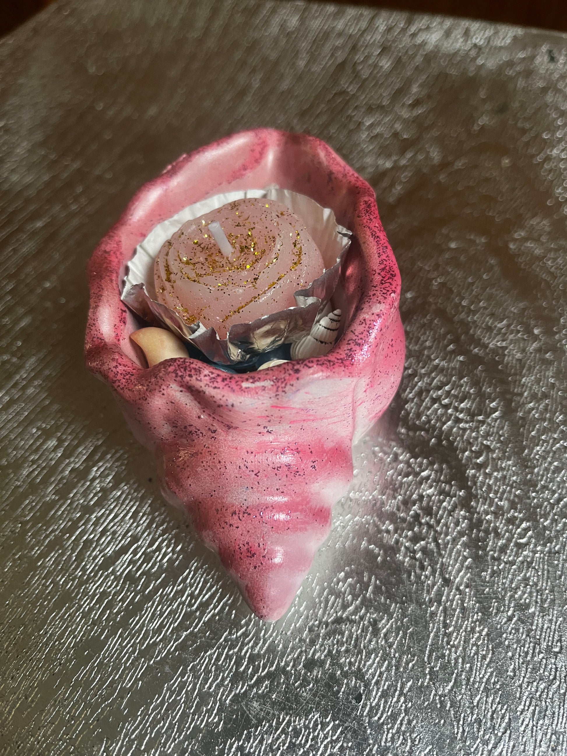 Bougie fleur dans coquille d escargot rose en plâtre.