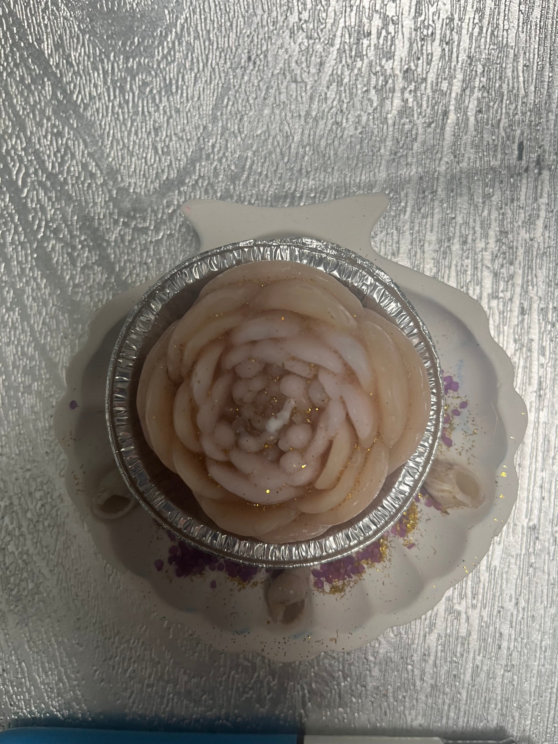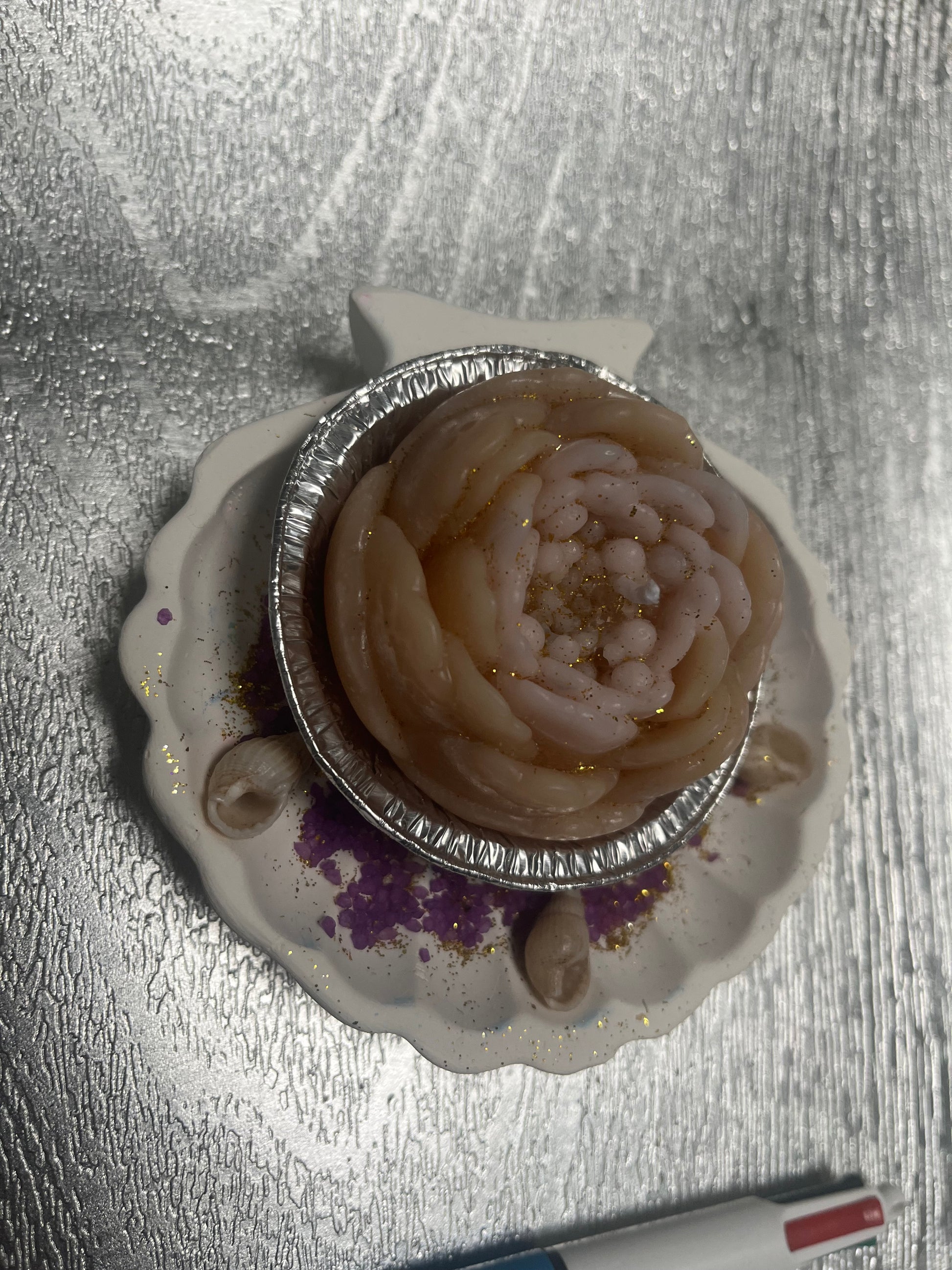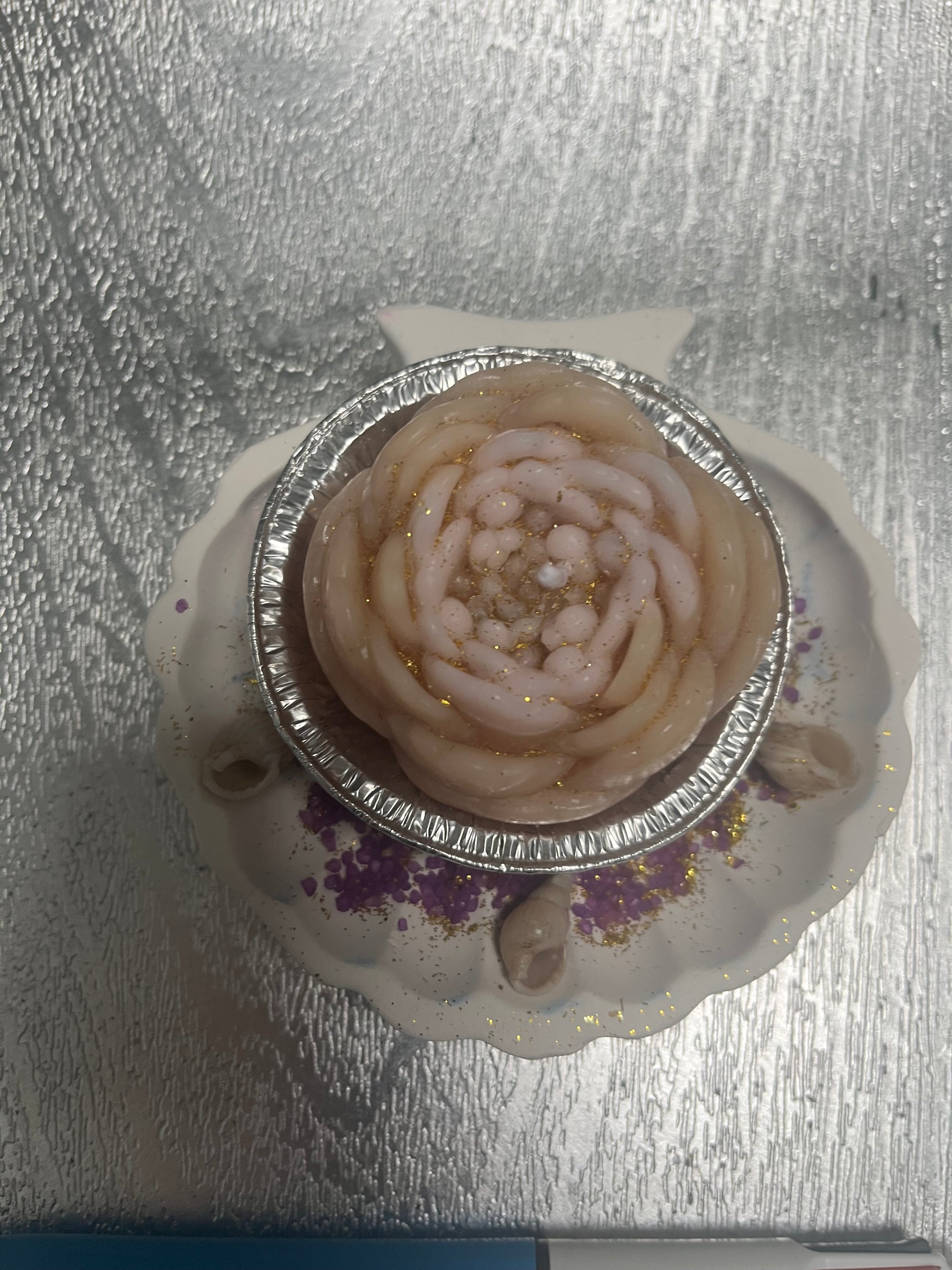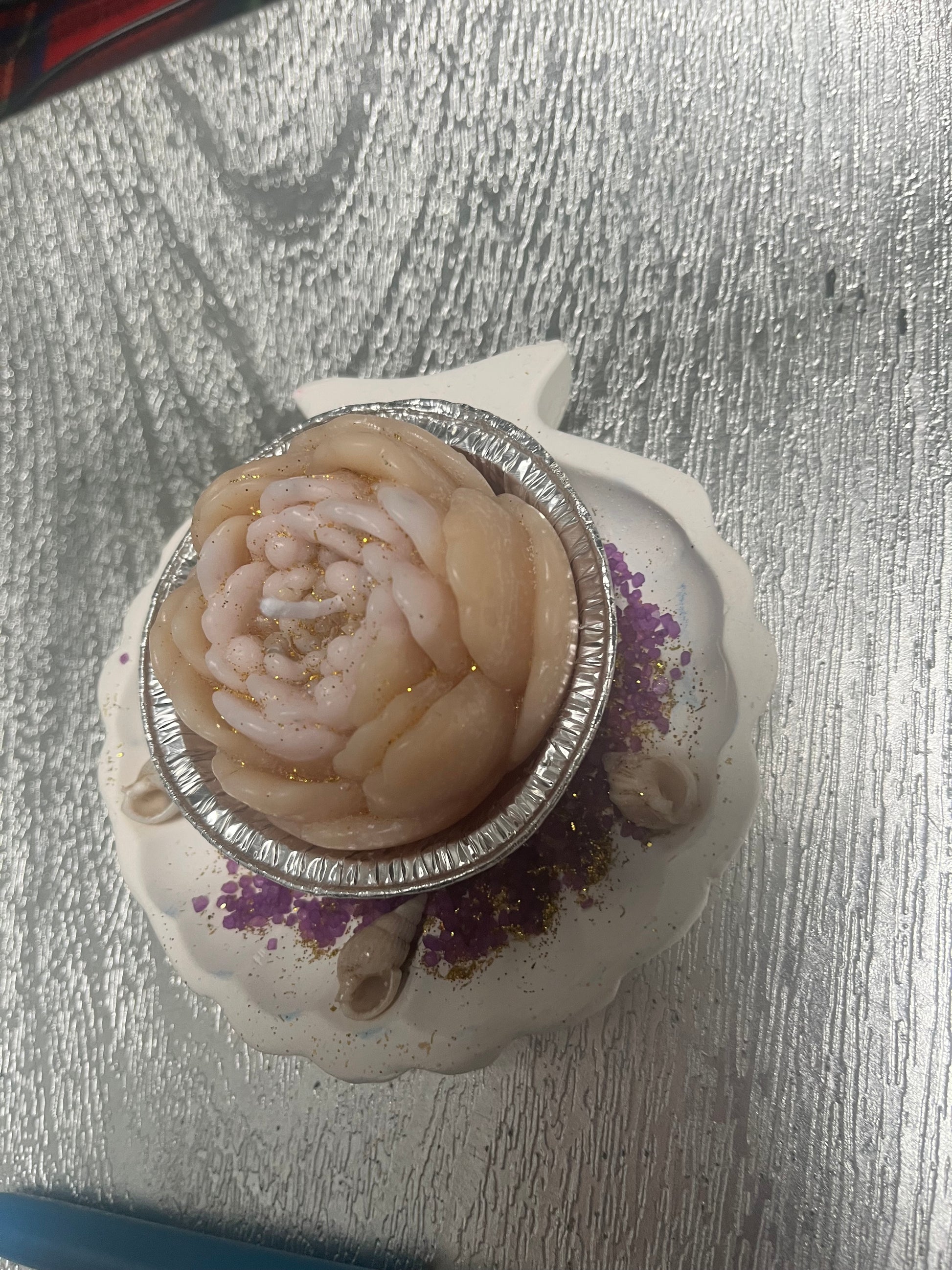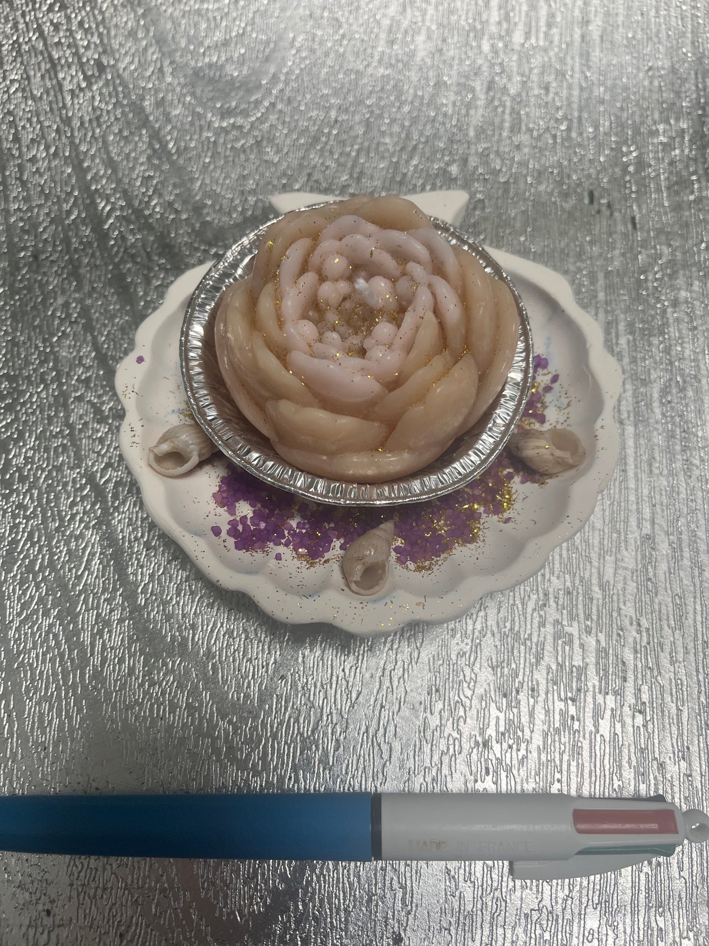 Belle bougie fleurs beige, au creux d une vraie coquille st Jacques.
