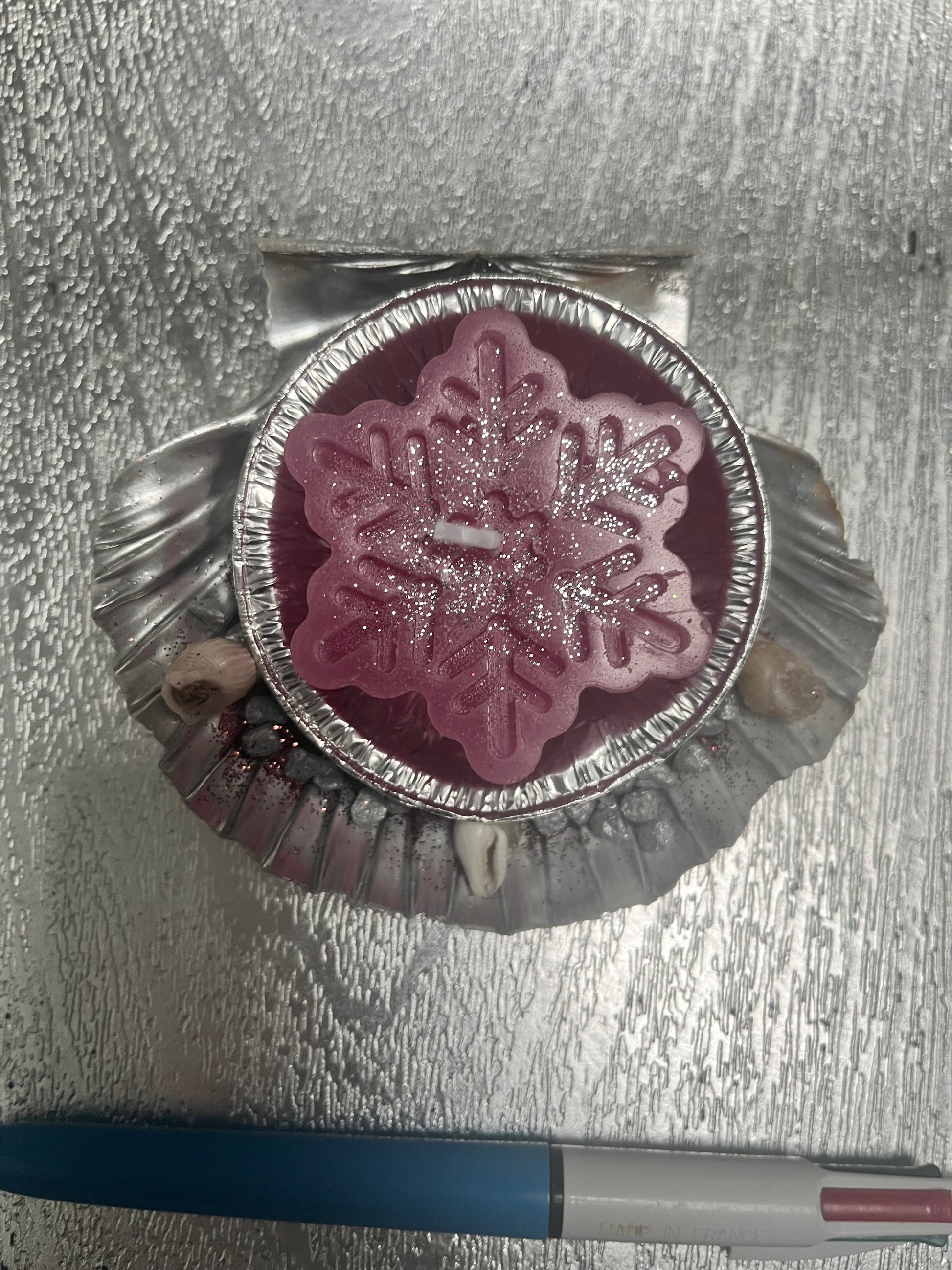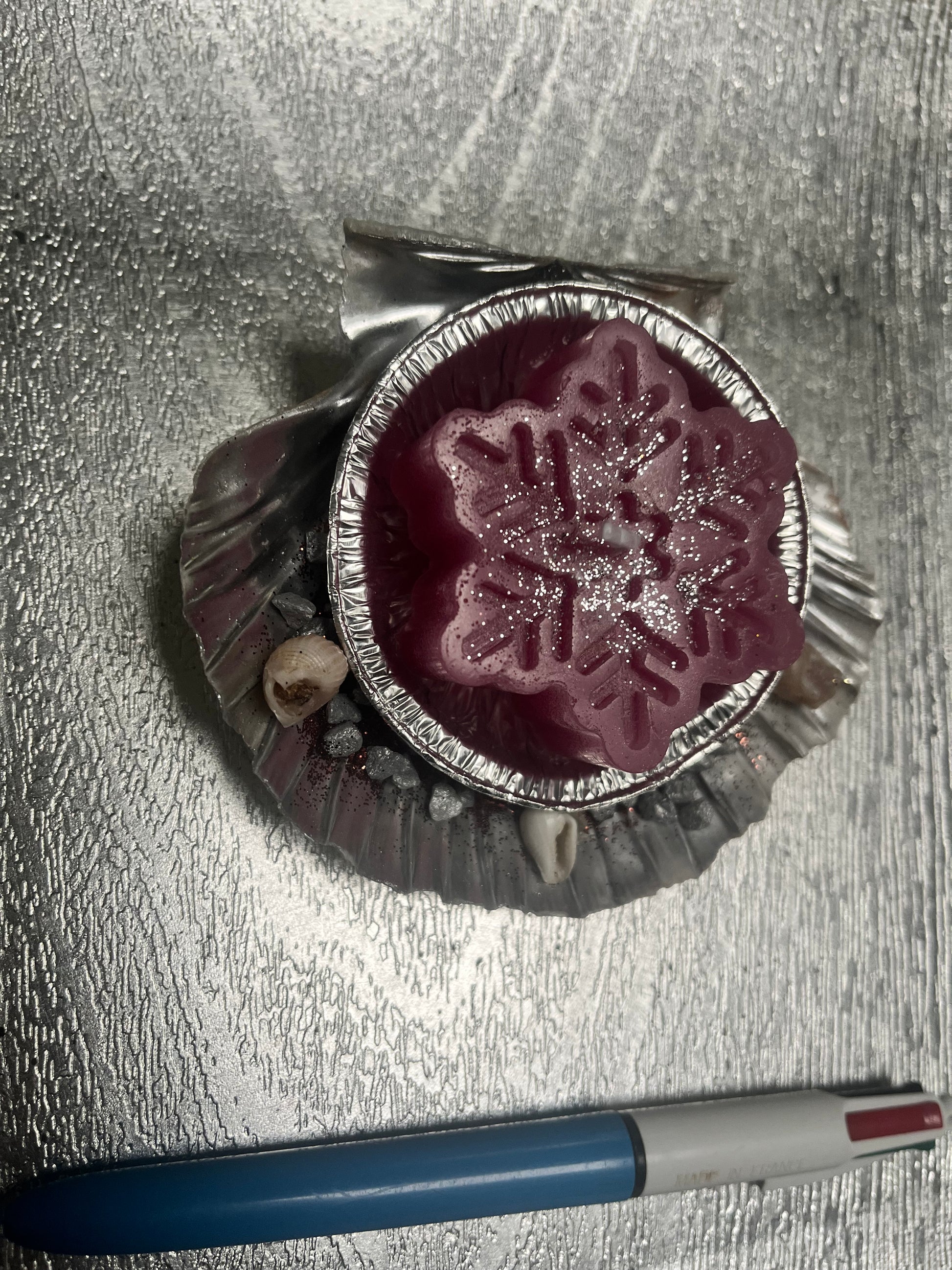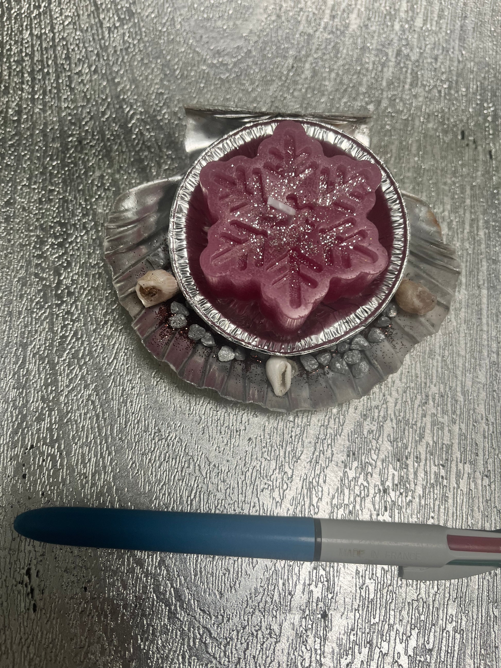 Belle bougie flocon de neige lilas posée sur une vraie coquille st Jacques.