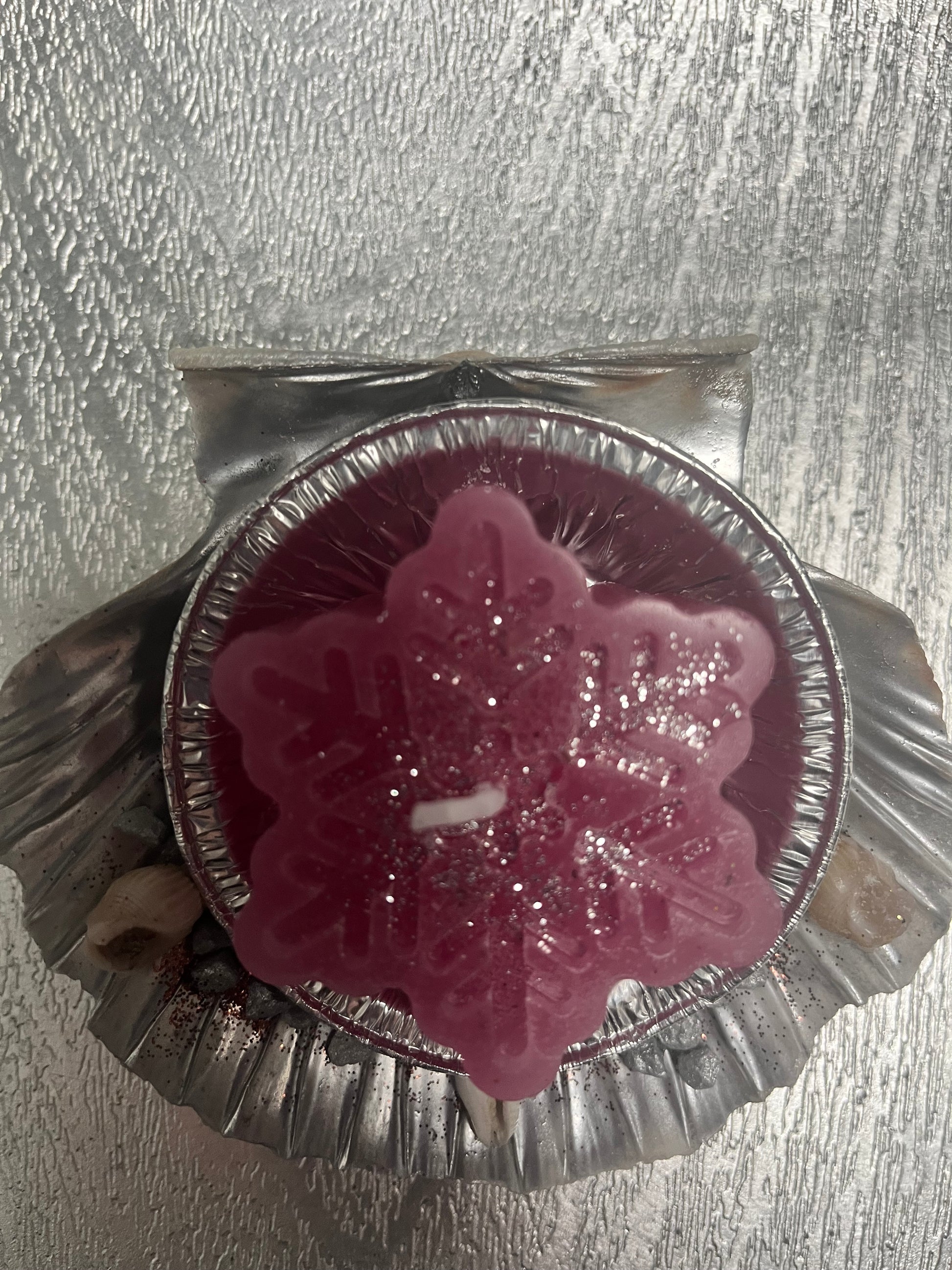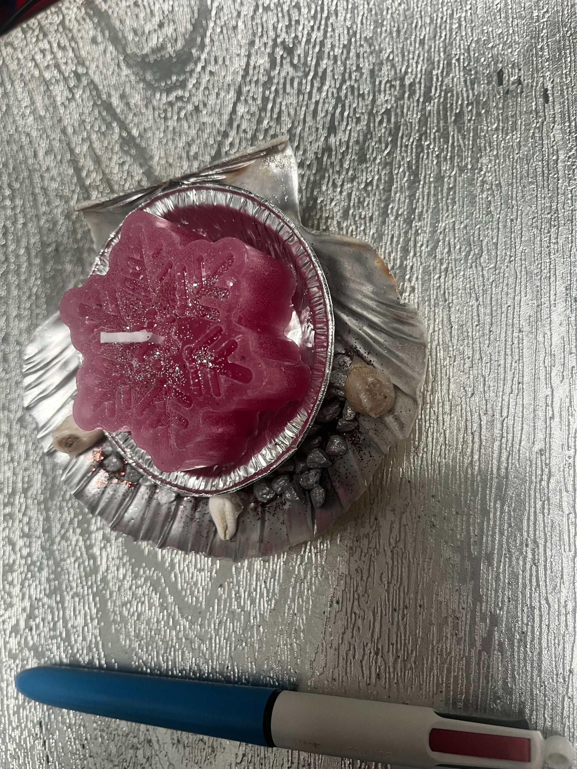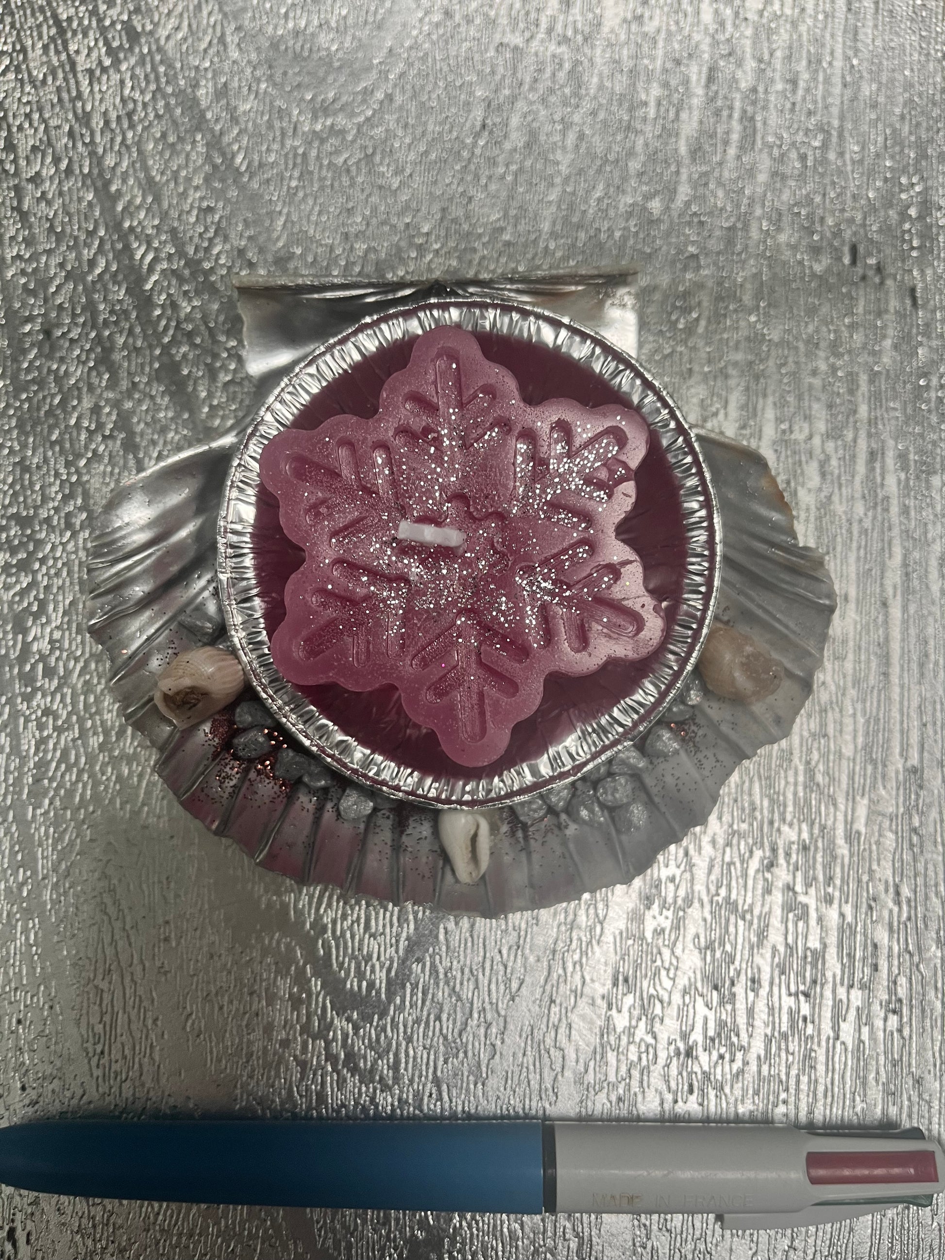 Belle bougie flocon de neige lilas posée sur une vraie coquille st Jacques.