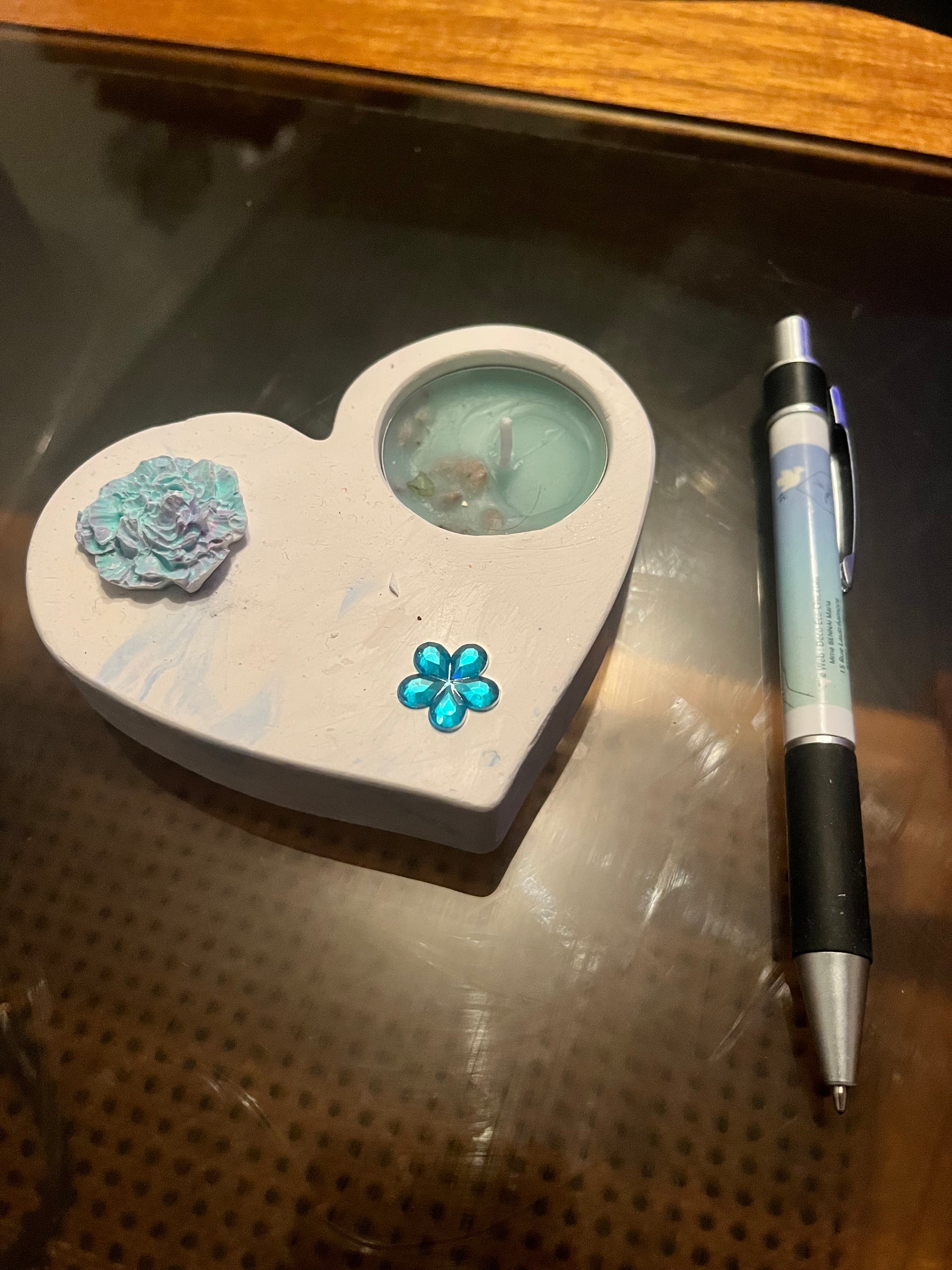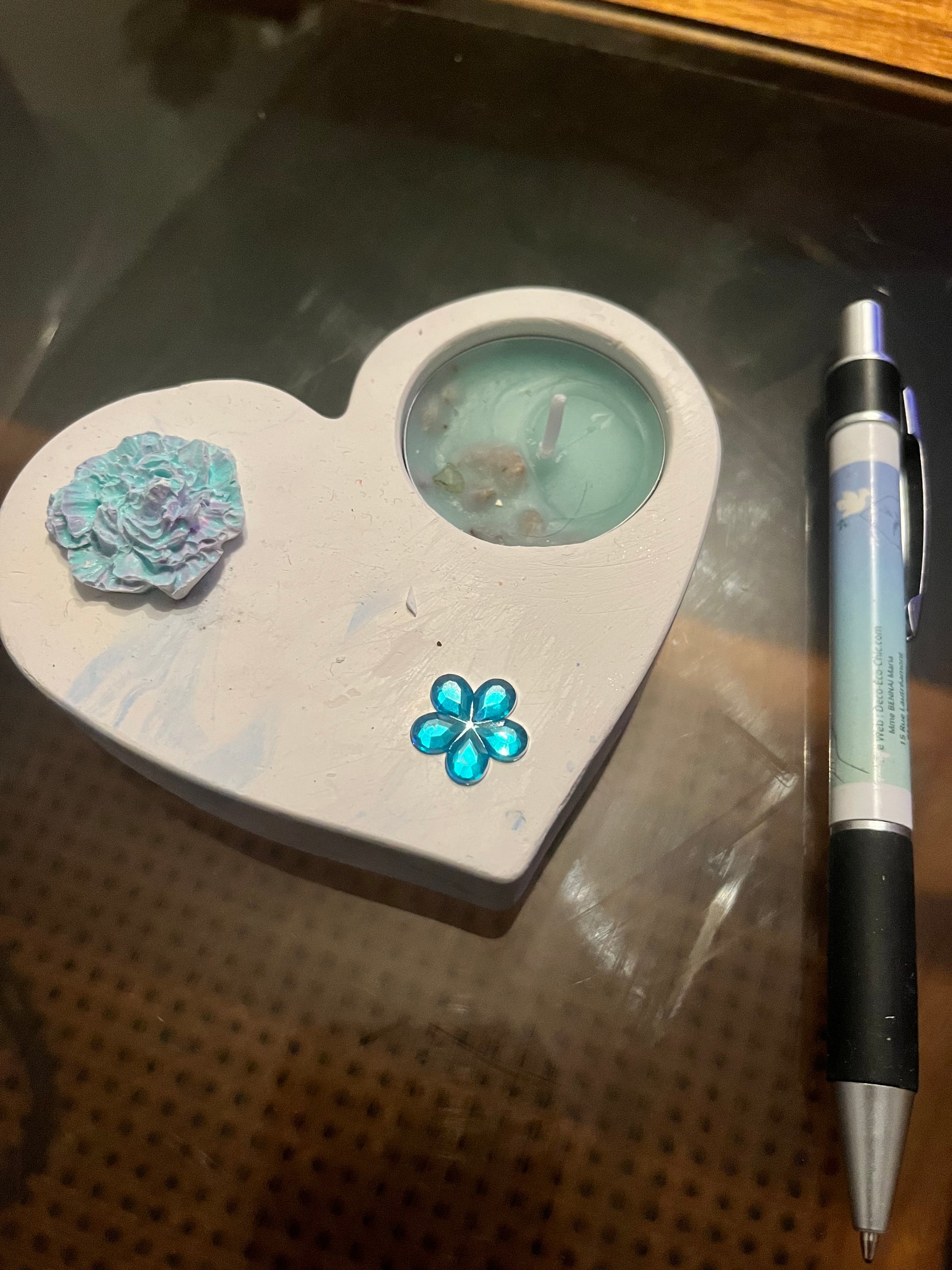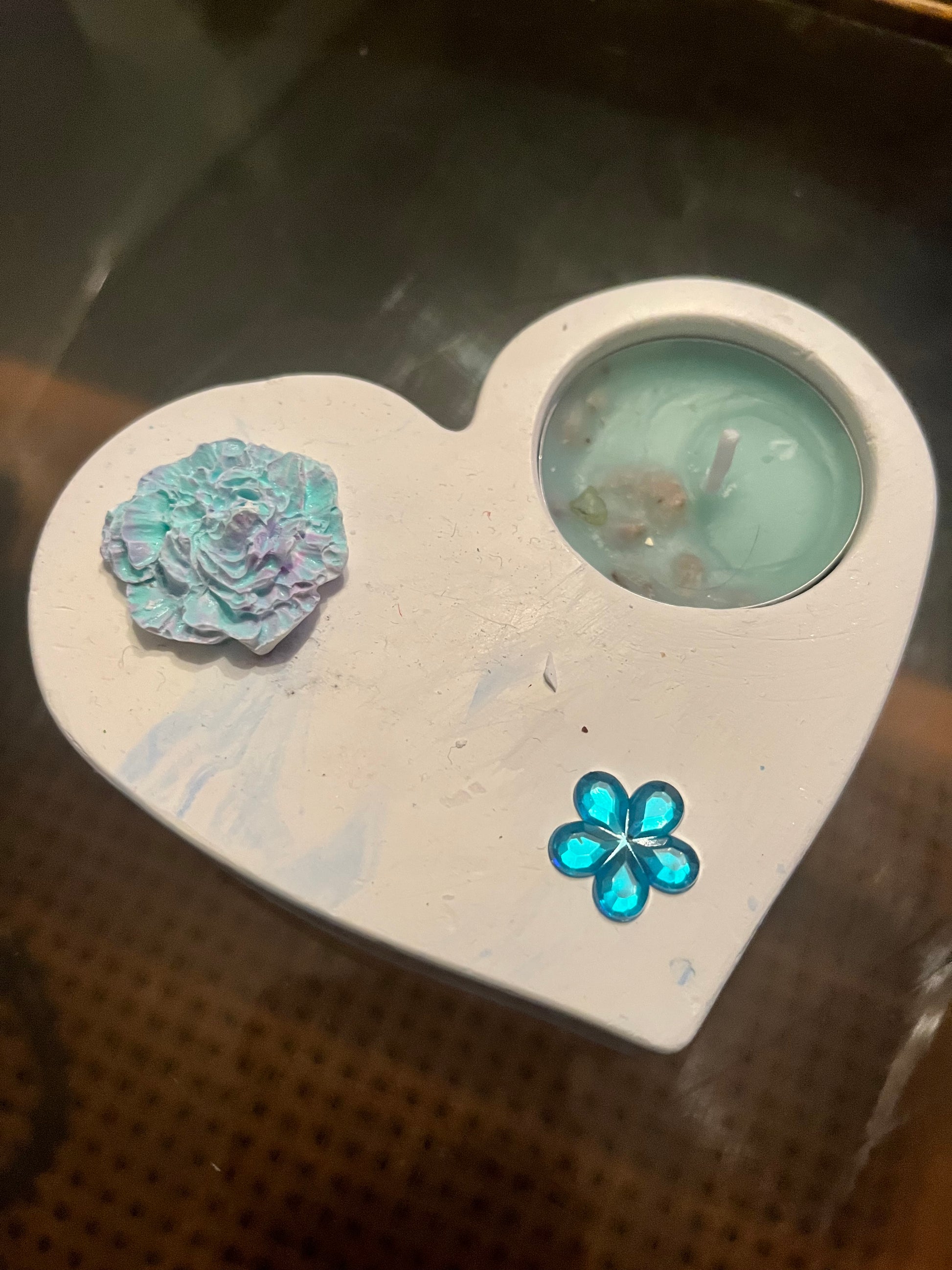 Bougie verte sur un support en cœur de plâtre blanc et décos fleurs.
