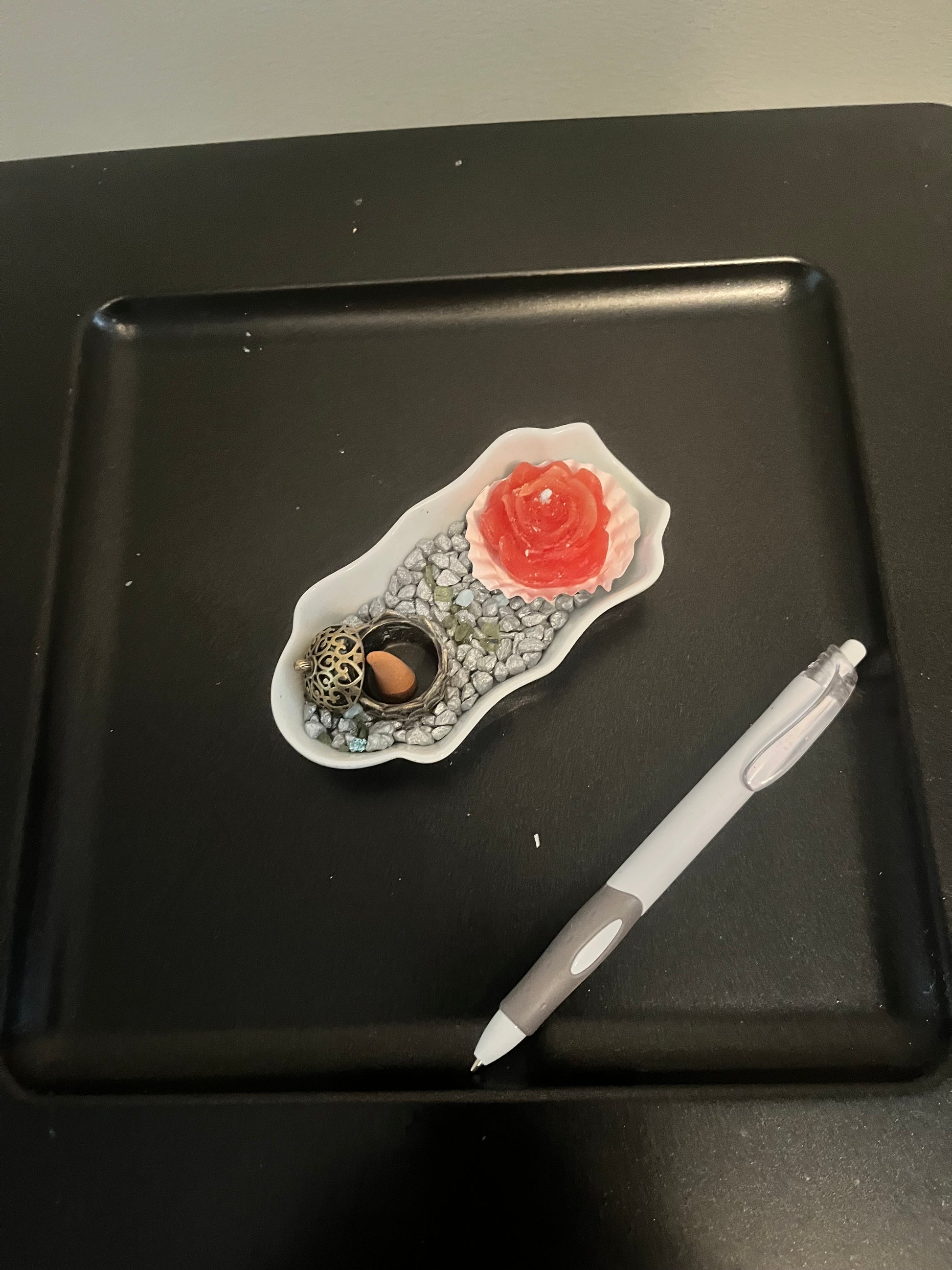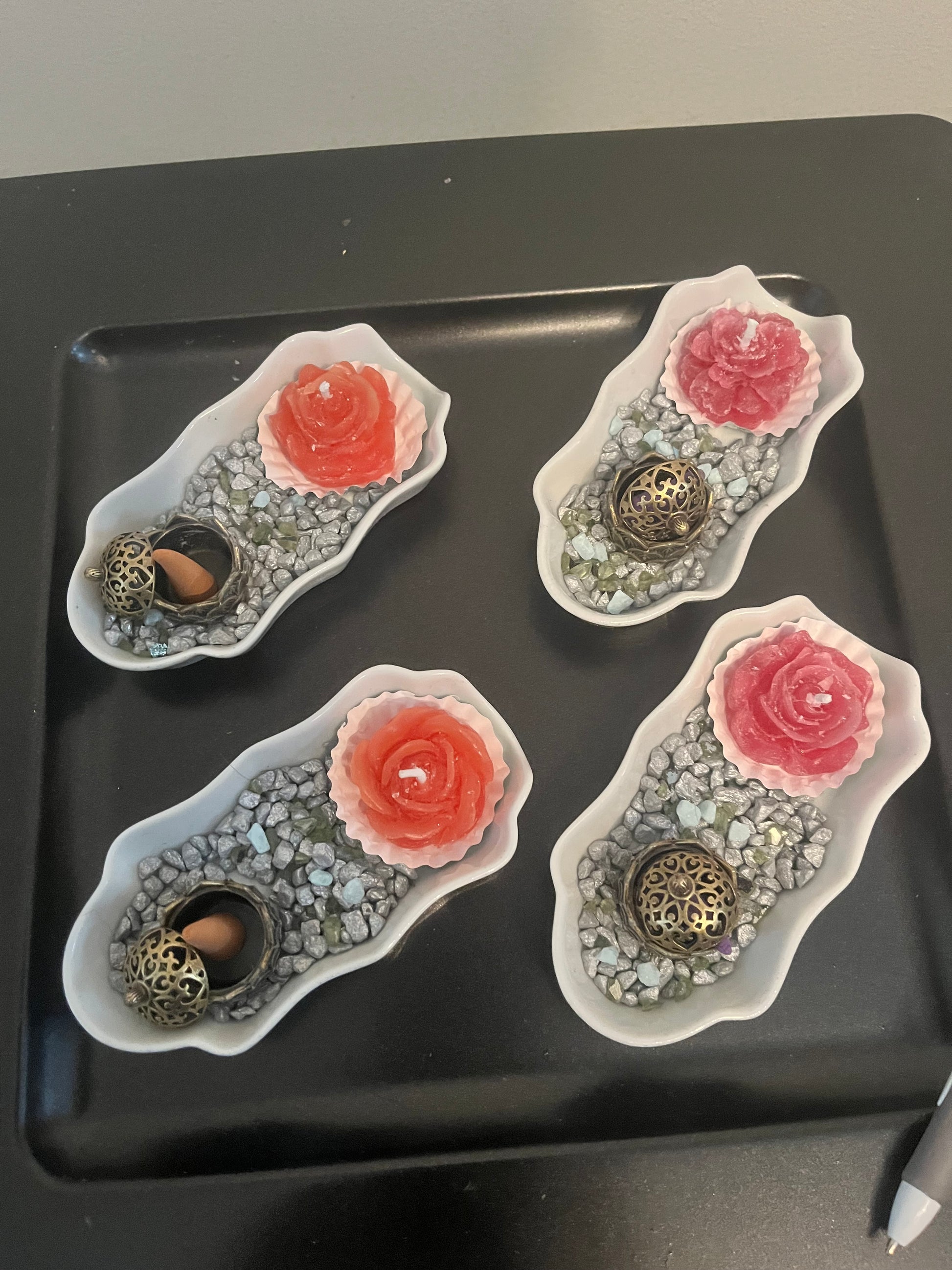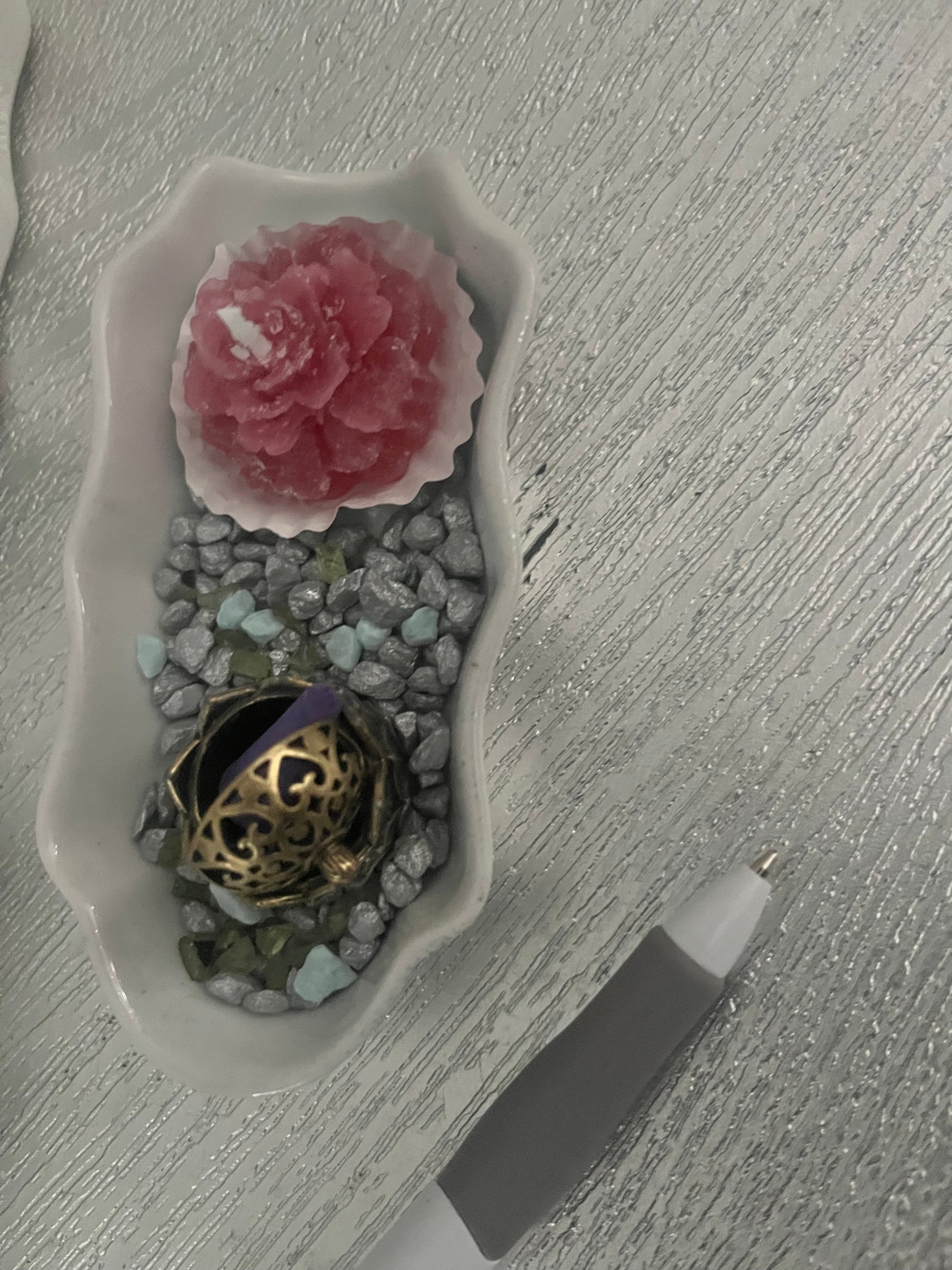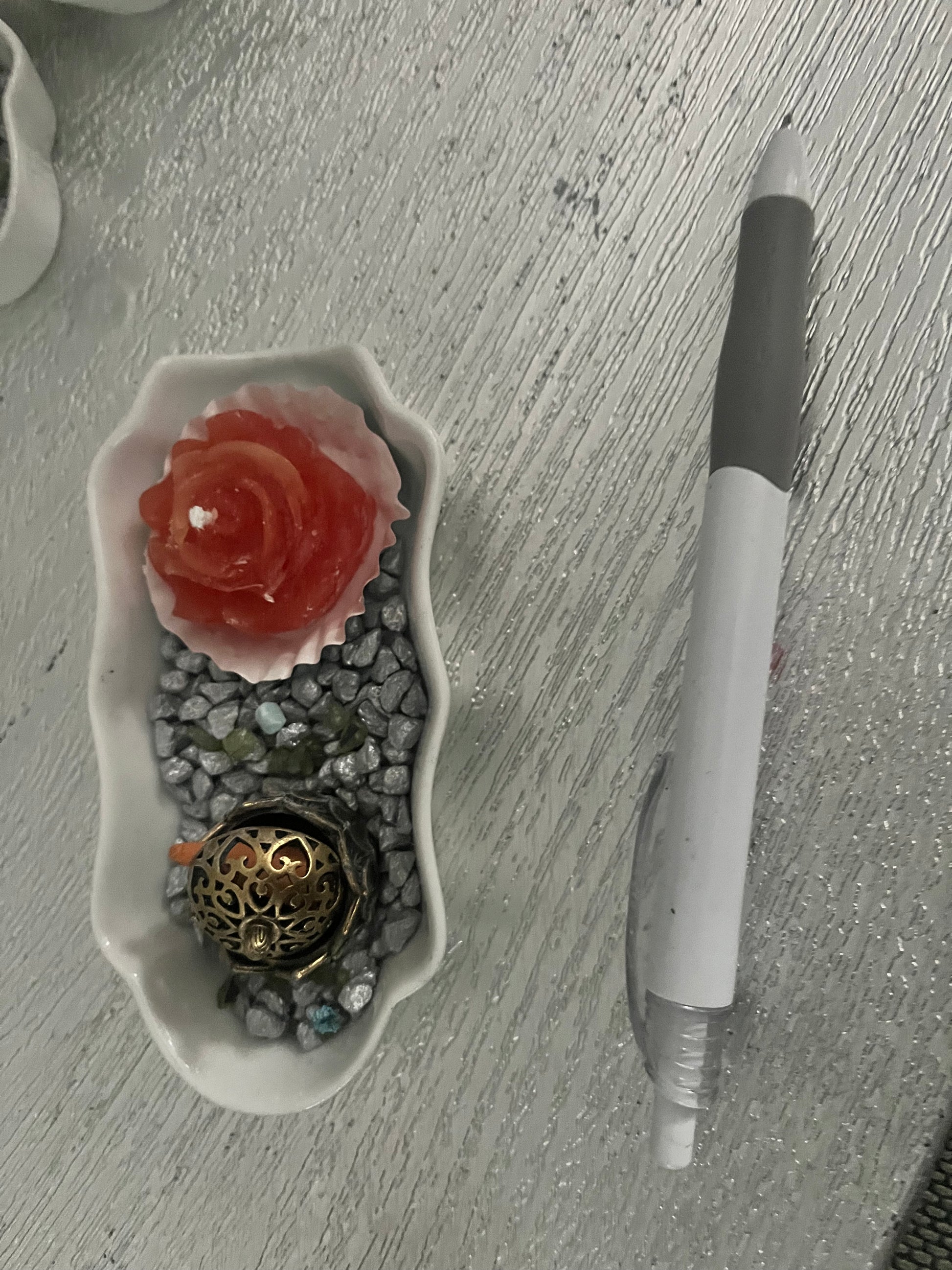 Jolie petite coupelle ondulée blanche, avec une bougie fleur et un porte encens. Le tout est décoré de petites pierres. Pourra servir de vide poche, ou autres….