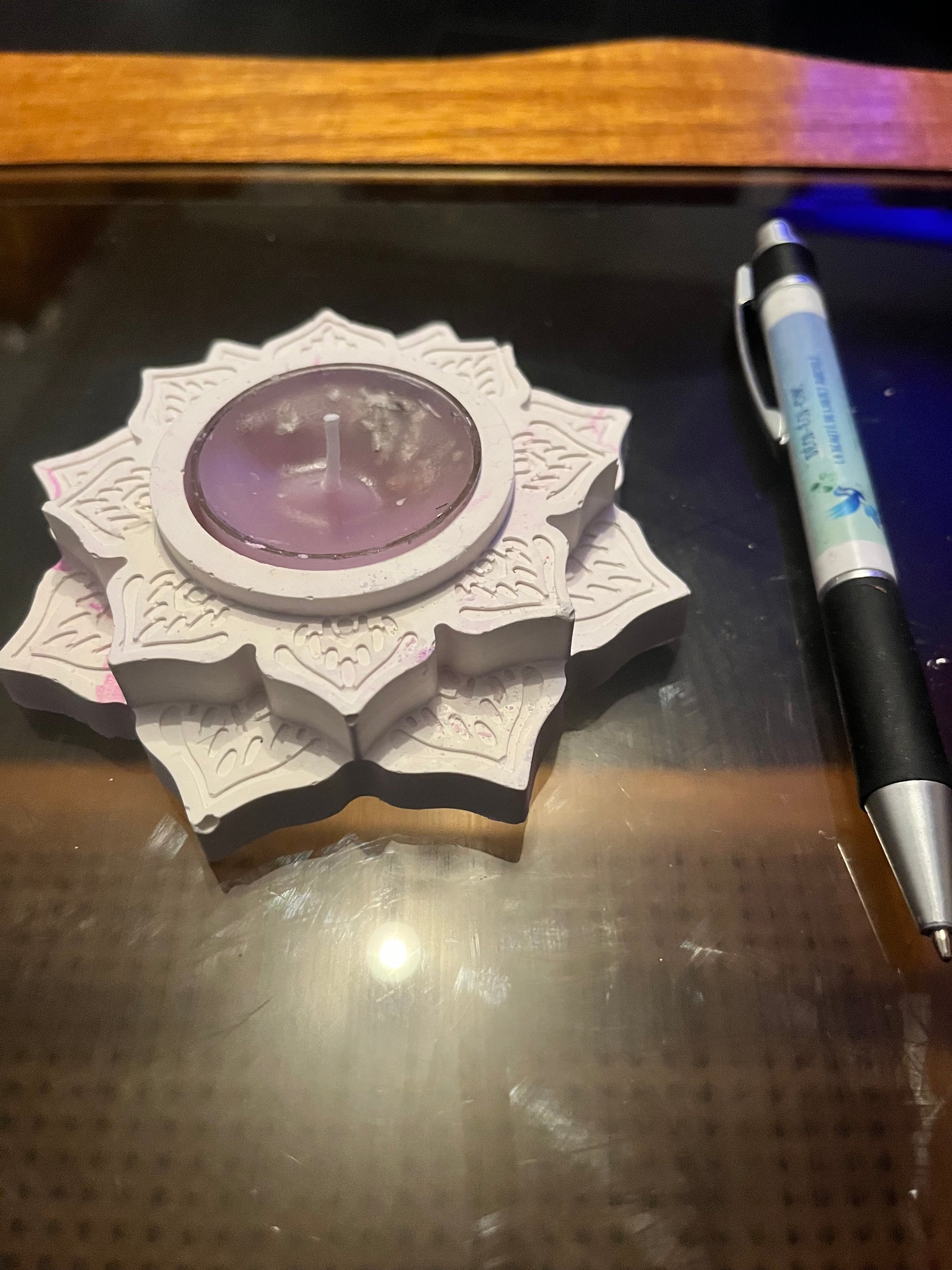 Bougie rose posée dans un beau support fleur de lotus en plâtre.