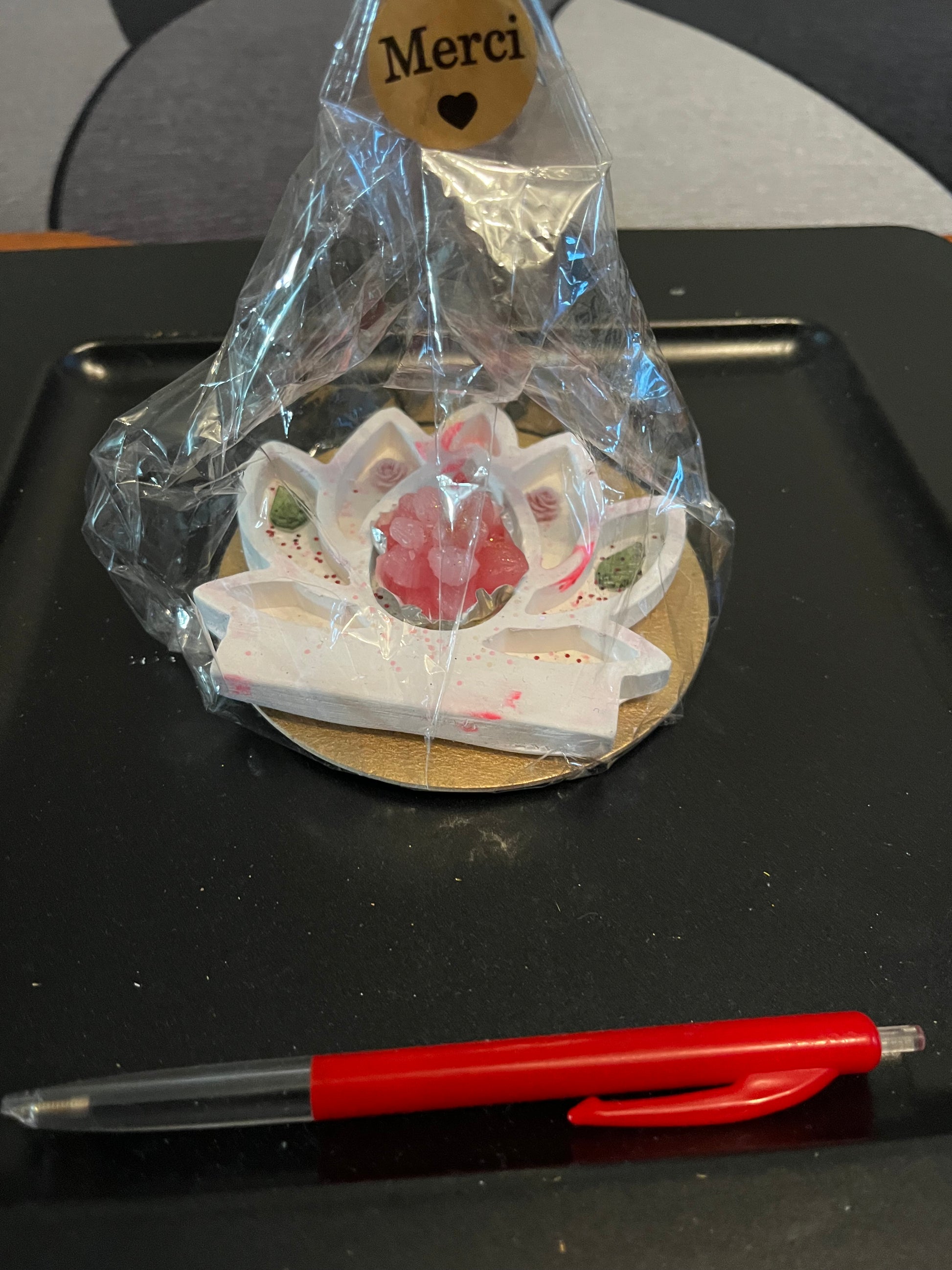 Très jolie petite bougie rose sur un support en plâtre en forme de fleurs de lotus blanc et rose avec de petits décors.
