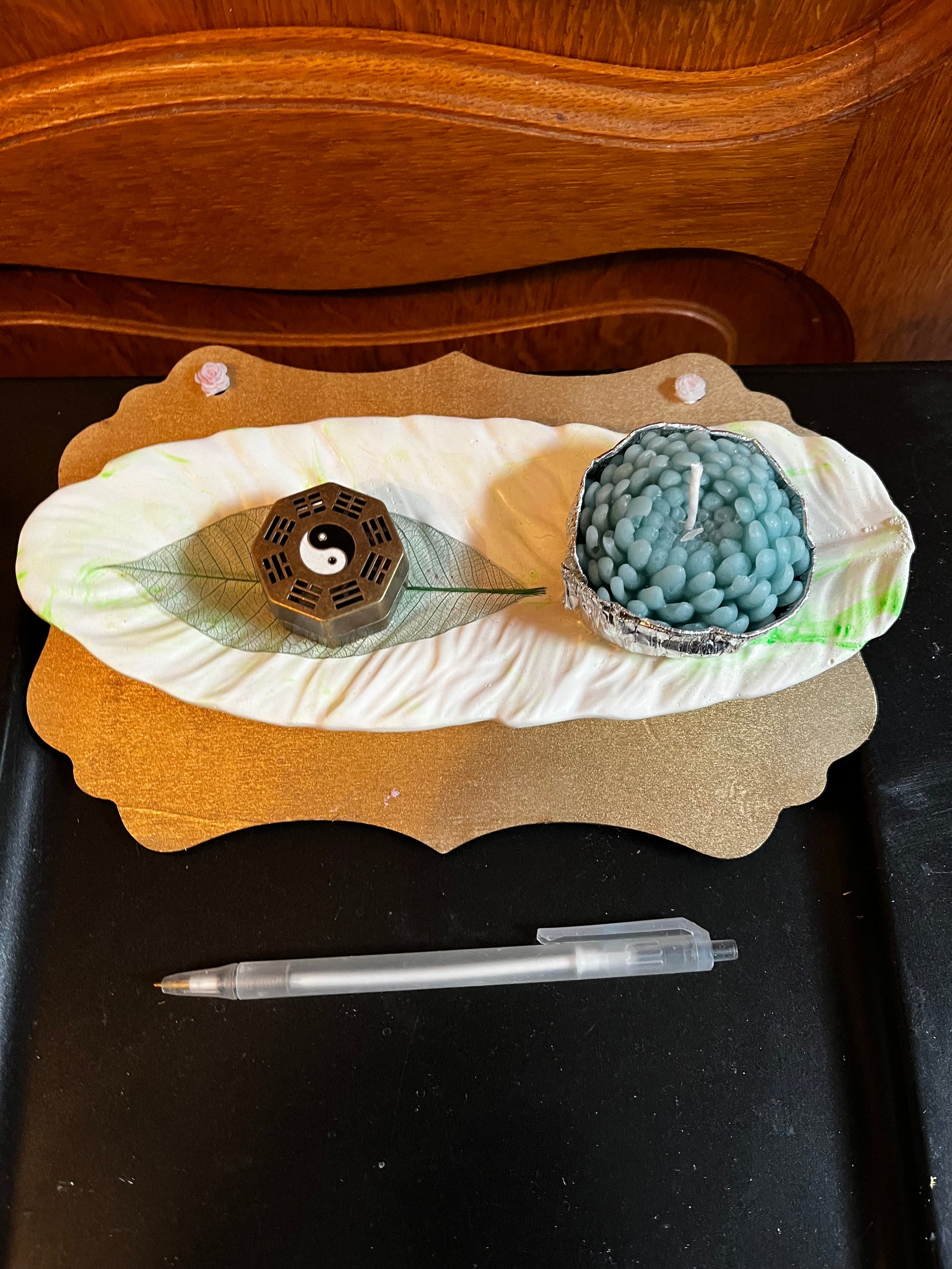 Très belle bougie fleurs verte posée sur une grande feuille en plâtre. On y a ajouté un porte encens, ce qui en fait un objet de détente et de paix. Par la suite, ce support pourra faire office de vide poche ou autres.