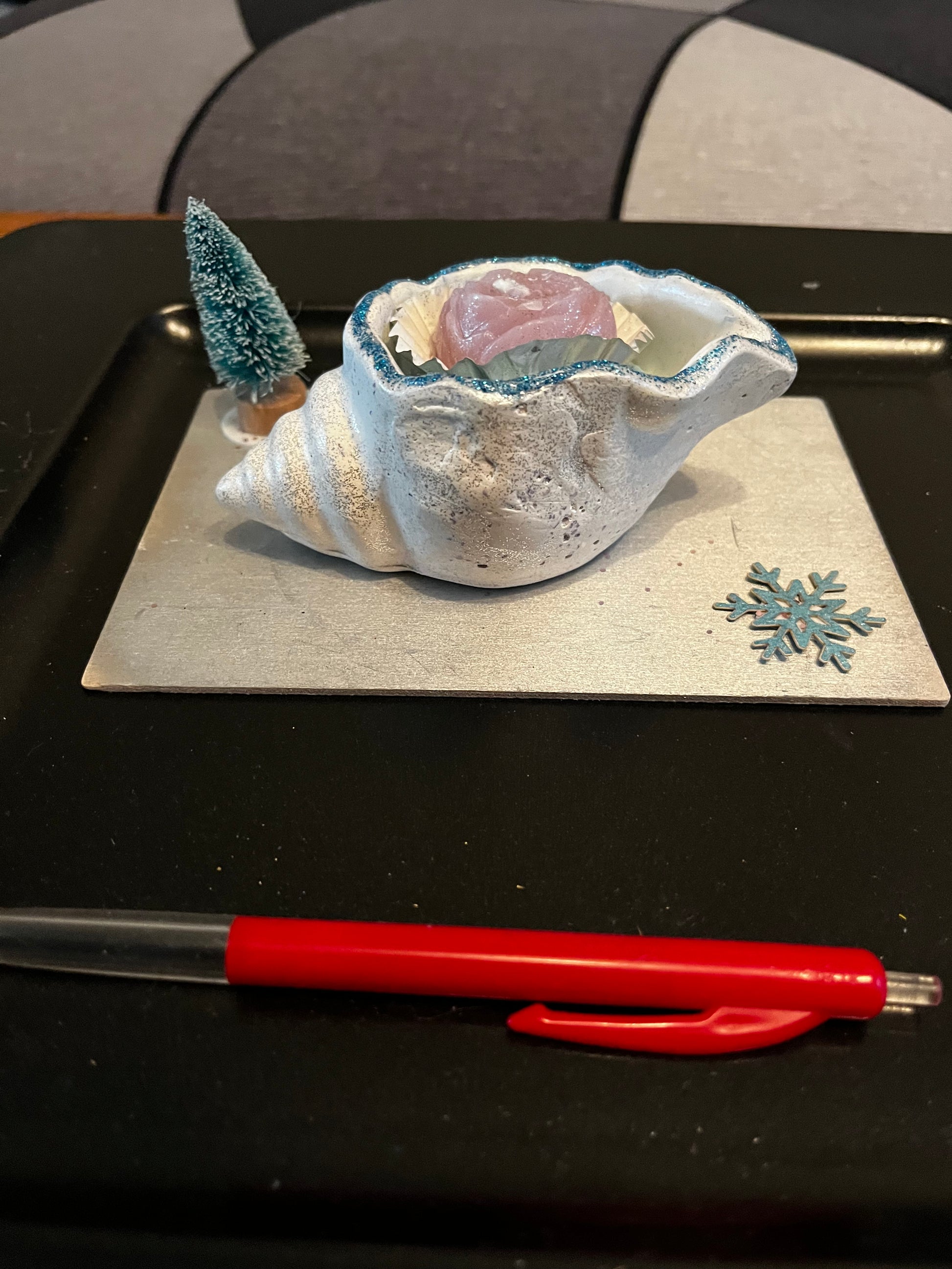 Bougie en forme de fleurs rose dans un beau support en forme d'escargot en plâtre. Nous l'avons décoré avec des petites pierres. Le contour est en bleu brillant.