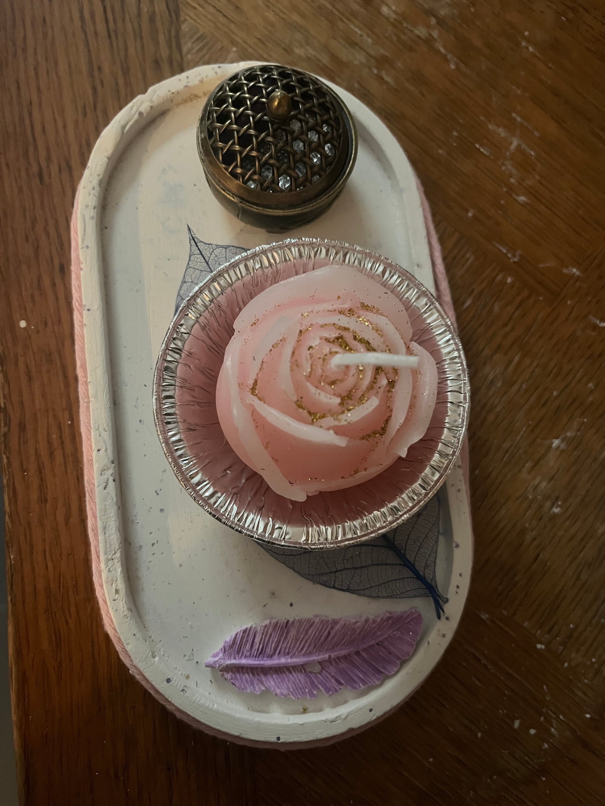 Bougie en forme de belle rose, posée sur un plateau en plâtre couleur blanc et rose.