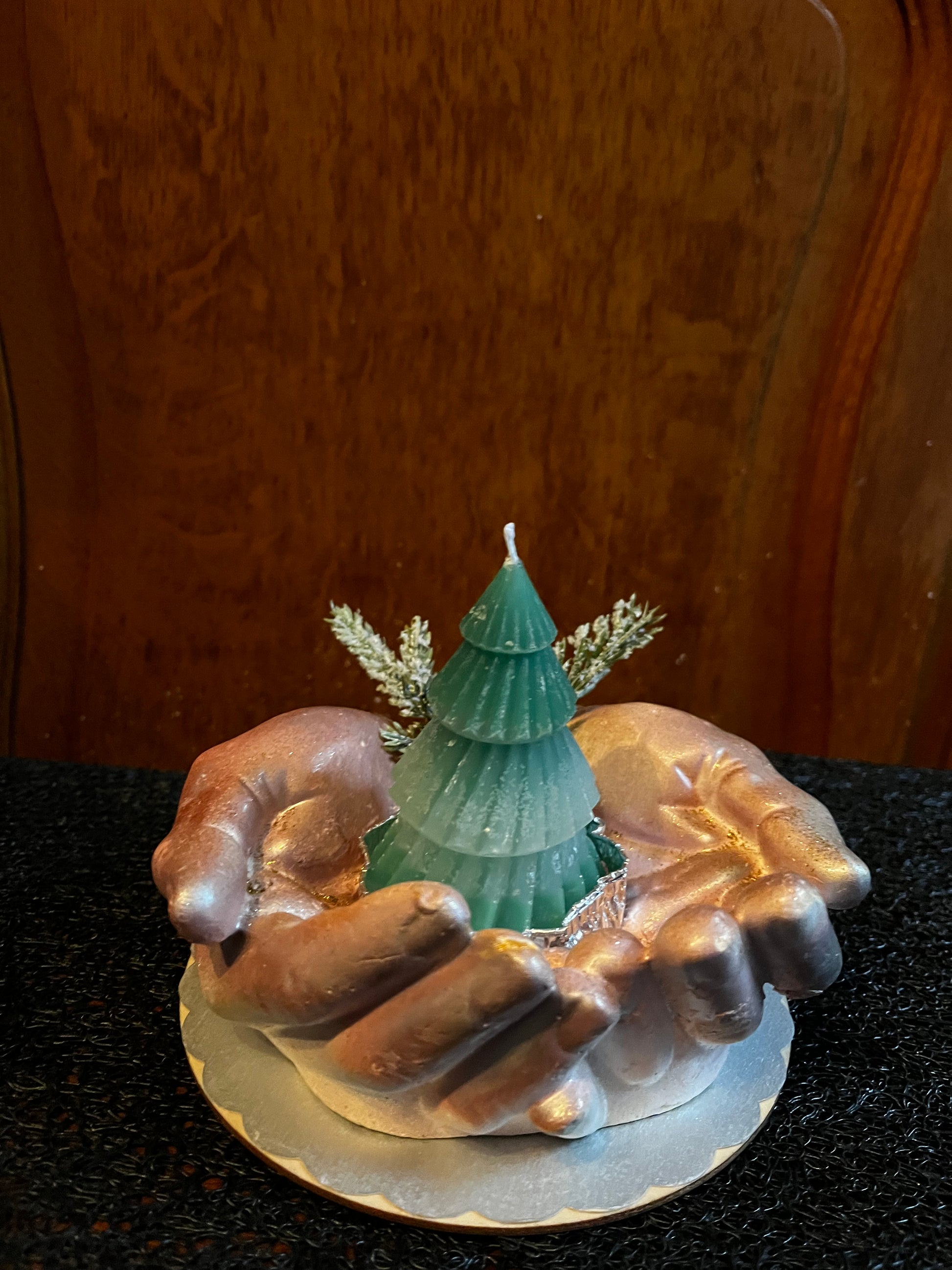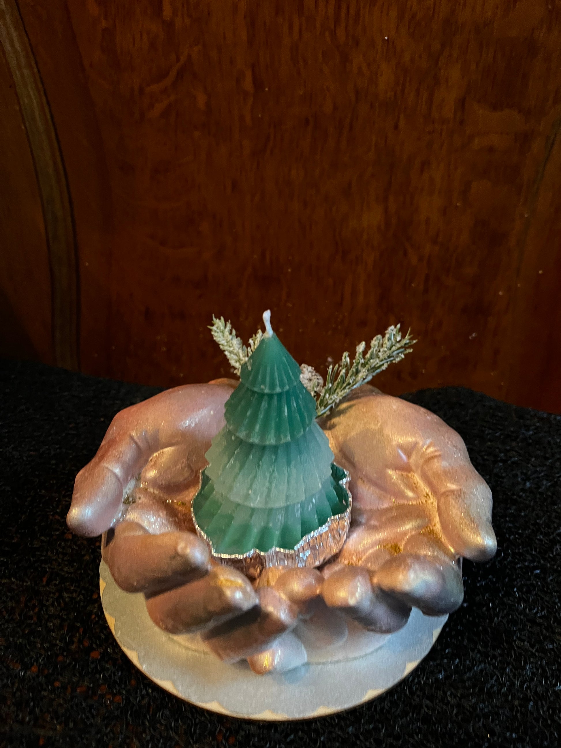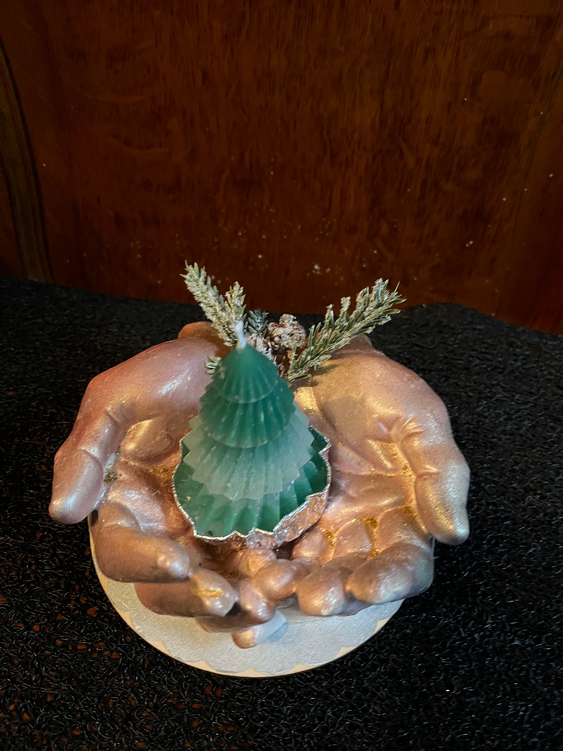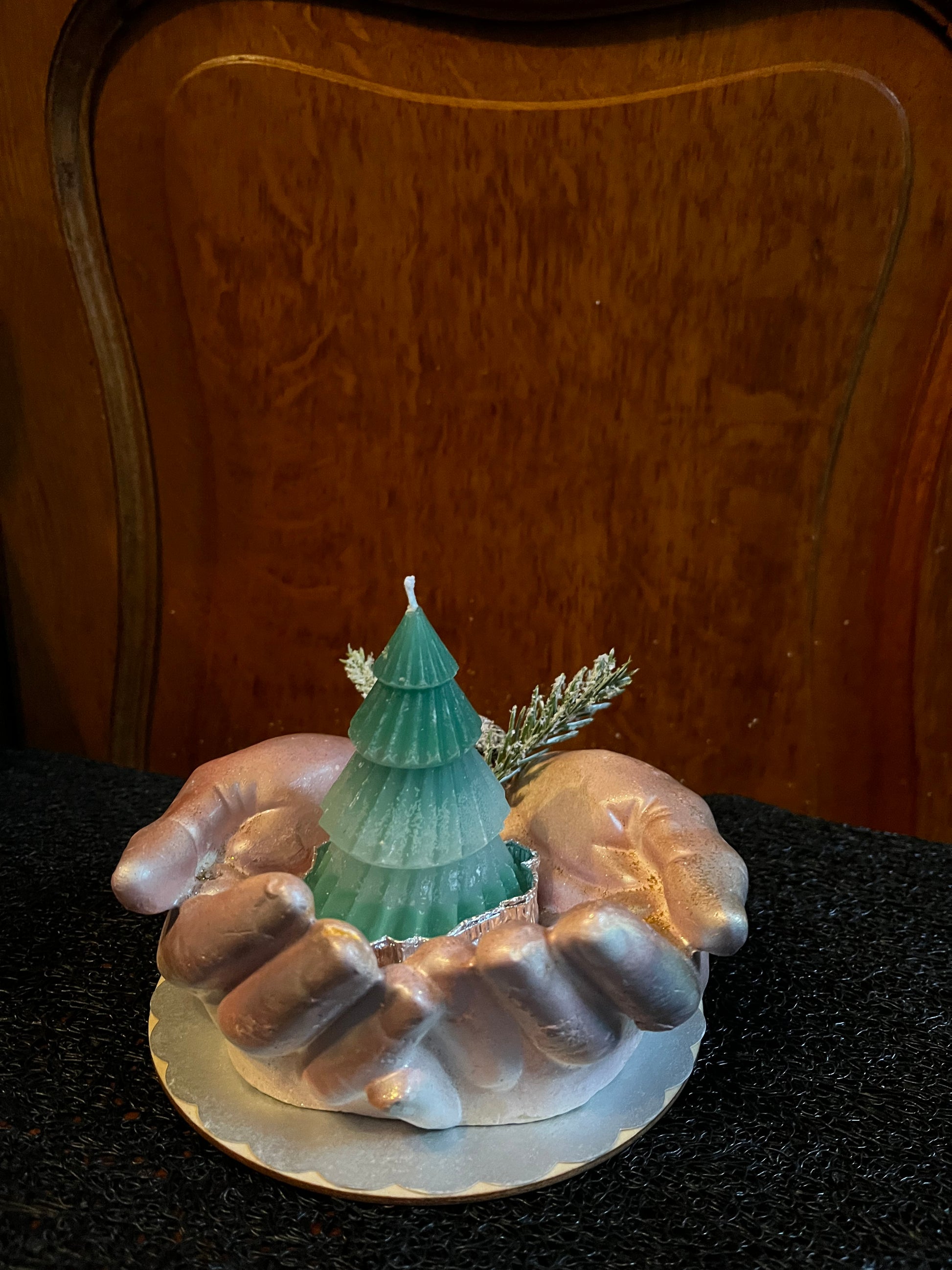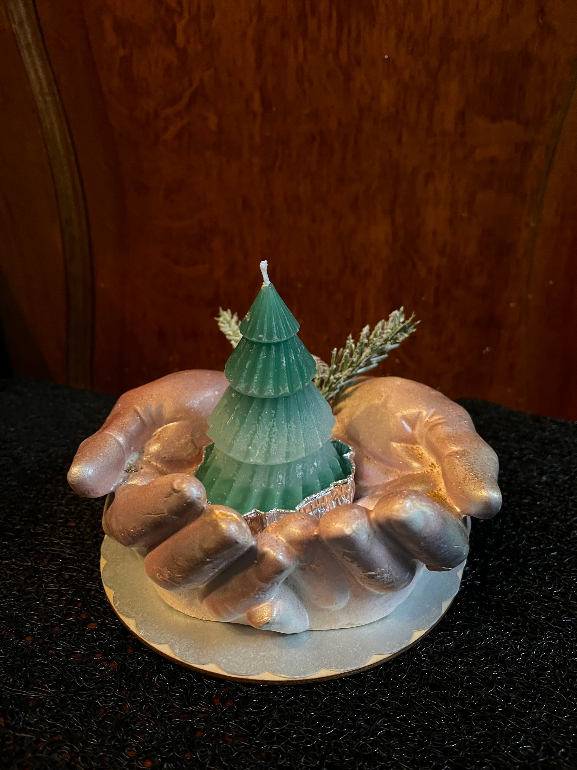 Très belle bougie fleur pailletée argent, posée sur une très belle paire de mains roses.