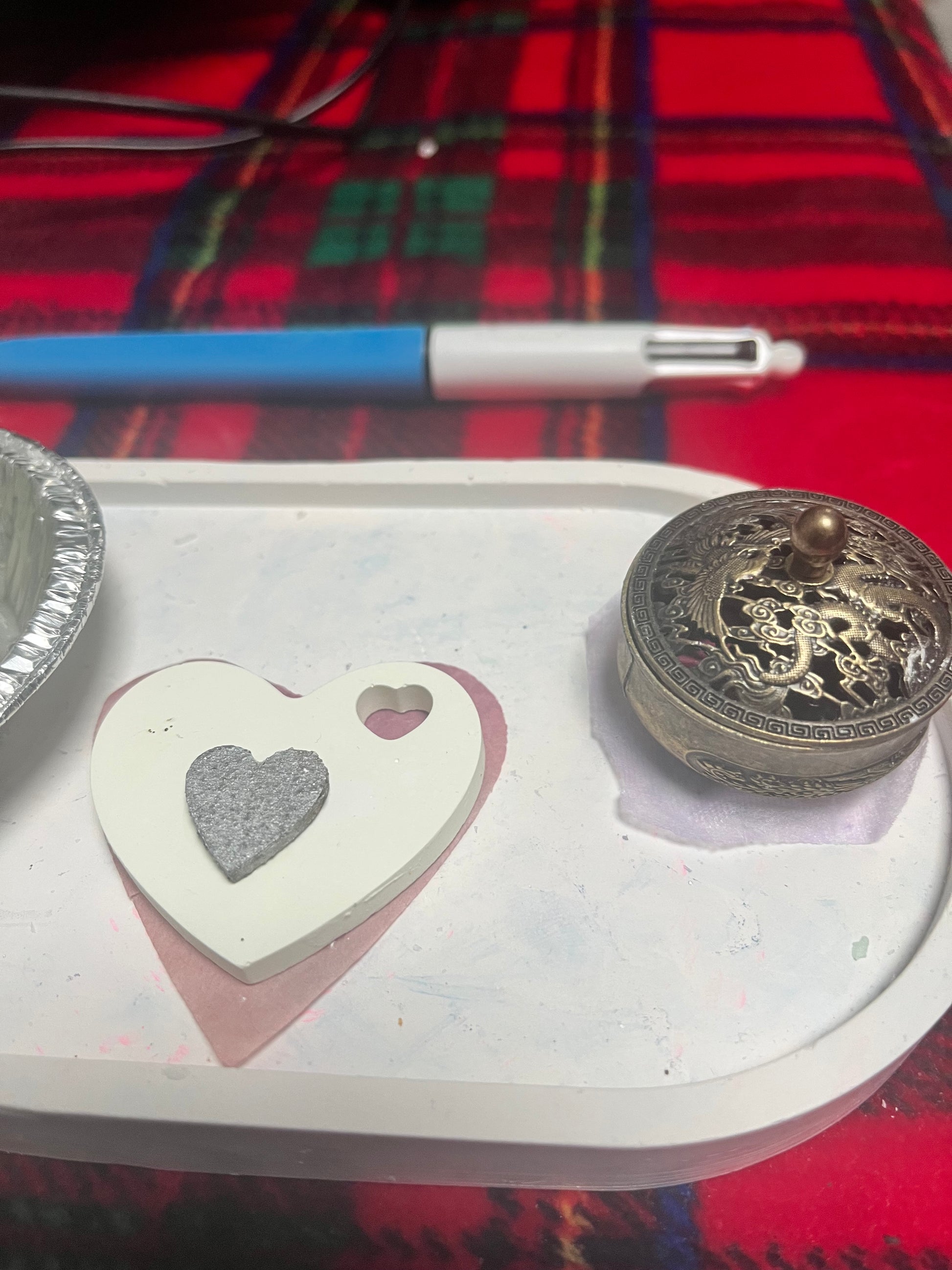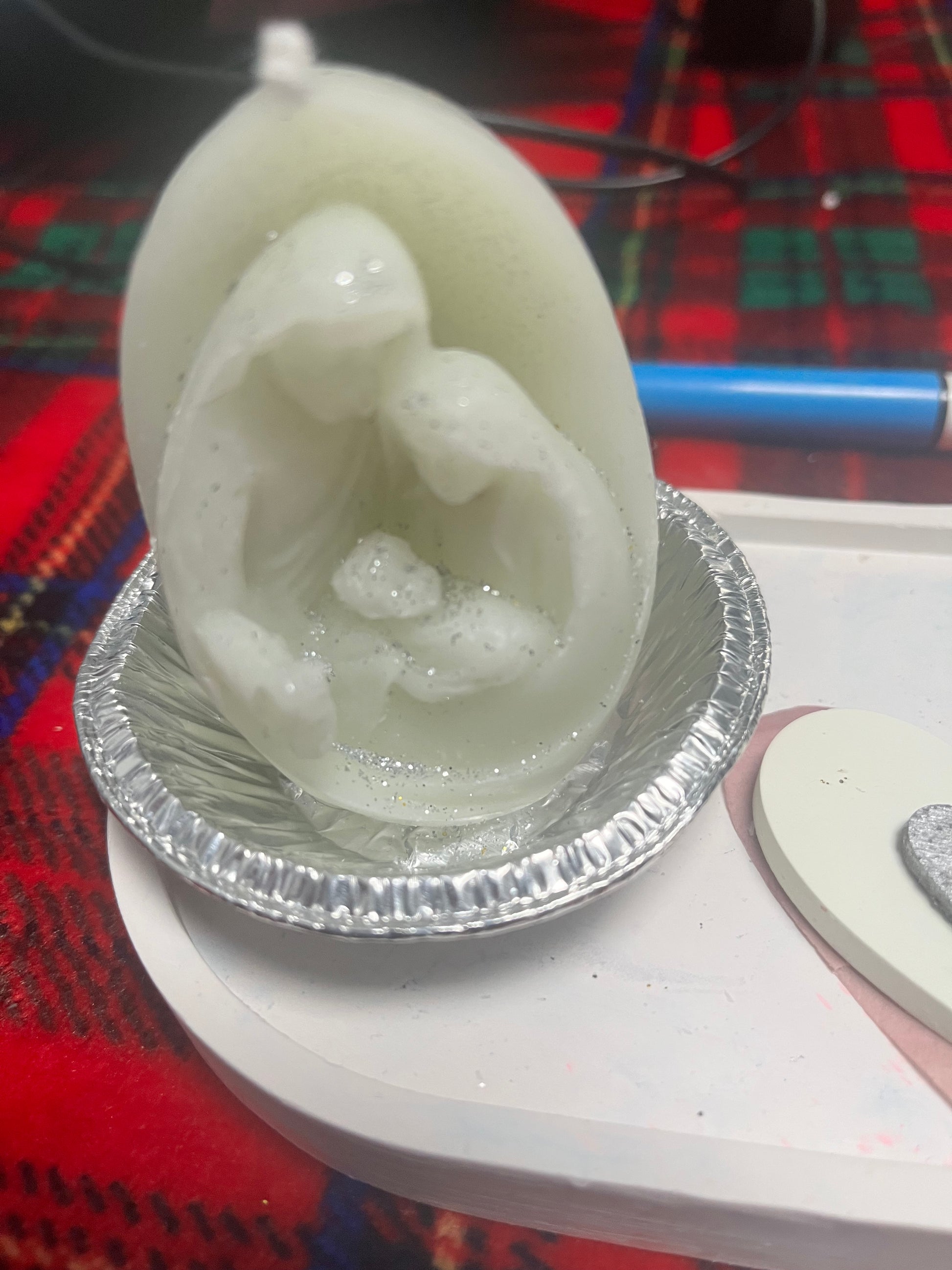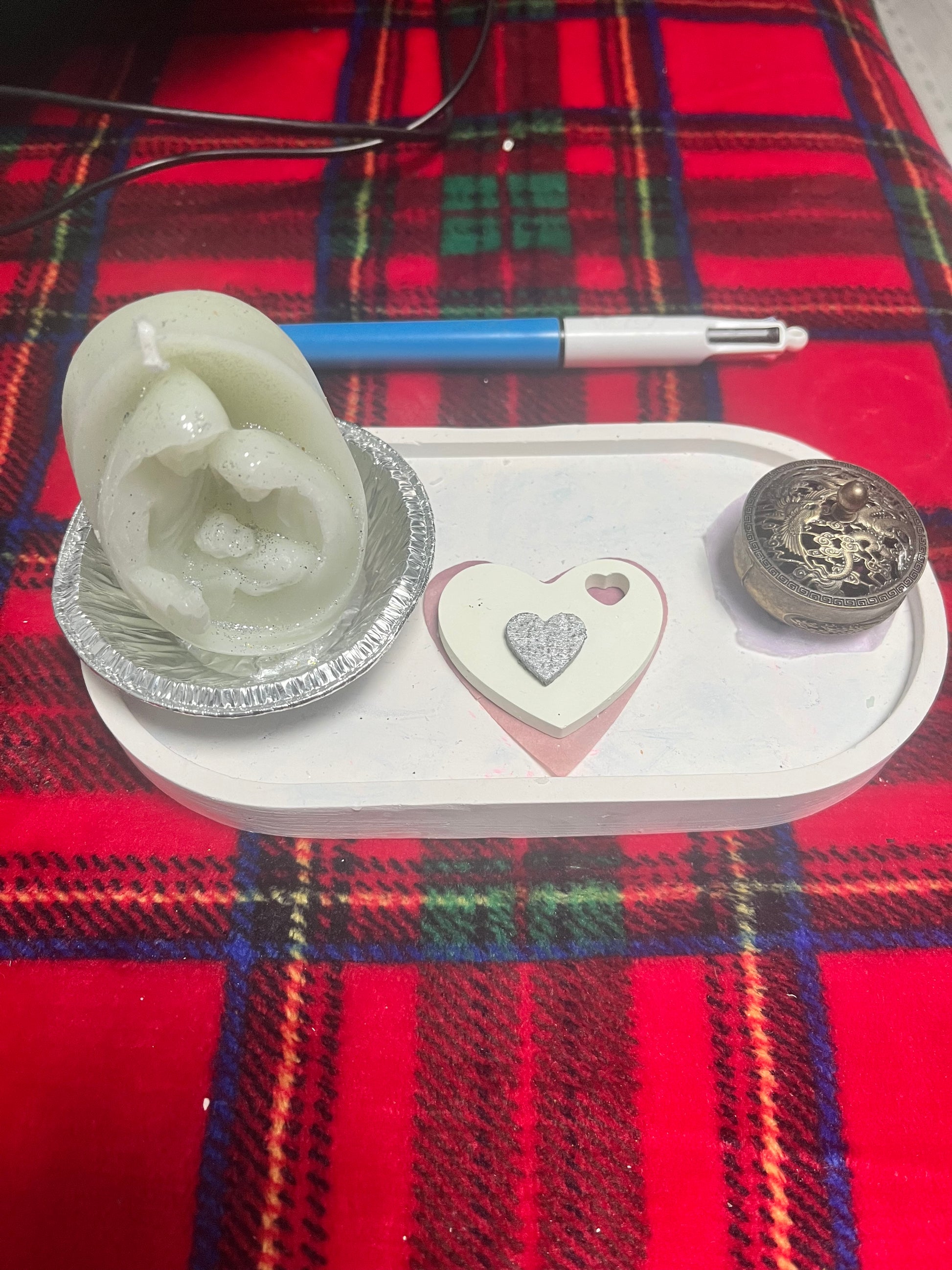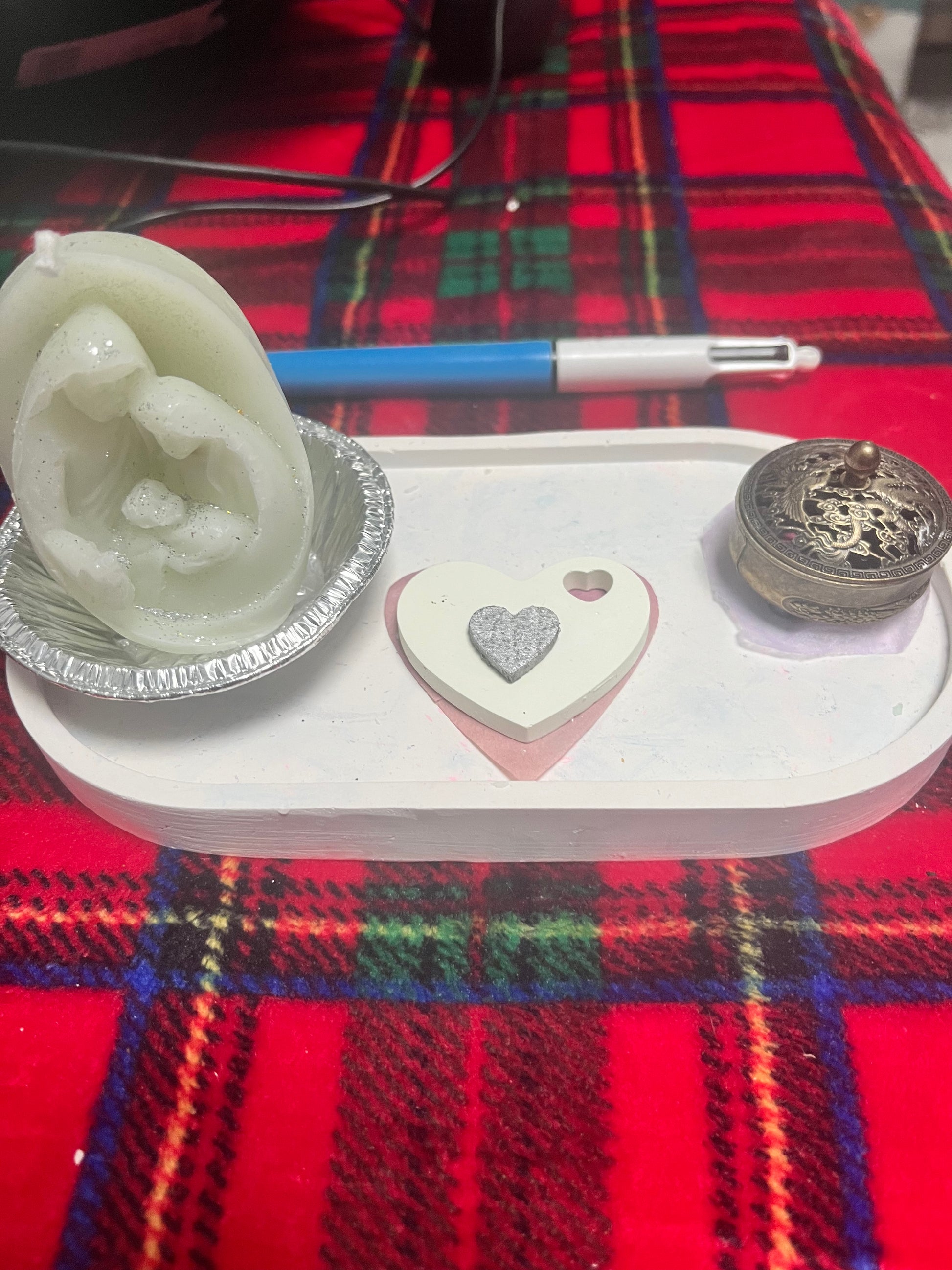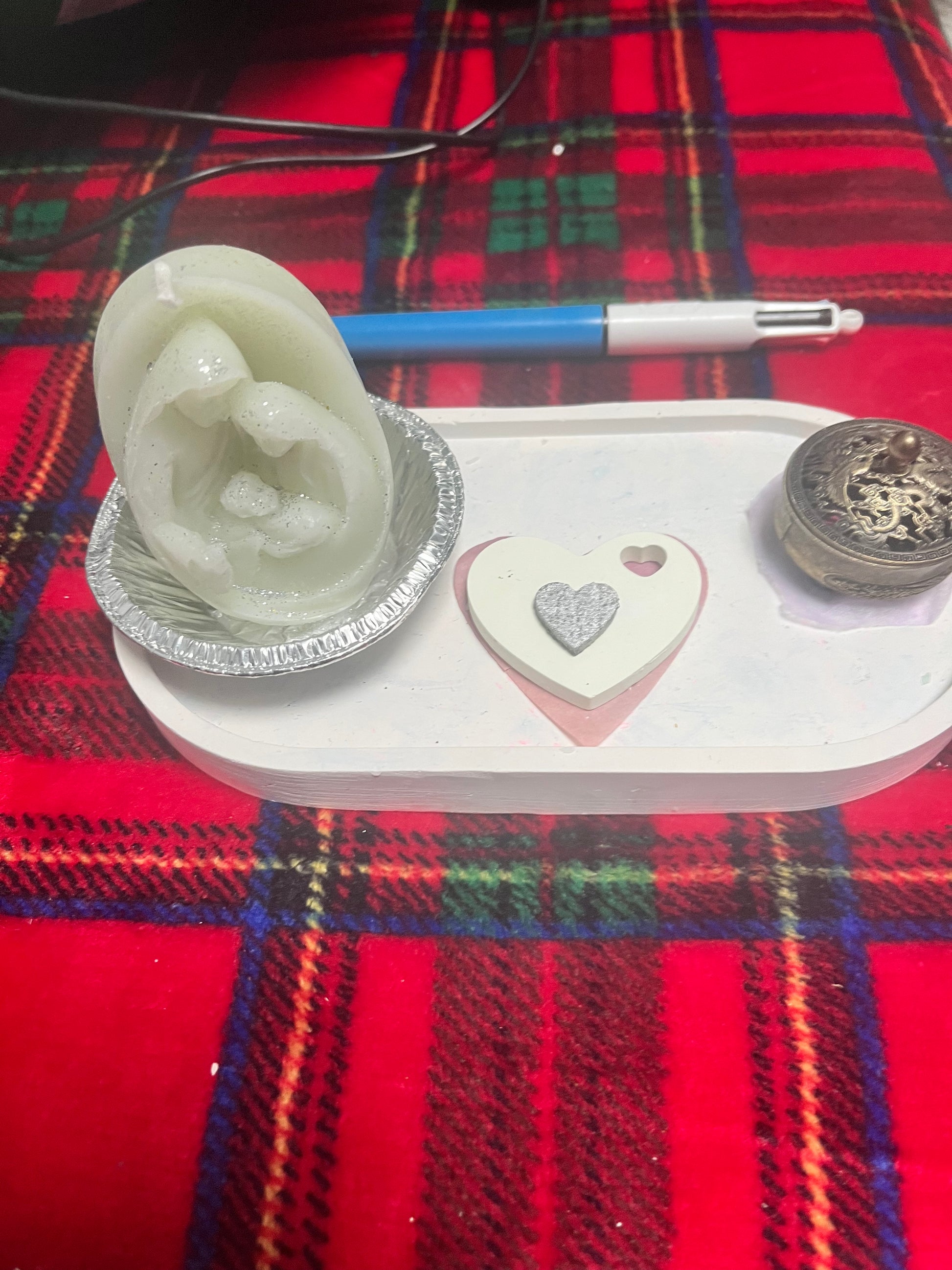 Très belle bougie posée sur un plateau en plâtre. On y joint un porte encens. Cet ensemble respire l amour et la paix. Superbe 🤩