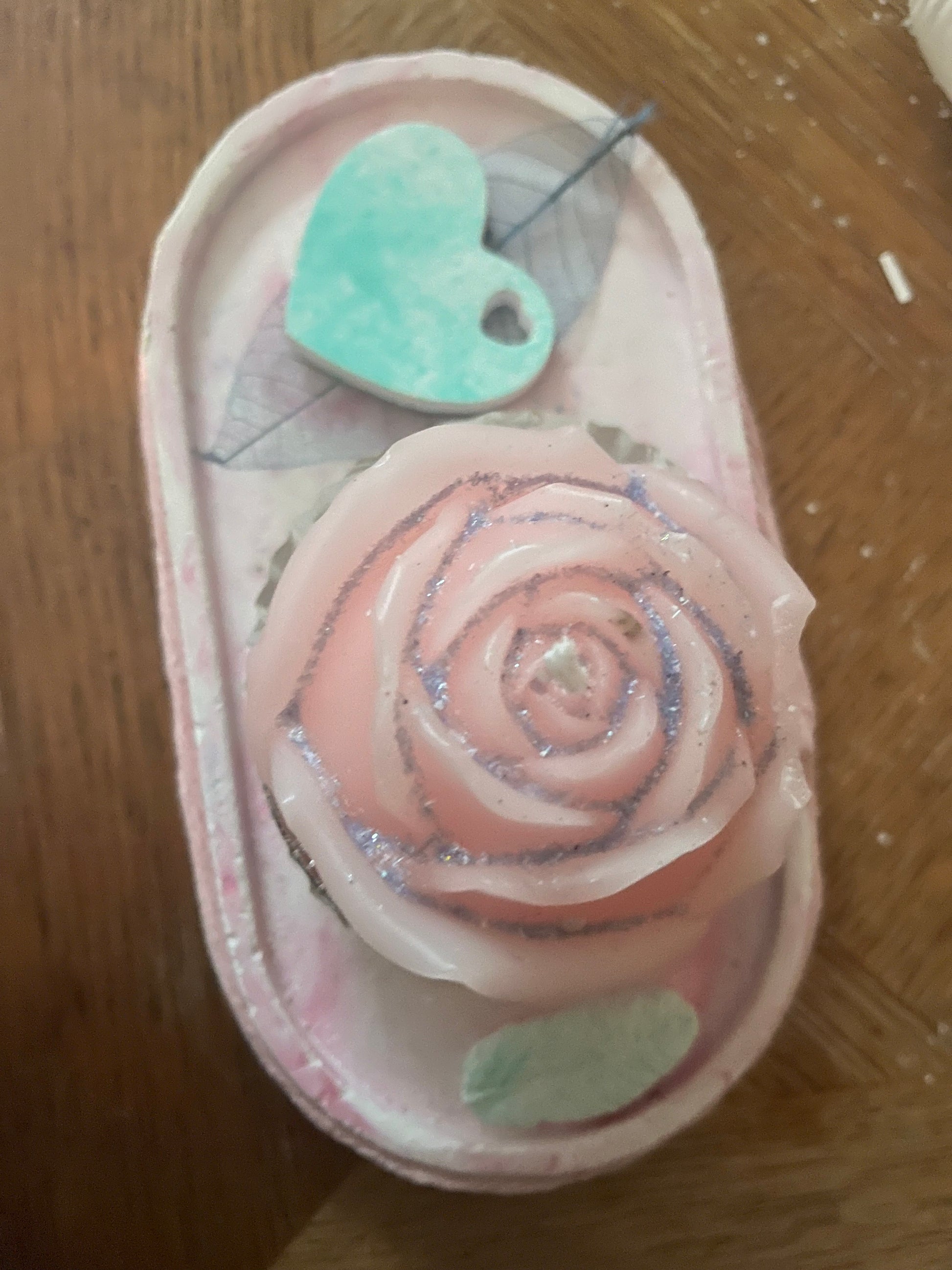 Bougie en forme de belle rose, posée sur un plateau en plâtre couleur blanc et rose.