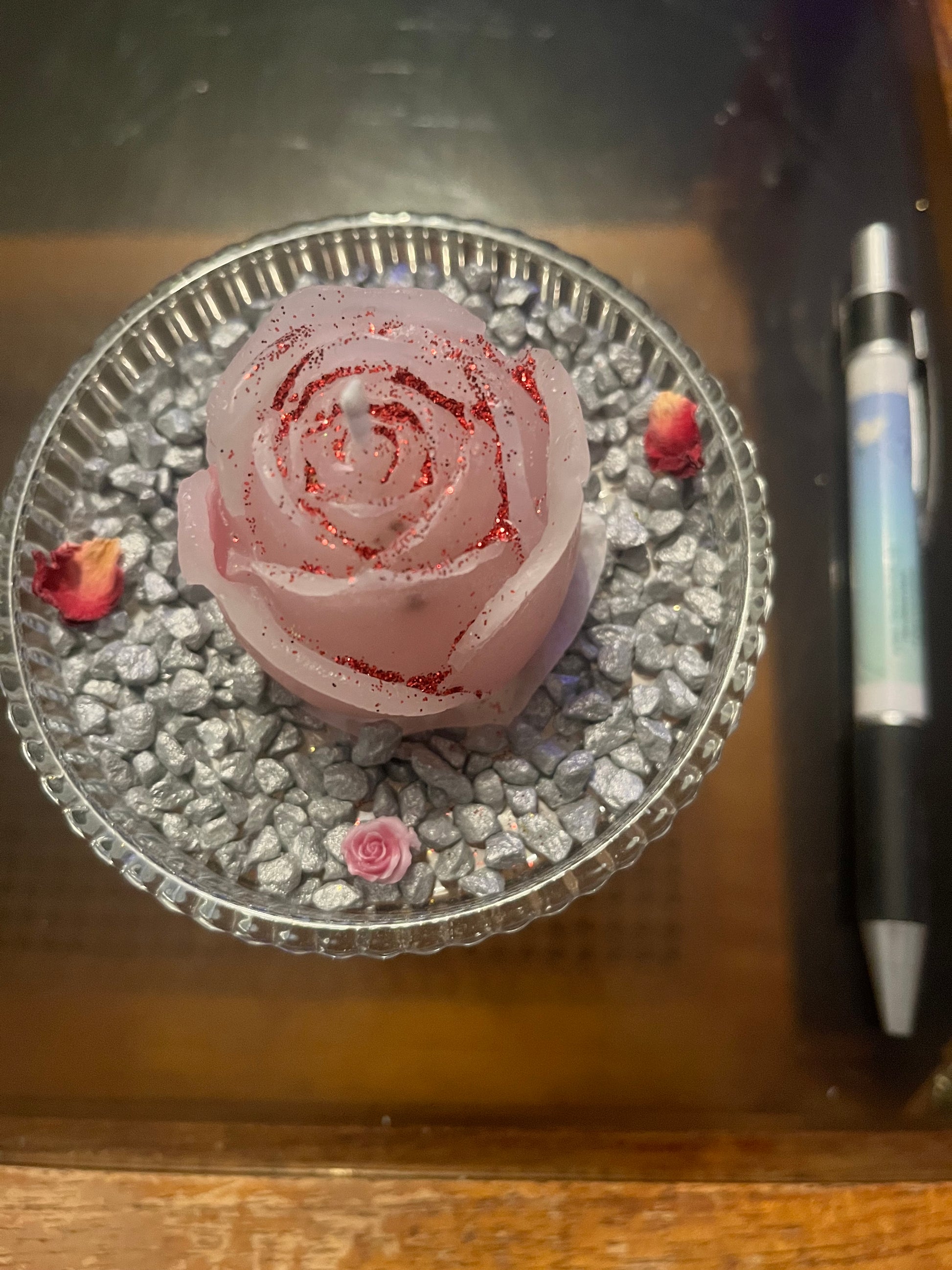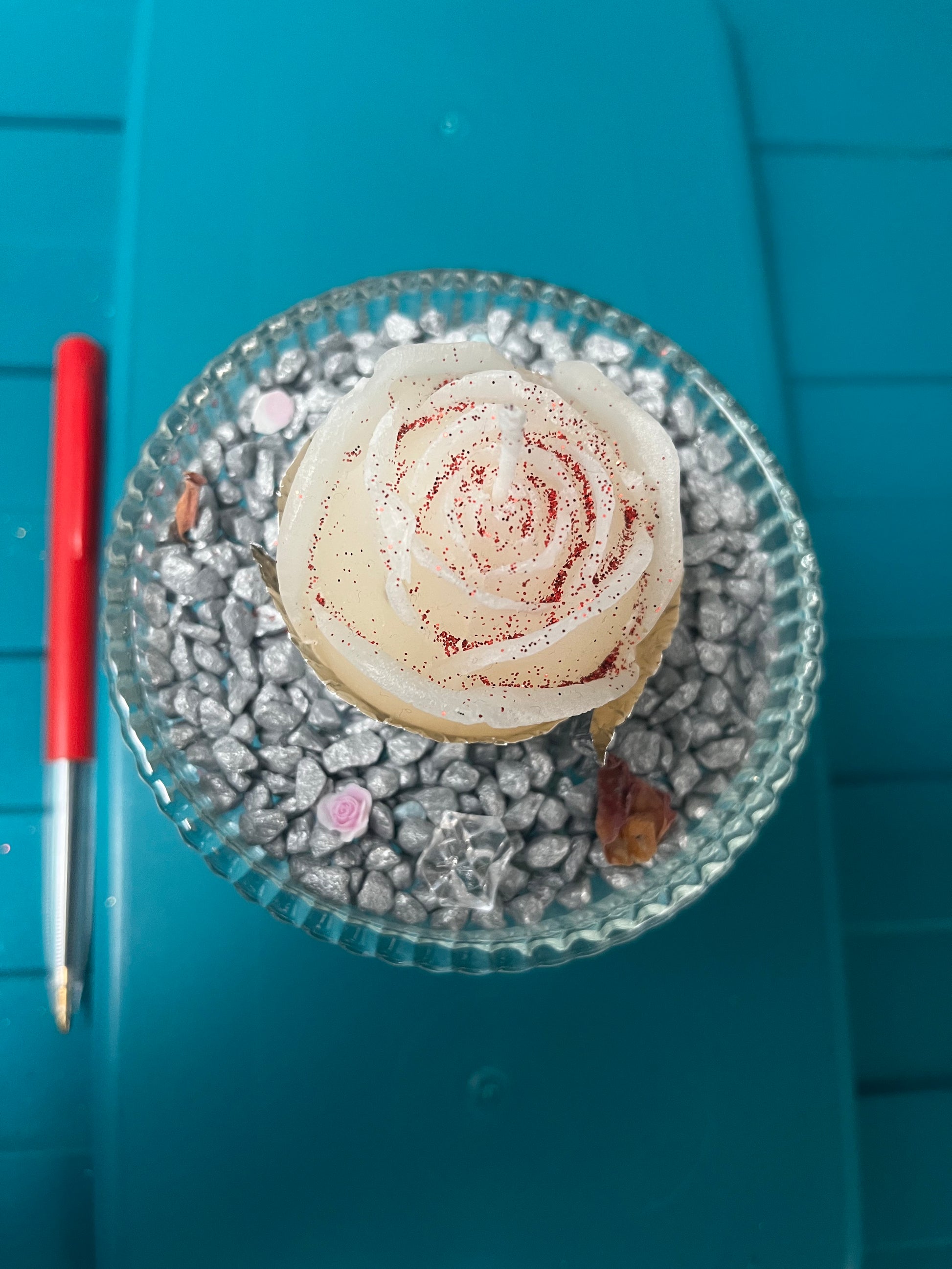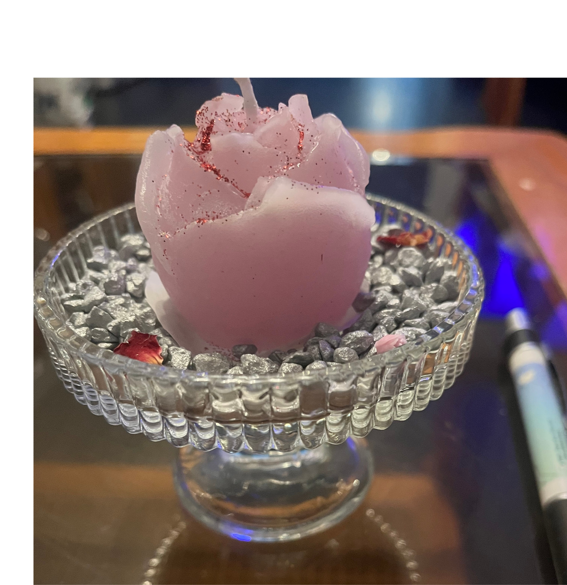 Très belle bougie en forme de rose, deux couleurs disponibles dans une très belle coupe en verre, ce qui en fait un ensemble élégant. La bougie est posée sur des pierres grises argentées.