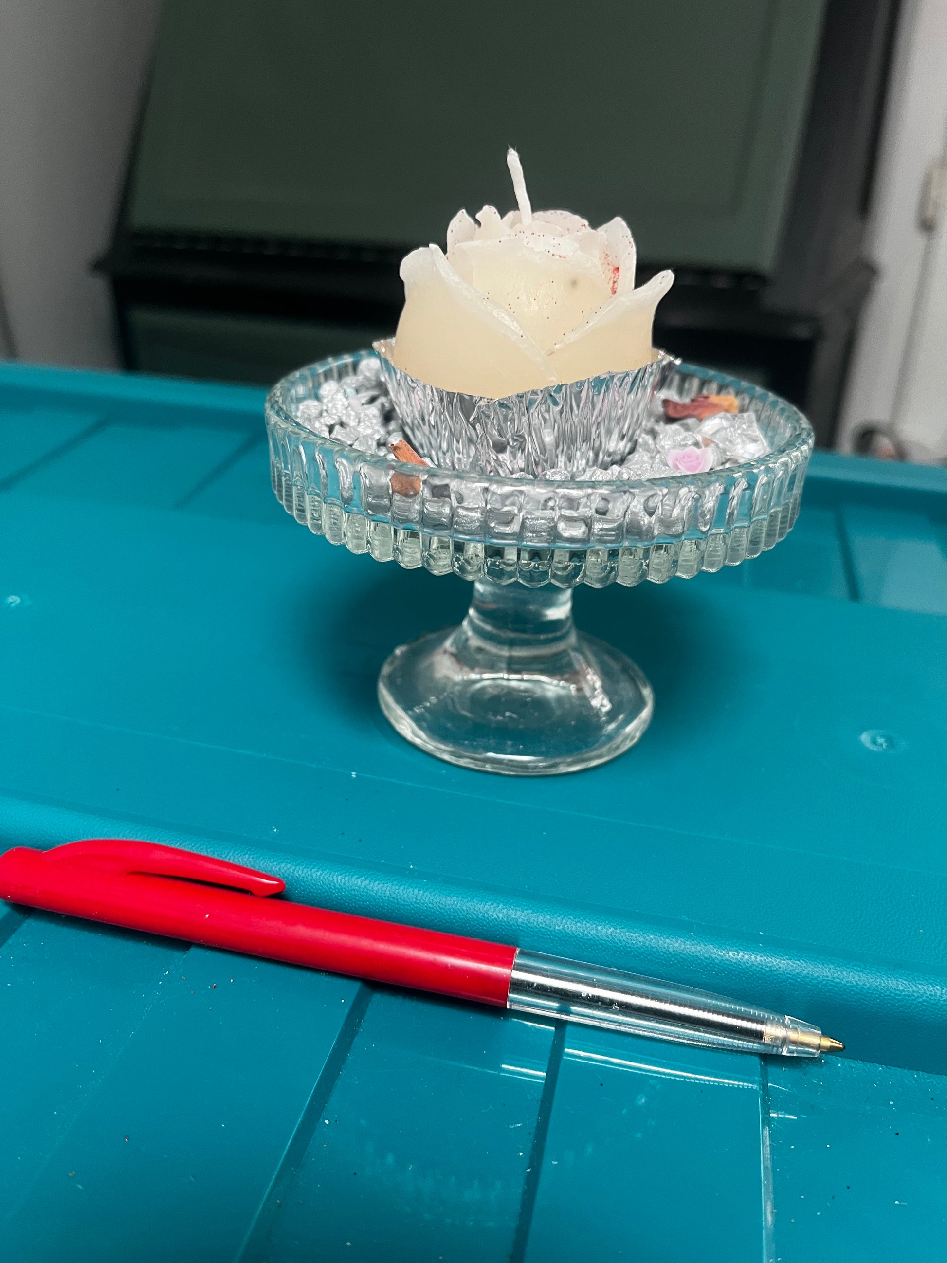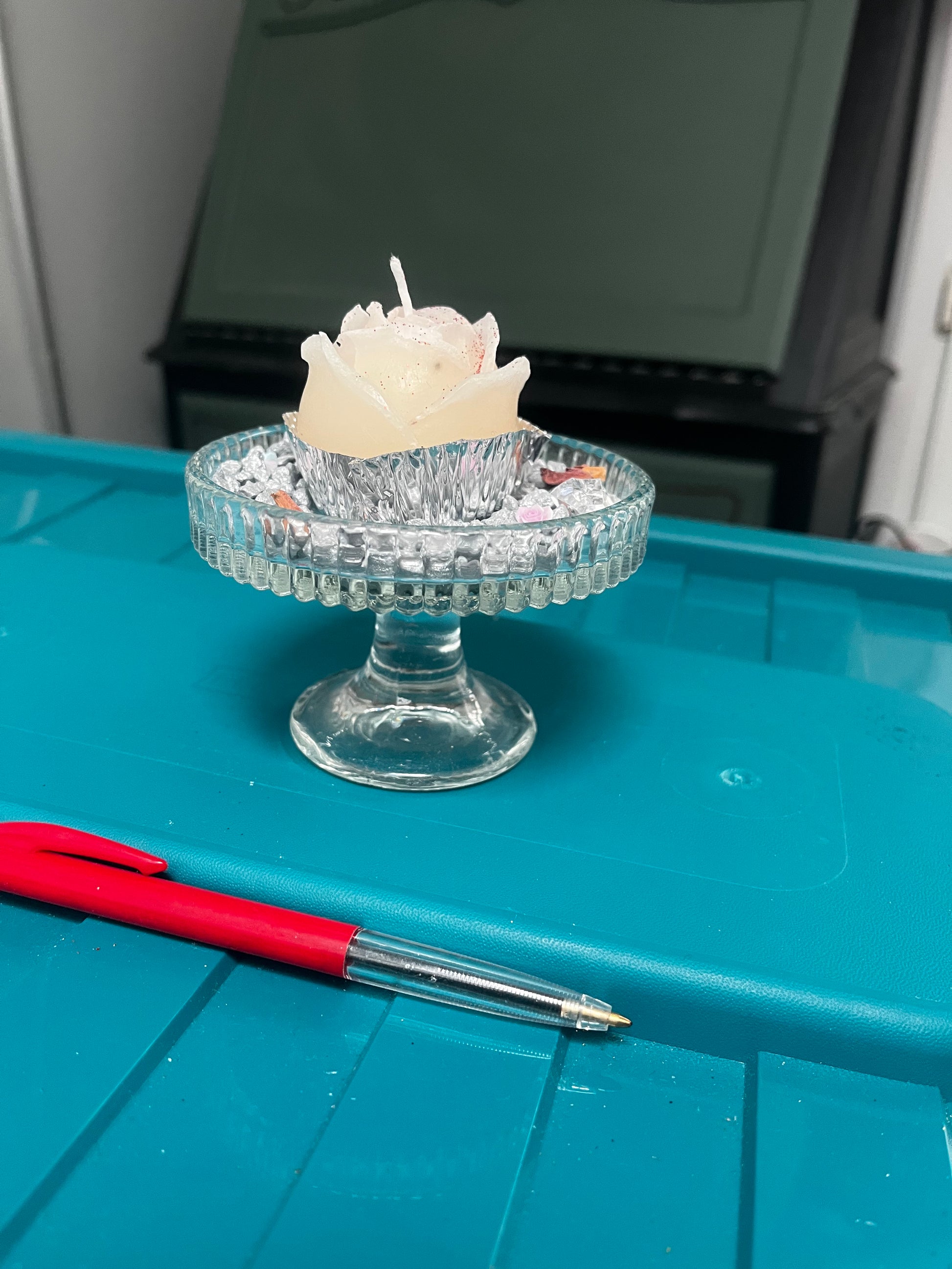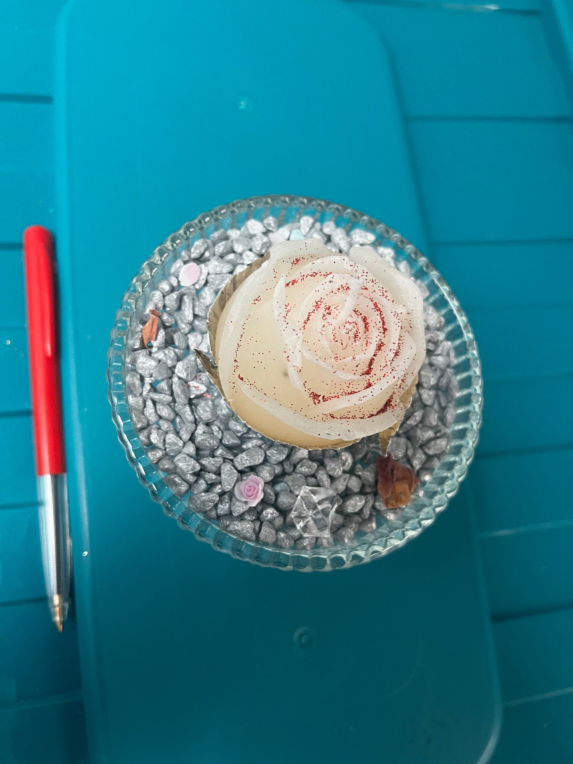 Très belle bougie en forme de rose, deux couleurs disponibles dans une très belle coupe en verre, ce qui en fait un ensemble élégant. La bougie est posée sur des pierres grises argentées.