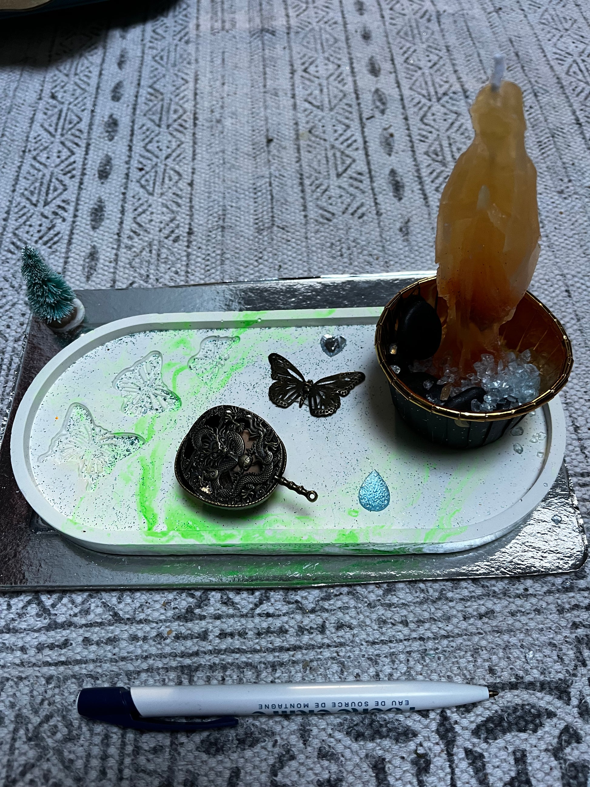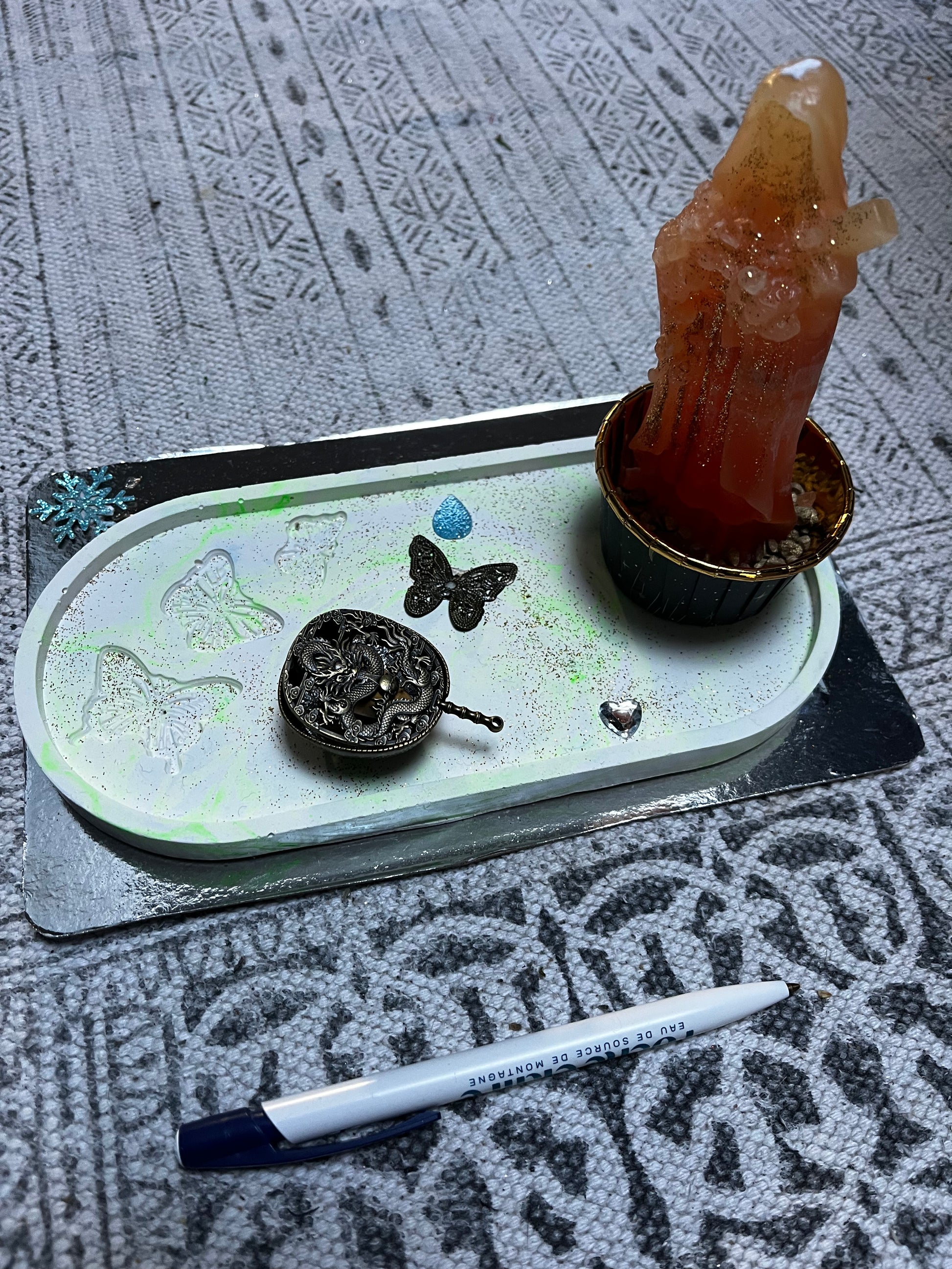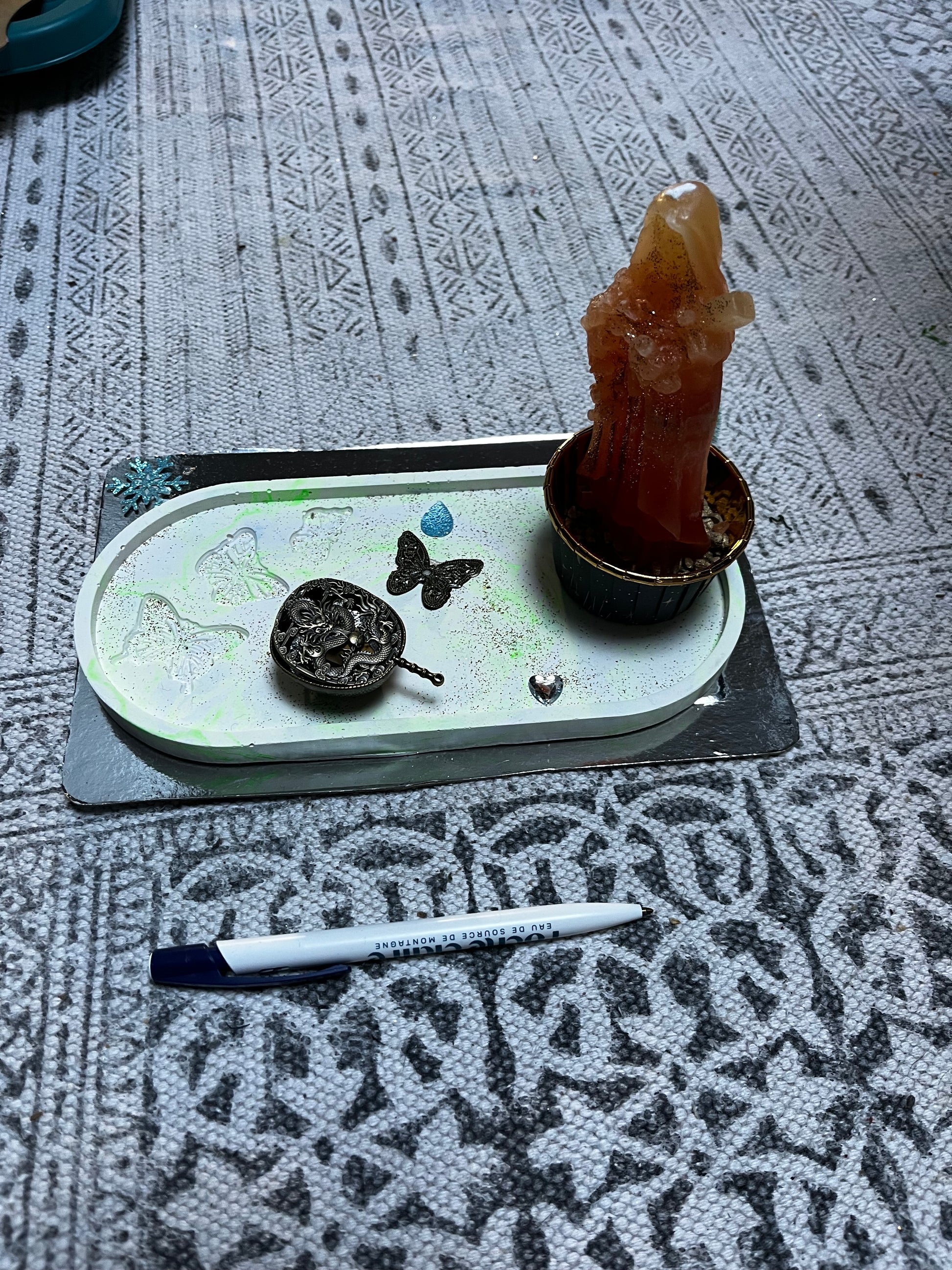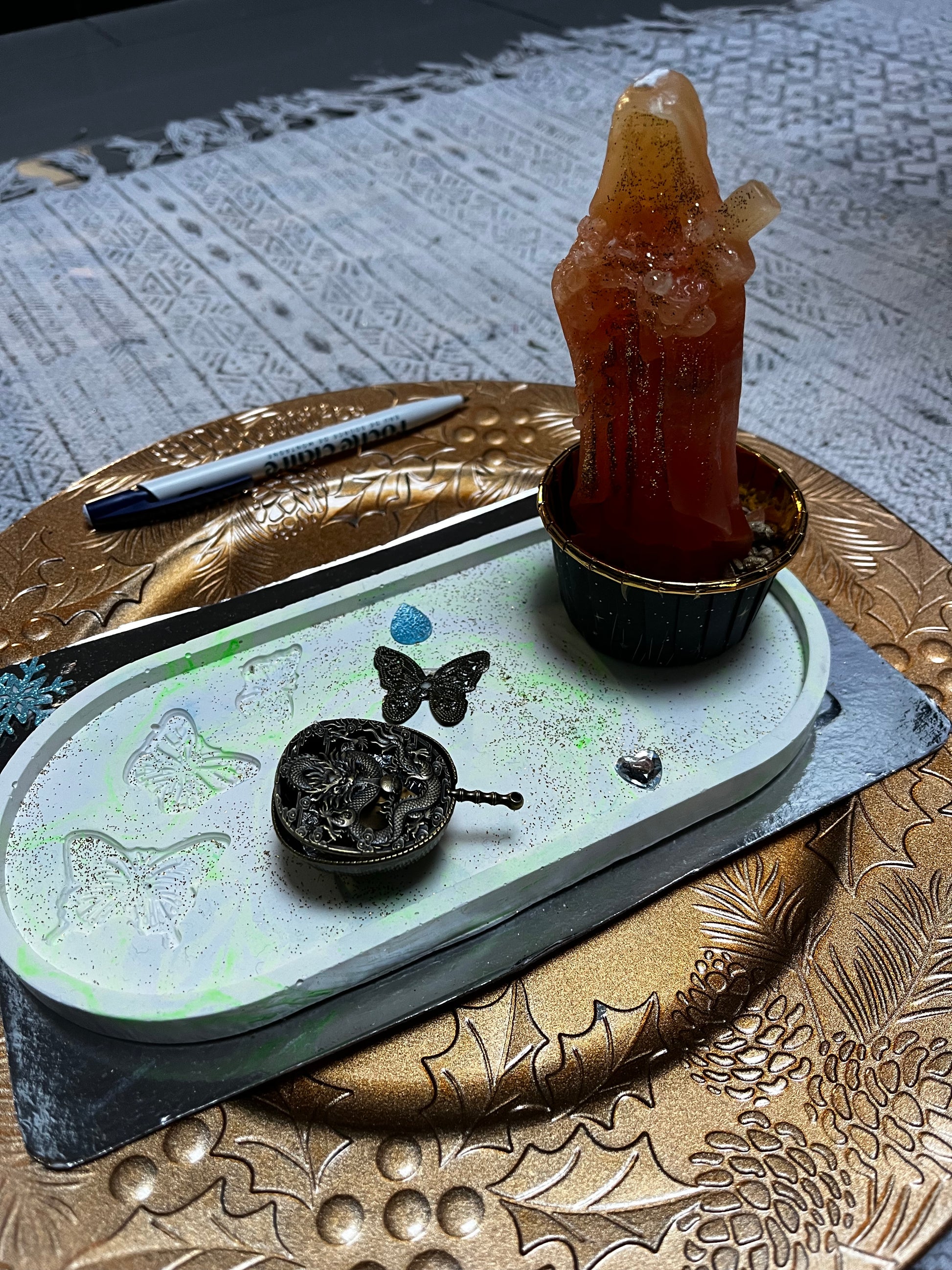 Très belle bougie Sainte, posée sur un grand plateau en plâtre, accompagné d’un porte encens, pour un moment de prière et de repos.