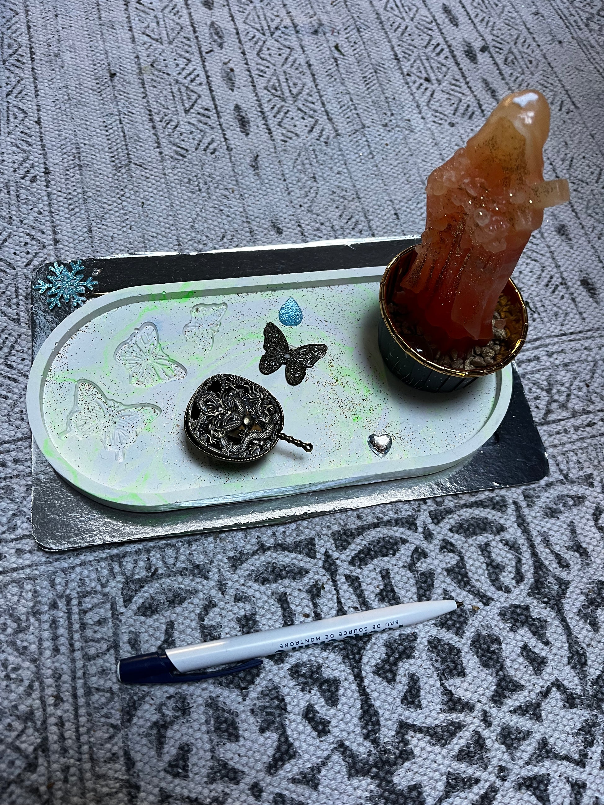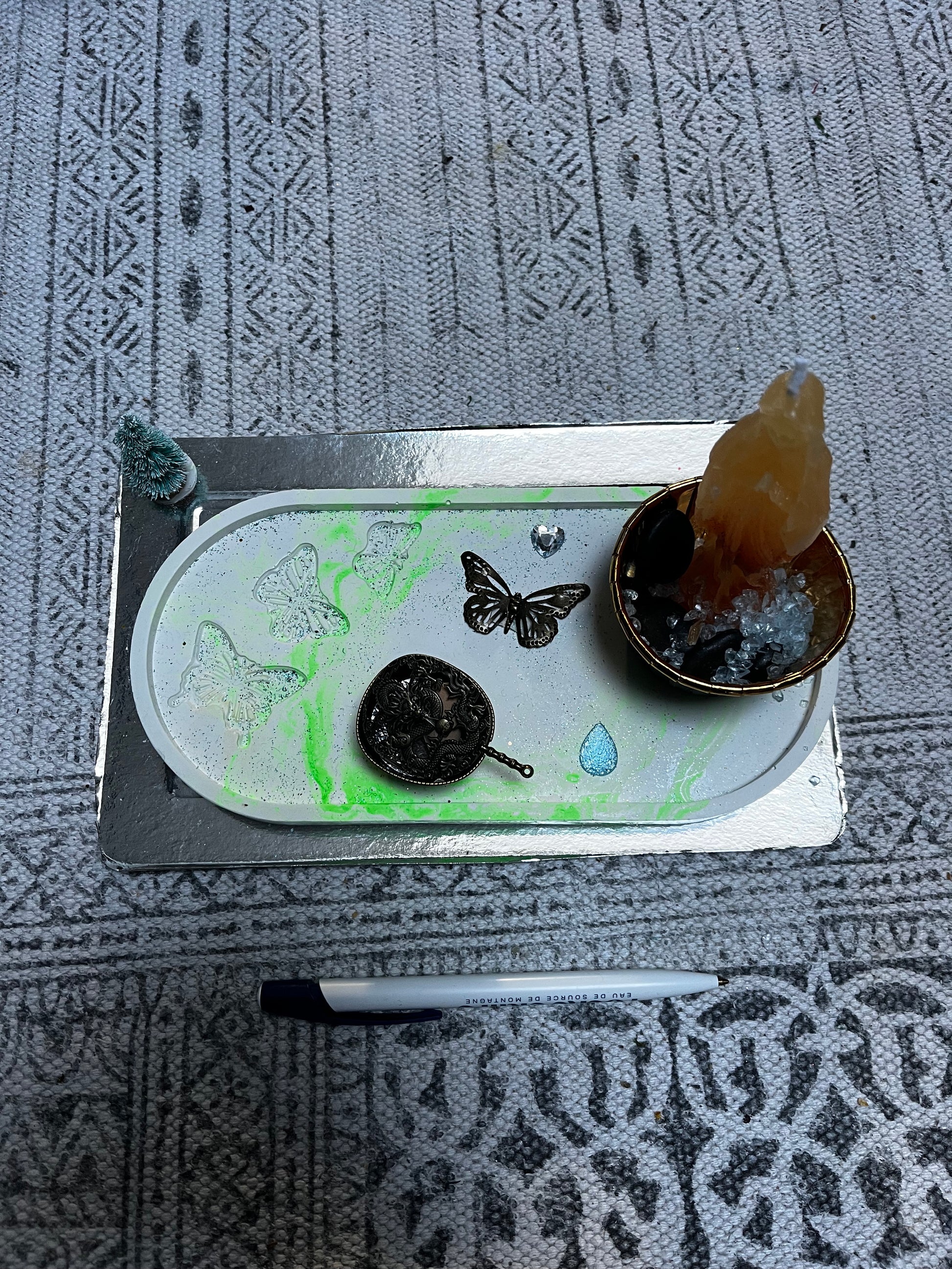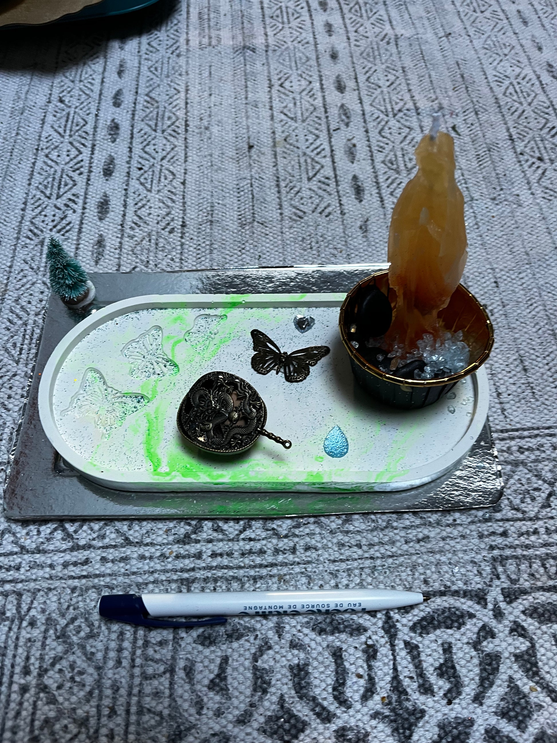 Très belle bougie Sainte, posée sur un grand plateau en plâtre, accompagné d’un porte encens, pour un moment de prière et de repos.