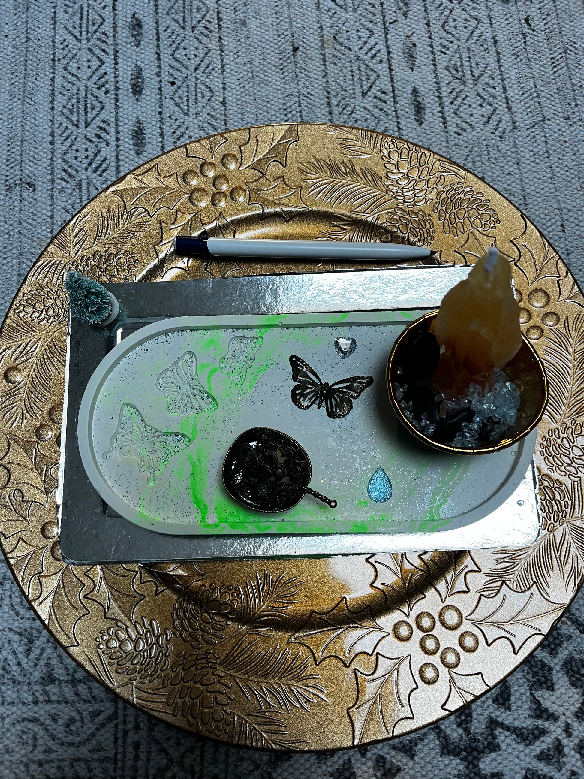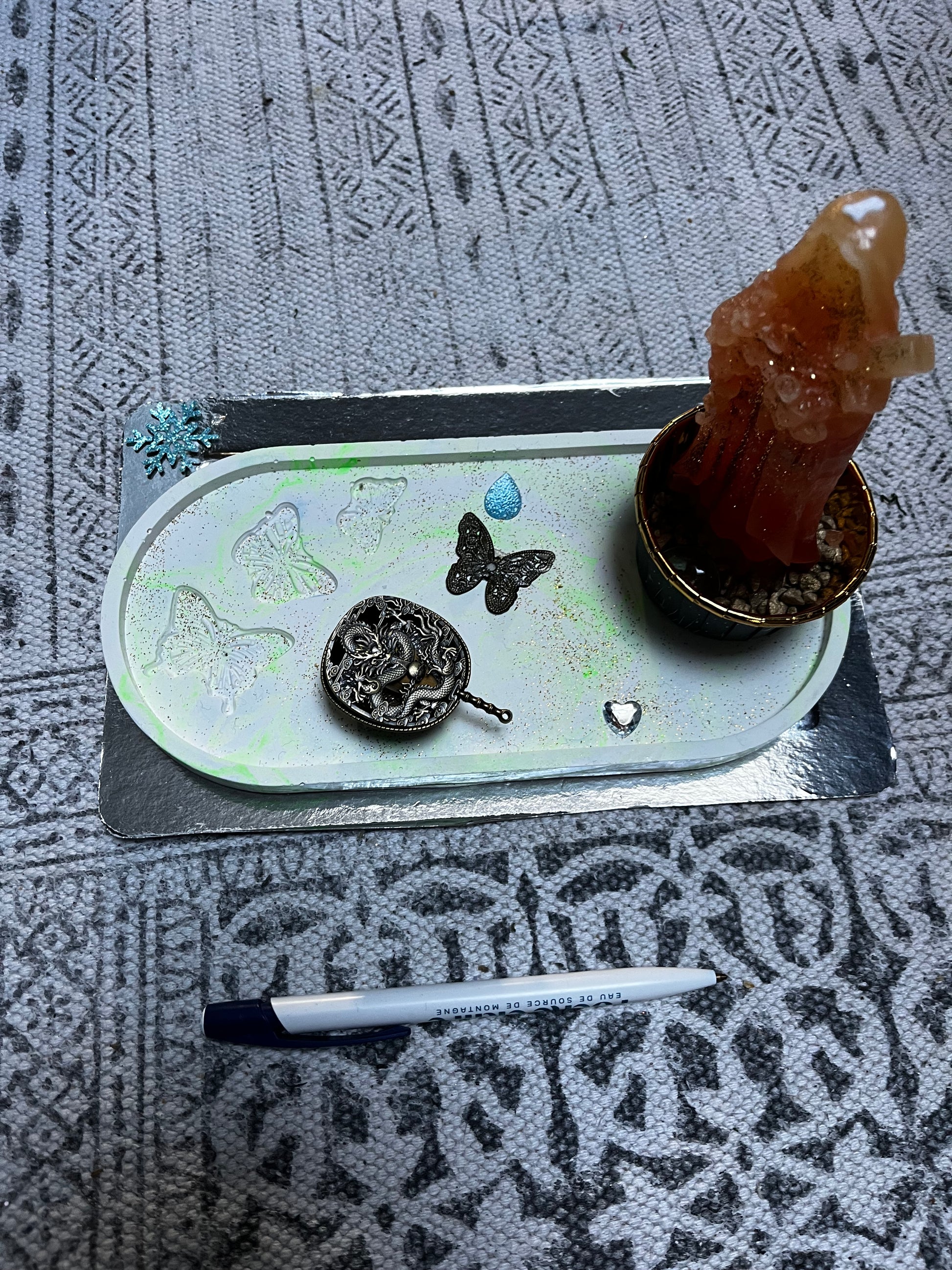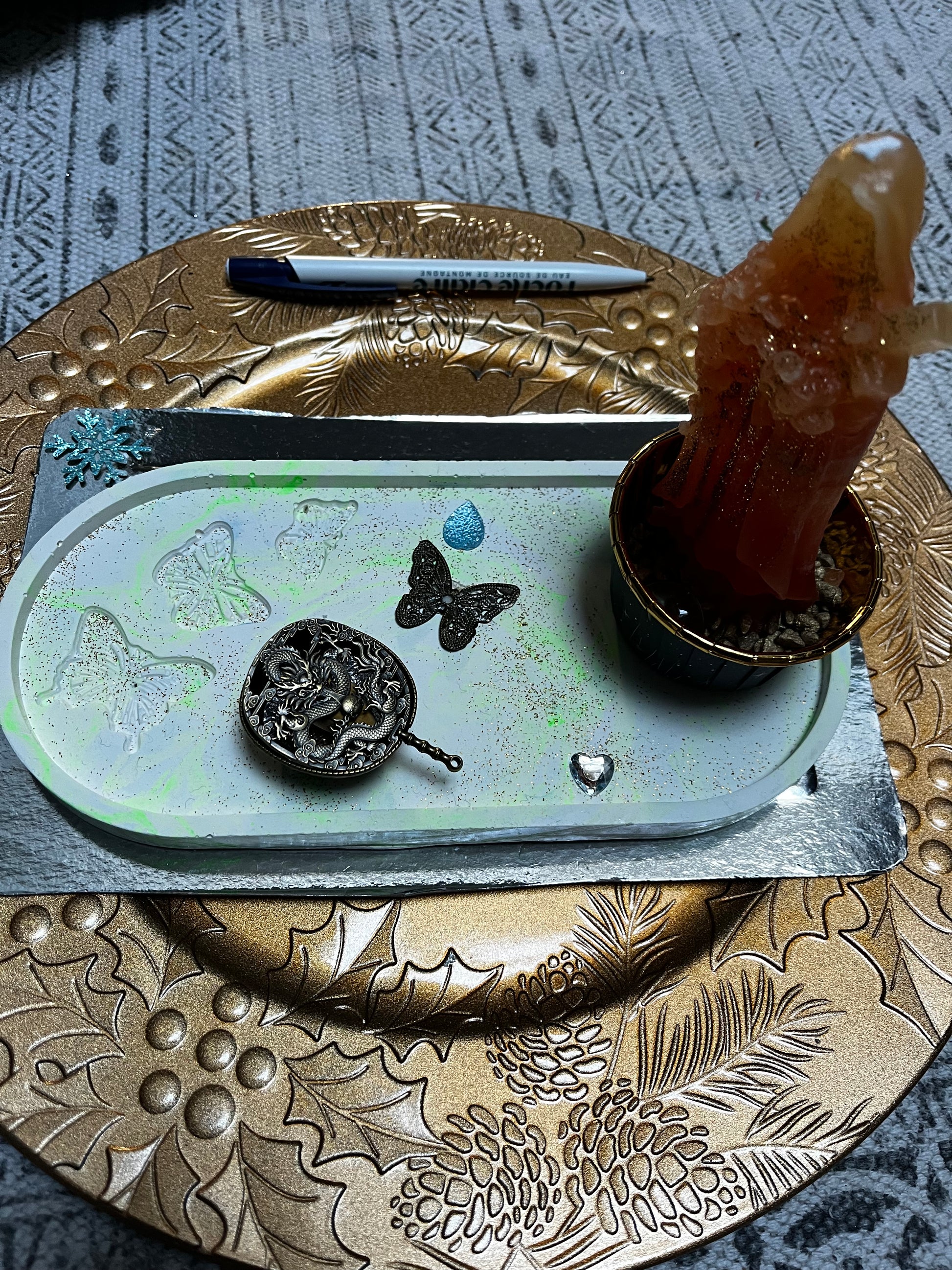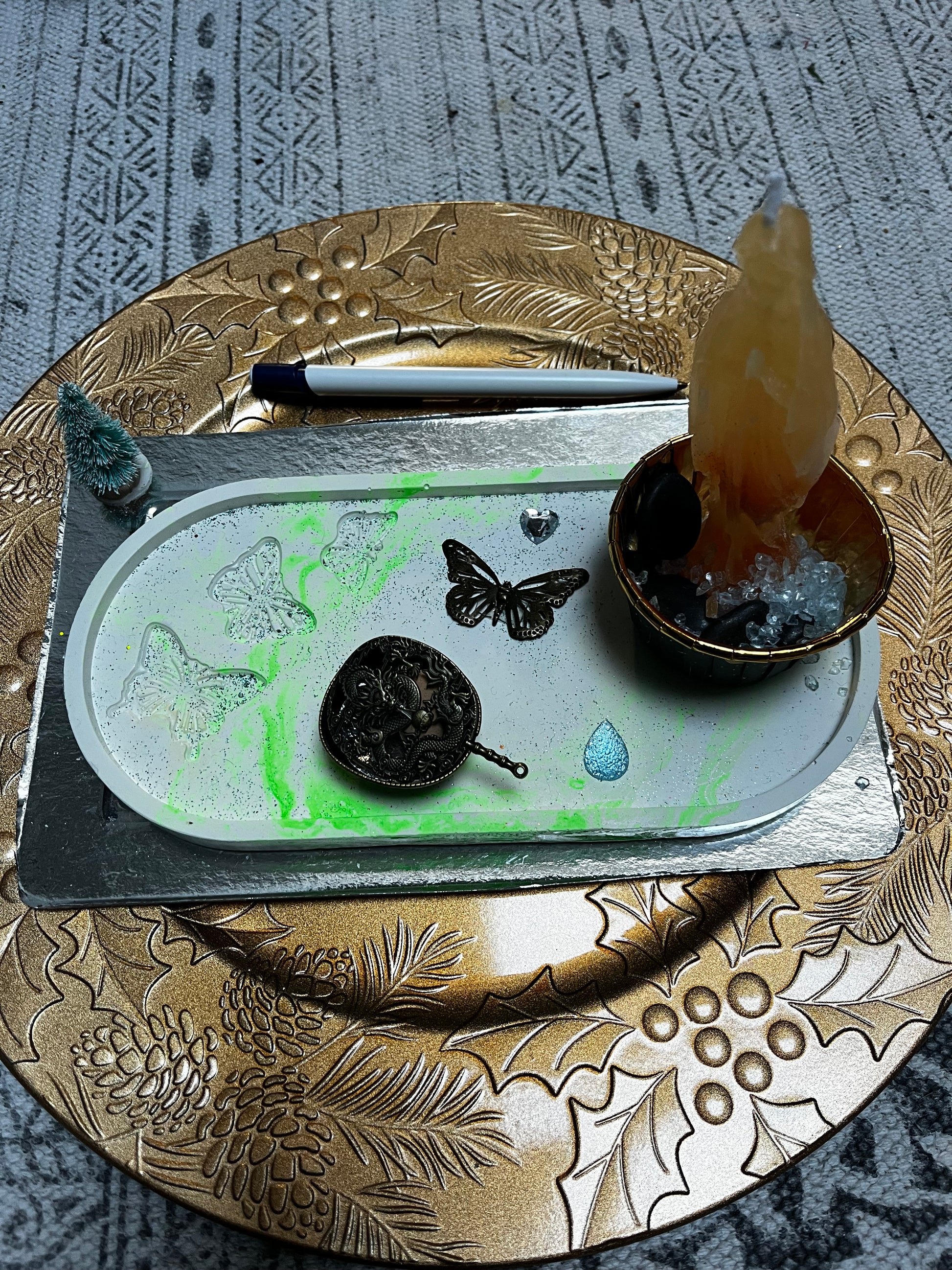 Très belle bougie Sainte, posée sur un grand plateau en plâtre, accompagné d’un porte encens, pour un moment de prière et de repos.