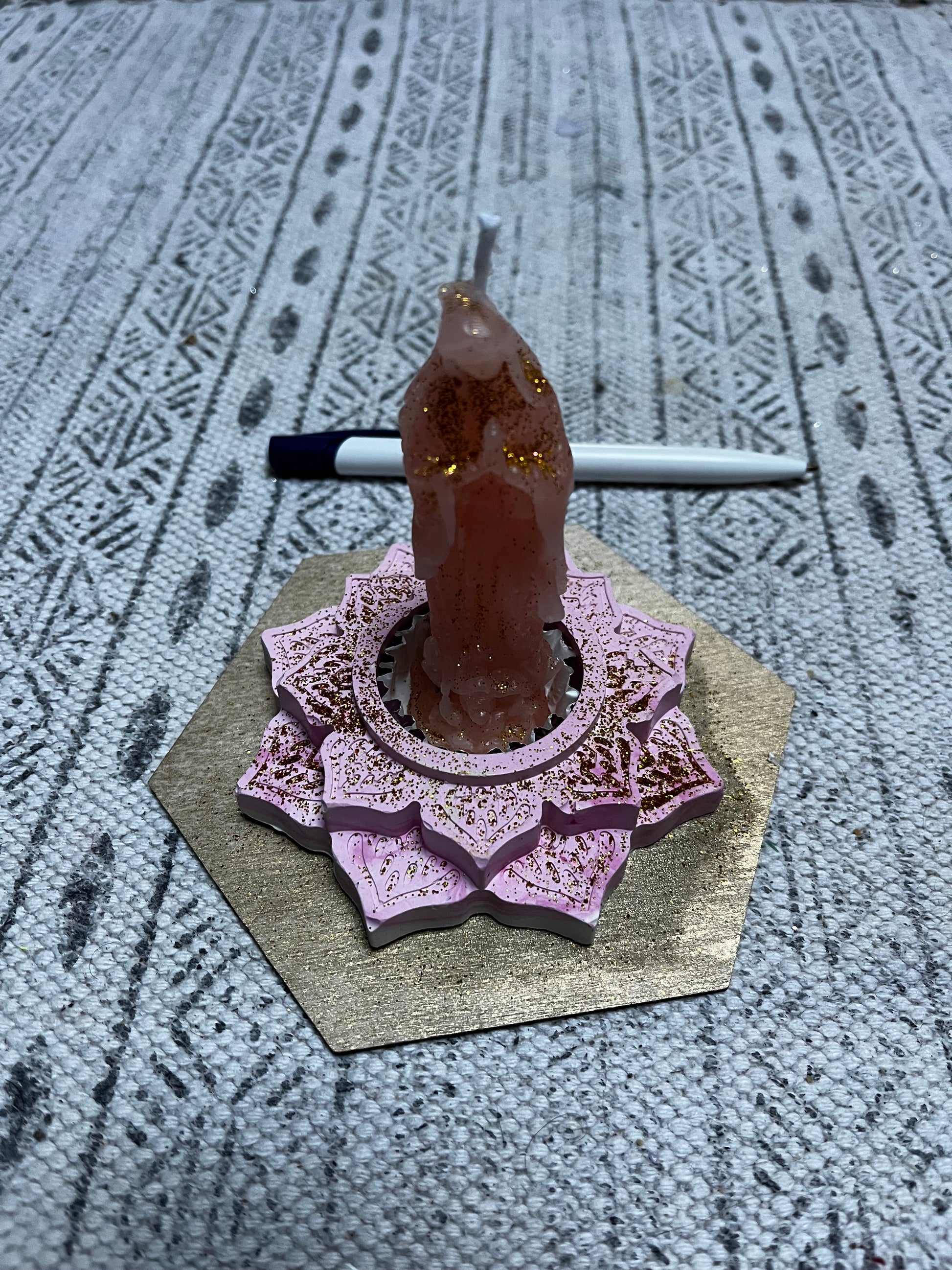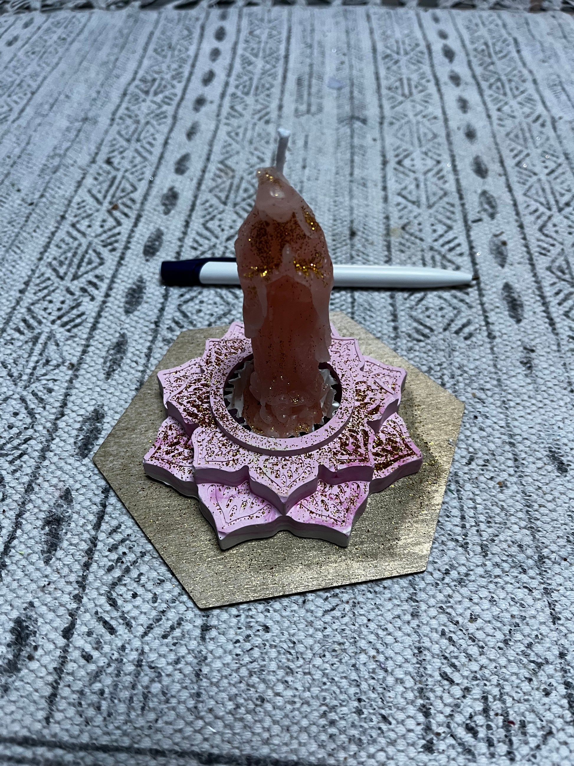 Très belle bougie sainte de couleur orangée posée au centre d un support en plâtre de couleur blanc/rose.