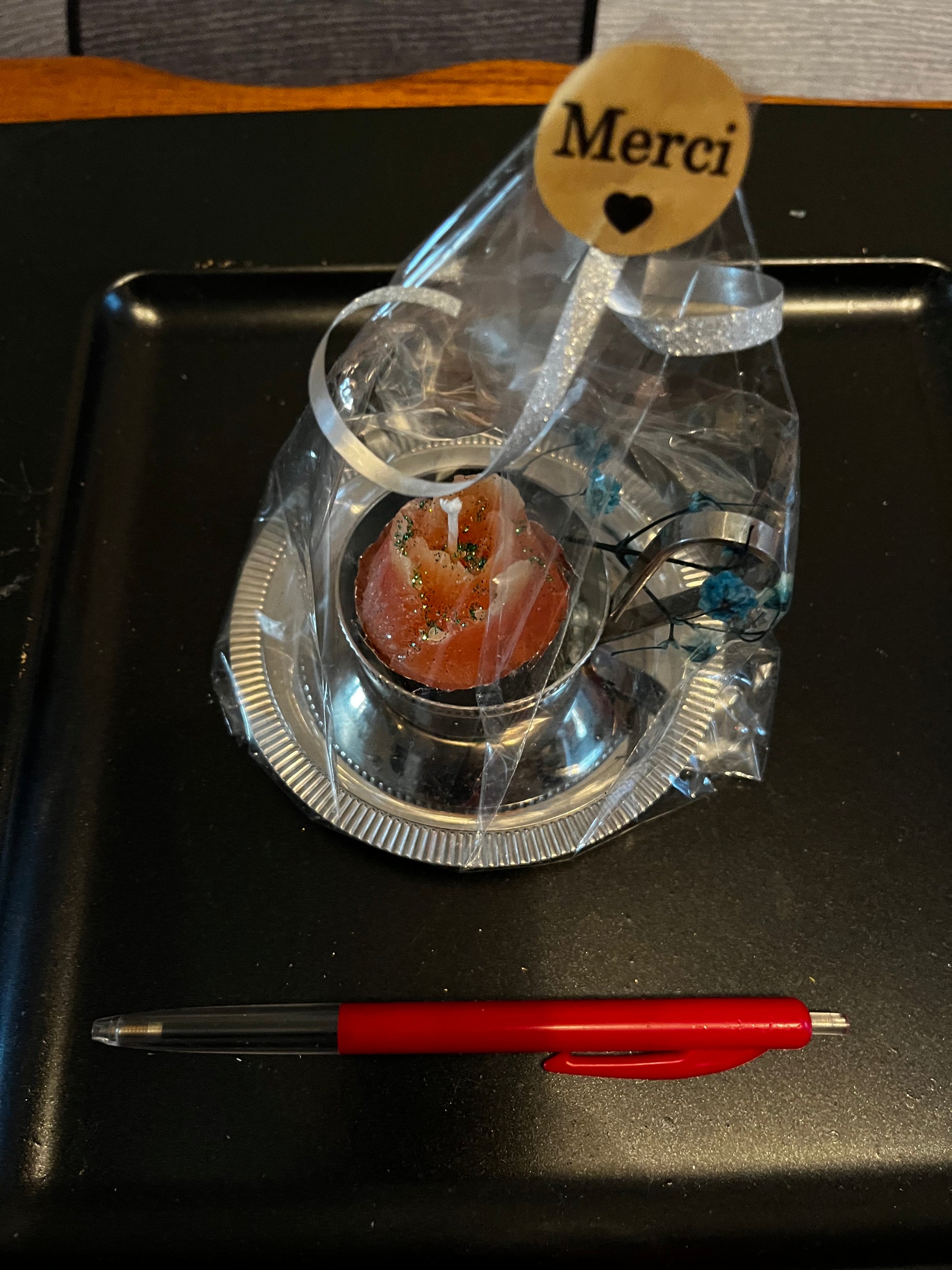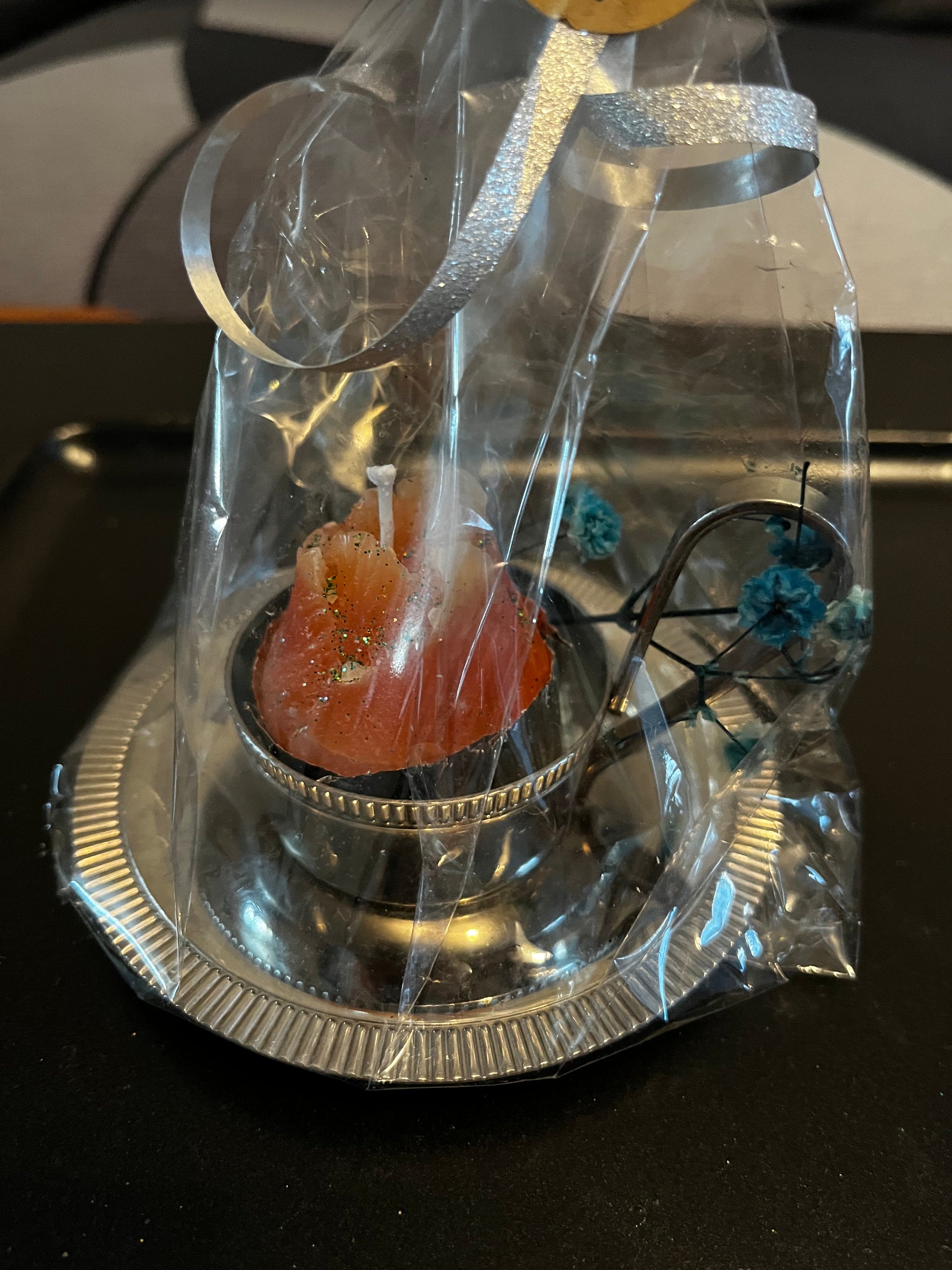 Bougies dans petite tasse et soucoupe argentée en acier.