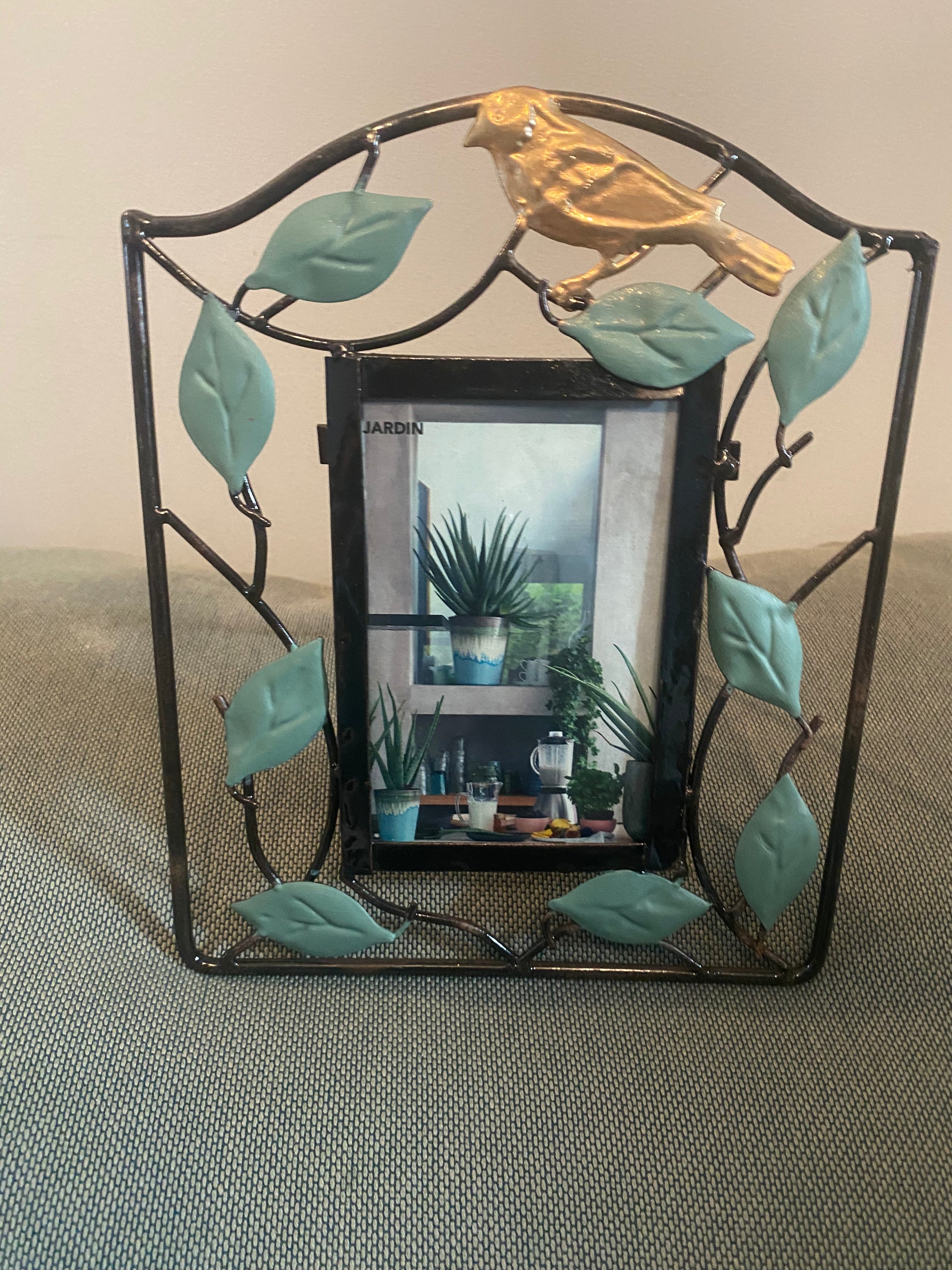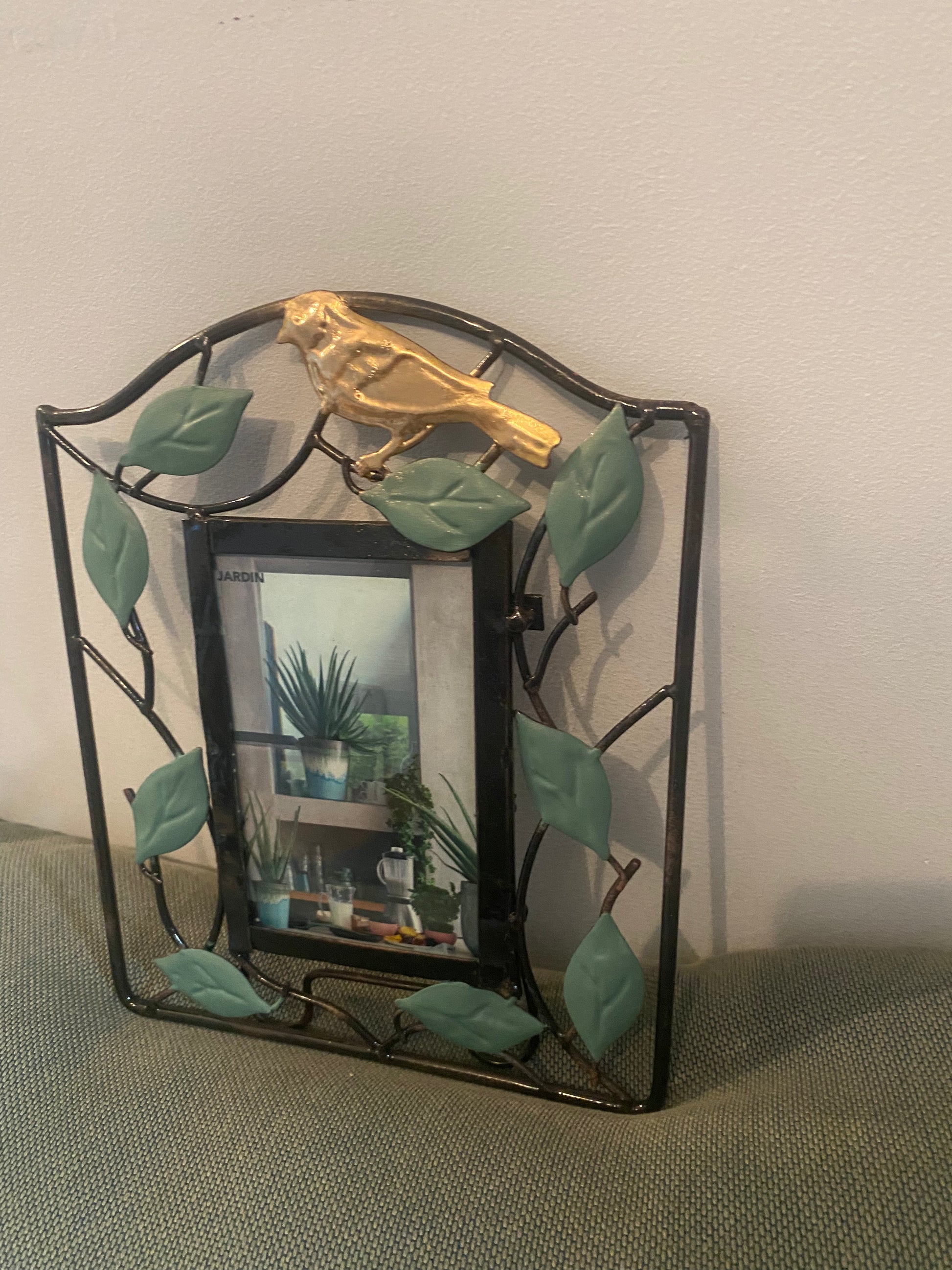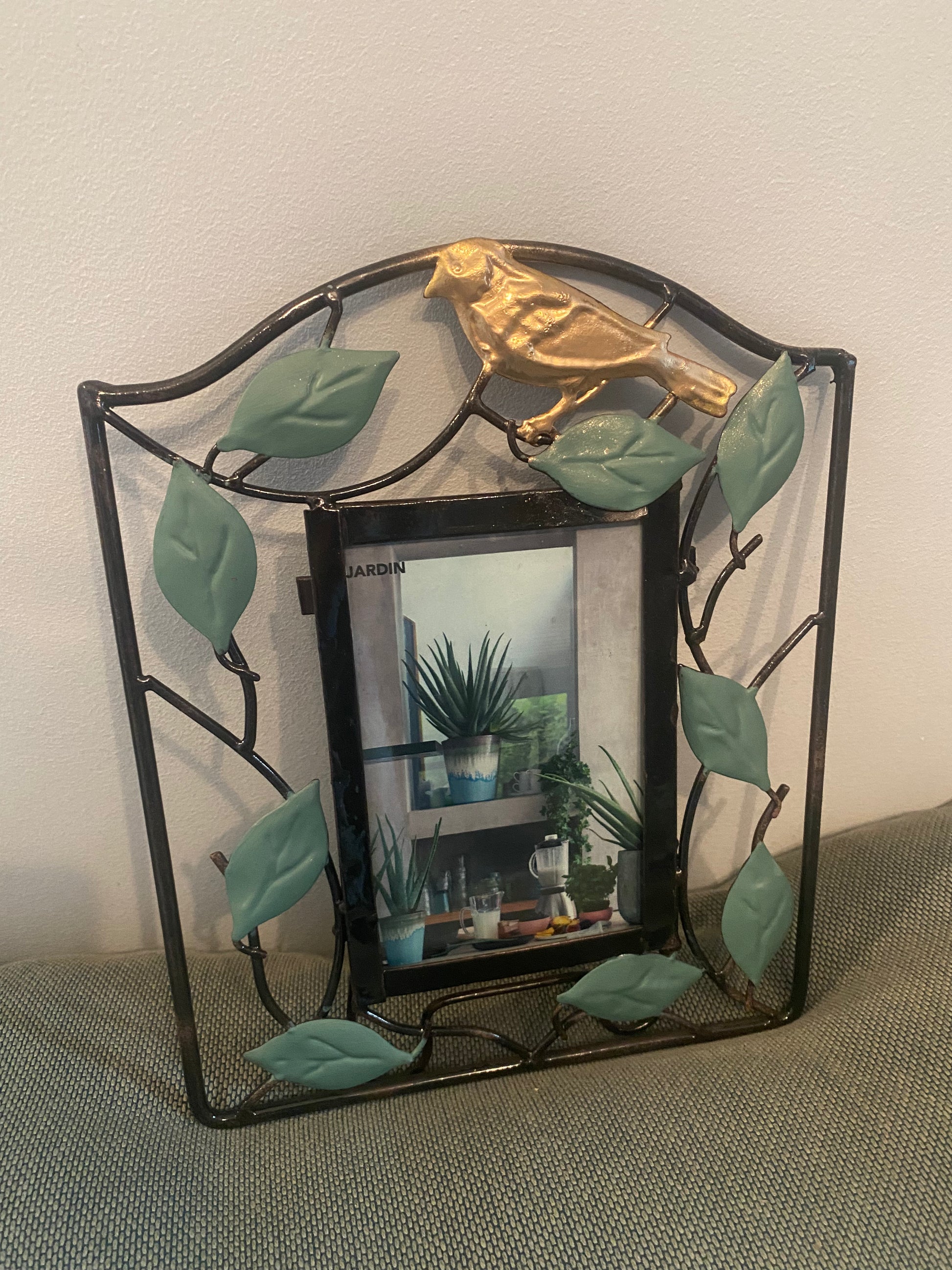 Très beau cadre avec décors de branches avec des feuilles vertes et un bel oiseau couleur or.