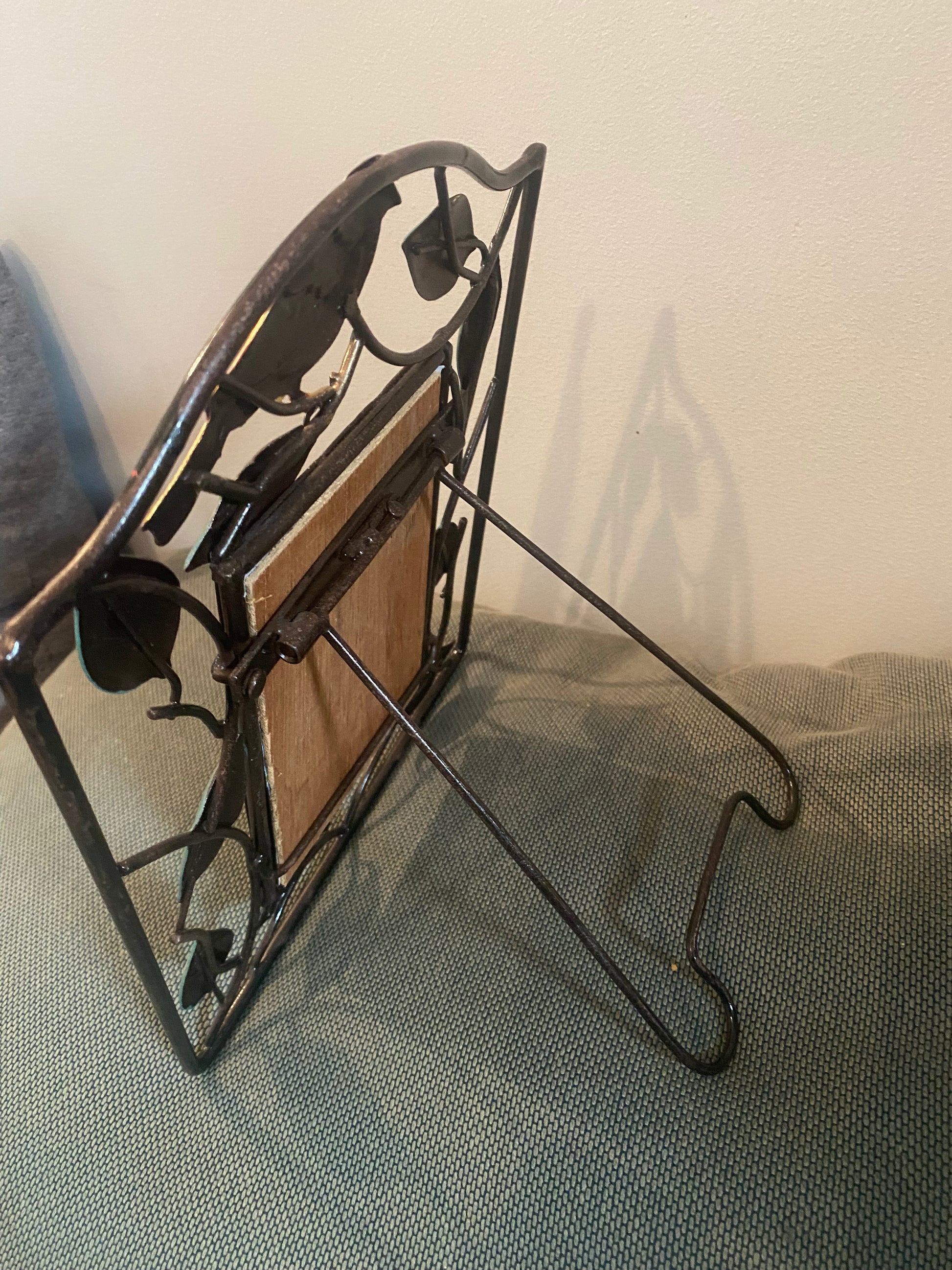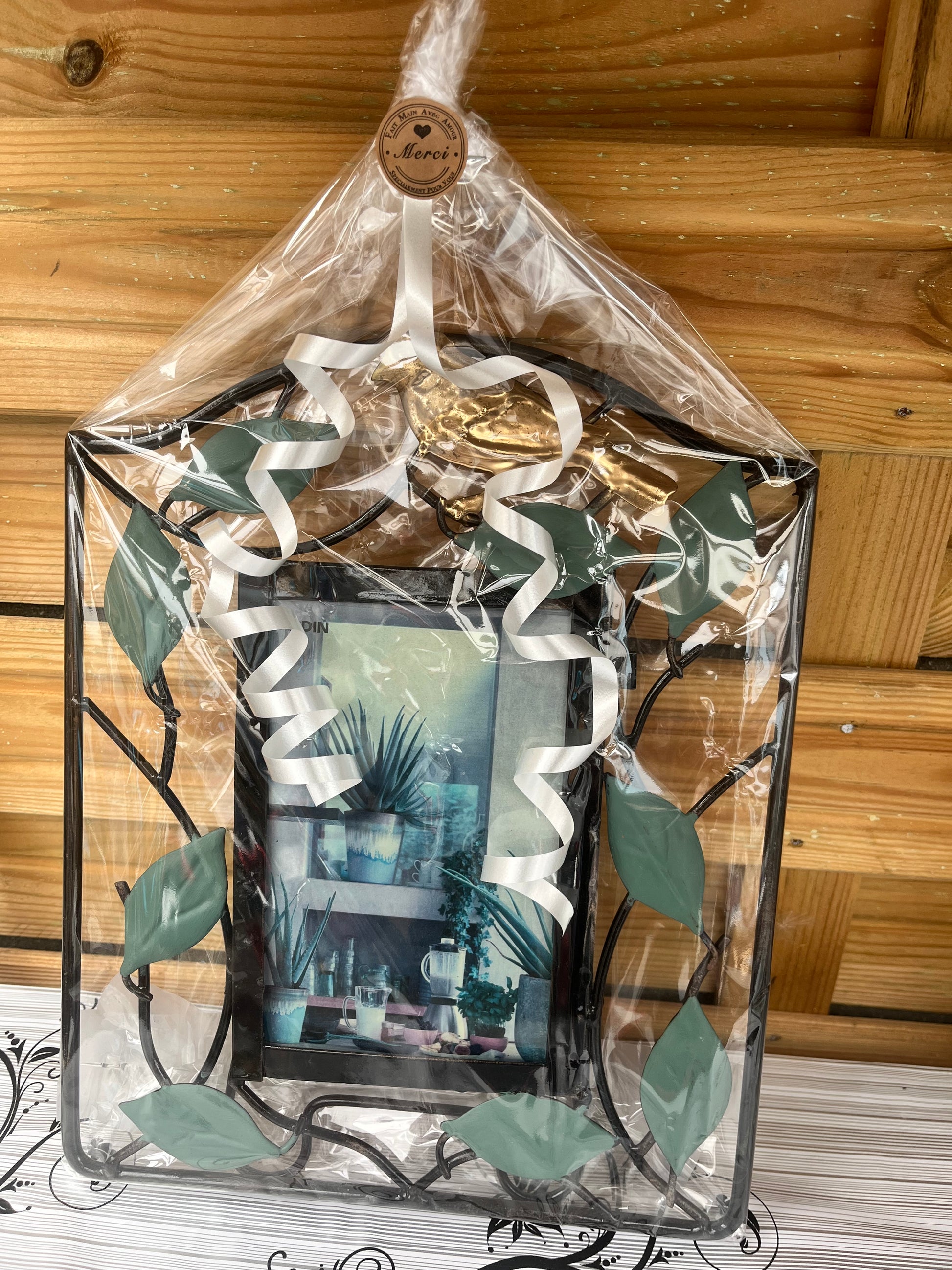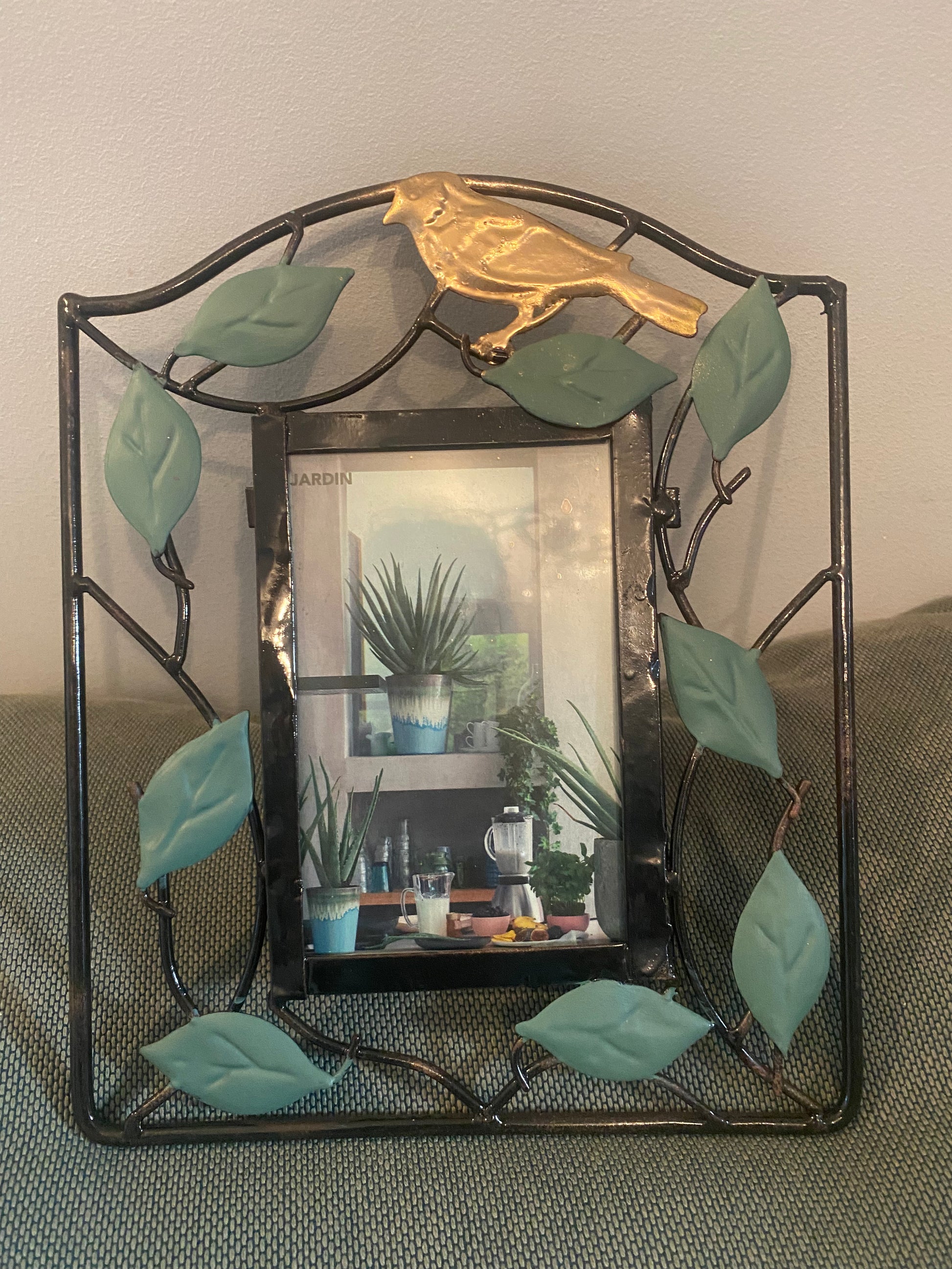 Très beau cadre avec décors de branches avec des feuilles vertes et un bel oiseau couleur or.