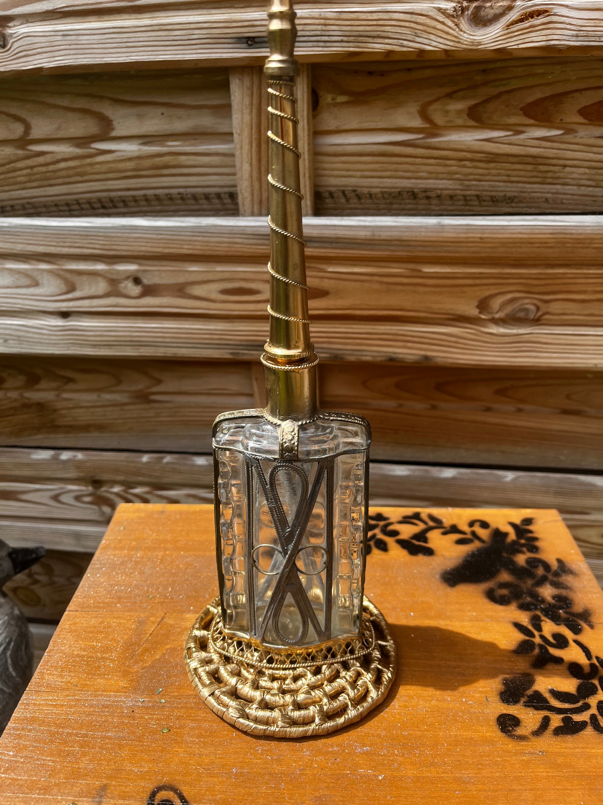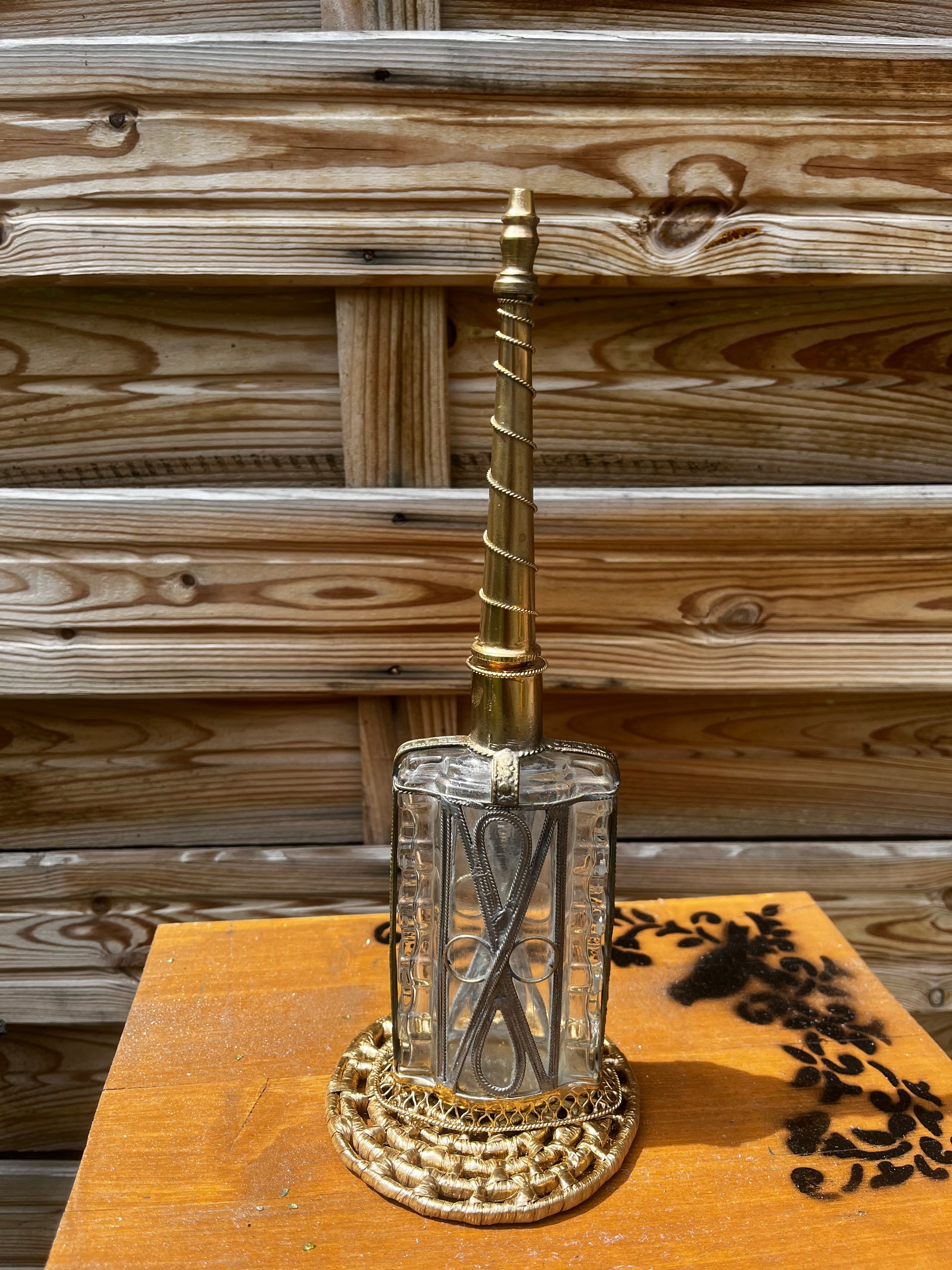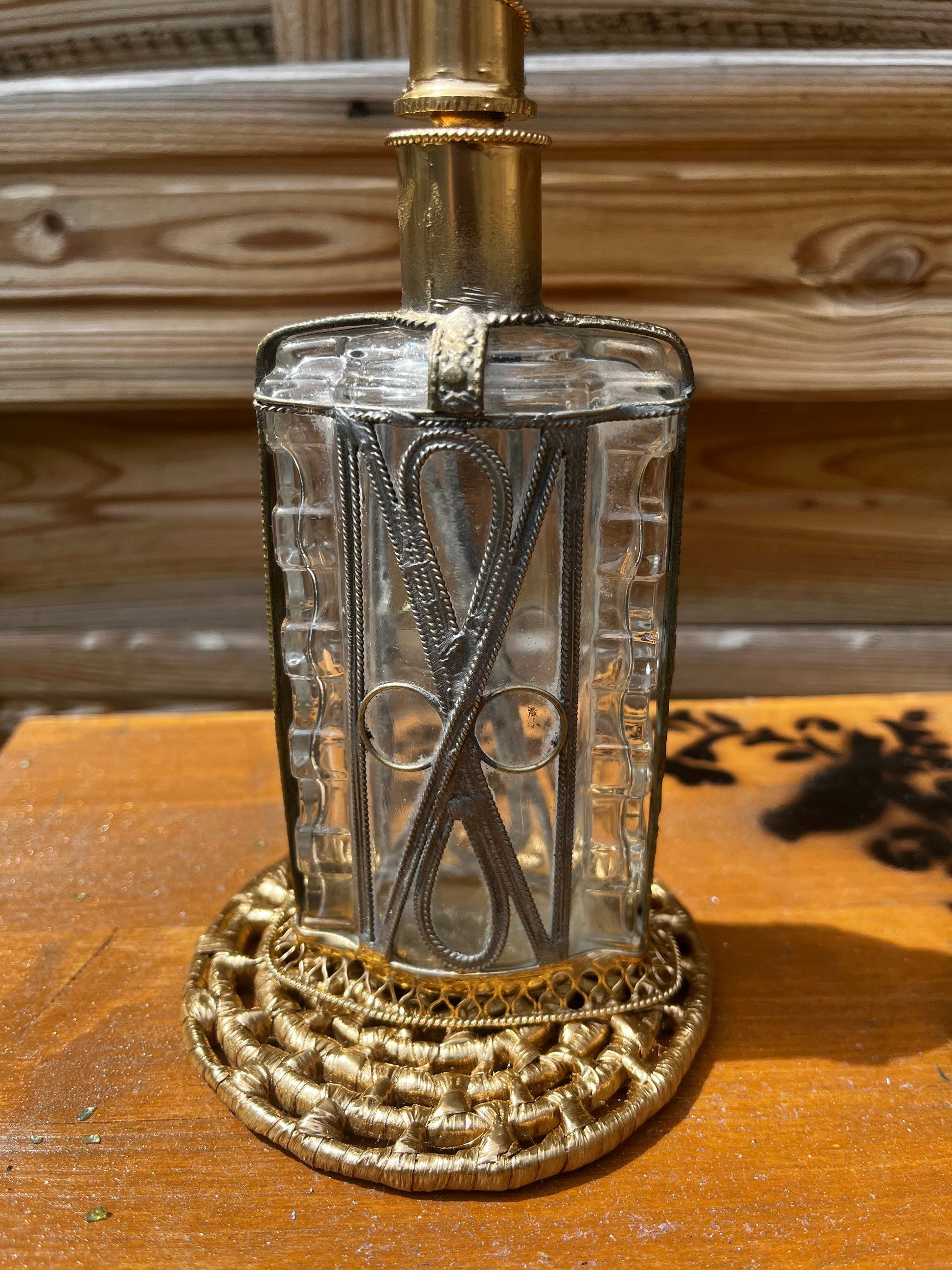 Magnifique flacon ancien à parfum en verre, avec de très beaux décors en laiton ou acier