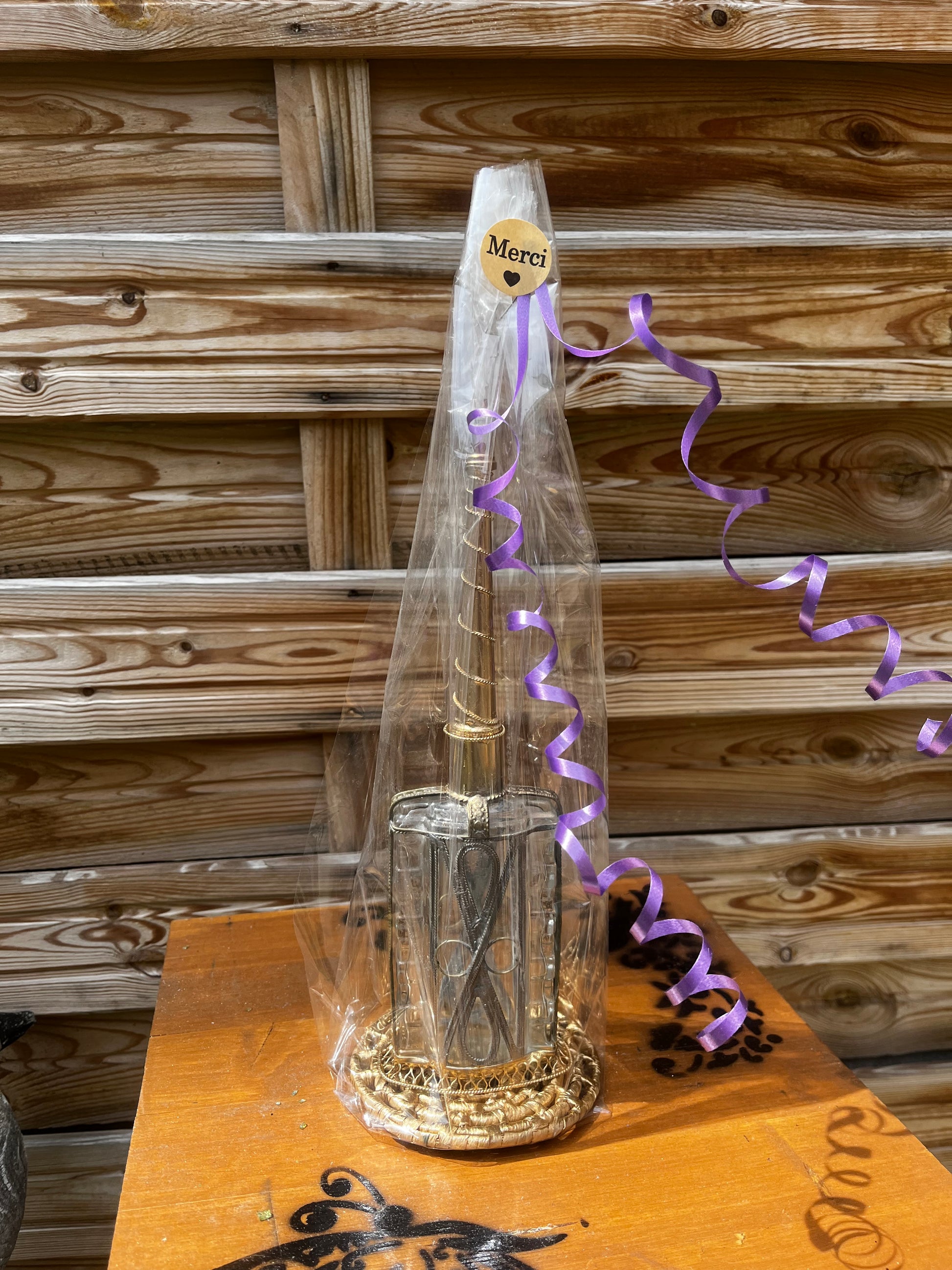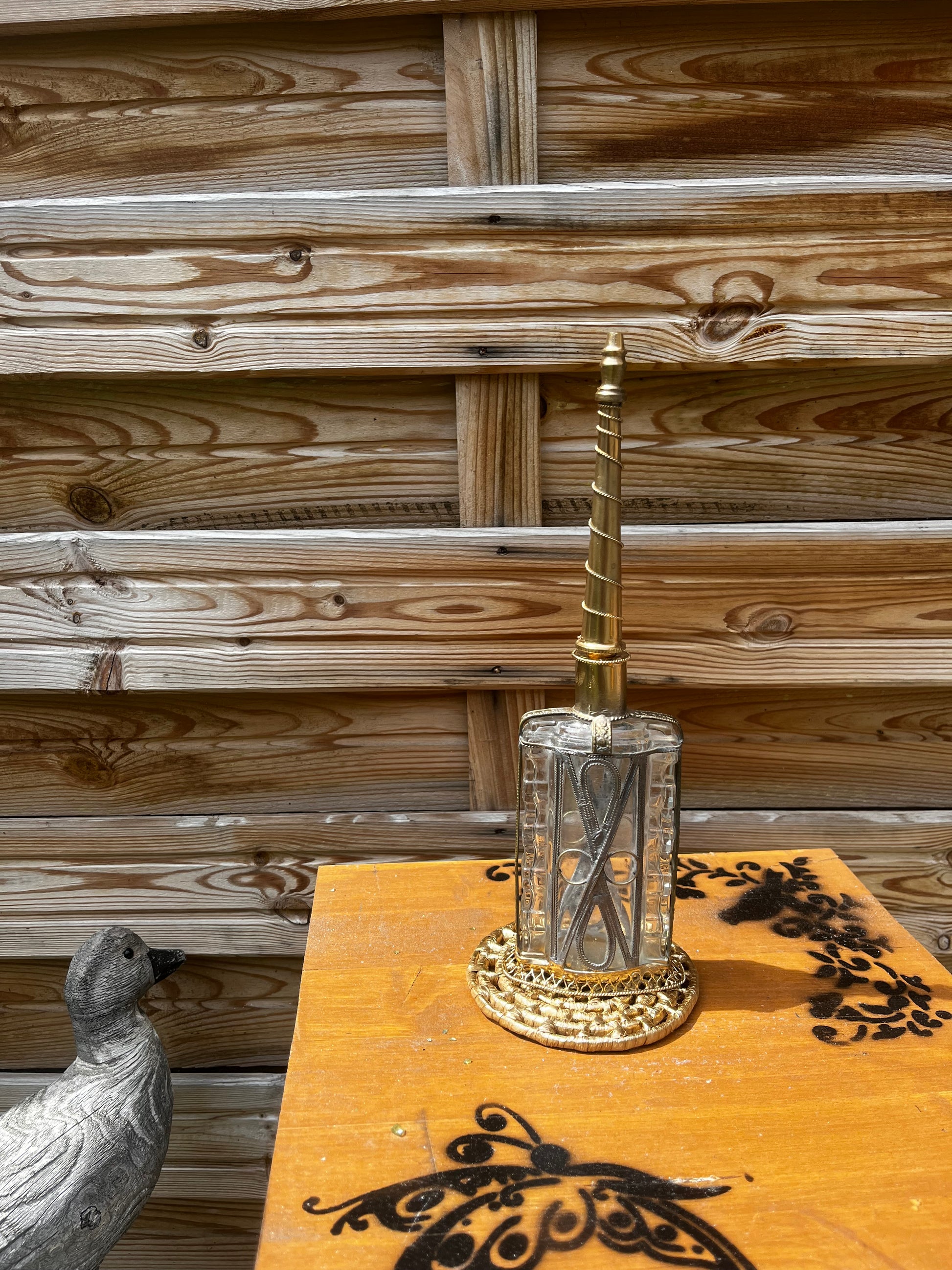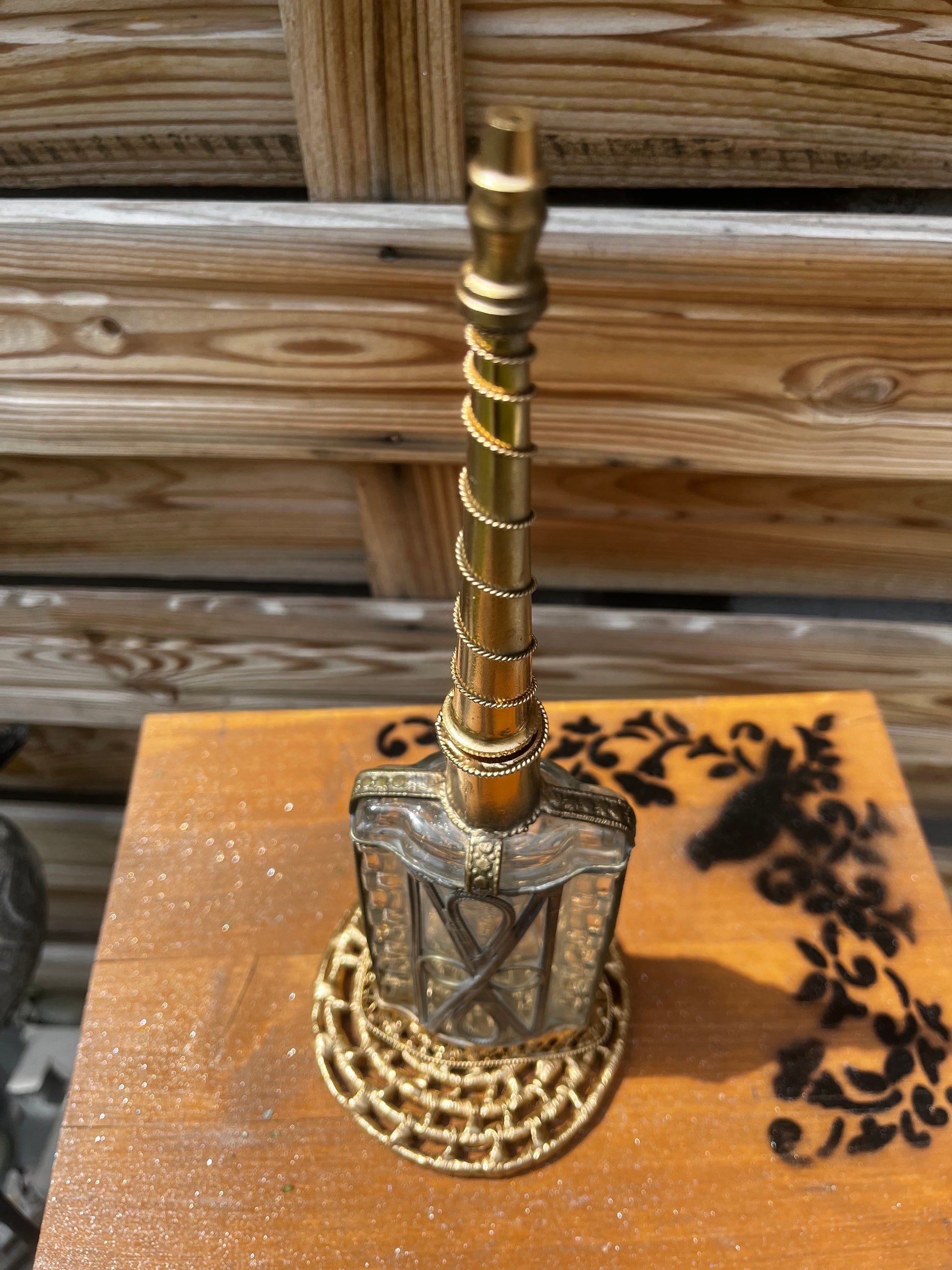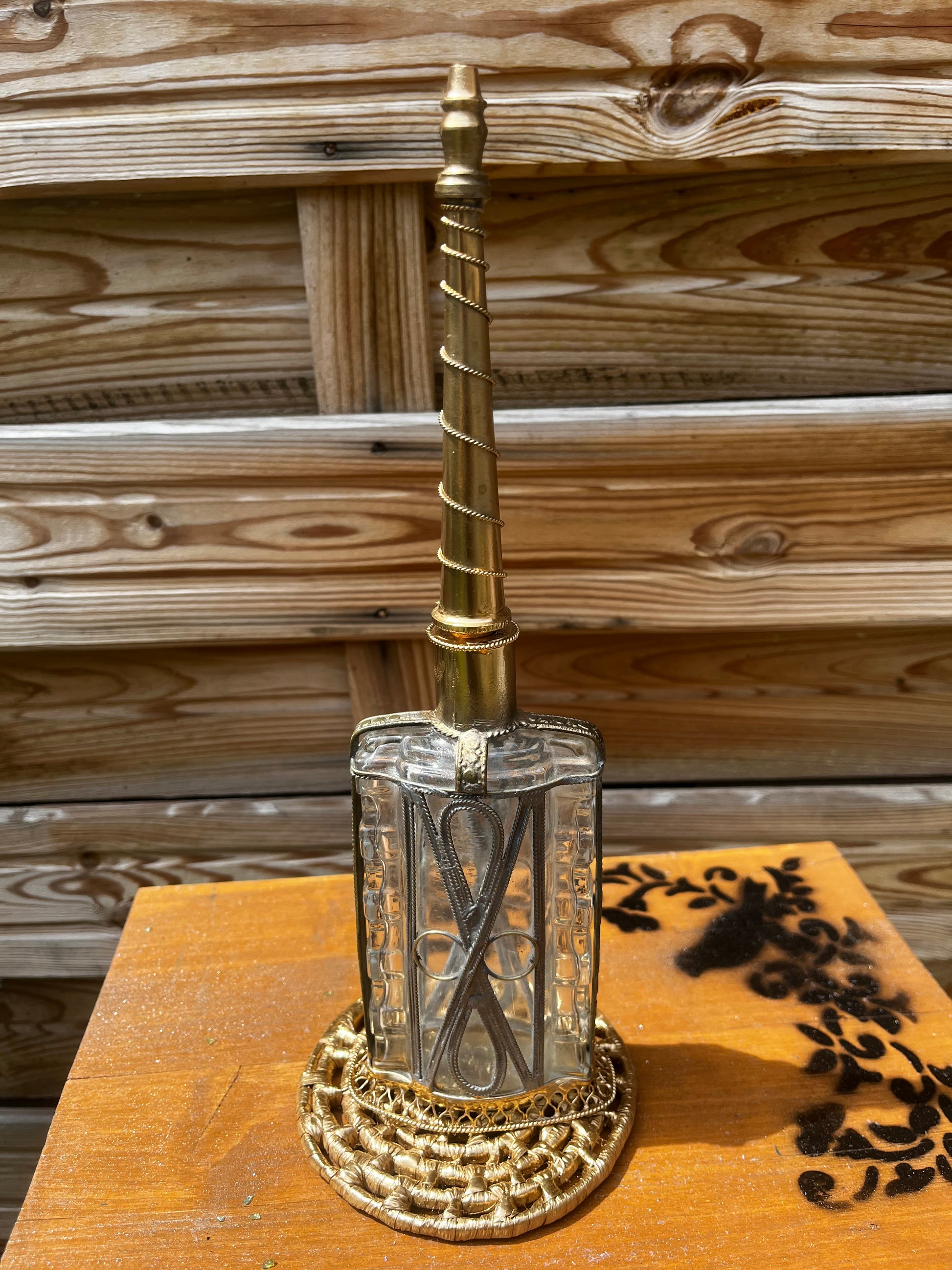 Magnifique flacon ancien à parfum en verre, avec de très beaux décors en laiton ou acier