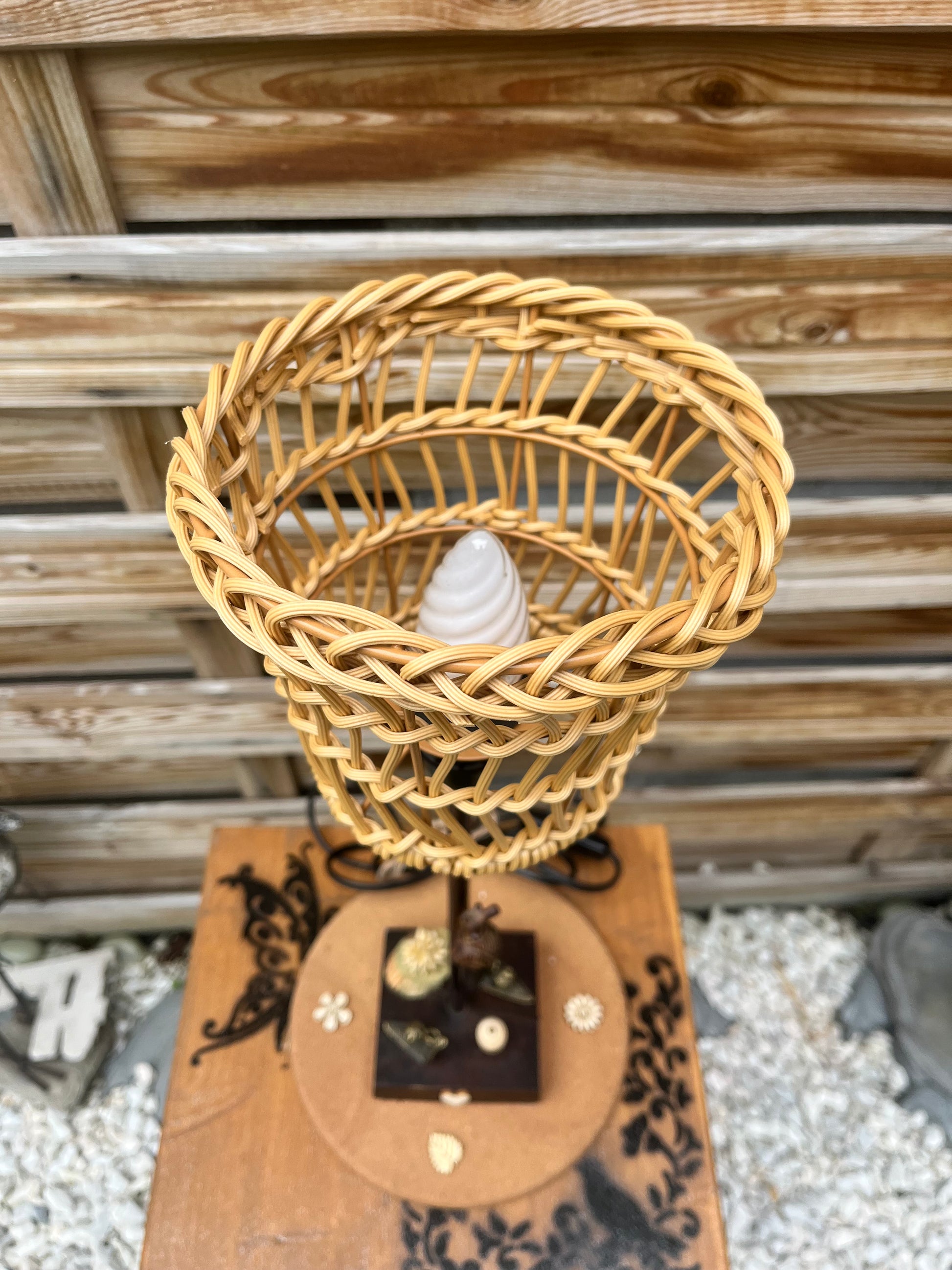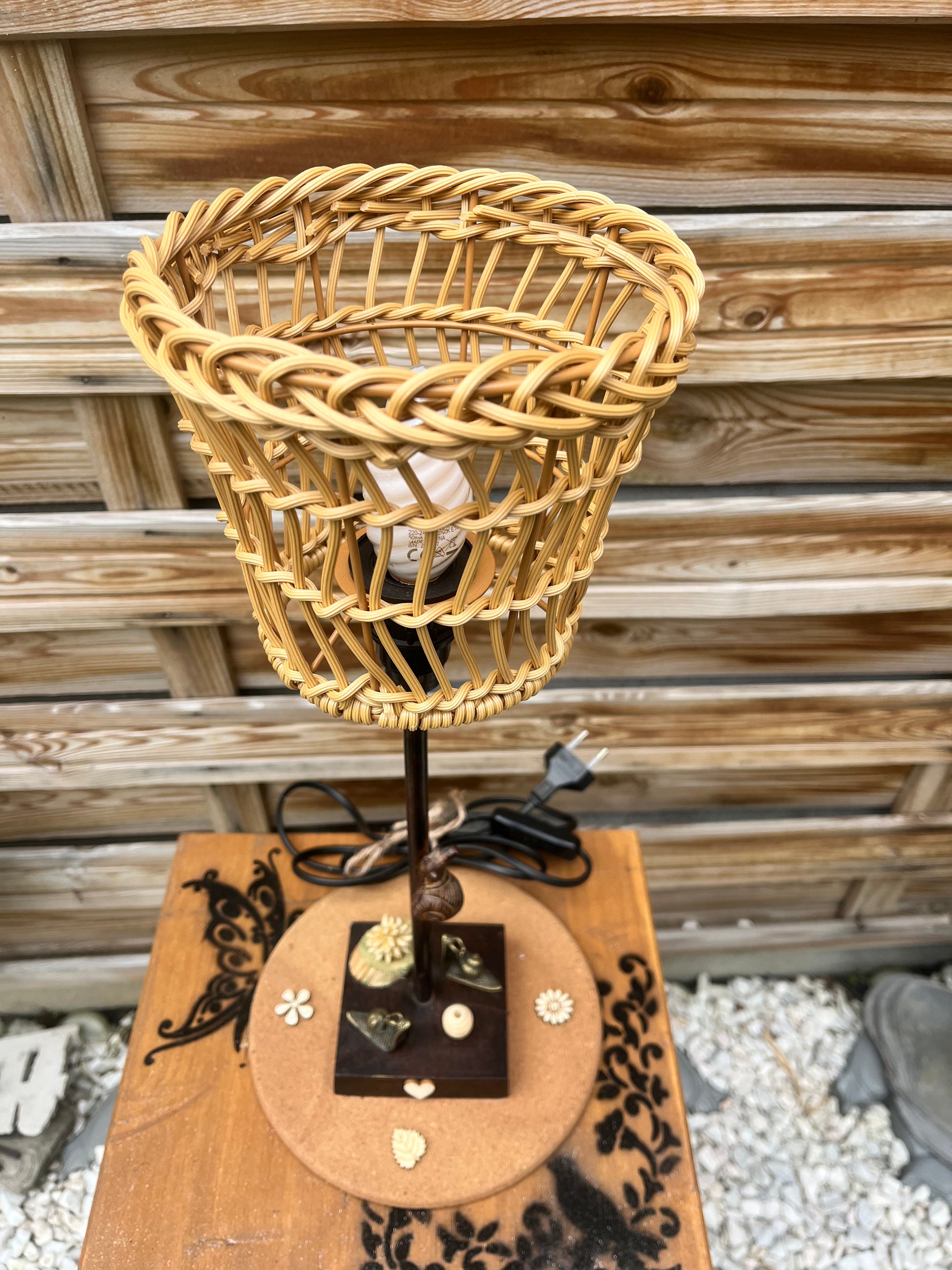 Lampe avec tige en acier à décors d'escargots, et abat jour en osier, posée sur un plateau en liège. Très originale.