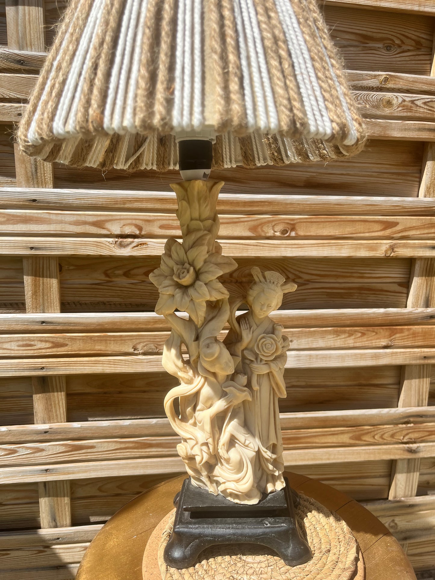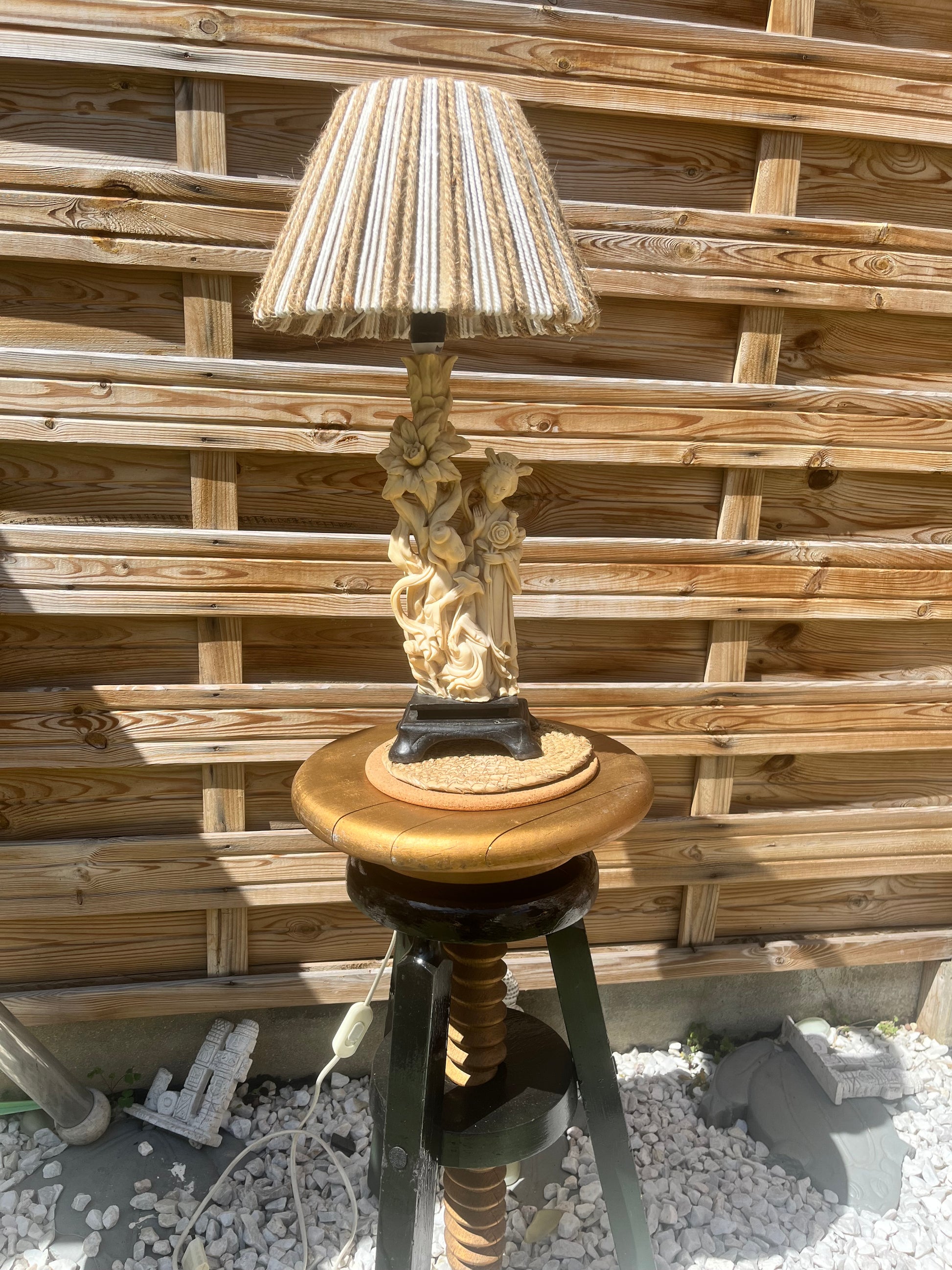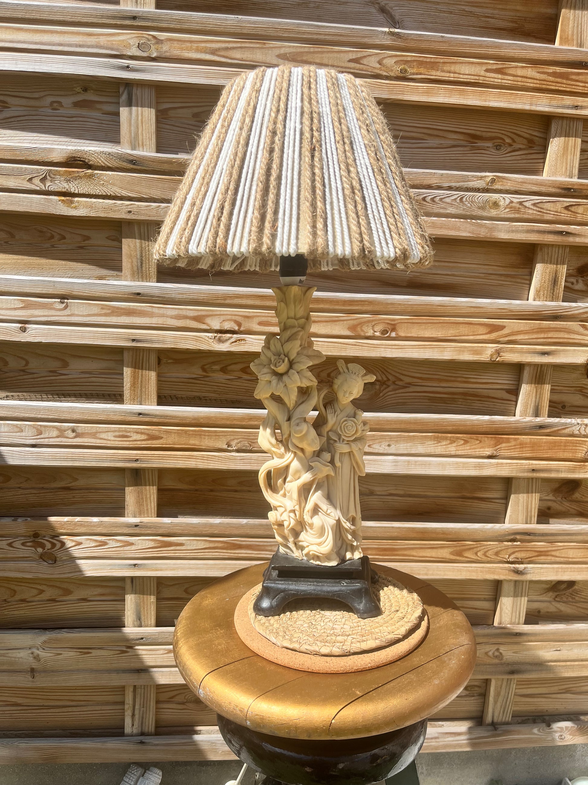 Magnifique lampe geisha en résine et abat jour en cordes beige et blanc, fait main.