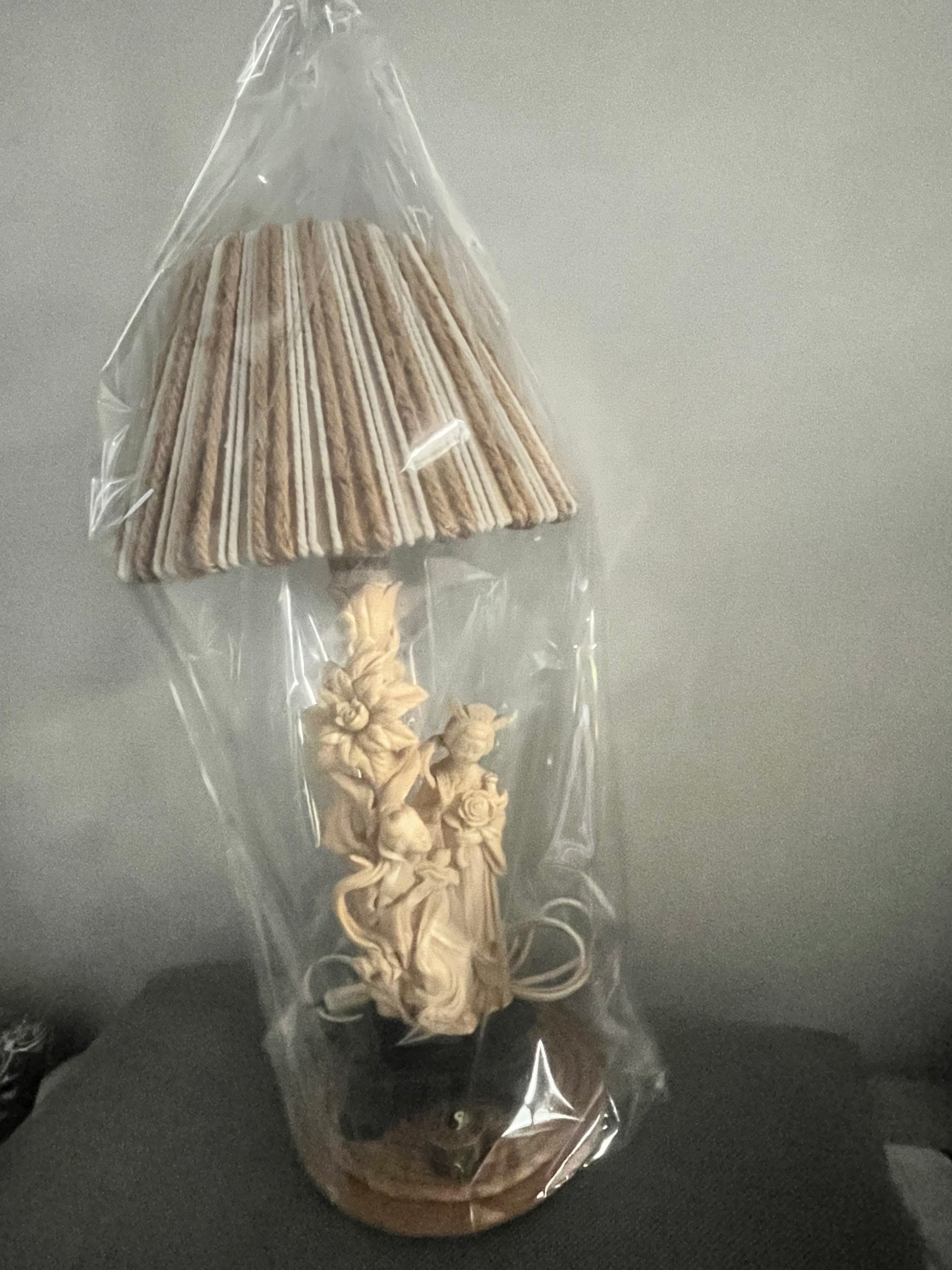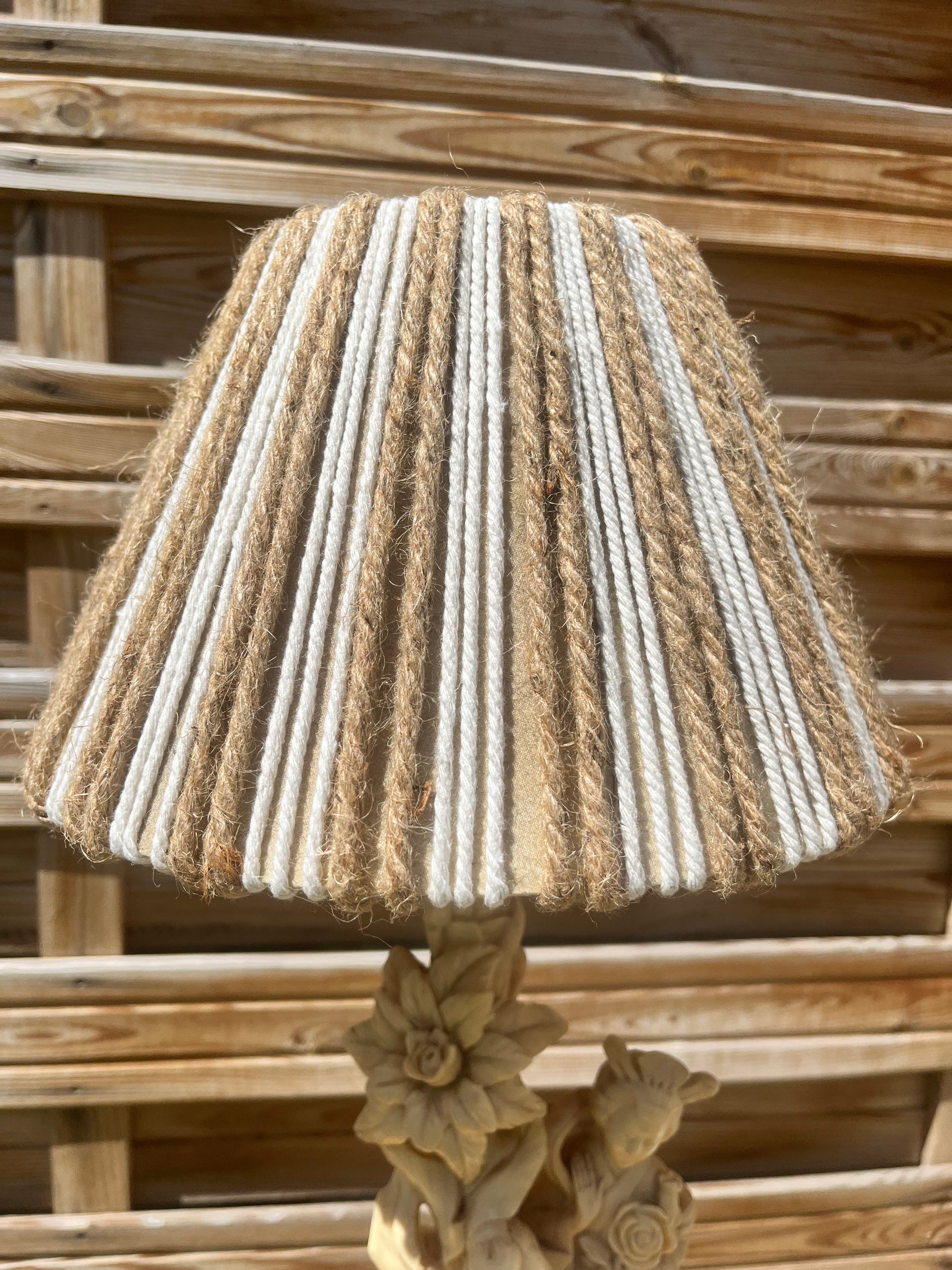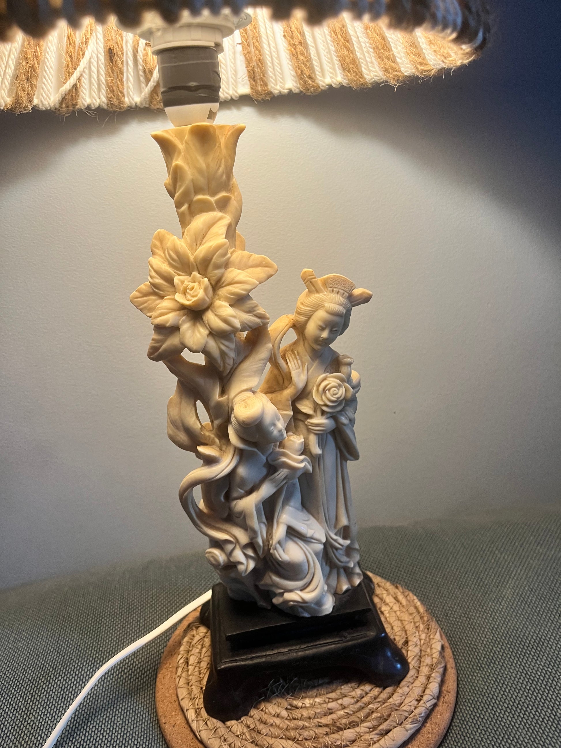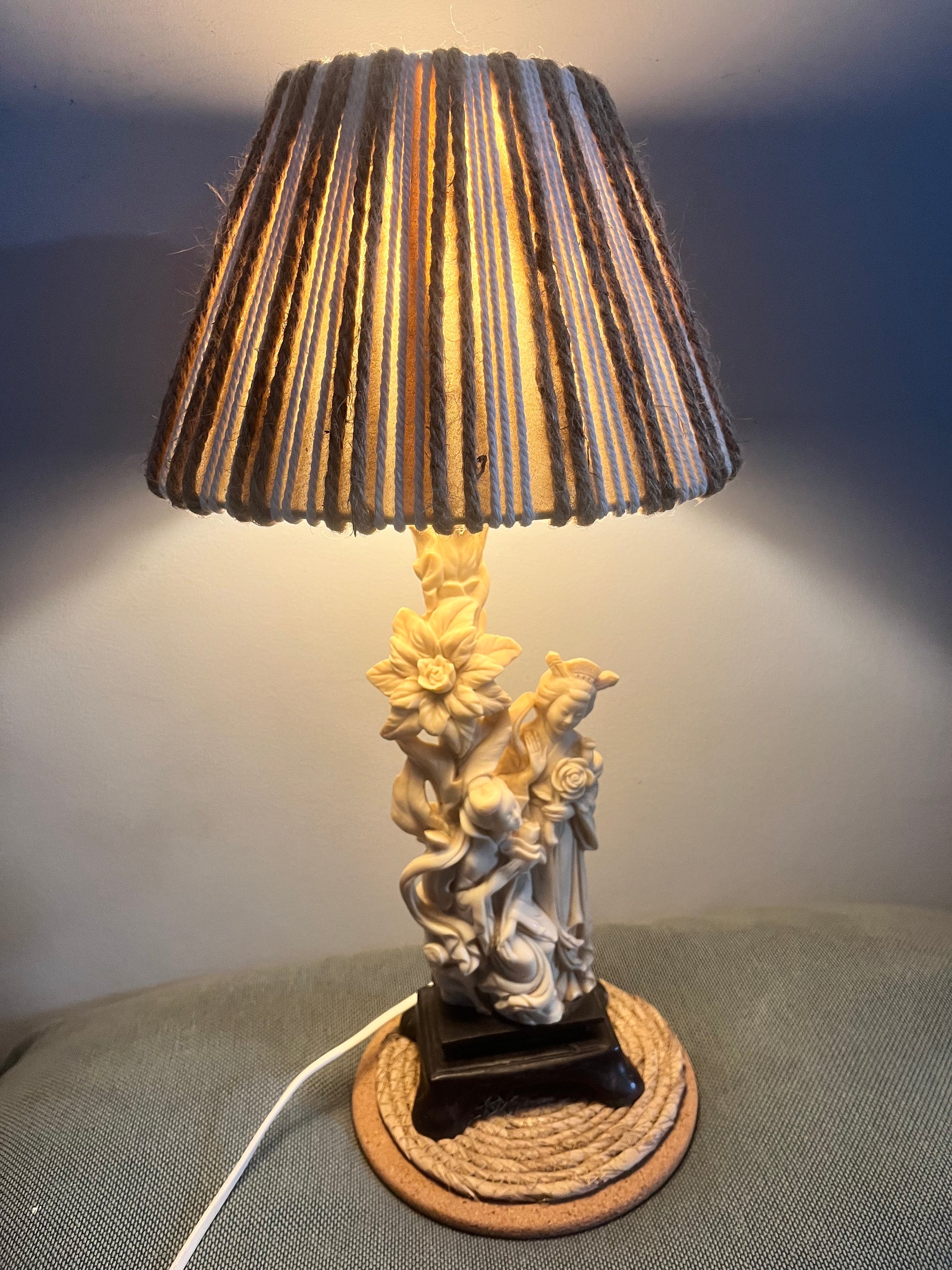 Magnifique lampe geisha en résine et abat jour en cordes beige et blanc, fait main.