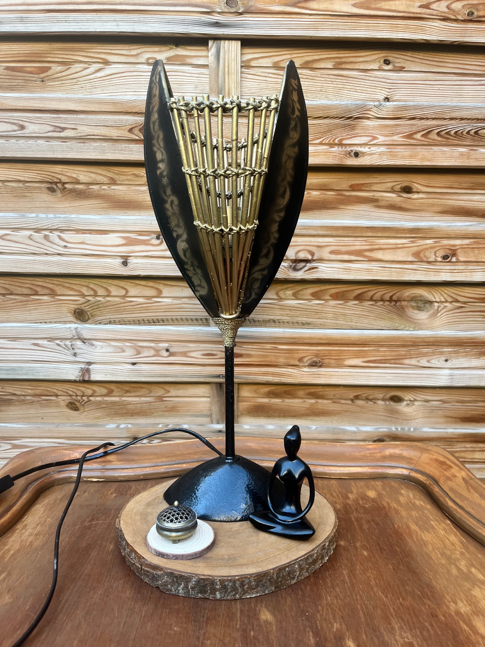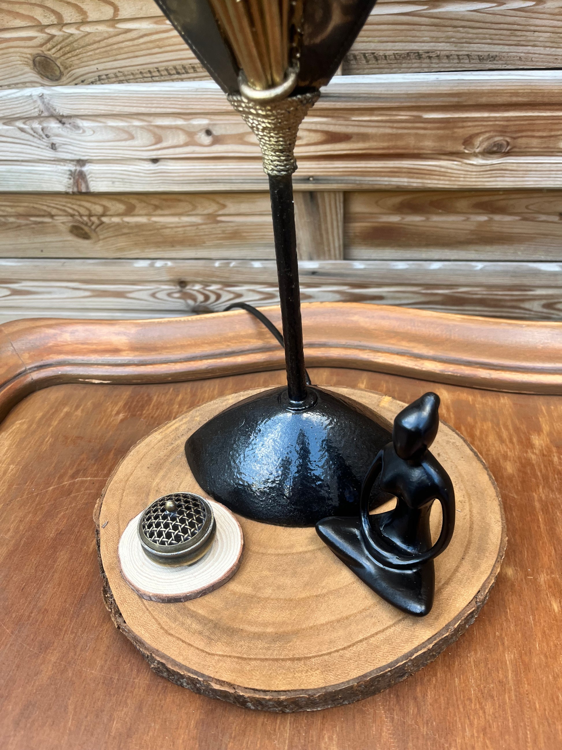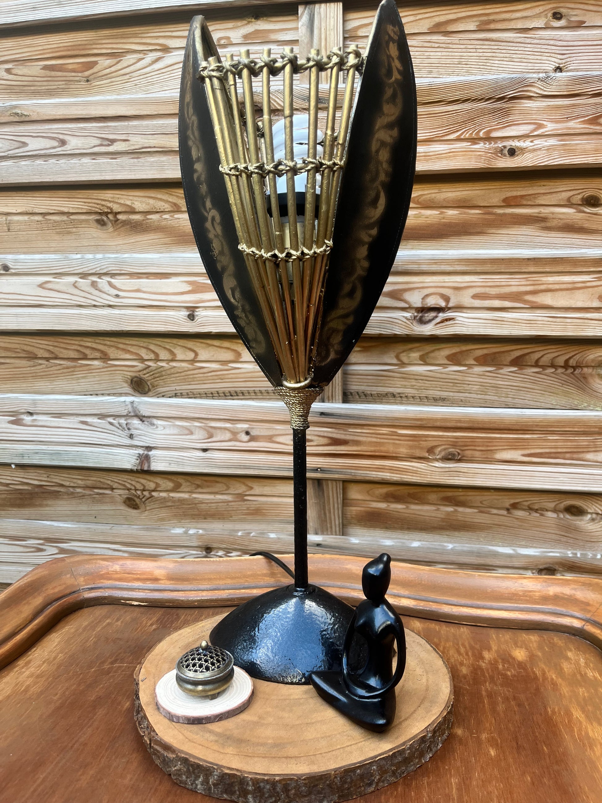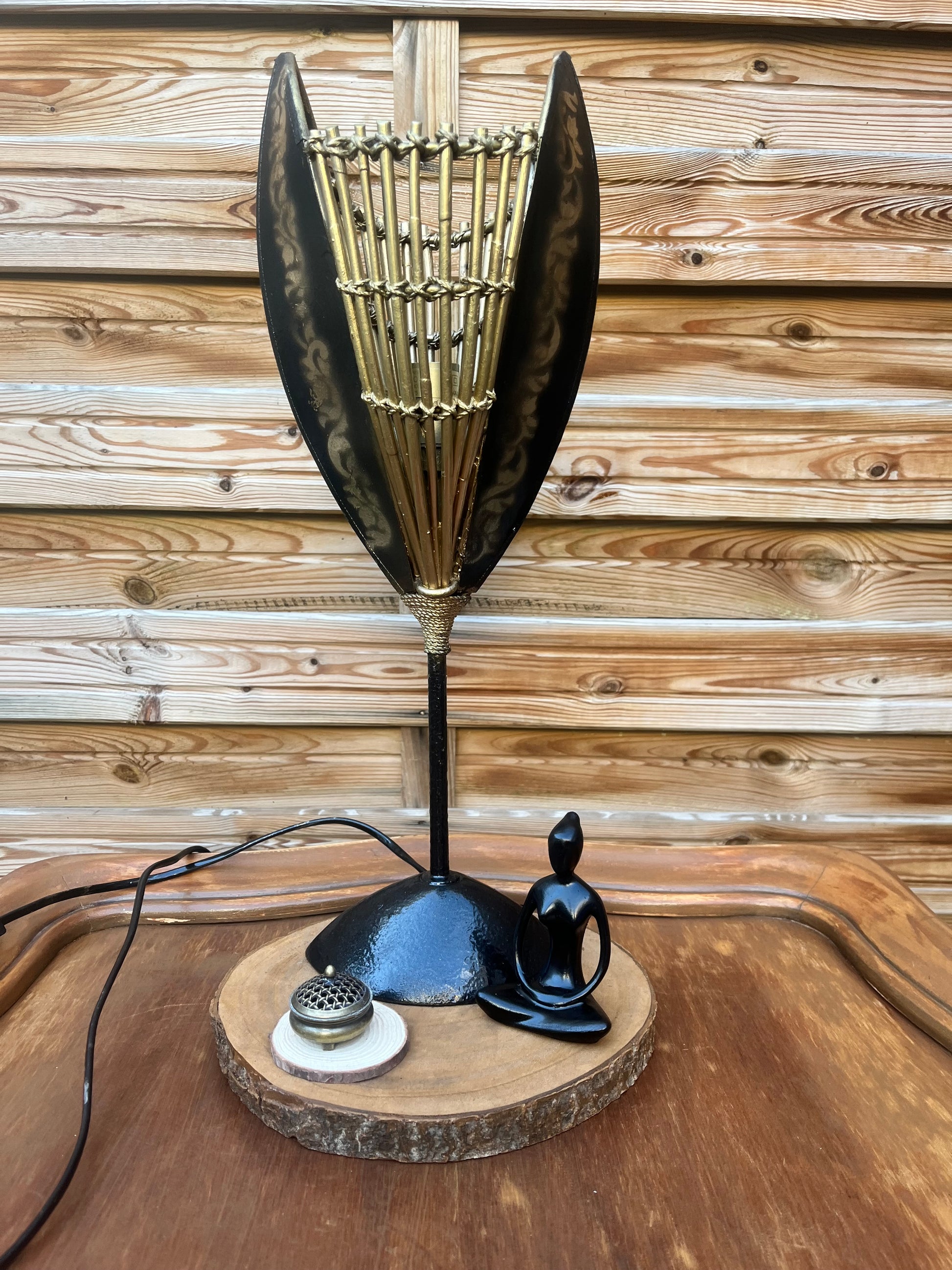 Belle lampe noire et or, avec statuette de femme zen et porte encens.