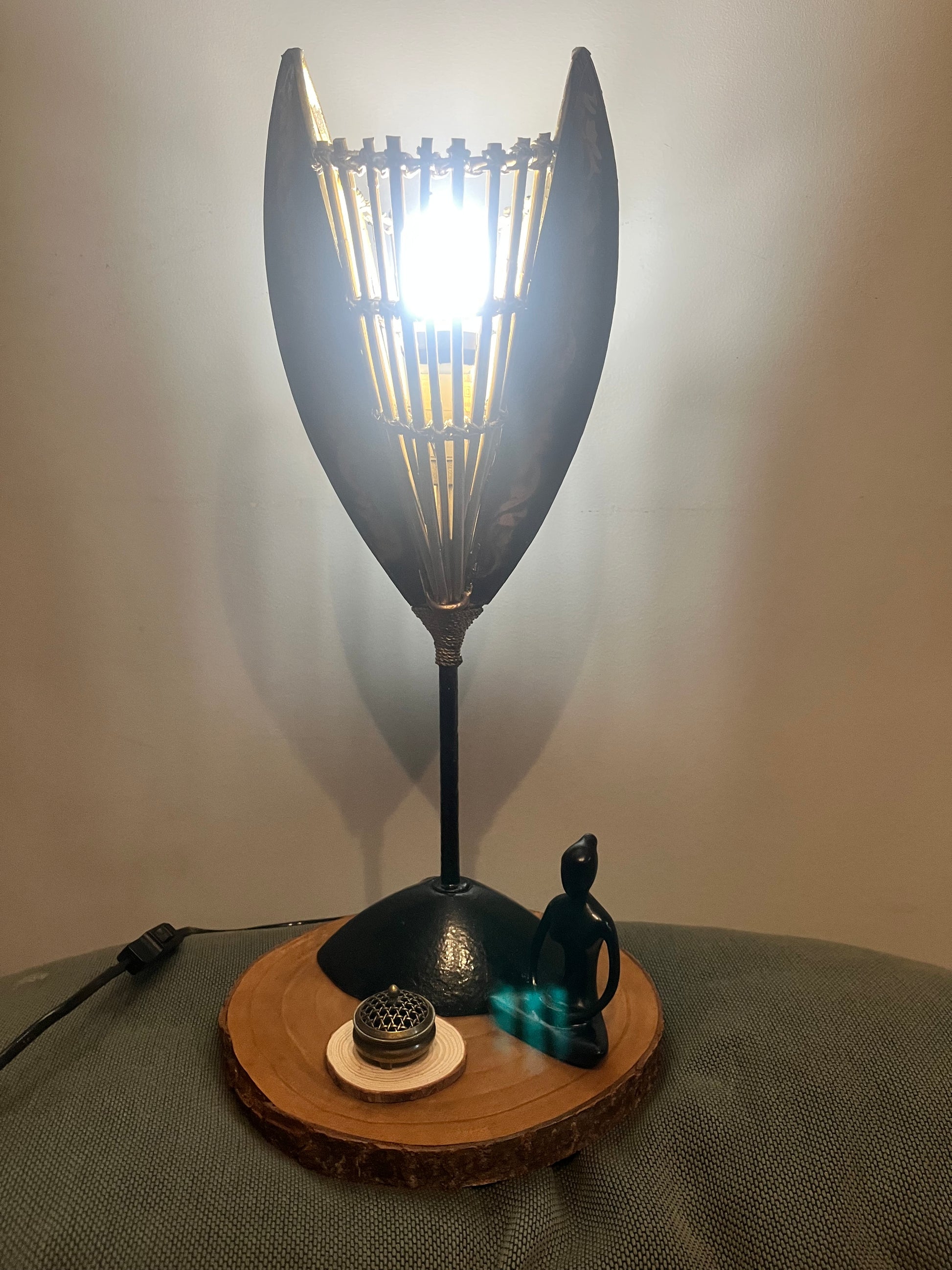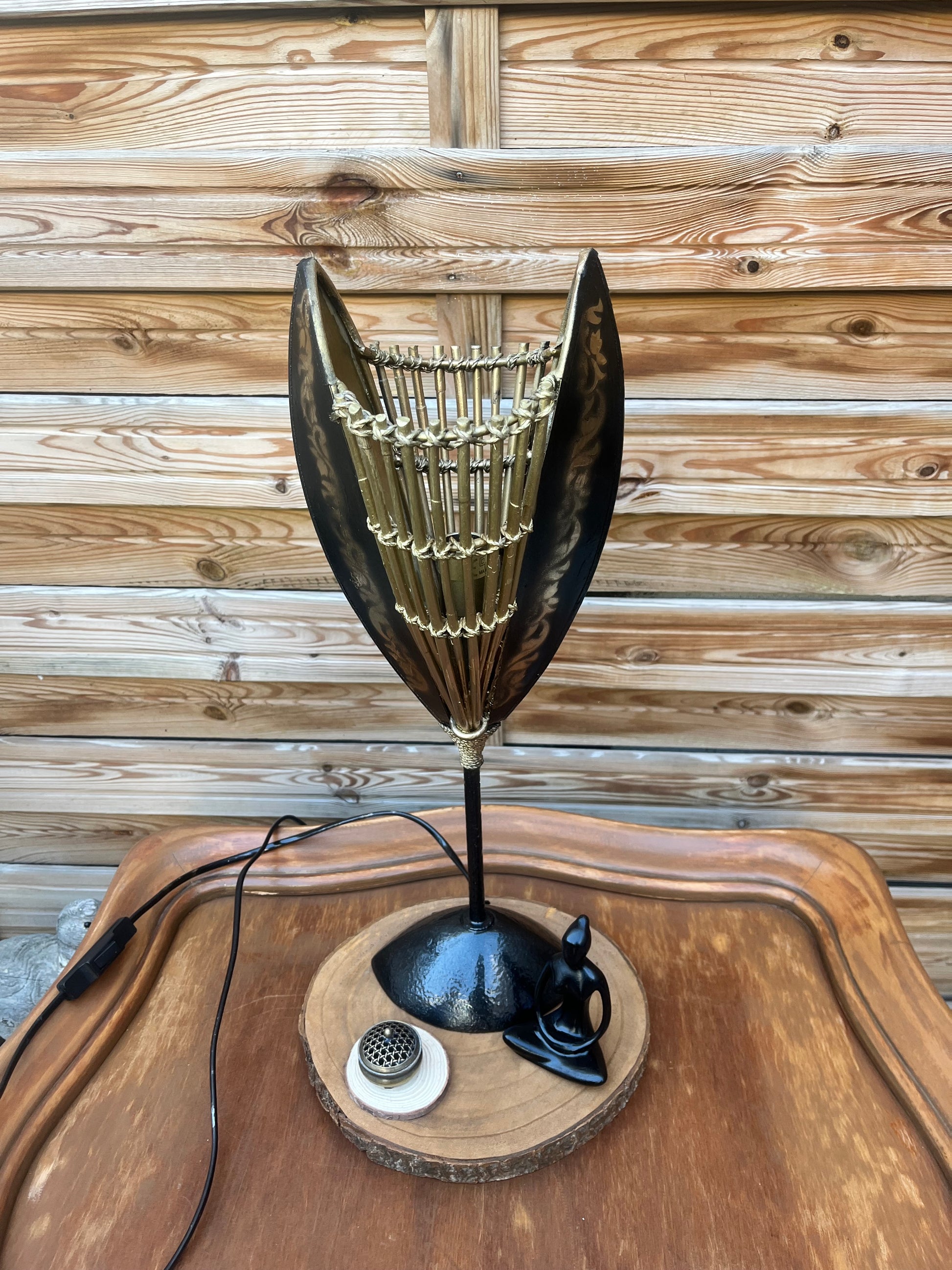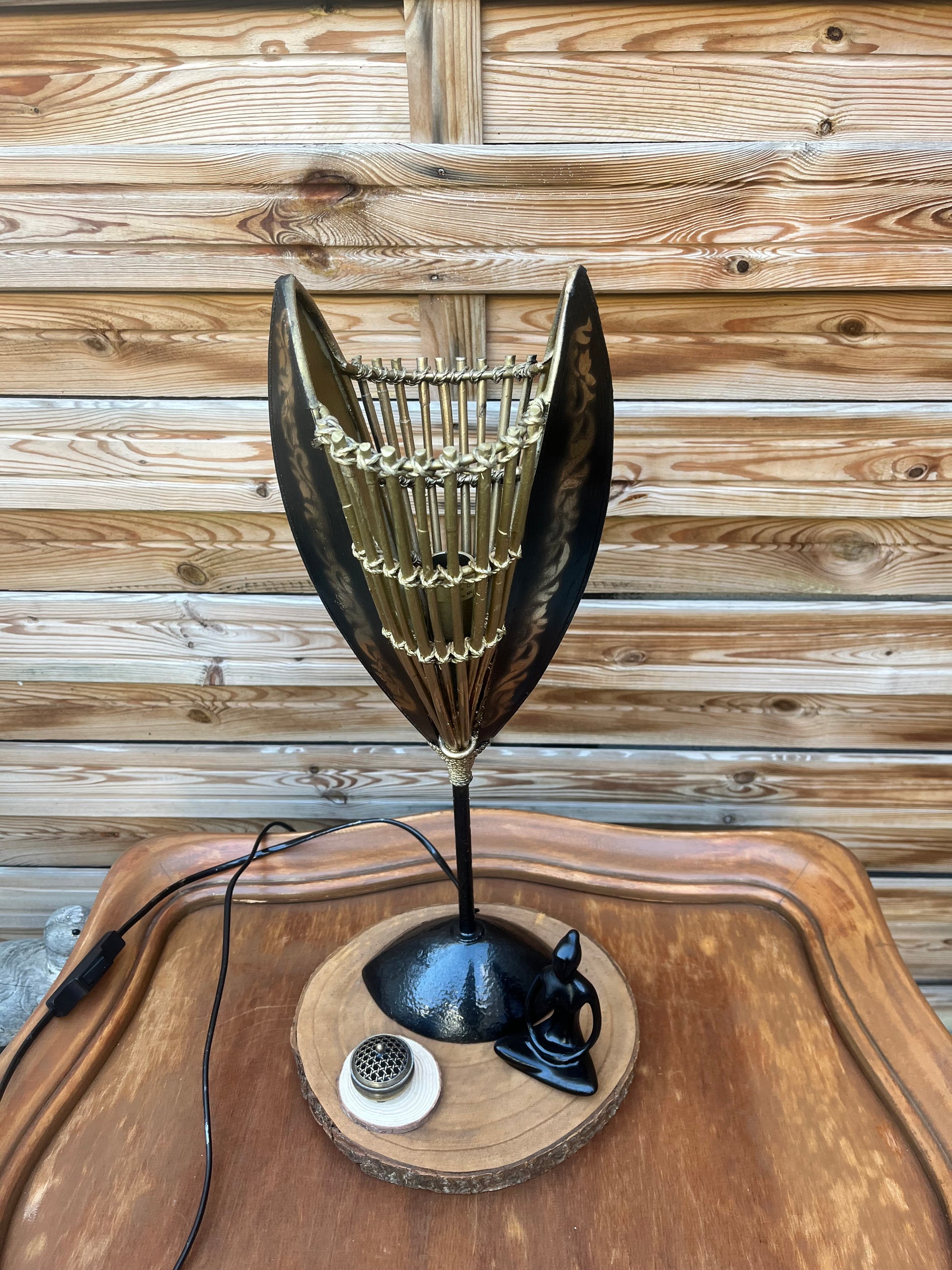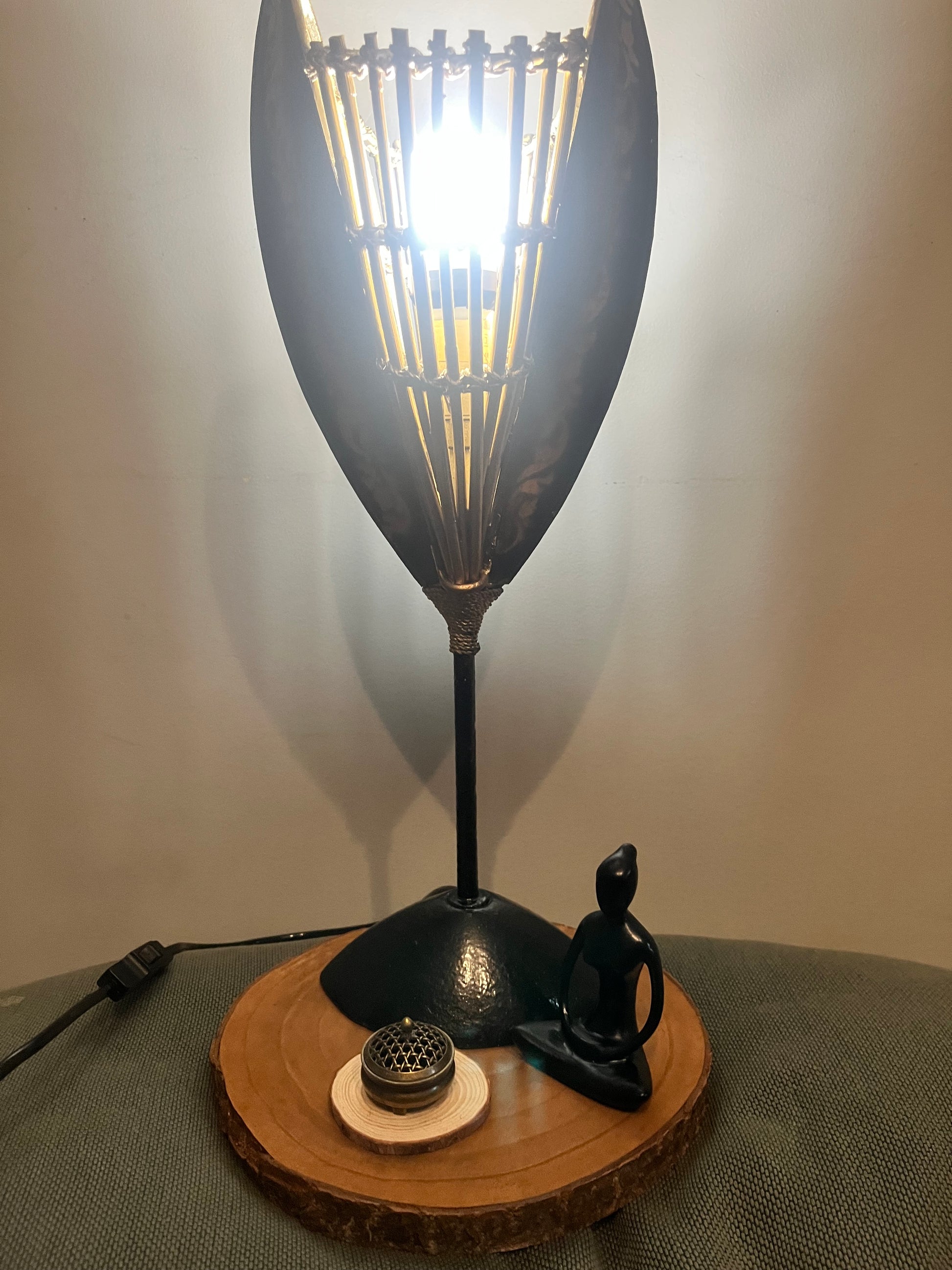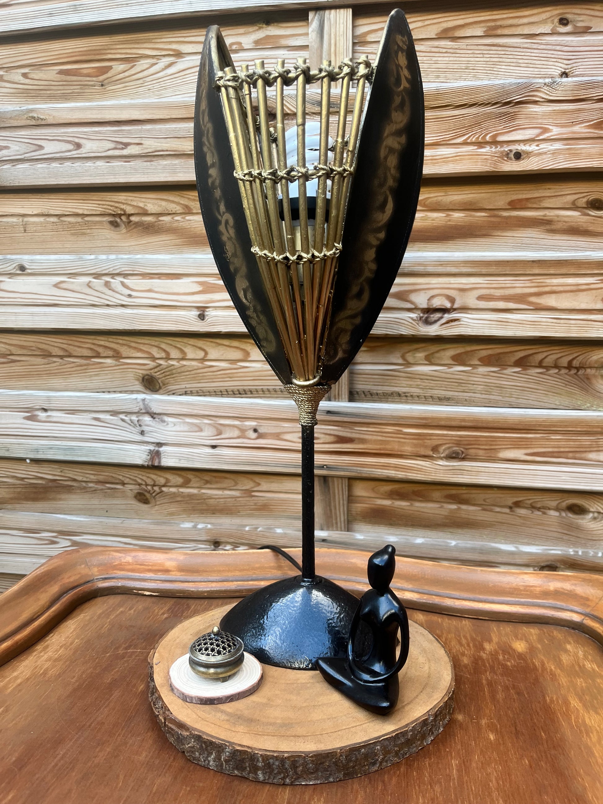 Belle lampe noire et or, avec statuette de femme zen et porte encens.