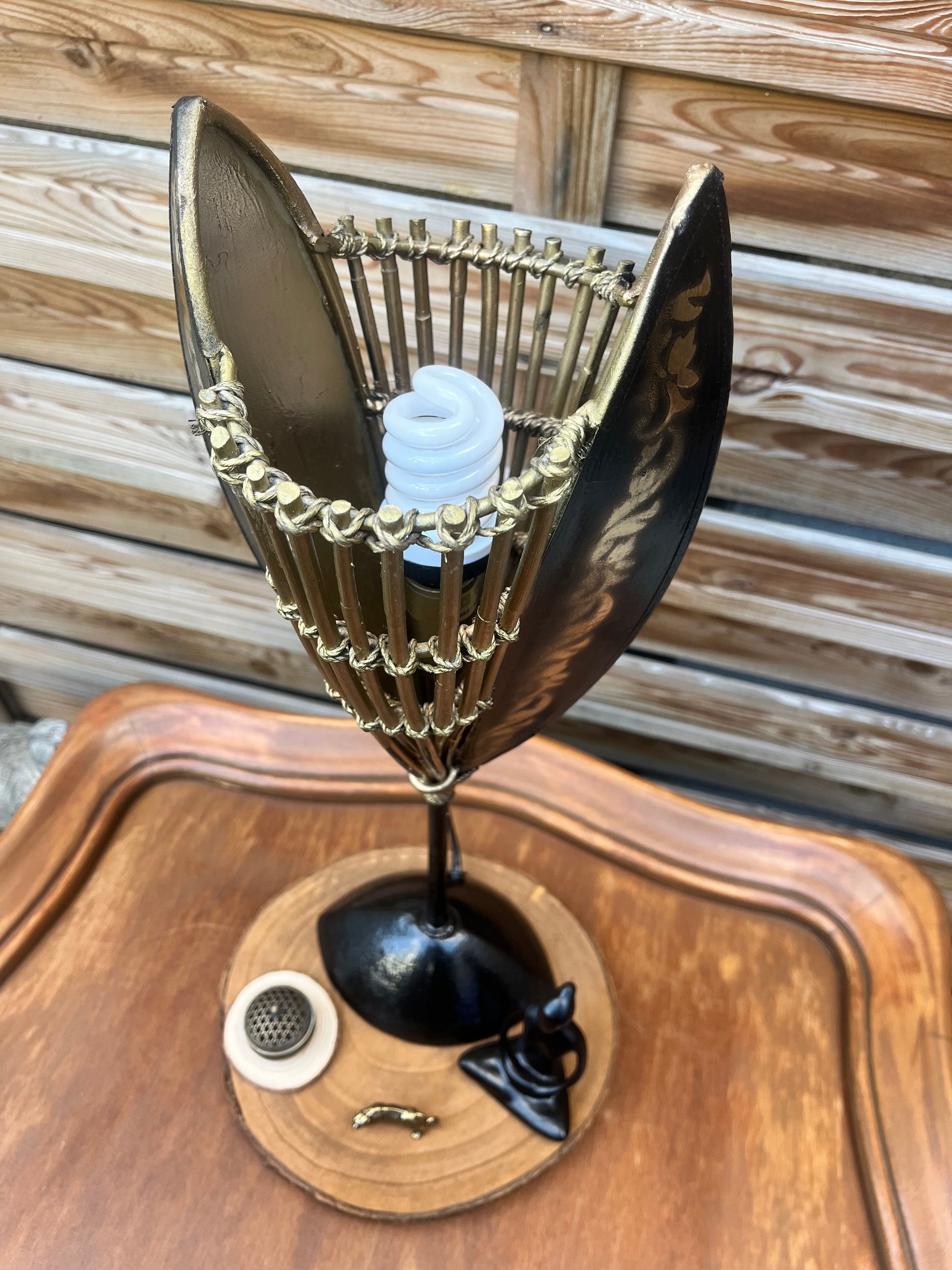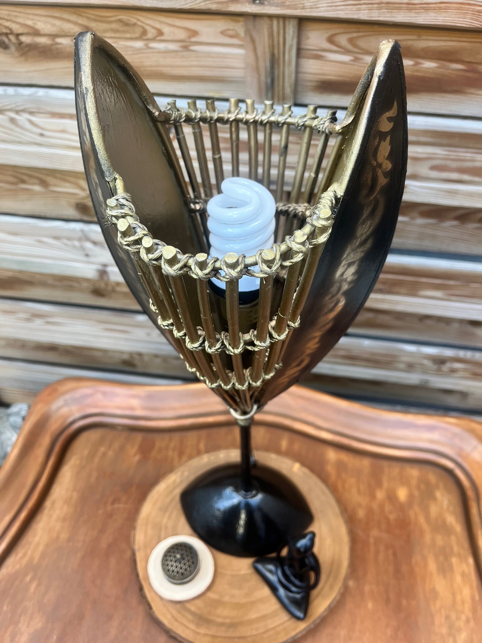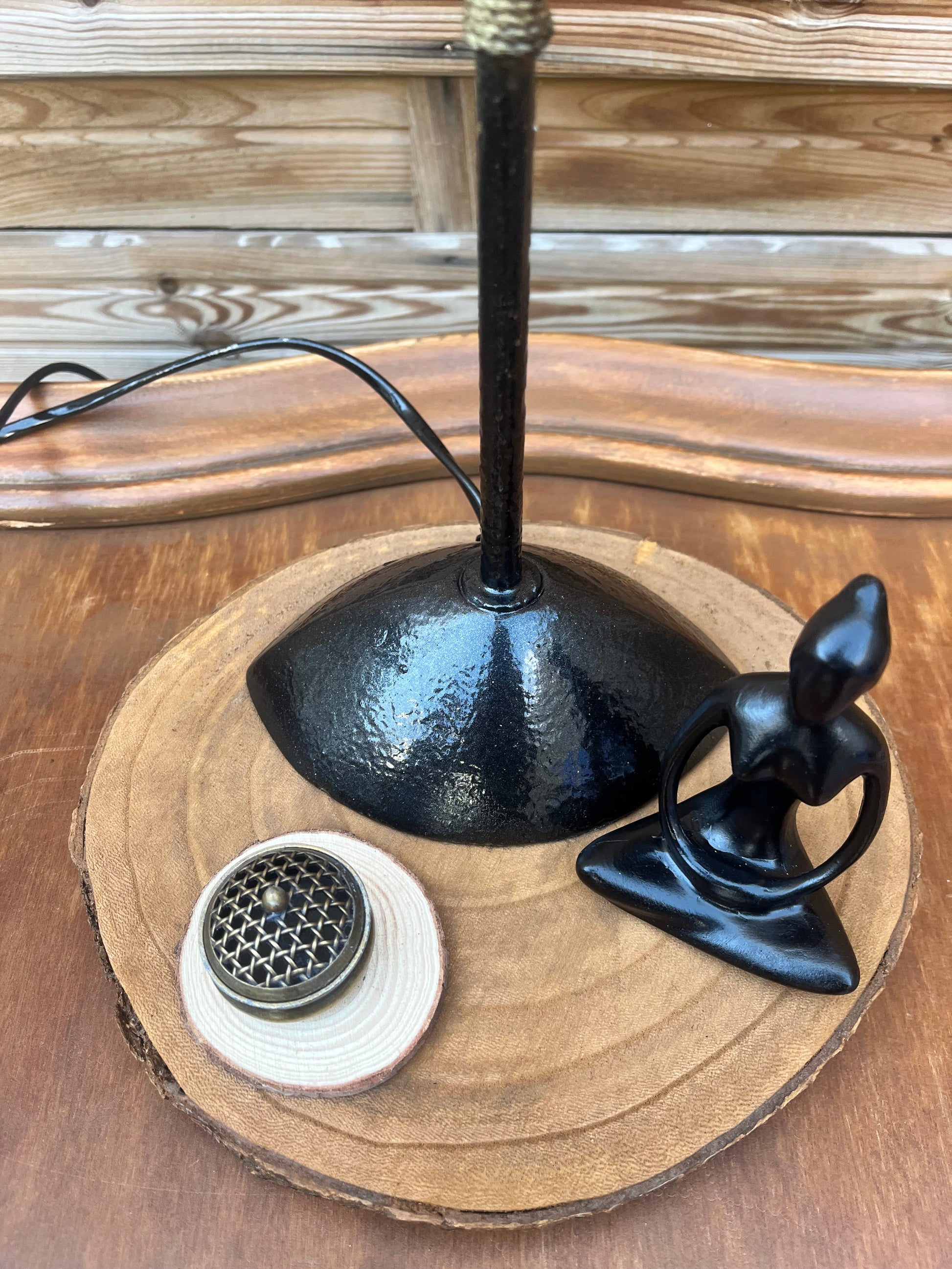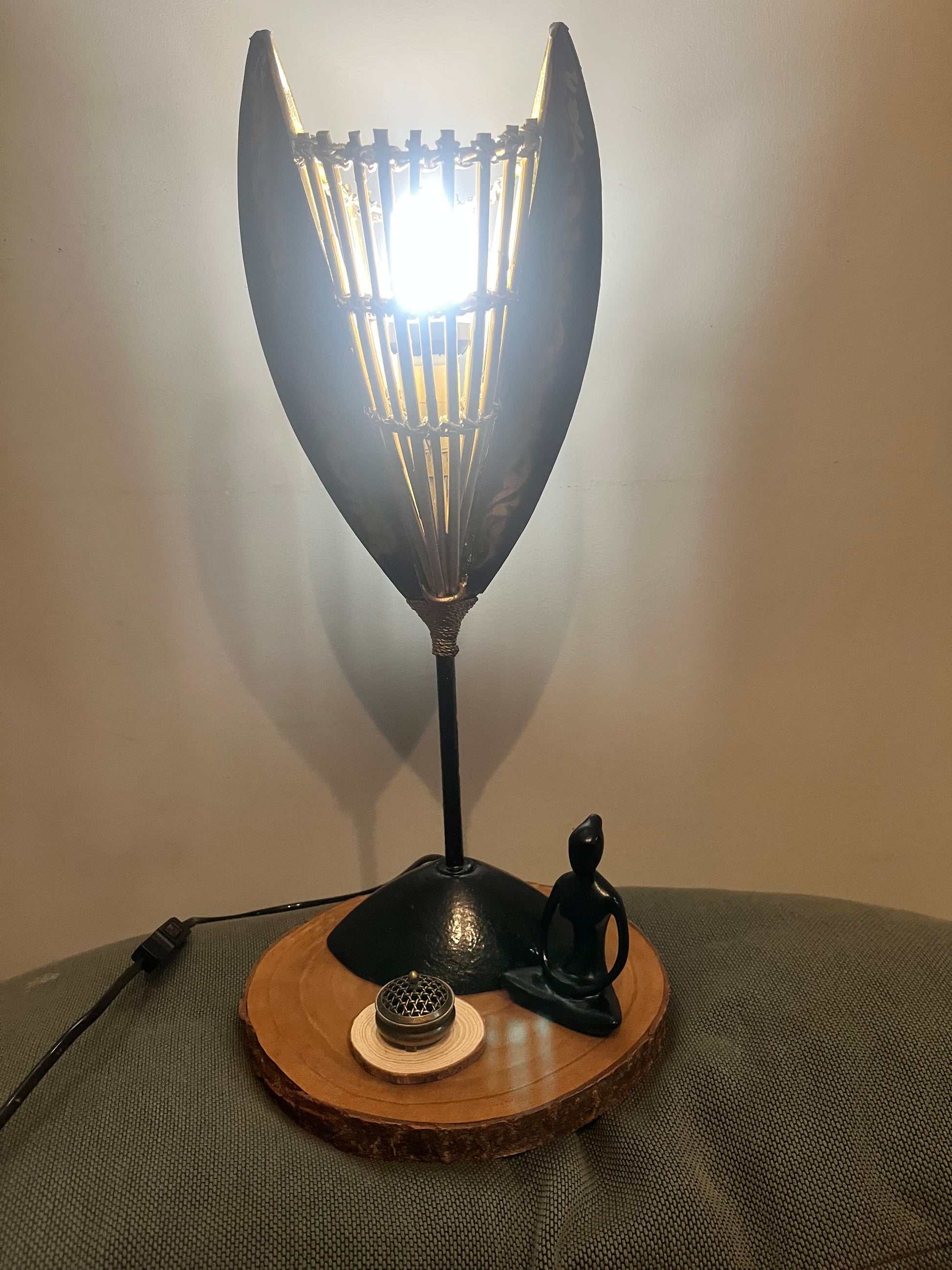 Belle lampe noire et or, avec statuette de femme zen et porte encens.