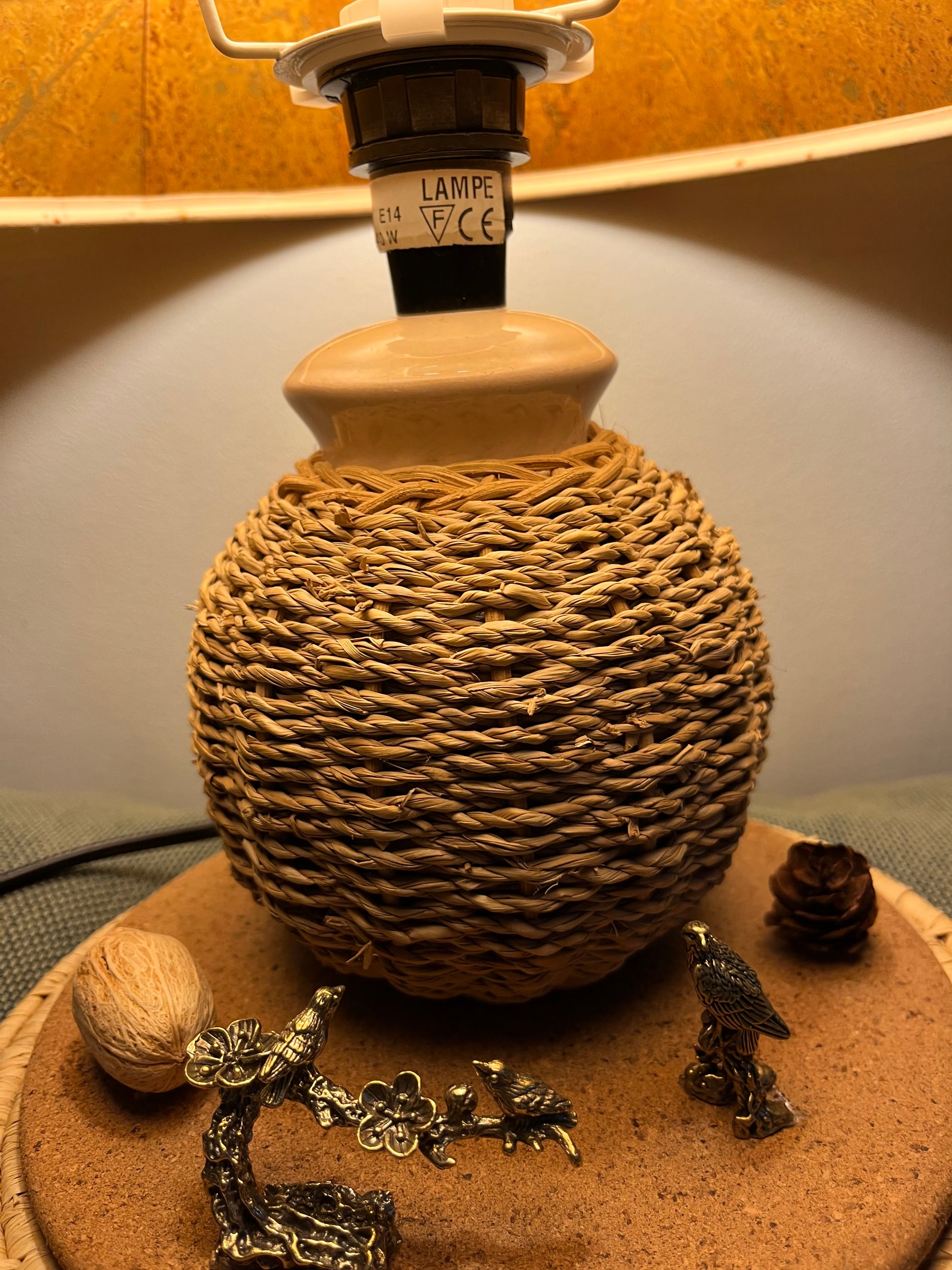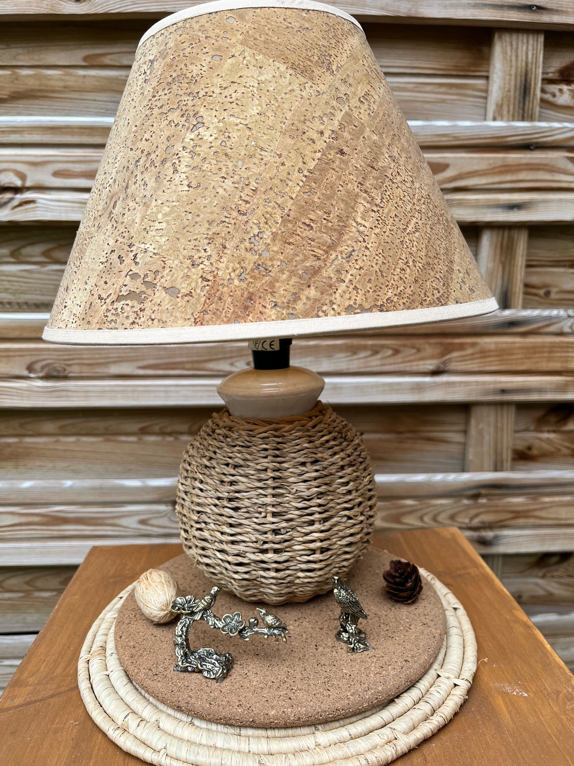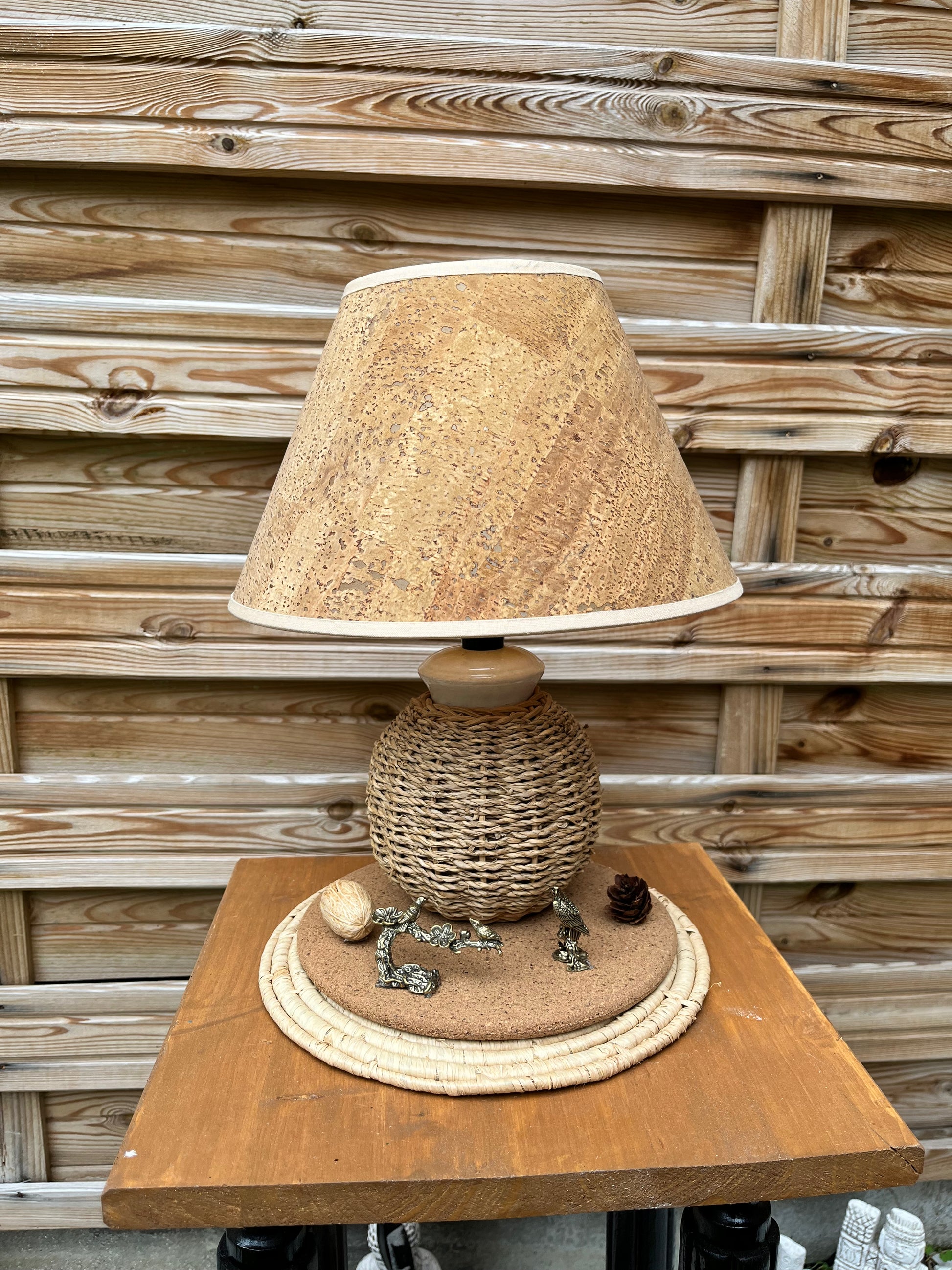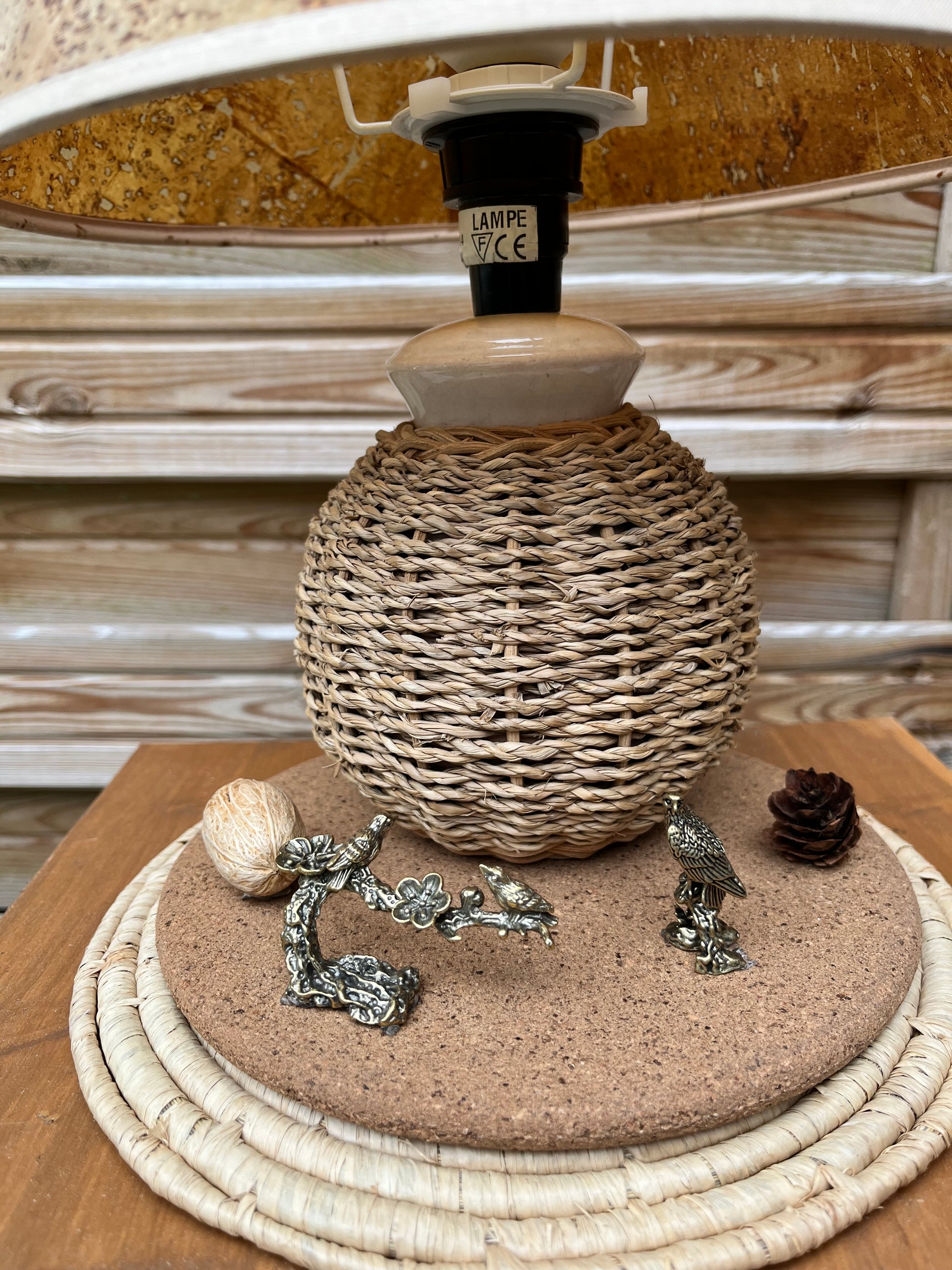 Très jolie lampe très nature, tout en corde et liège, avec de beaux décors d'oiseaux. Sur deux supports en corde et liège.