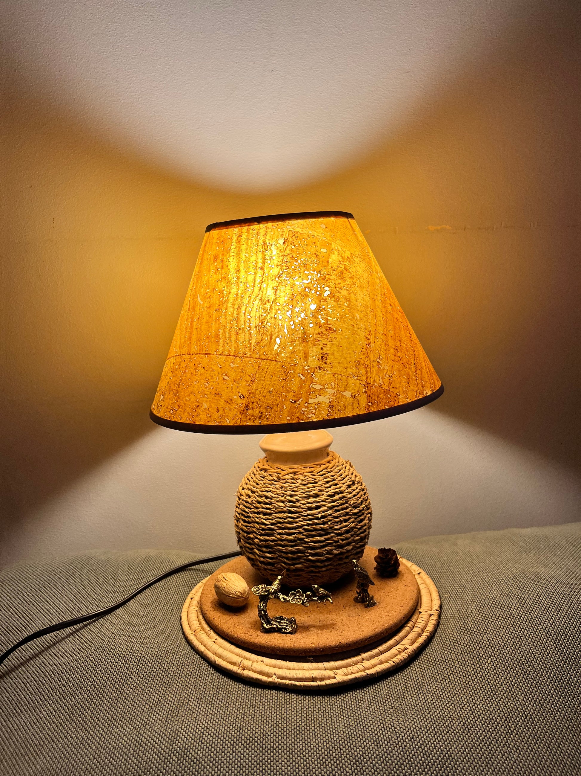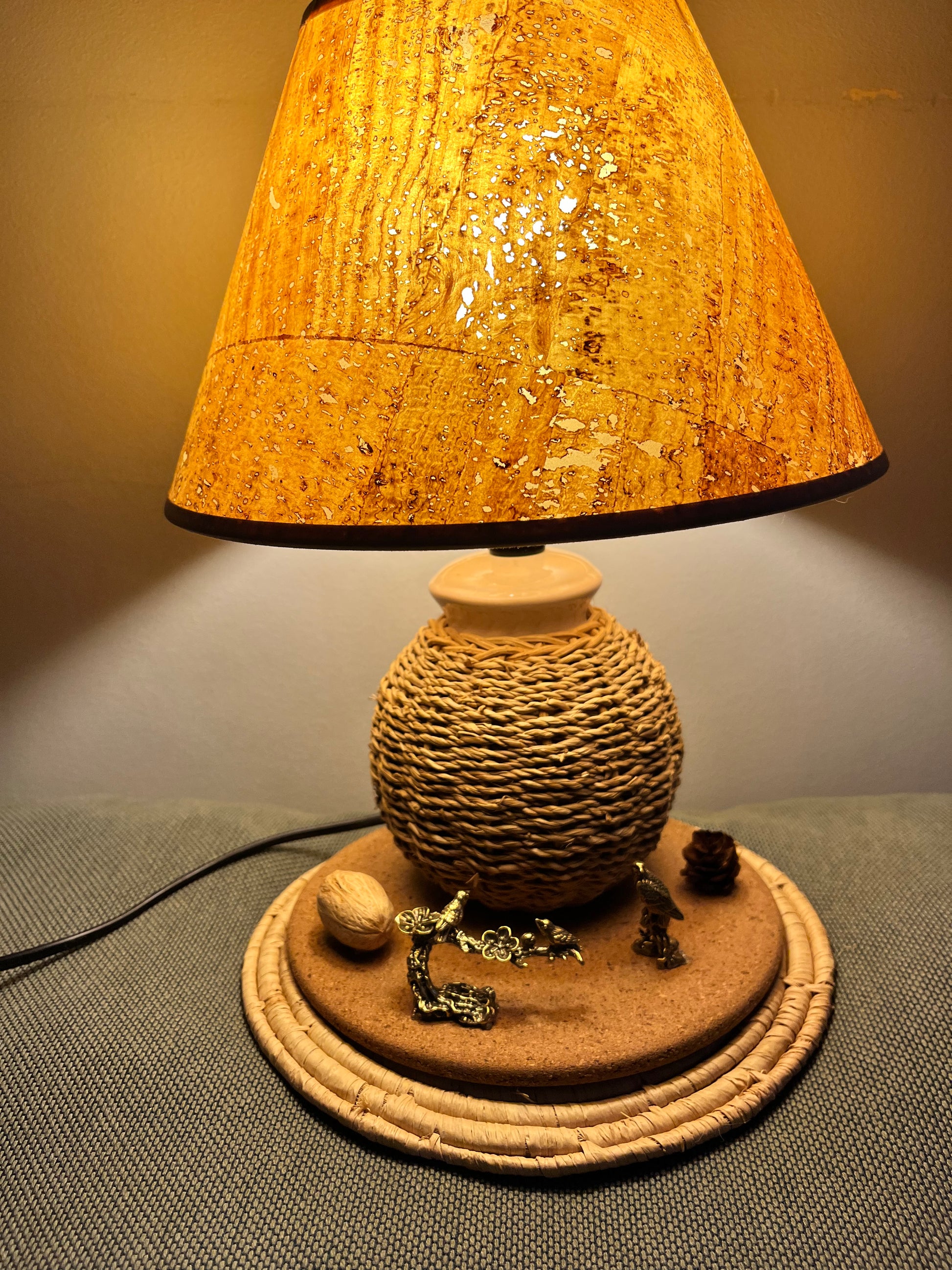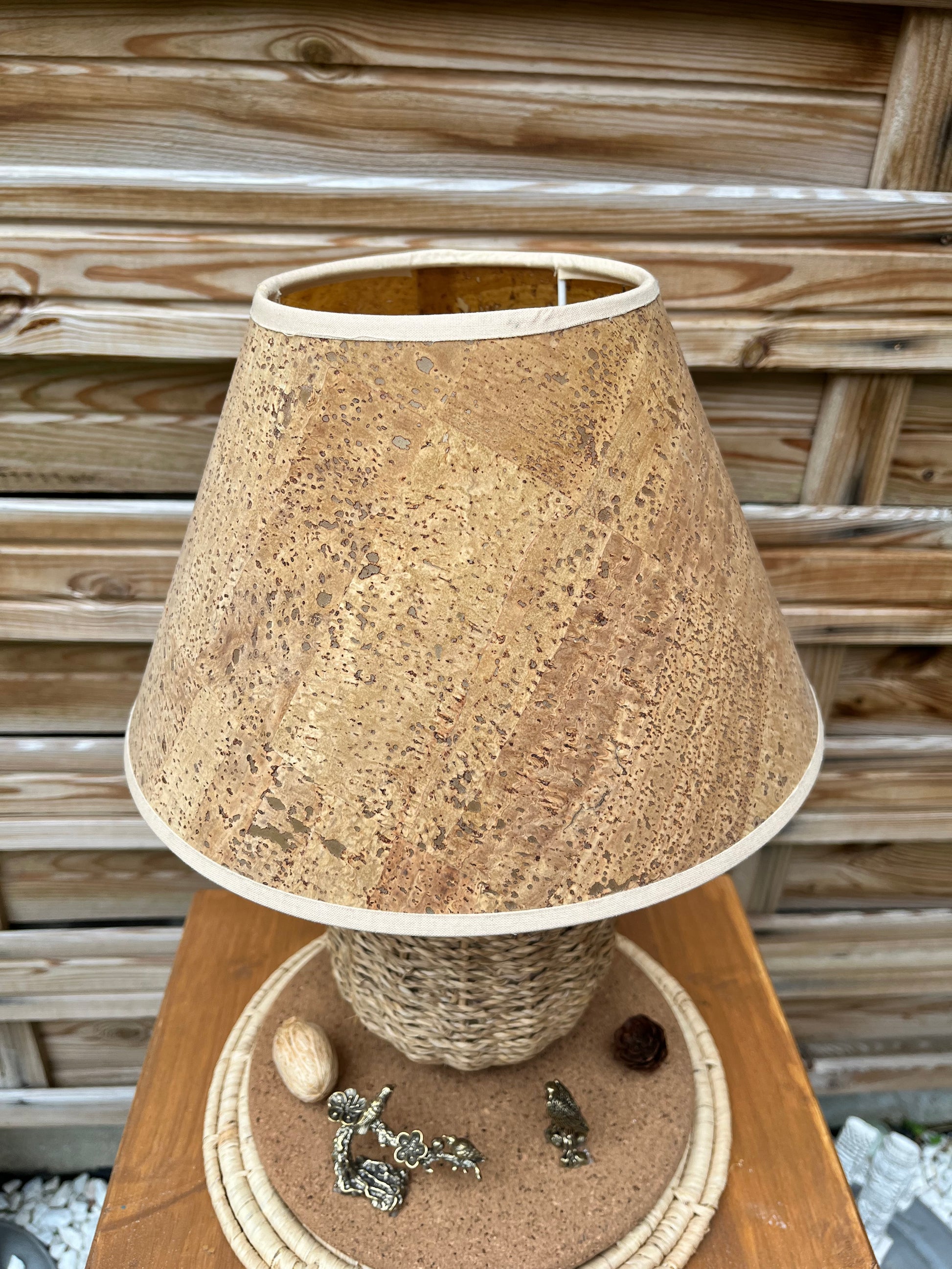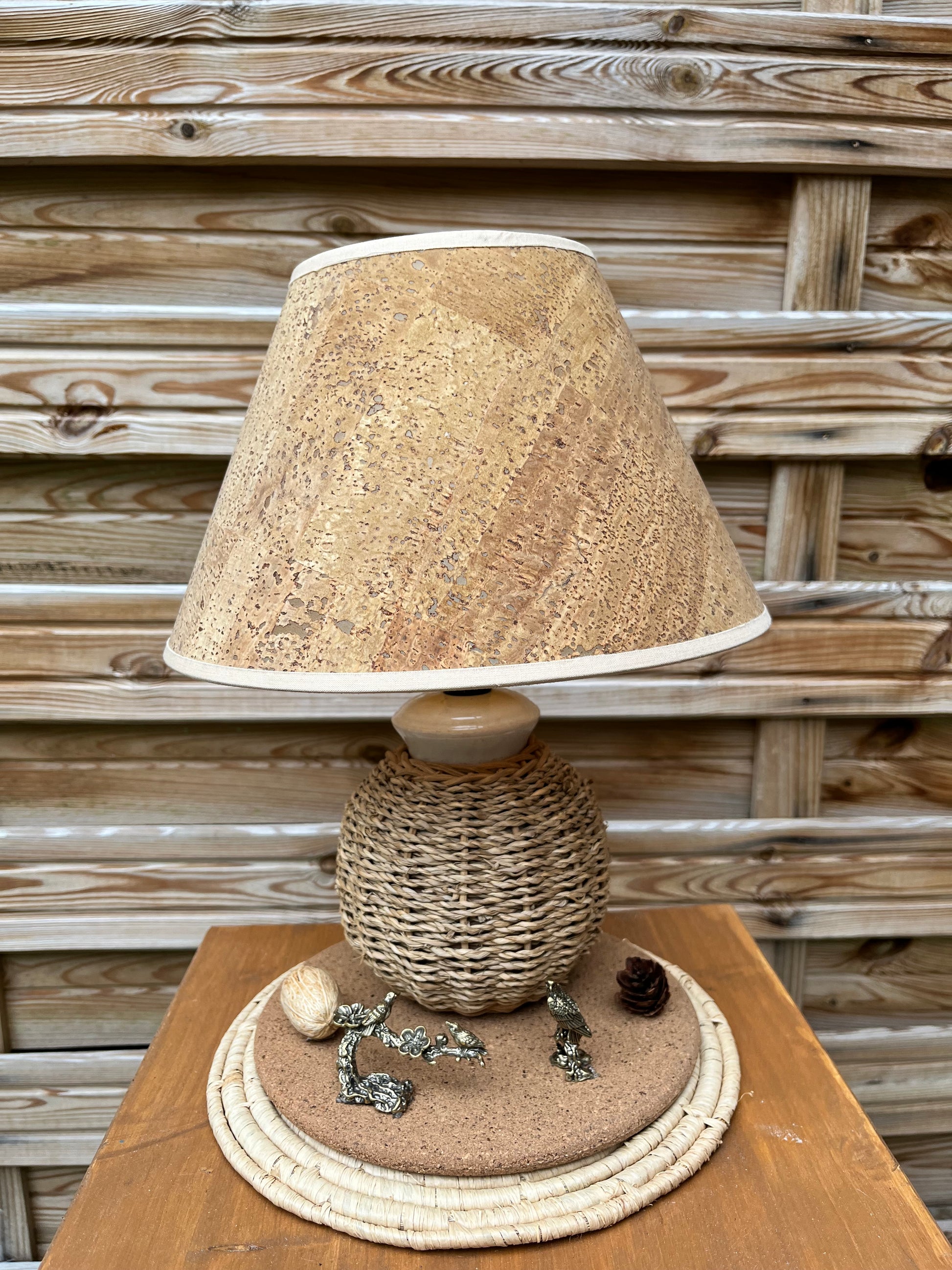 Très jolie lampe très nature, tout en corde et liège, avec de beaux décors d'oiseaux. Sur deux supports en corde et liège.
