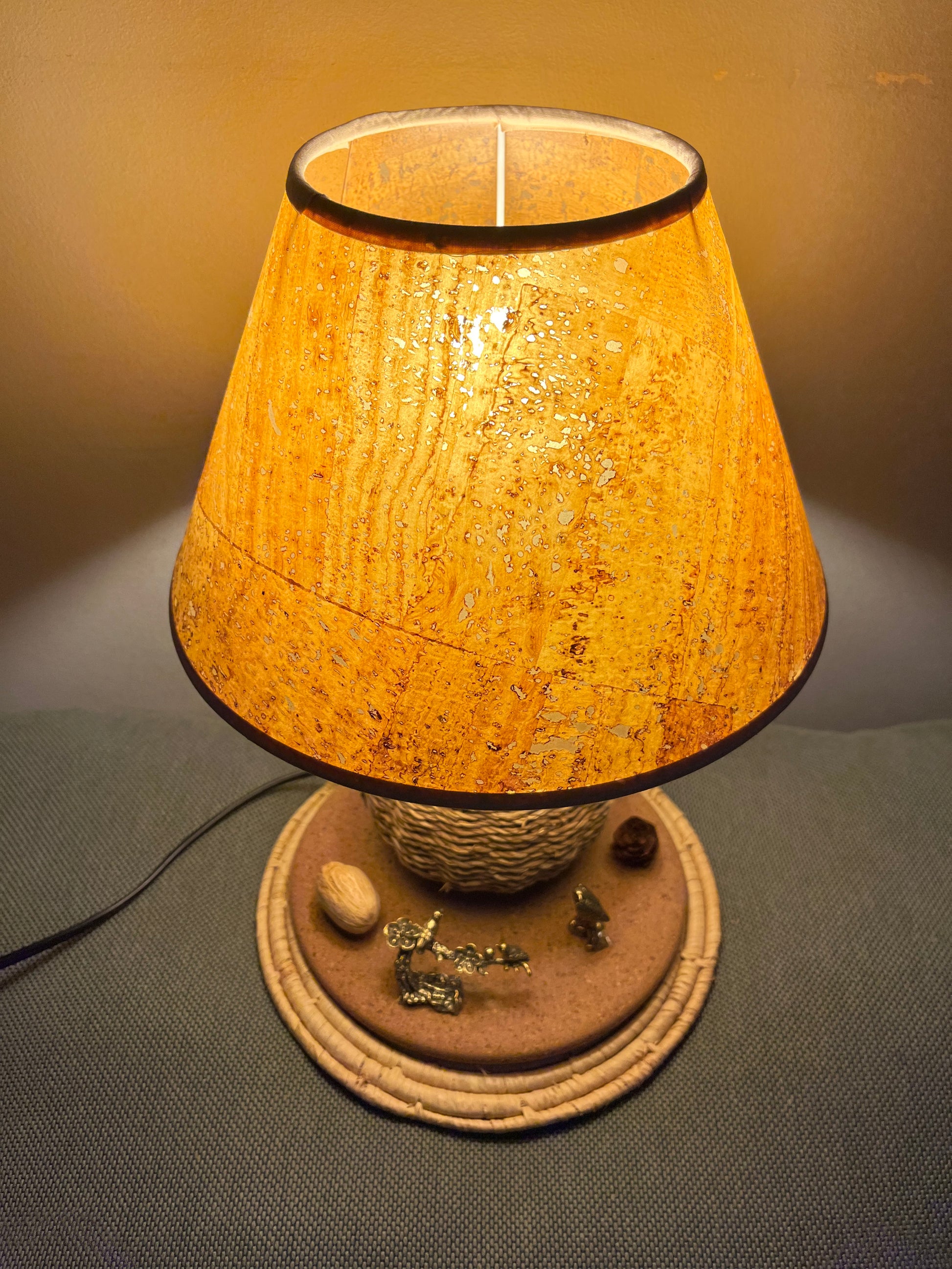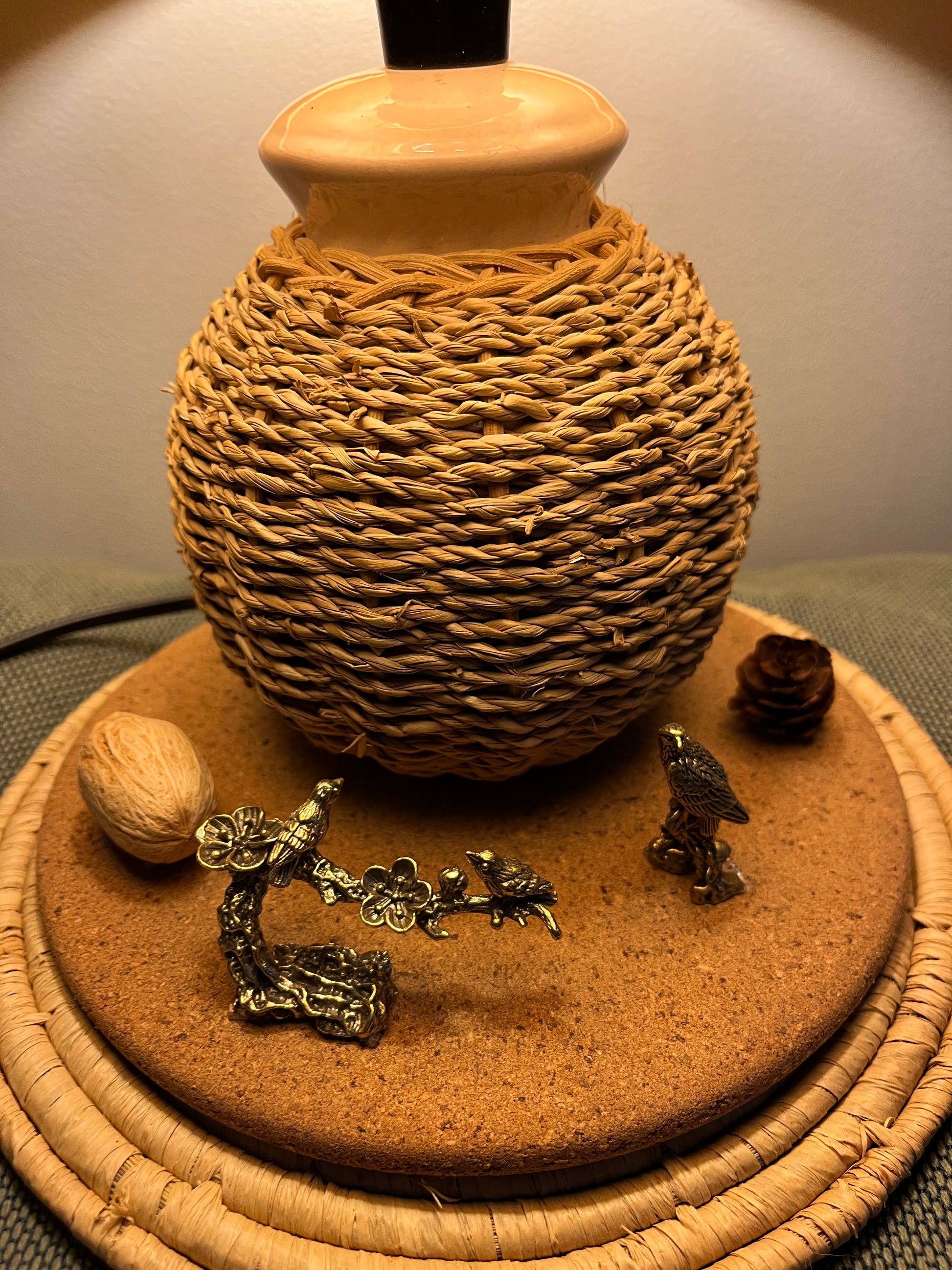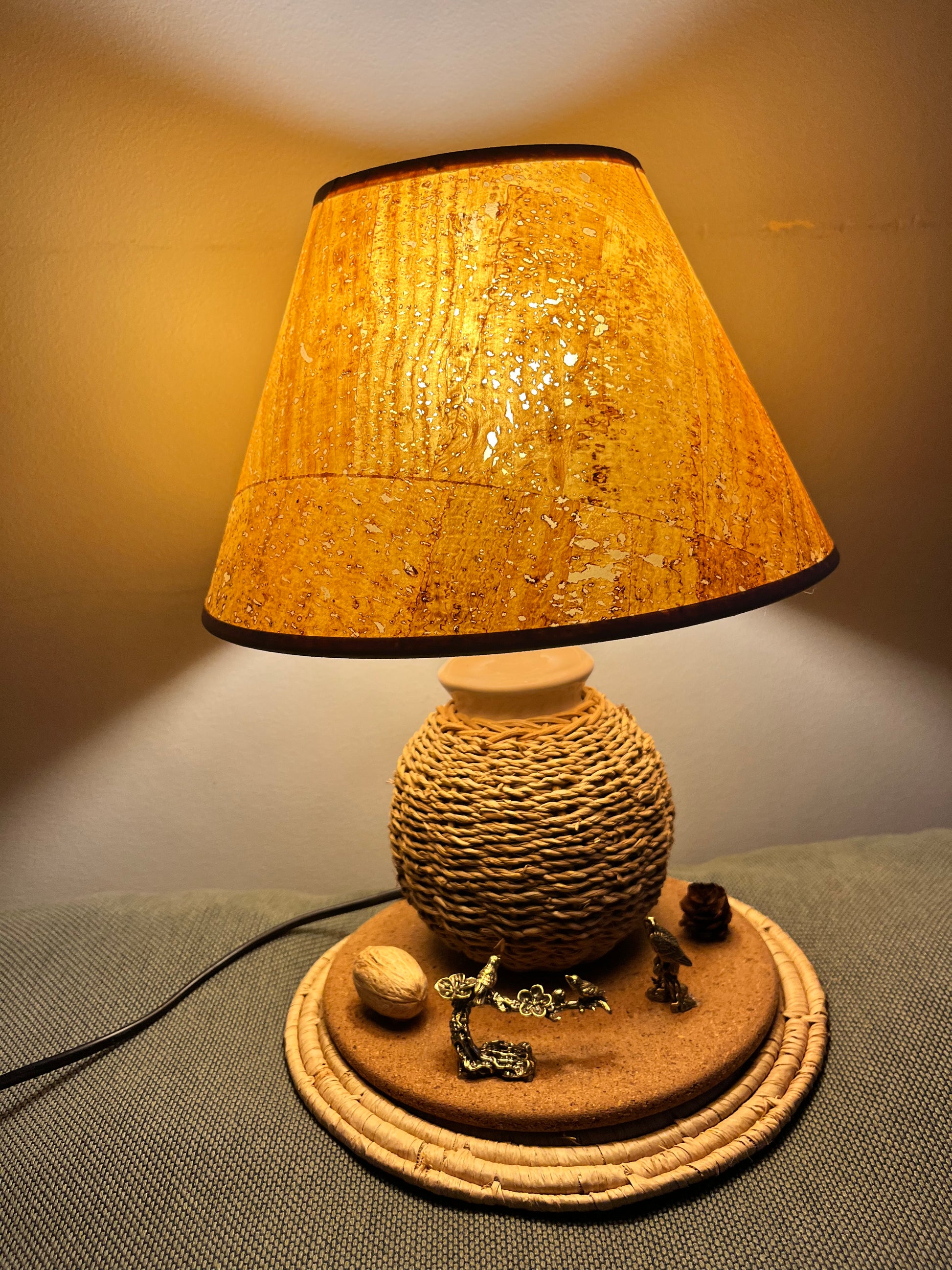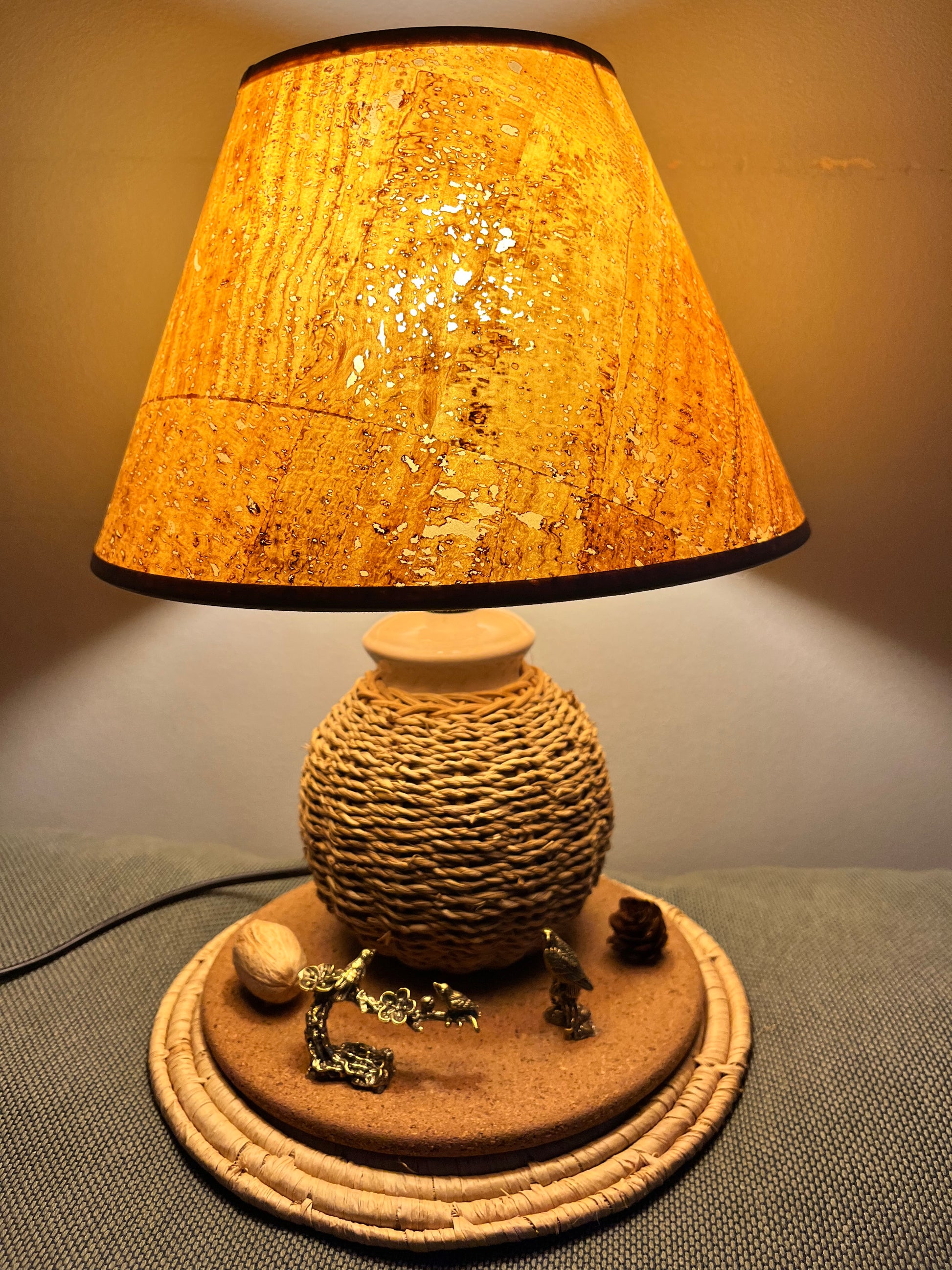 Très jolie lampe très nature, tout en corde et liège, avec de beaux décors d'oiseaux. Sur deux supports en corde et liège.