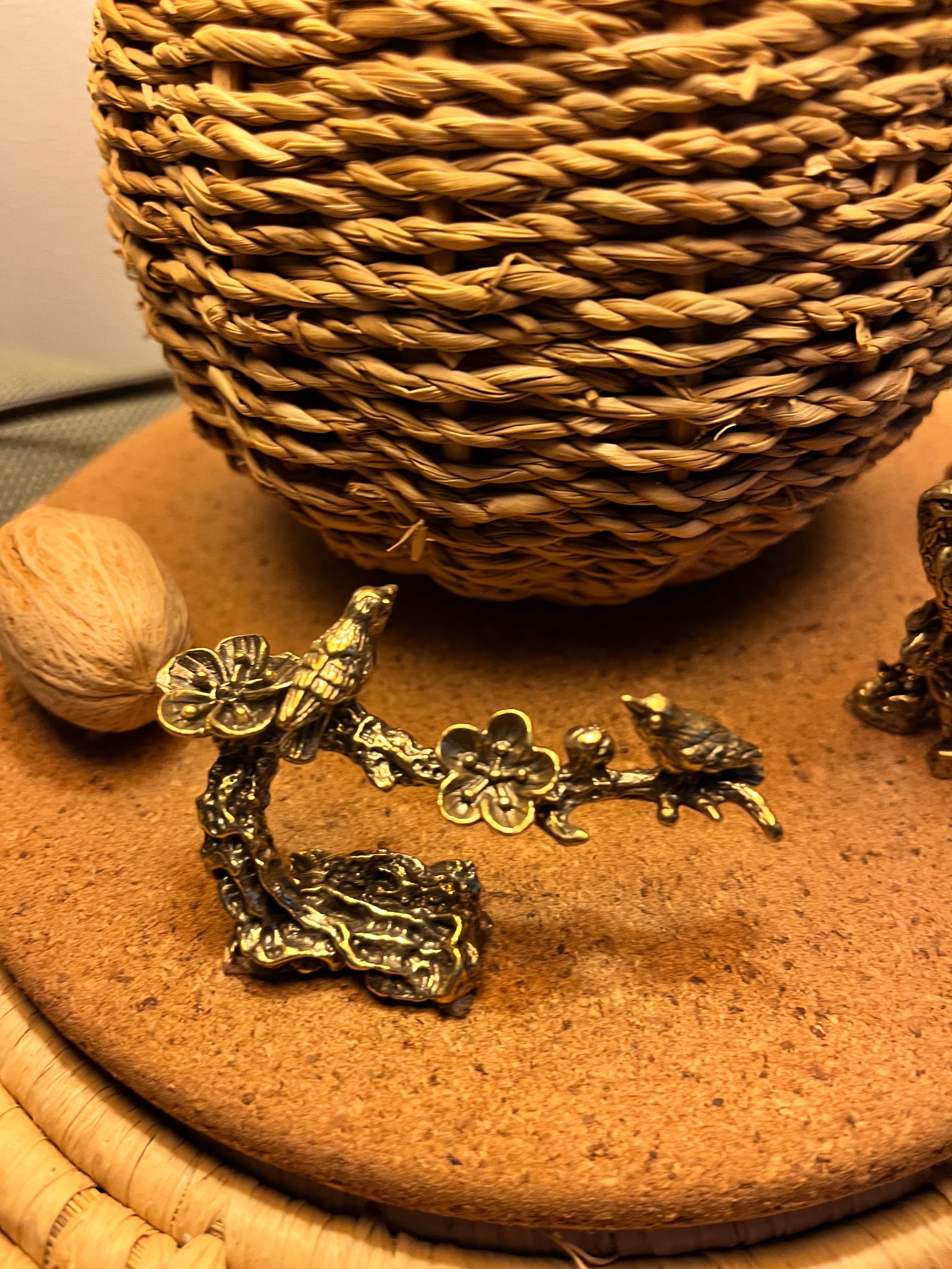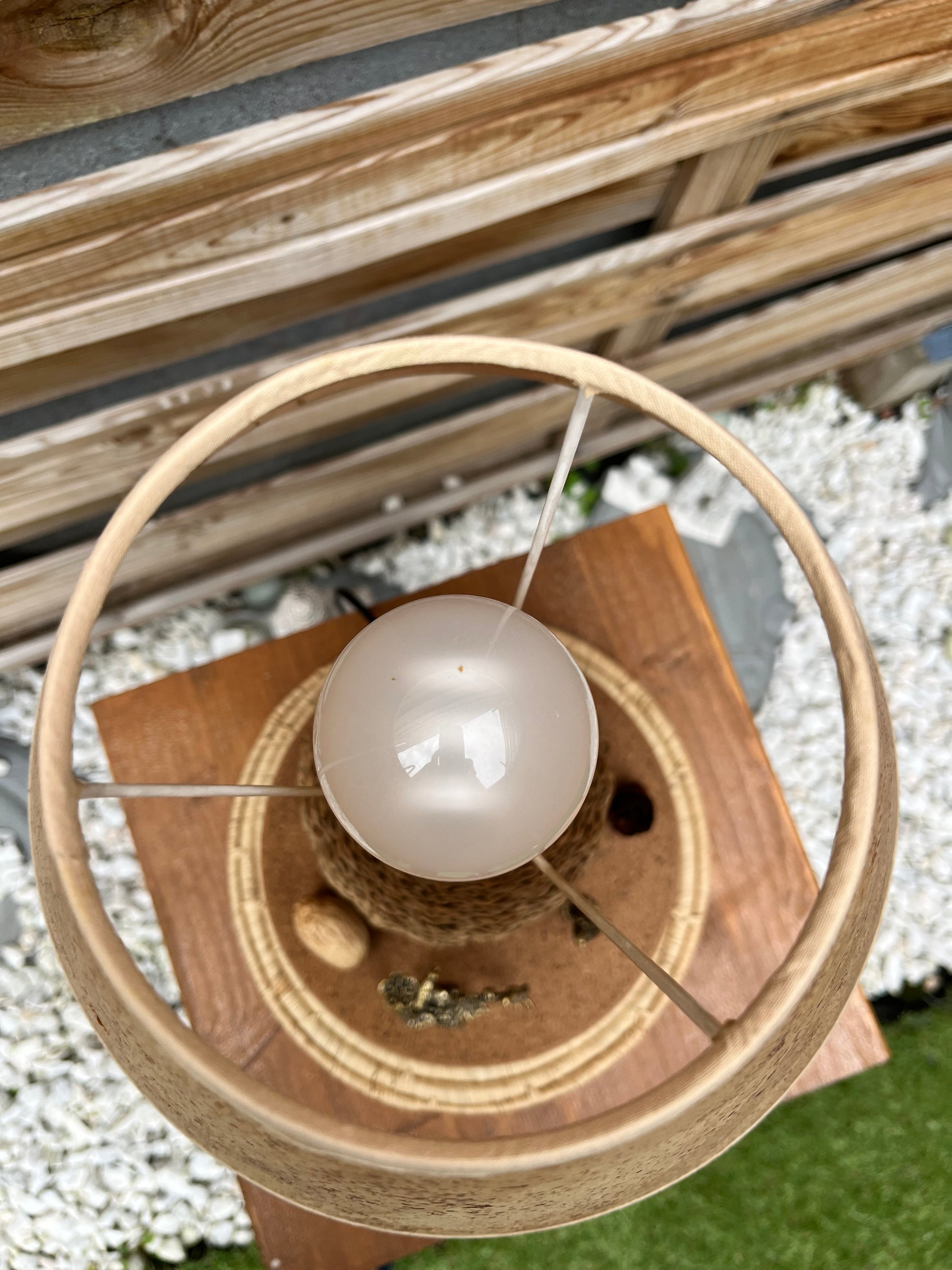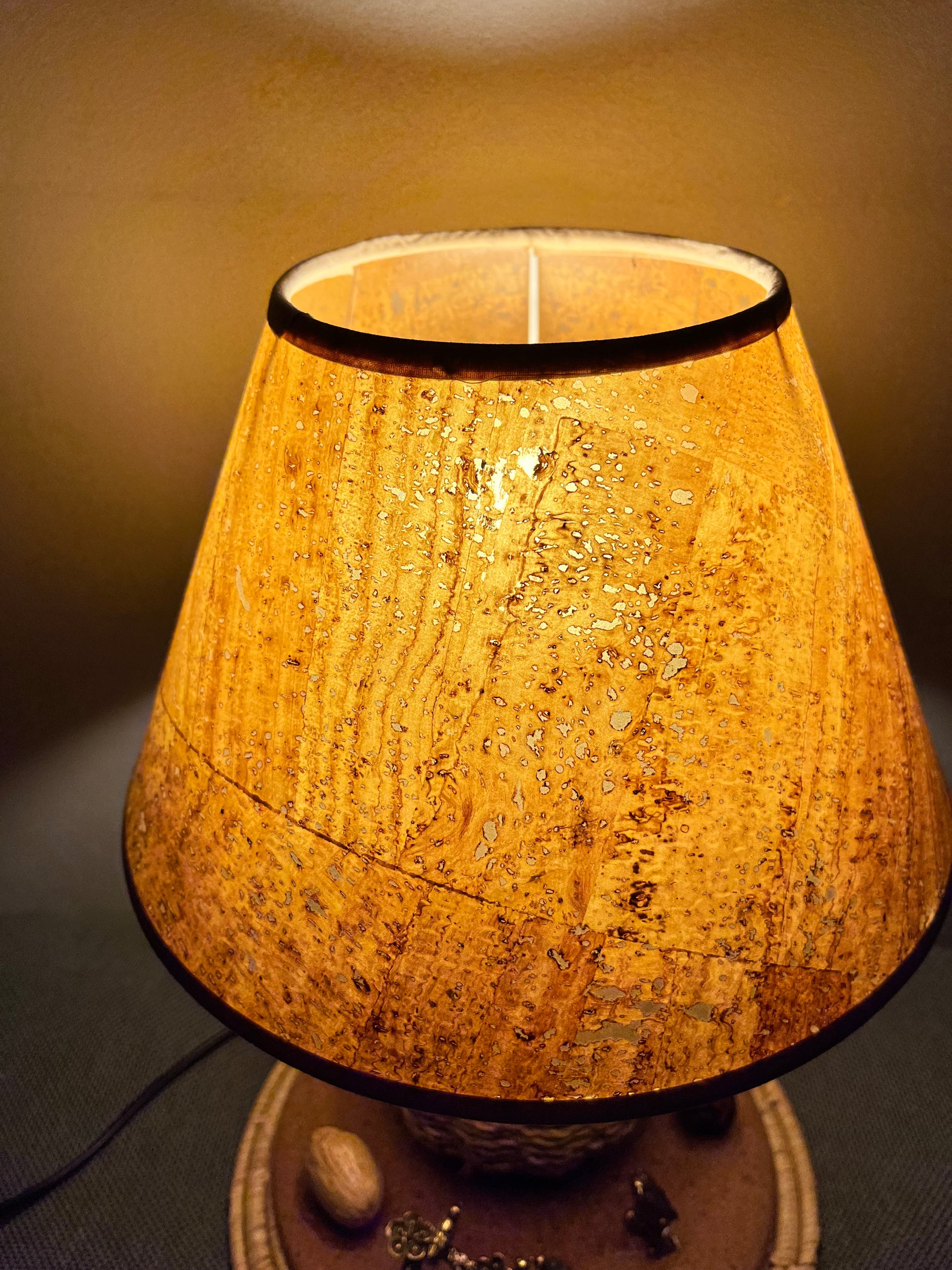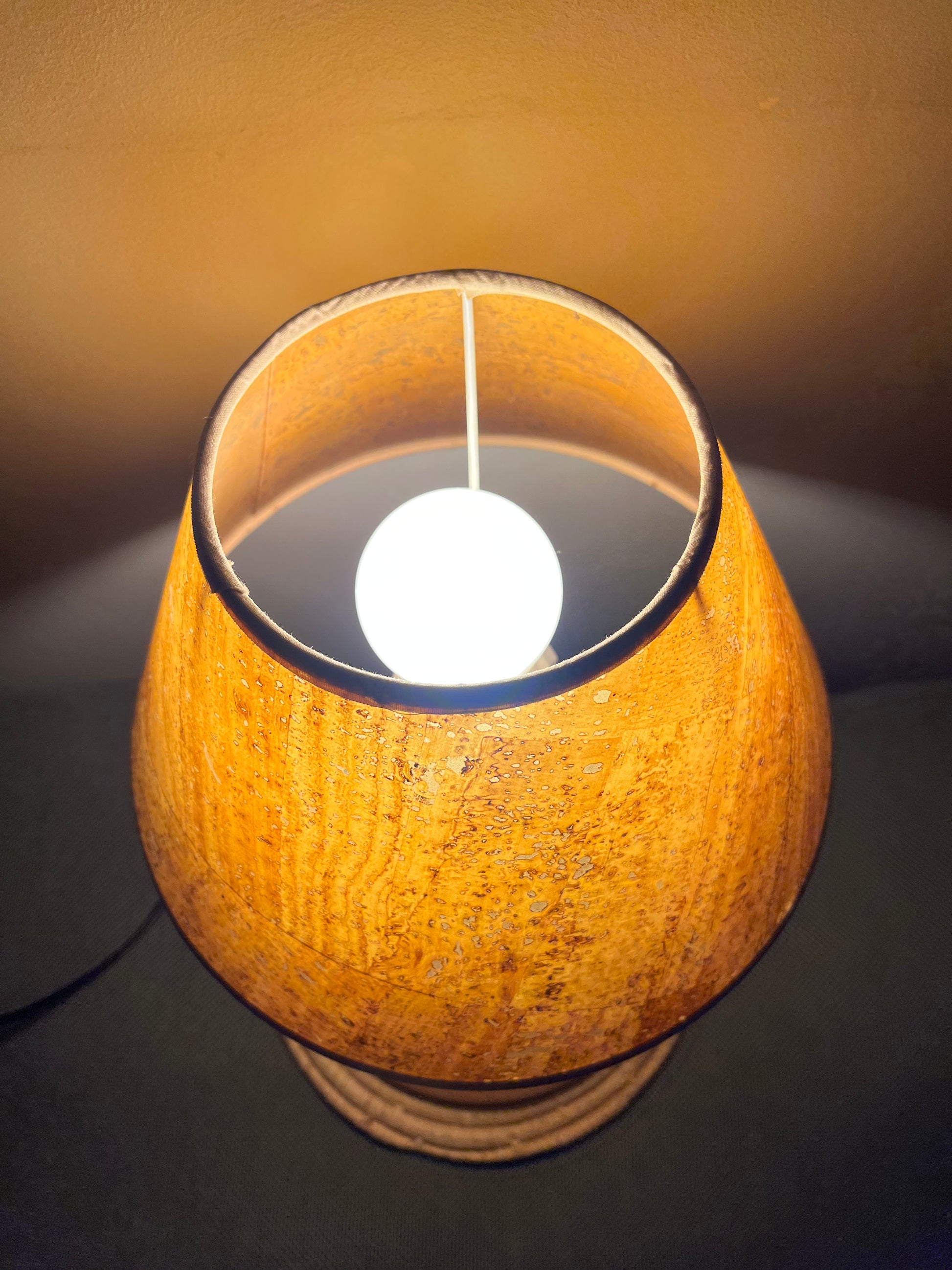 Très jolie lampe très nature, tout en corde et liège, avec de beaux décors d'oiseaux. Sur deux supports en corde et liège.