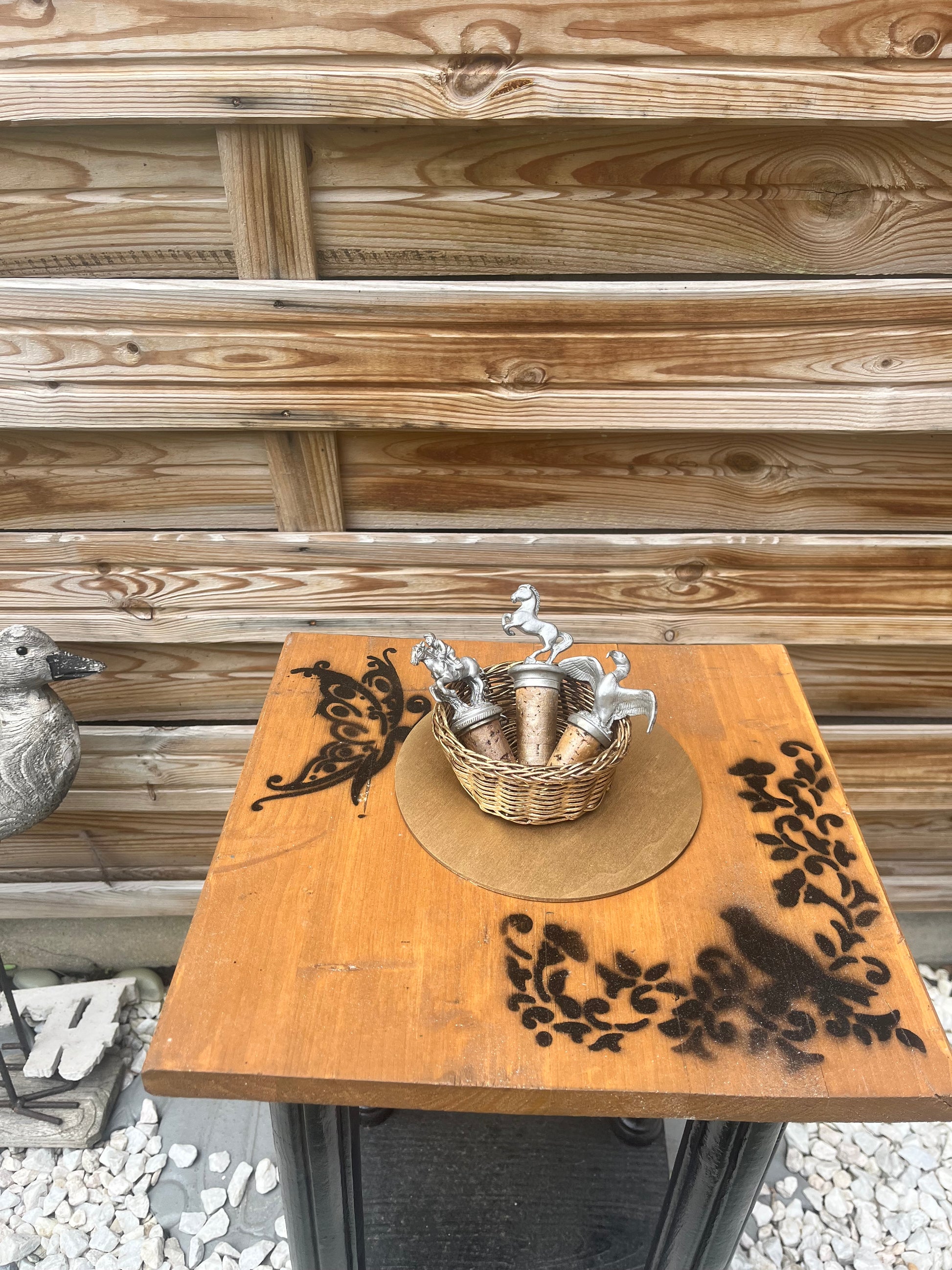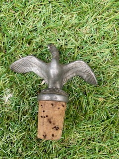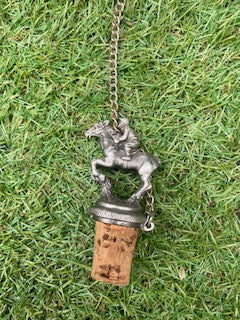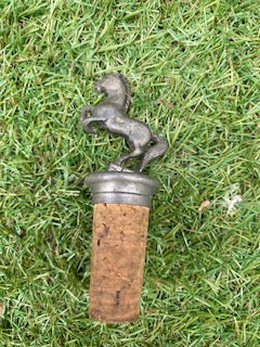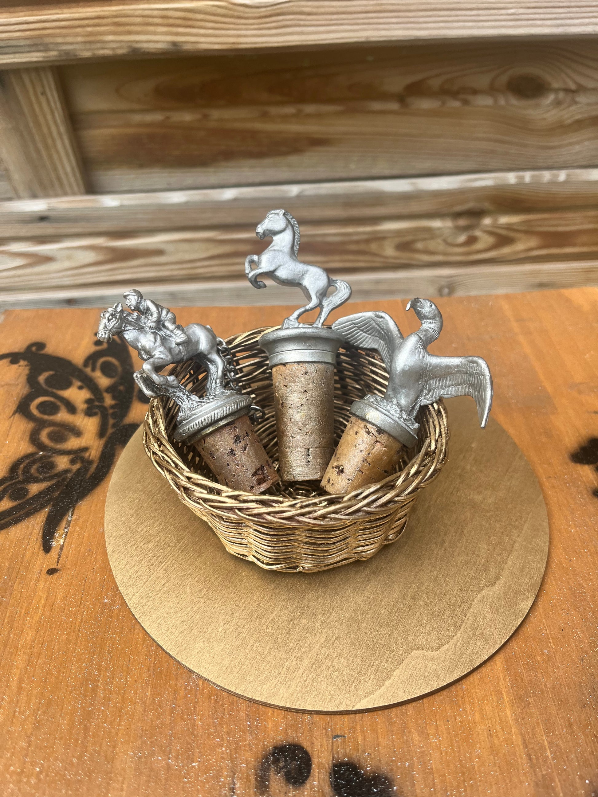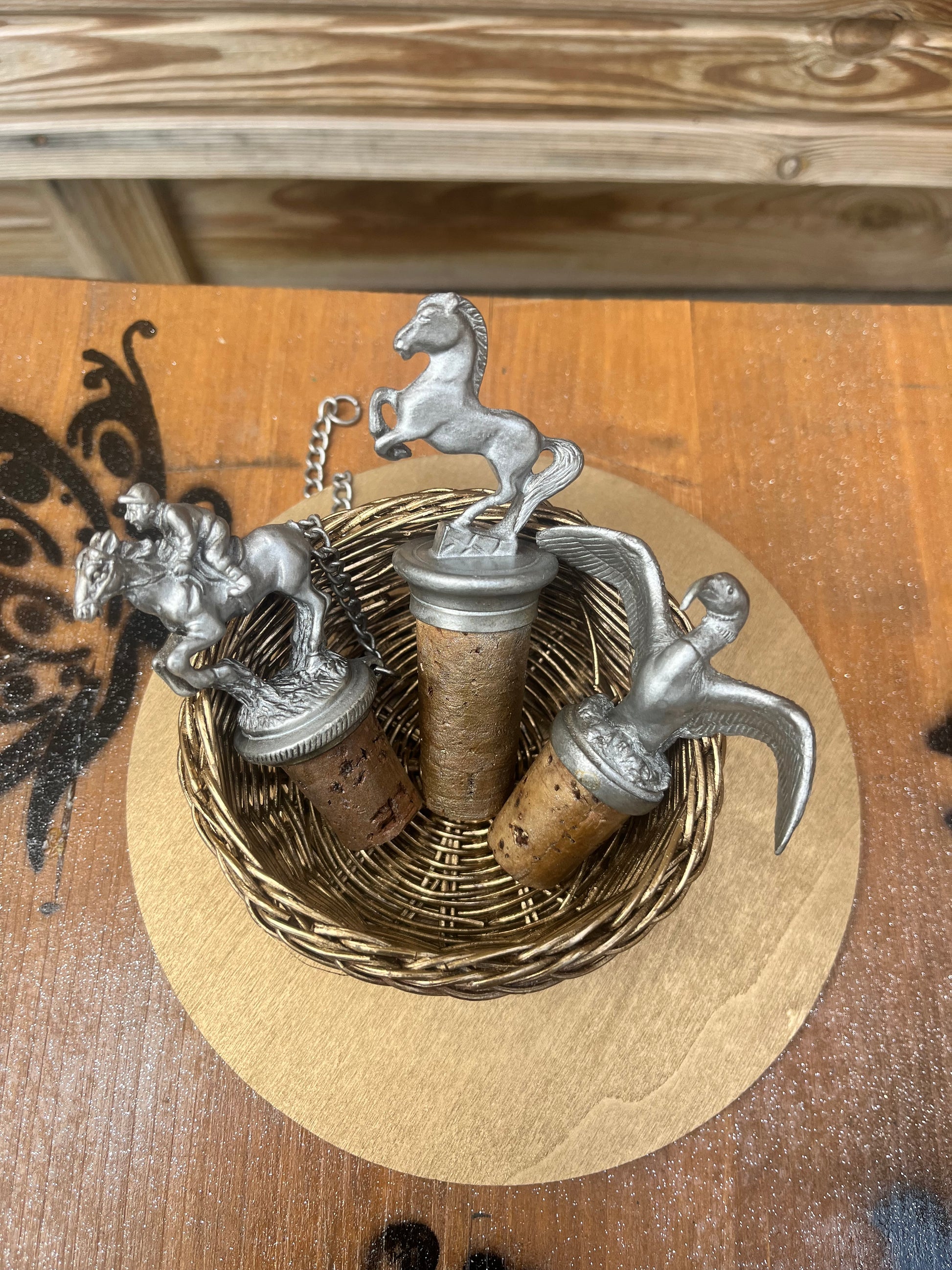 3 magnifiques bouchons de liège décorés d'étain ou de laiton, avec 1 aigle, 1 jockey sur un cheval et un cheval debout.