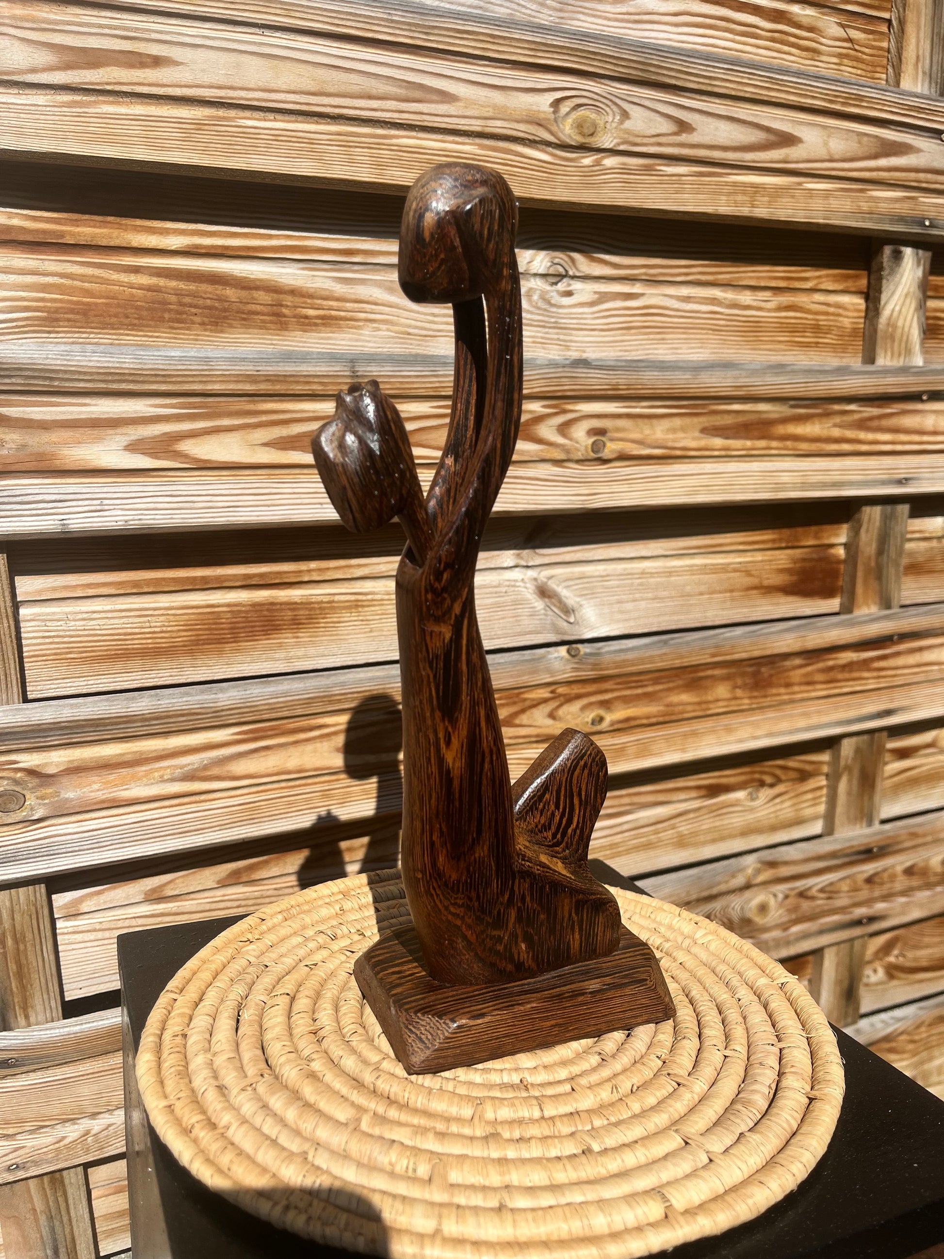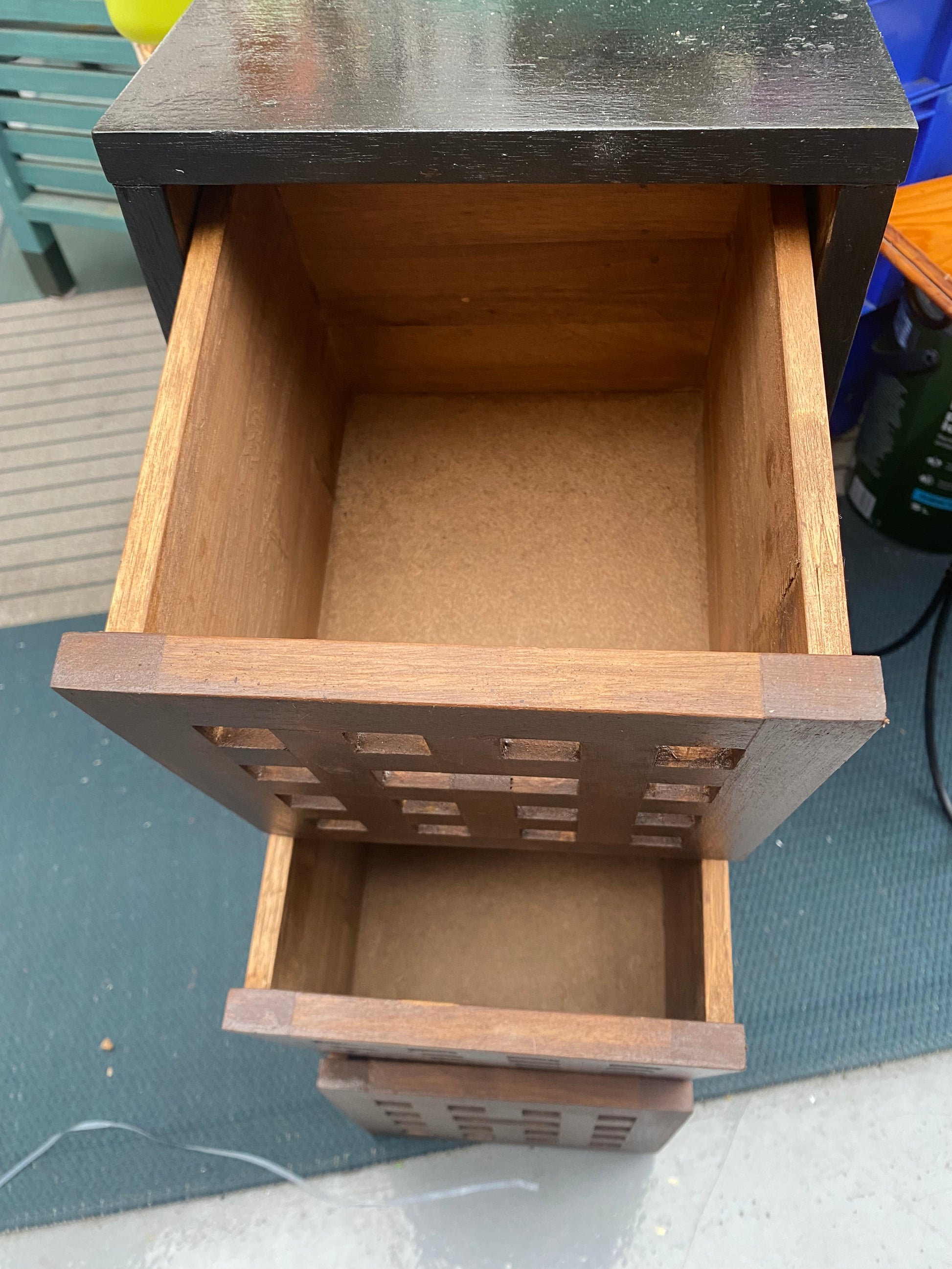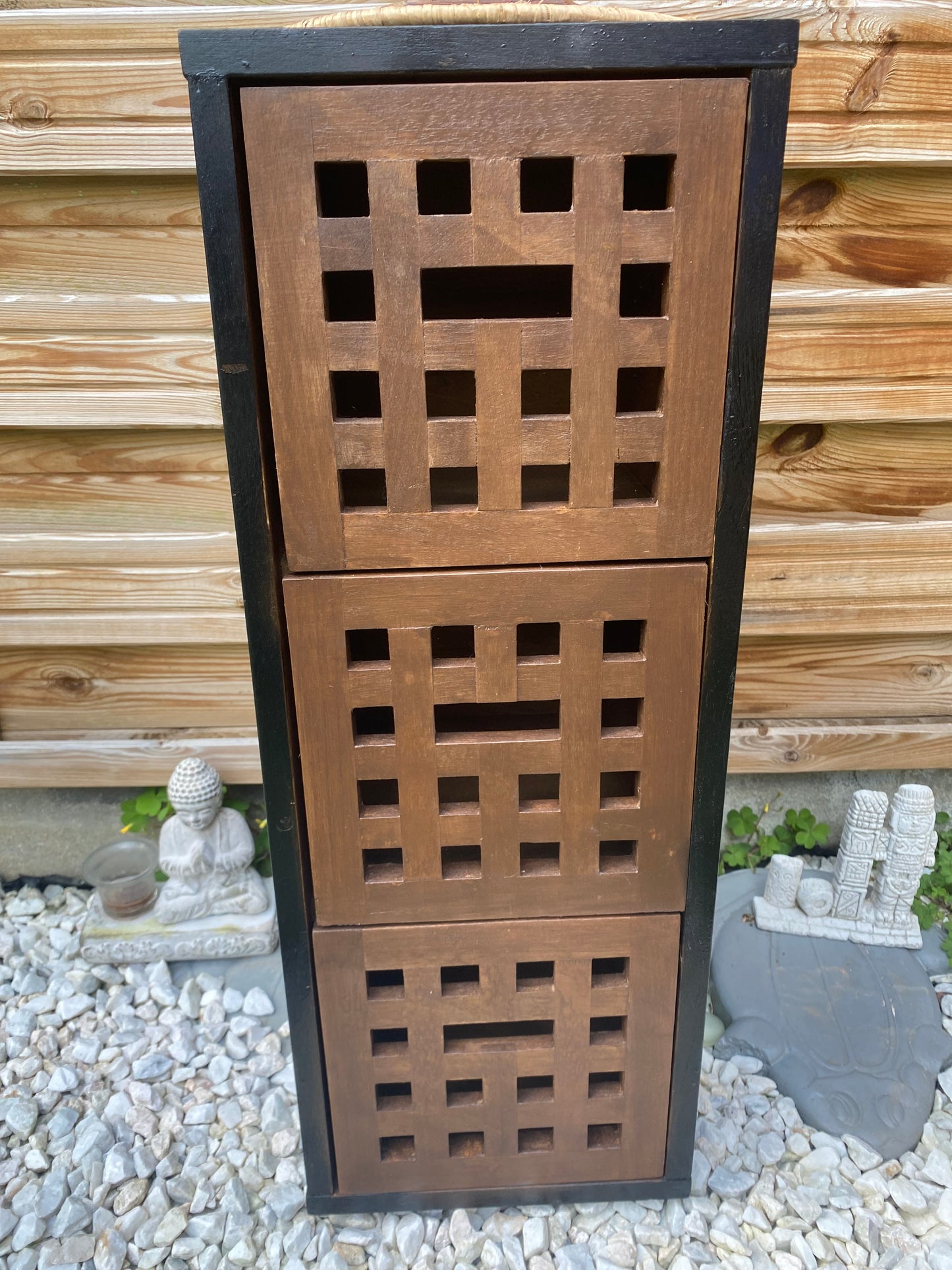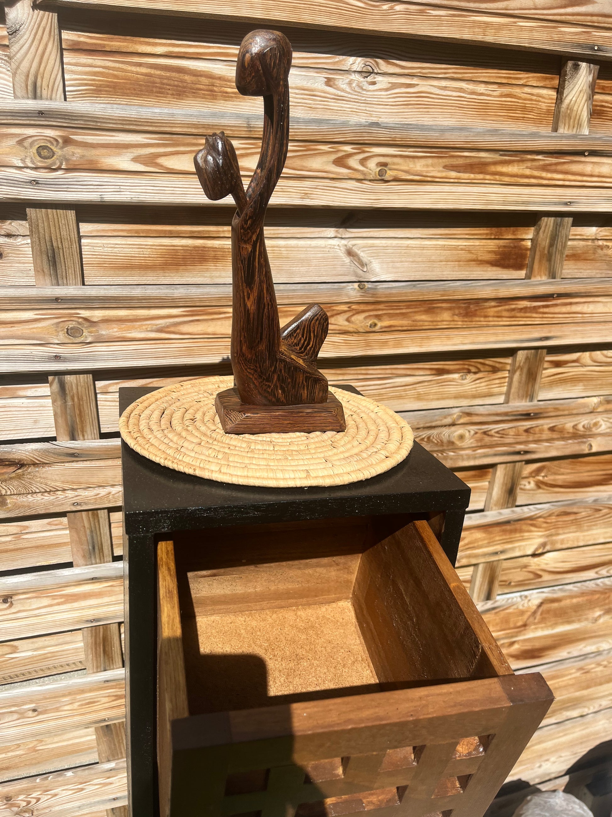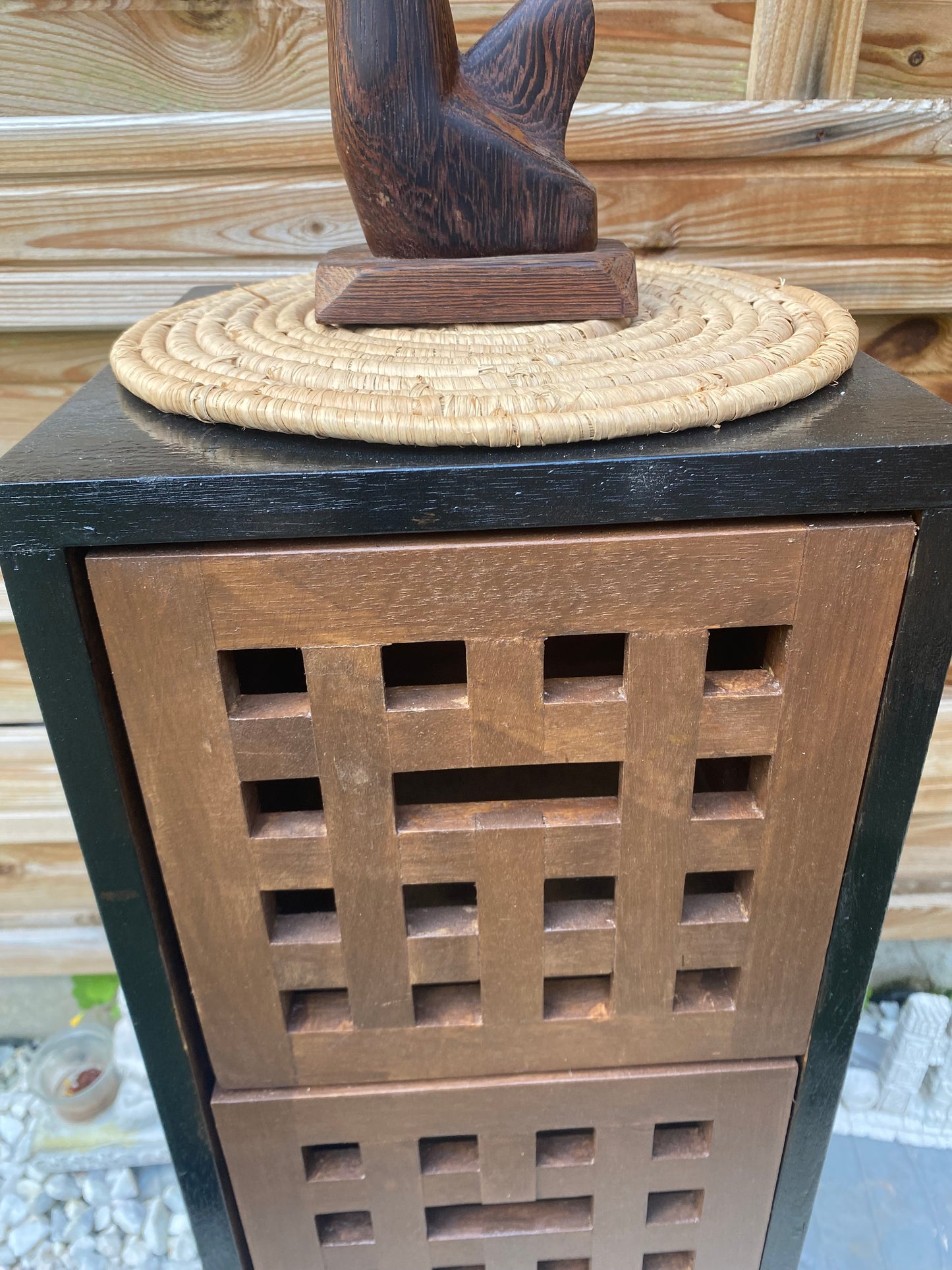 Meuble petite colonne noire avec 3 tiroirs carrés en bois foncé. Nous y avons ajouté un dessous de plat avec une belle statuette personnage qui boit de l'eau.