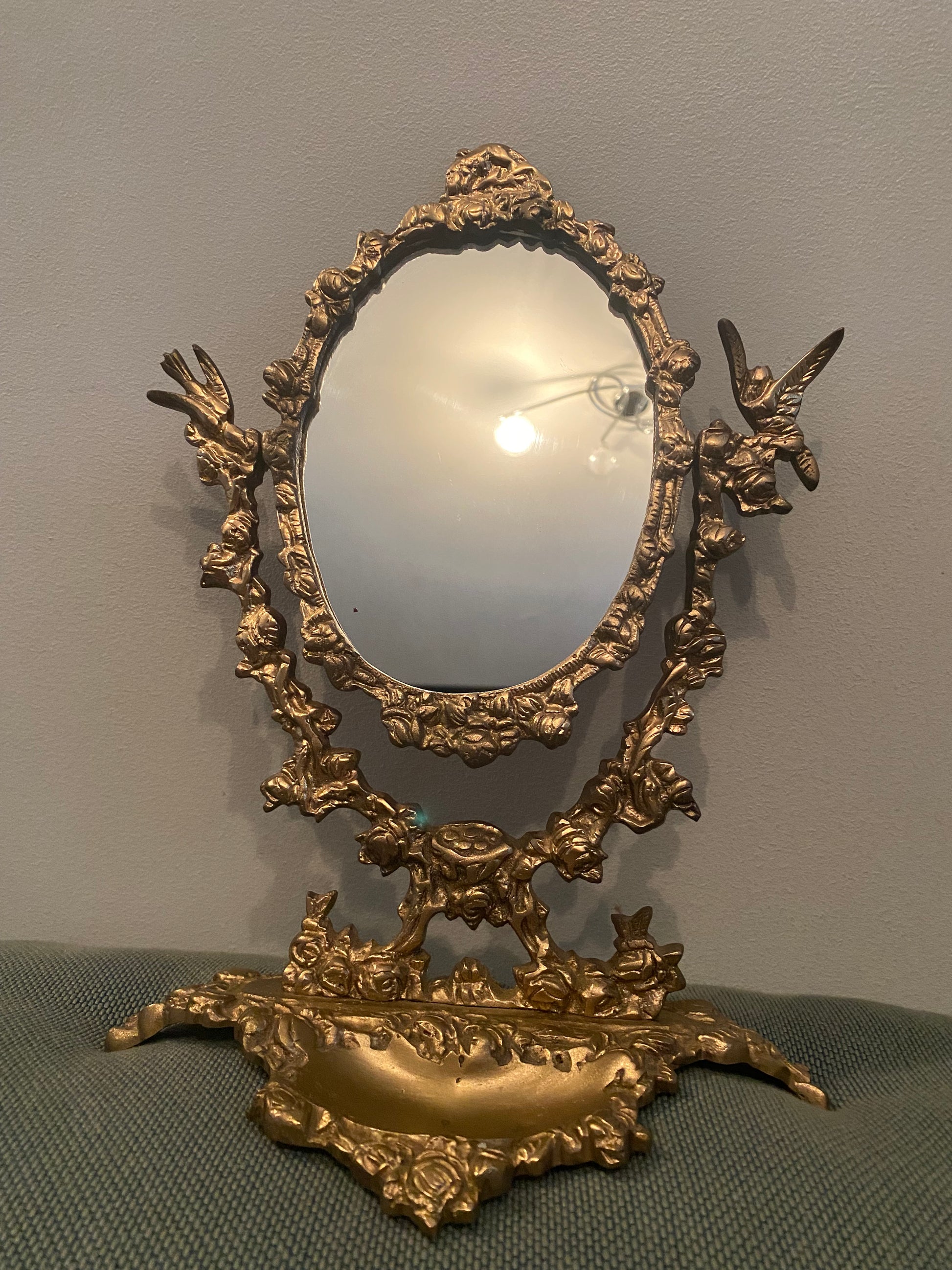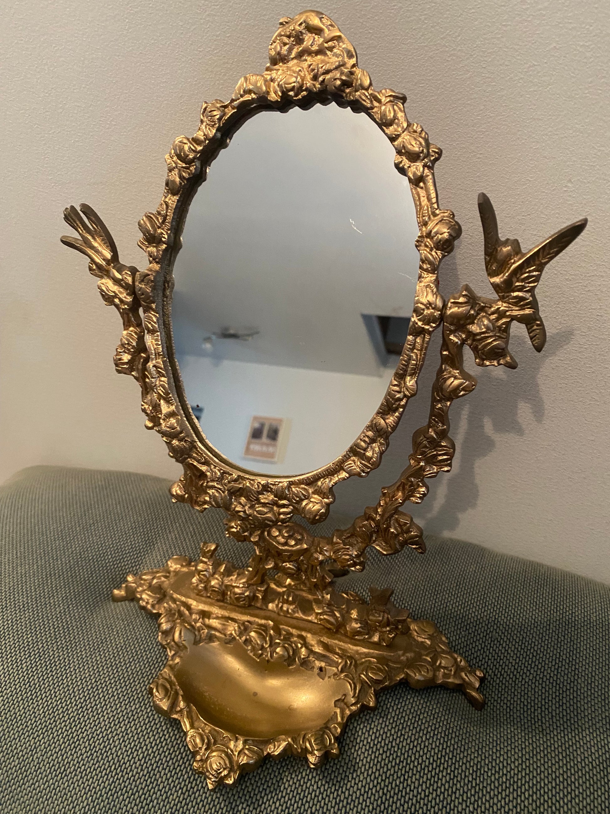 Magnifique miroir à poser, très joliment décoré, assez lourd, avec des décors de fleurs et d'oiseaux. En laiton doré vintage.