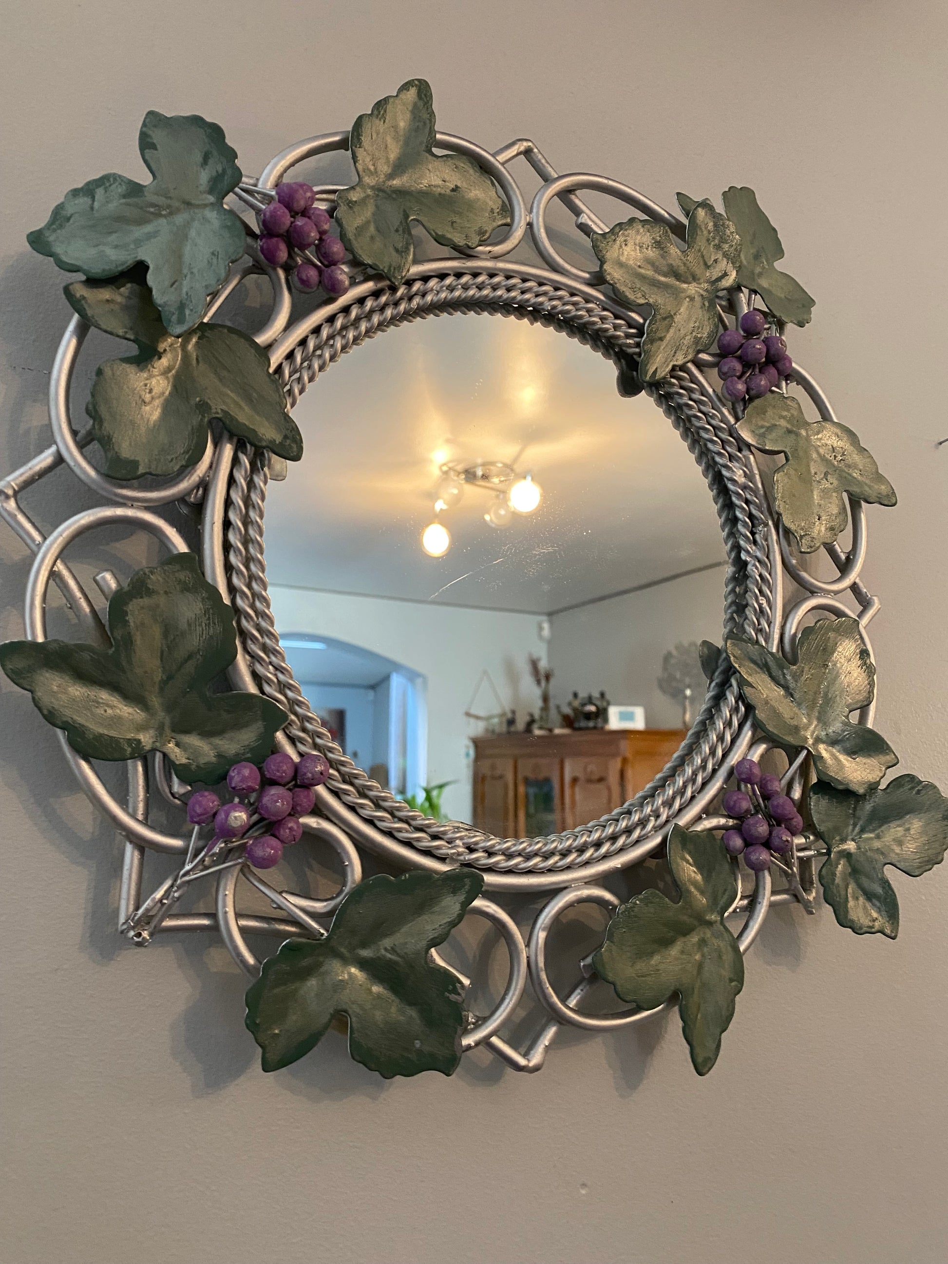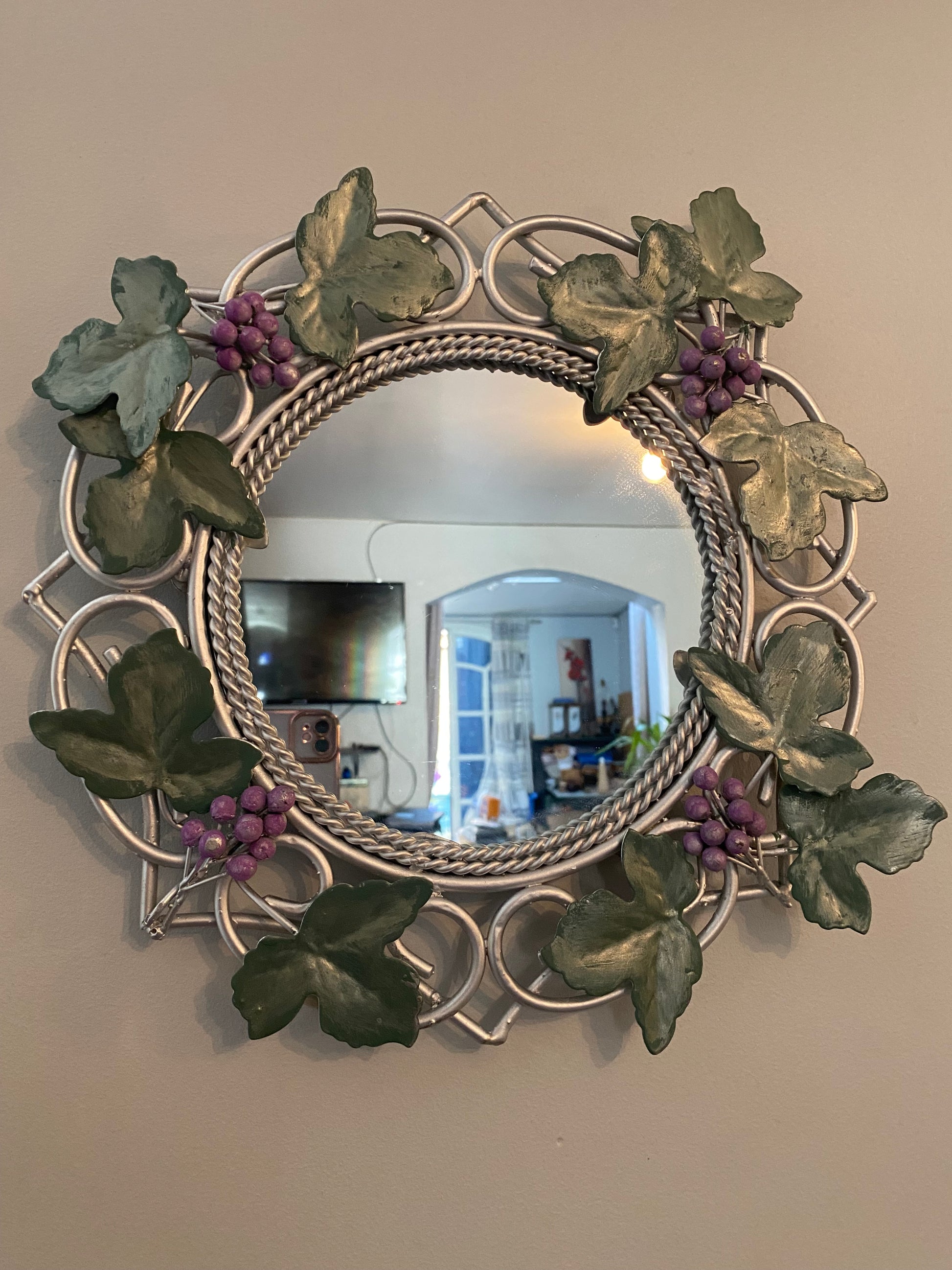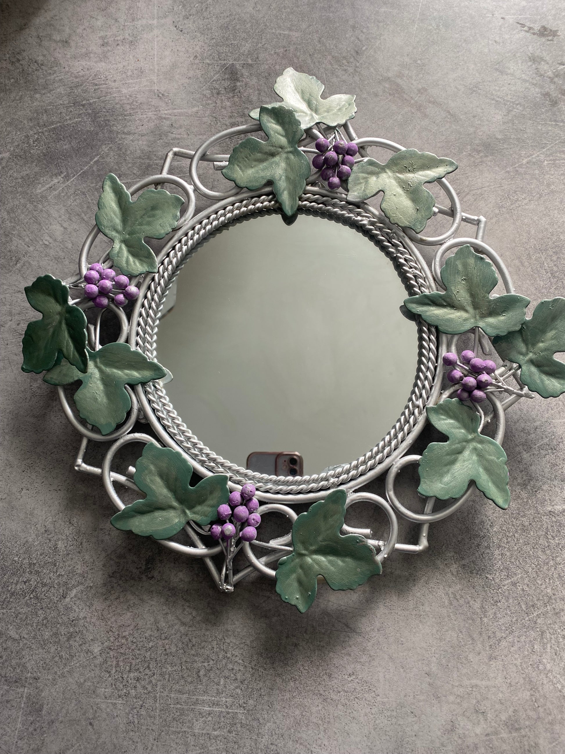 Magnifique miroir ancien, à décors de feuilles de vignes et grappes de raisins, en métal.