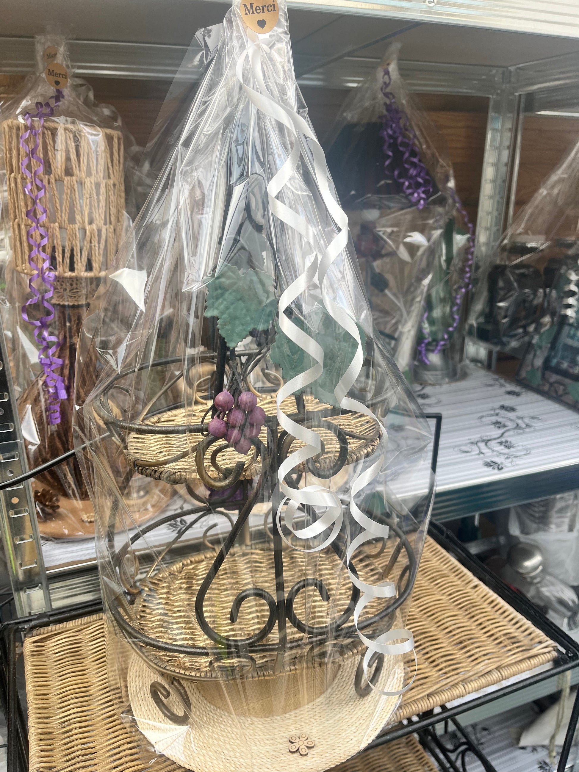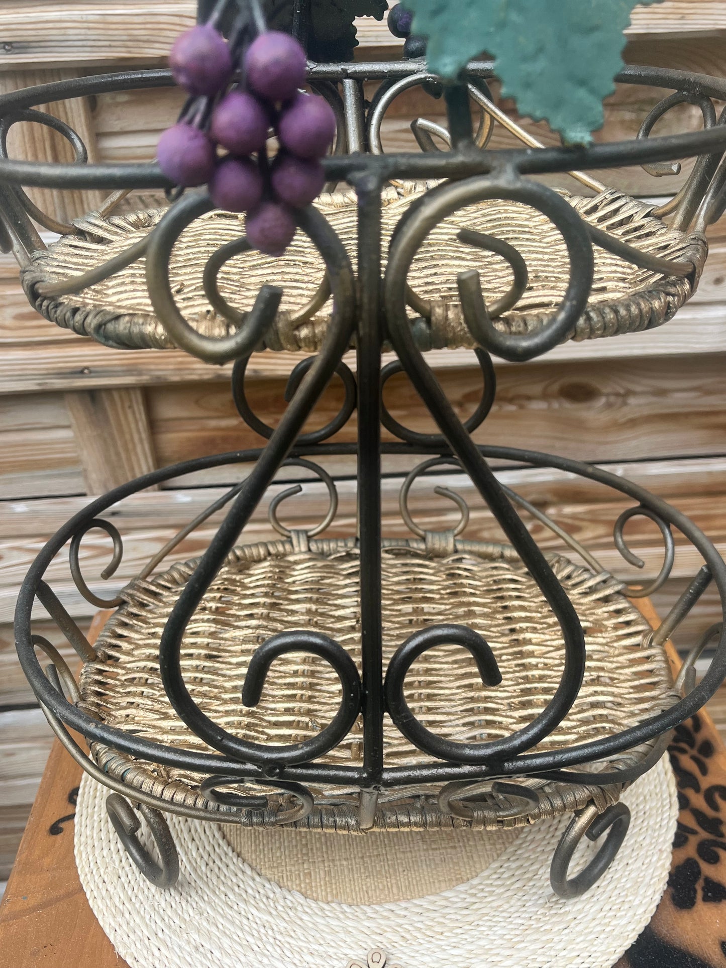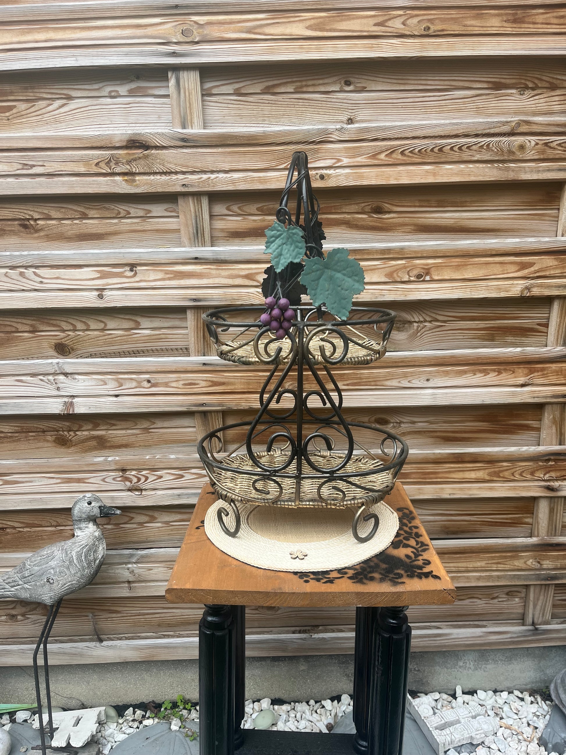 Très beau support double pour fruits. En acier et osier. De couleur noire, ou et feuilles de vignes et raisins.
