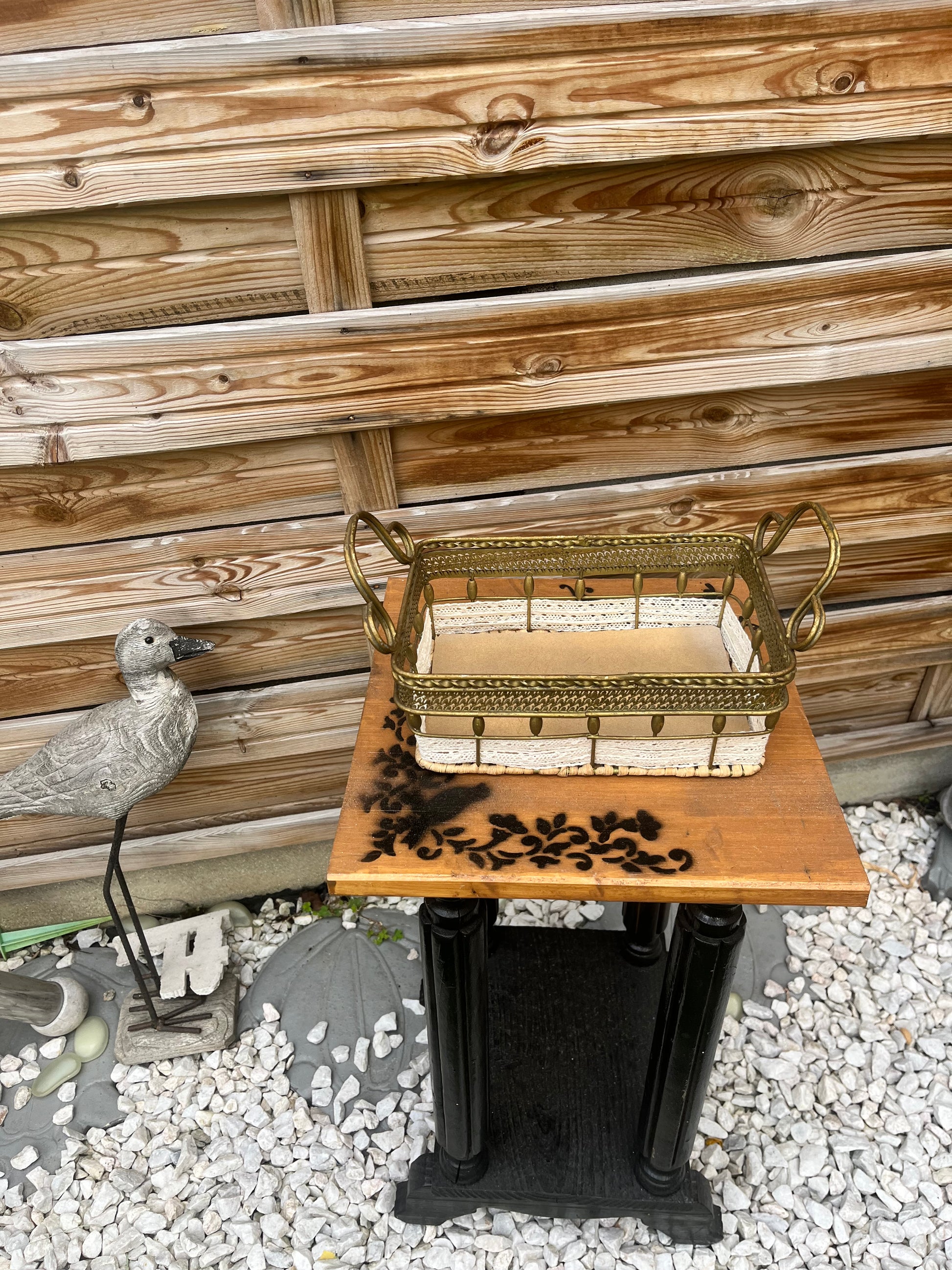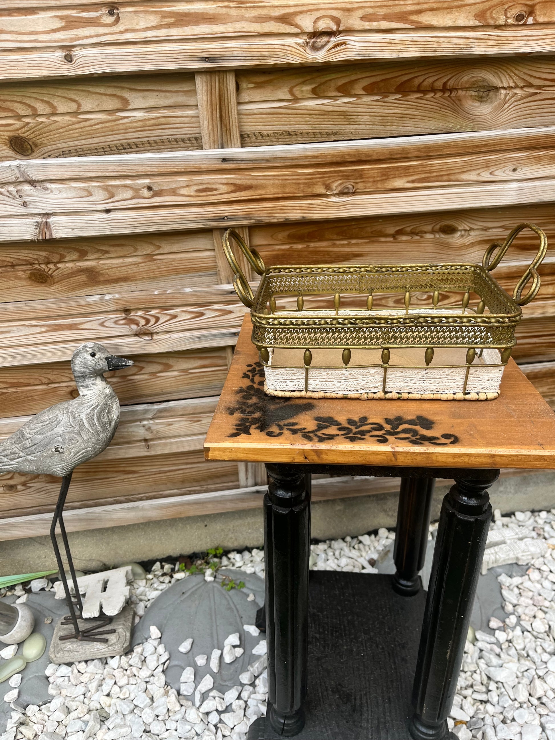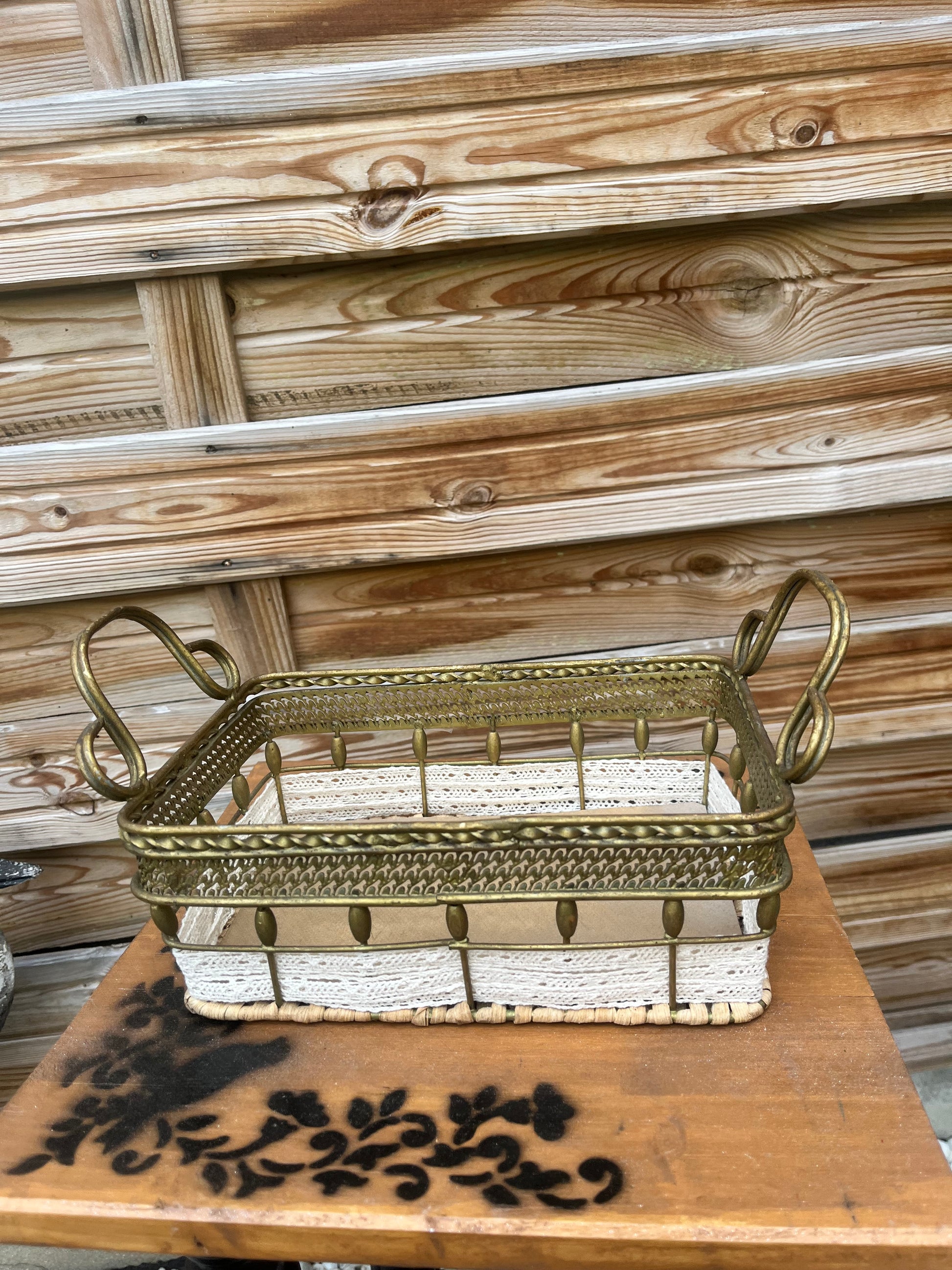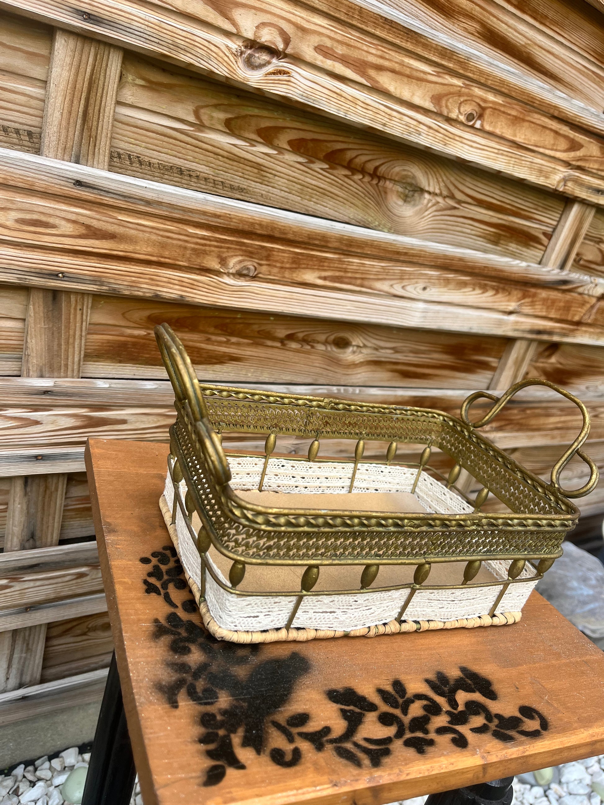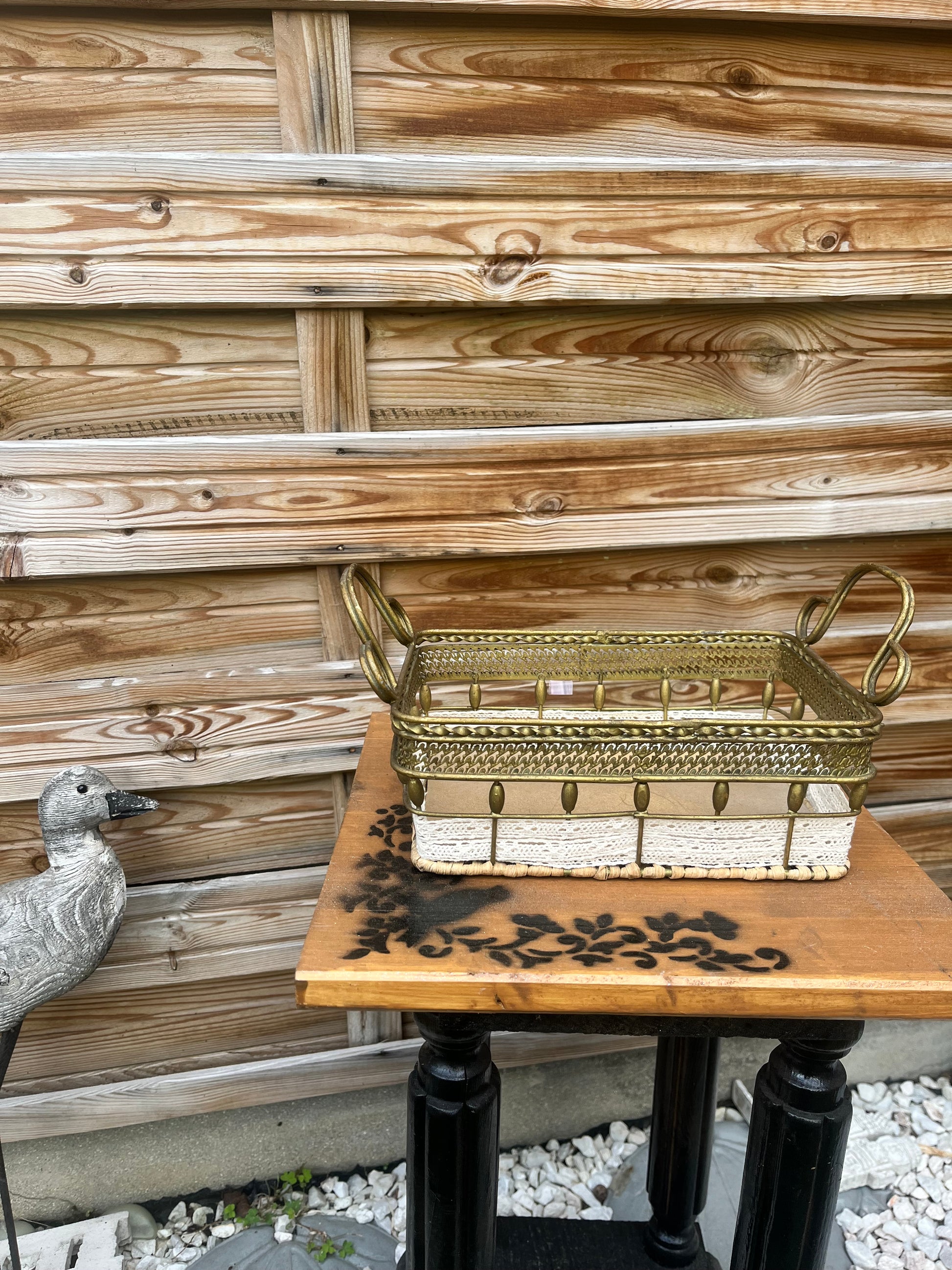 Petit panier rectangle décors ou et fond en osier, avec ruban crème.