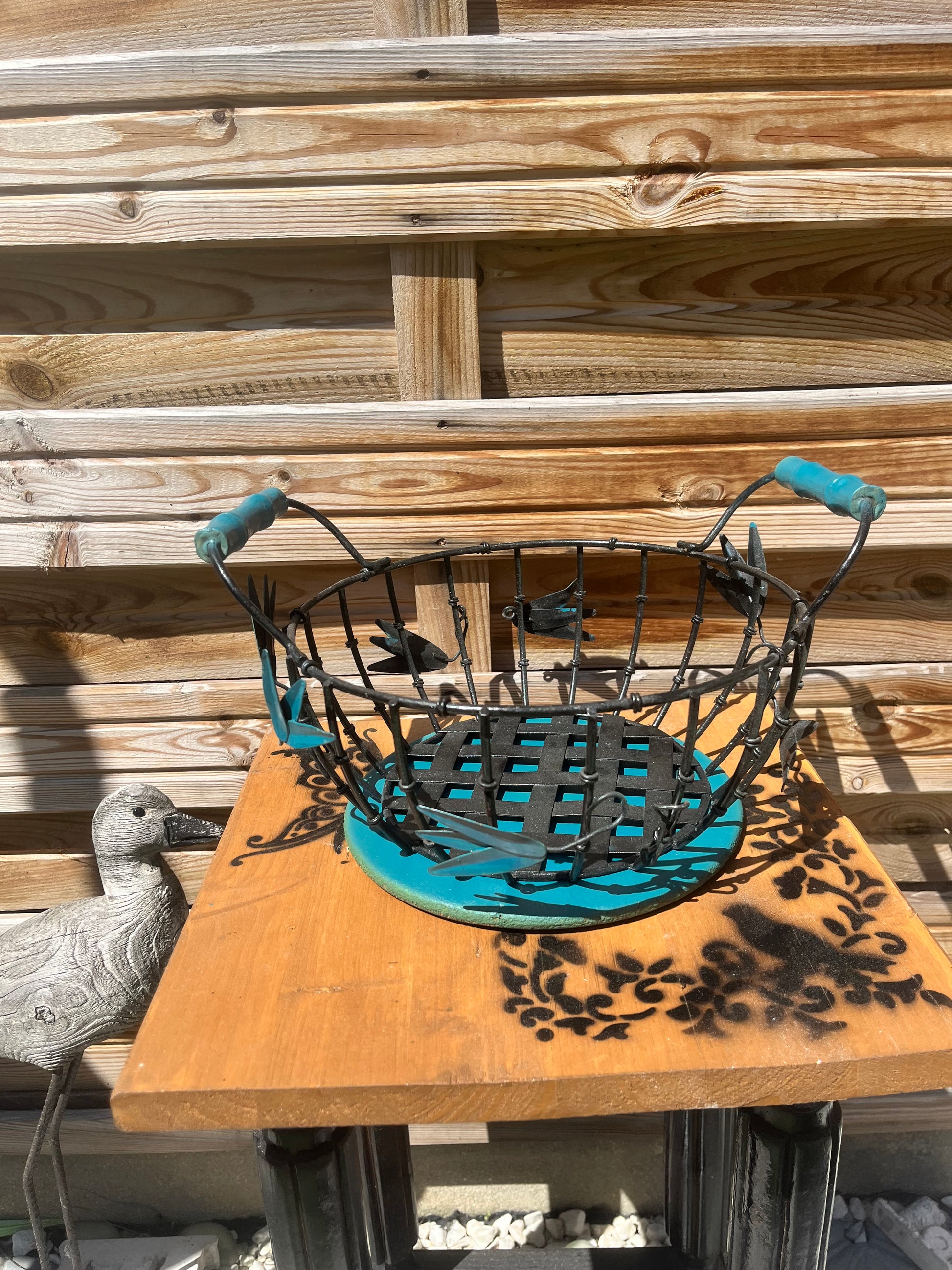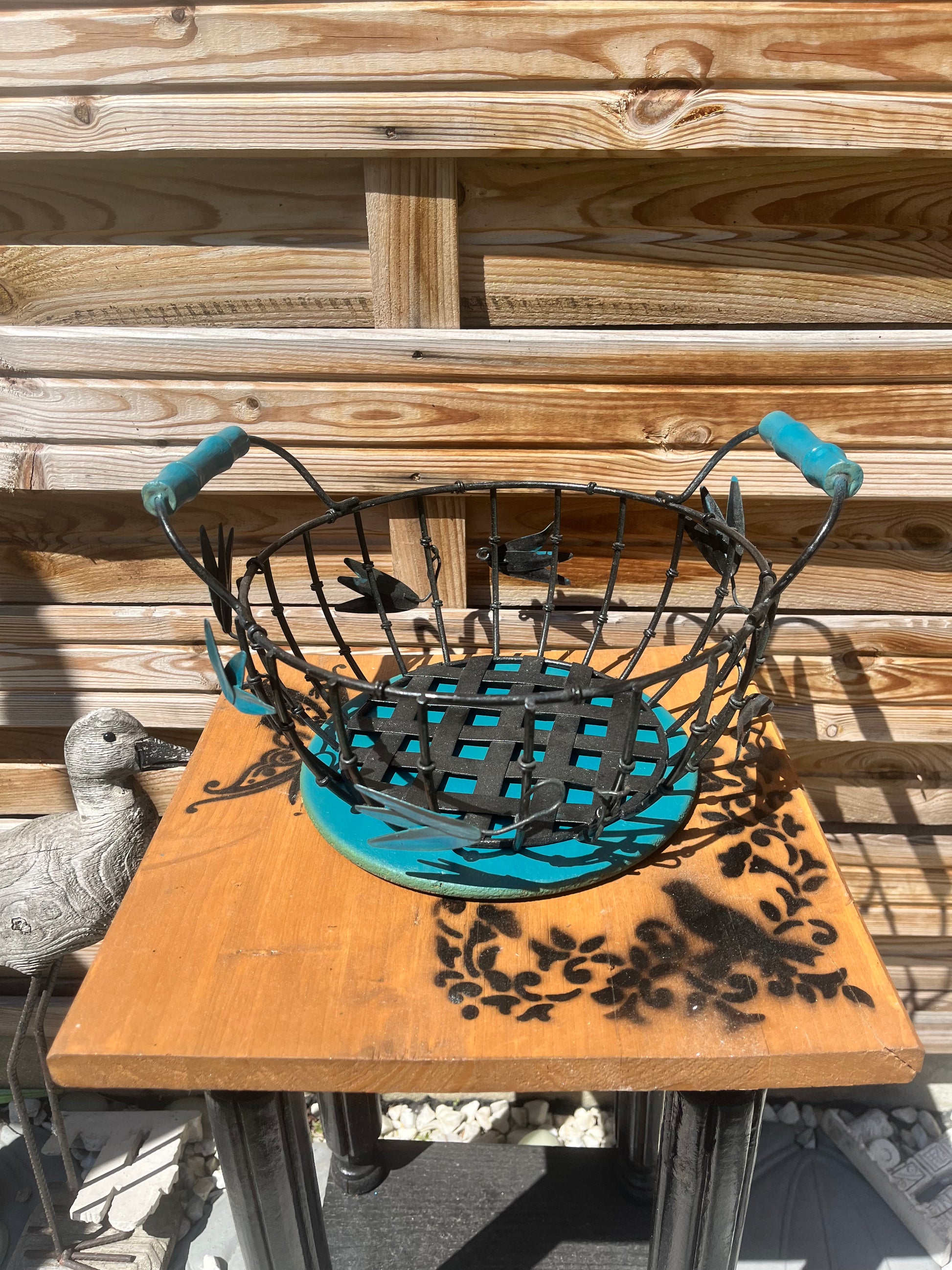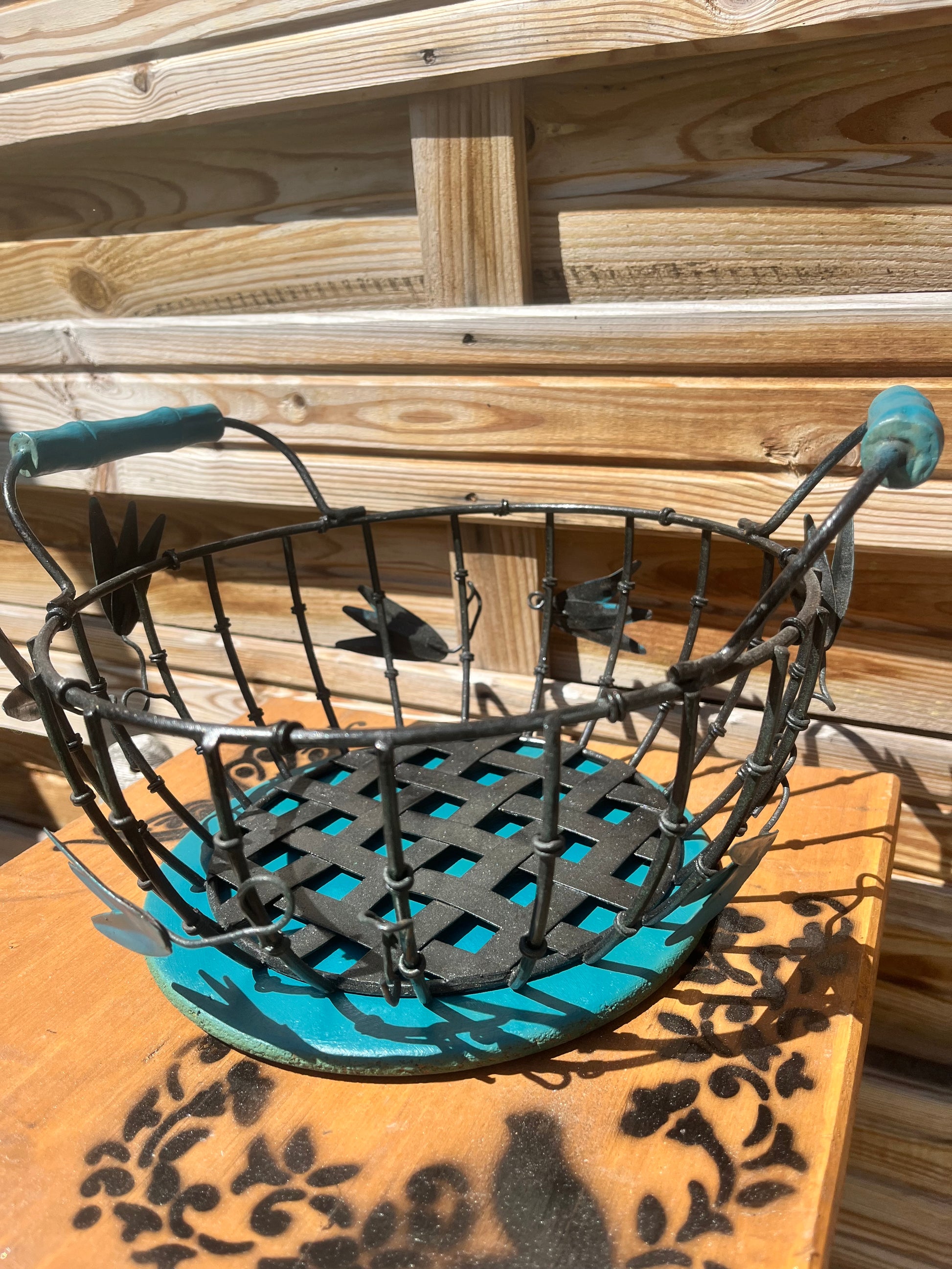 Petit panier rond noir, décors feuilles bleues/vertes et fond de la même couleur.
