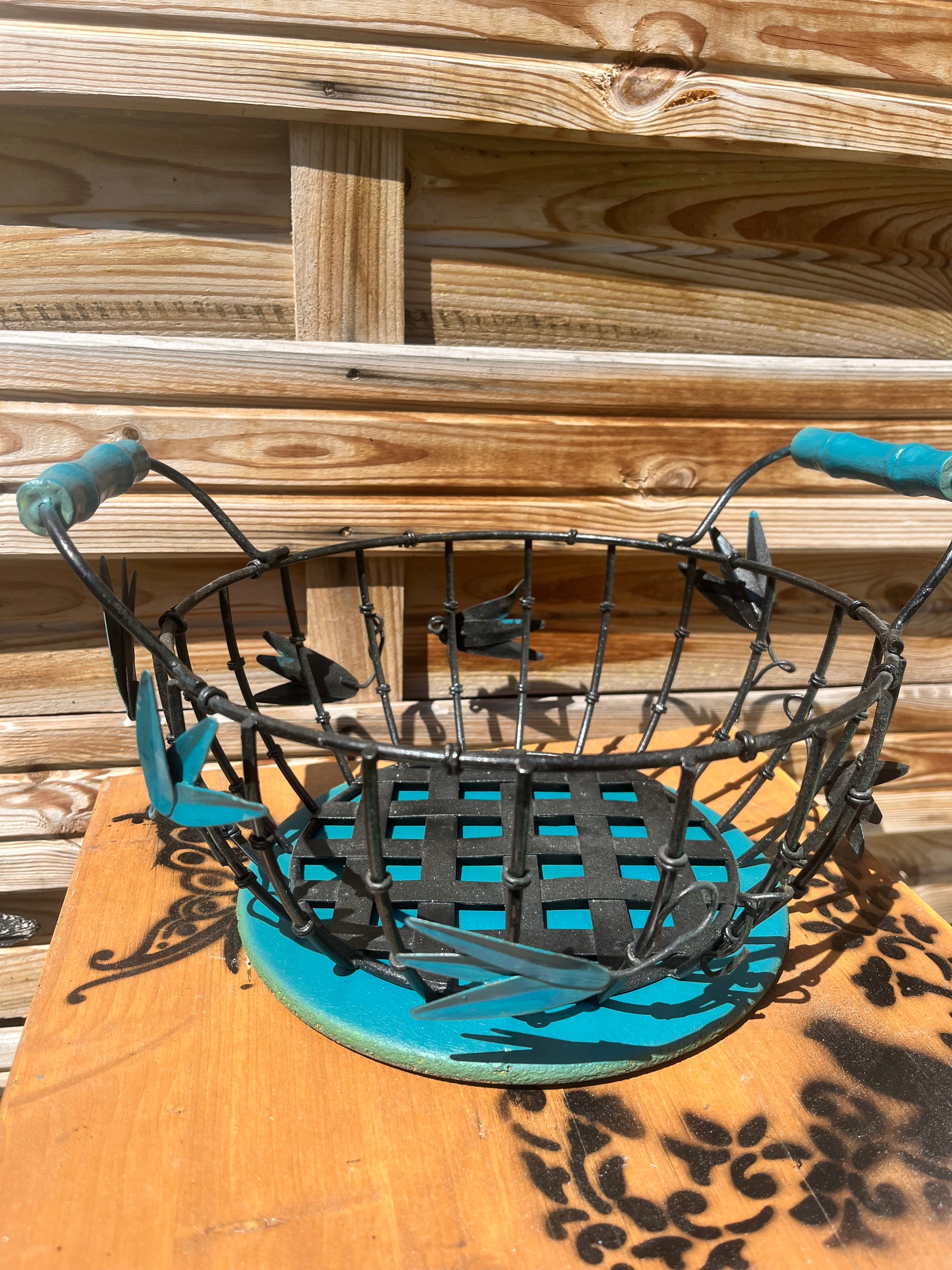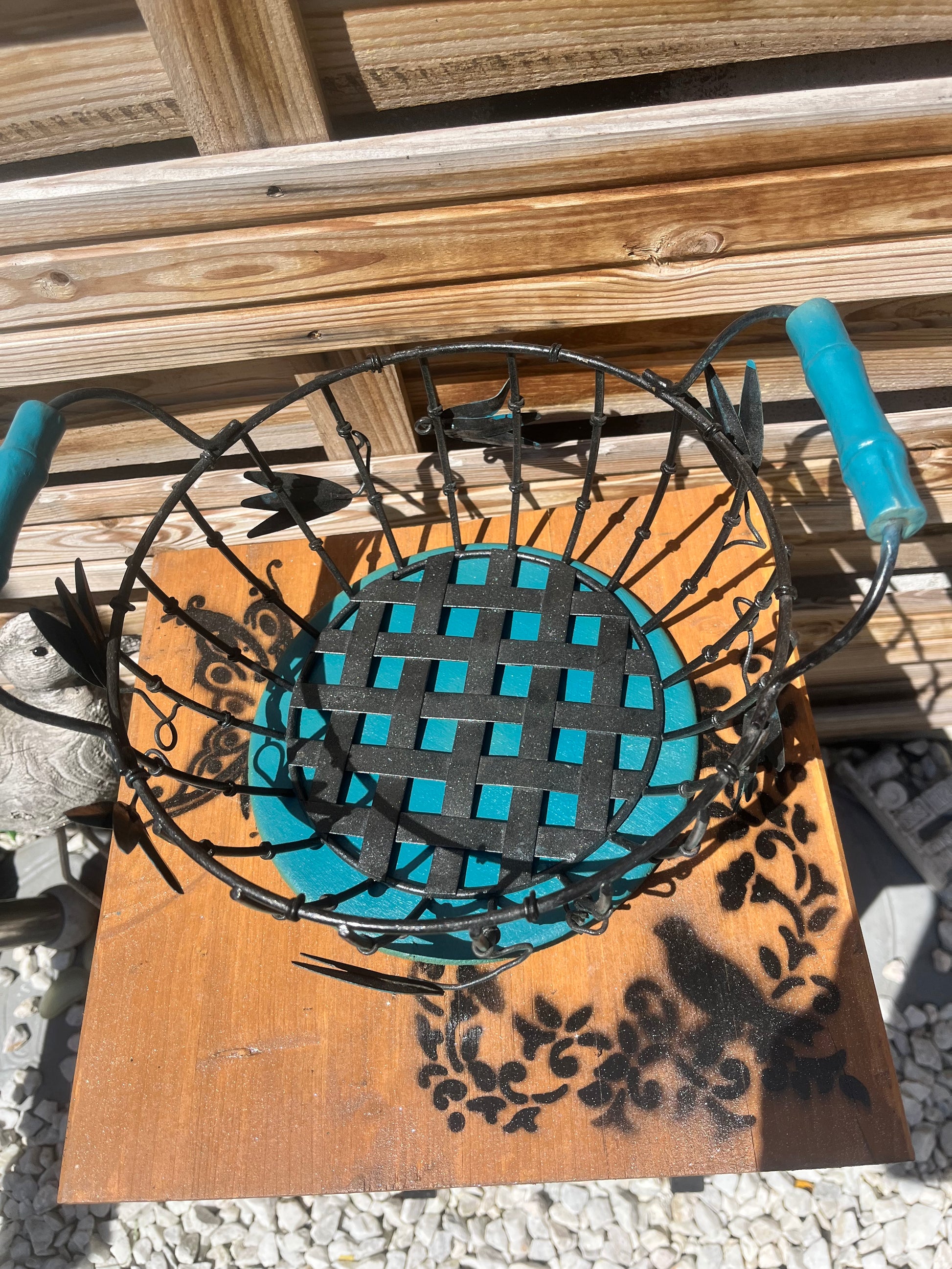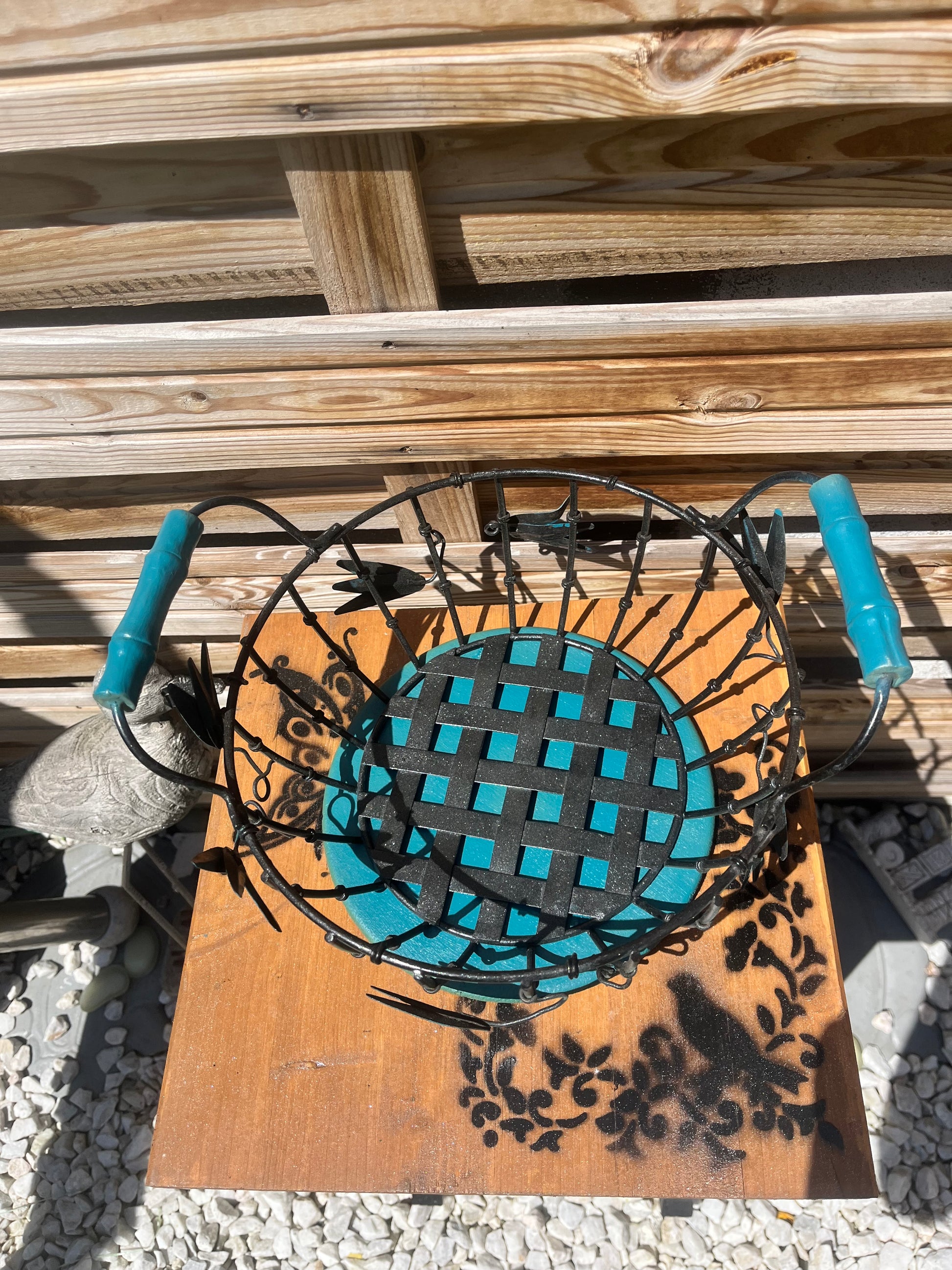 Petit panier rond noir, décors feuilles bleues/vertes et fond de la même couleur.