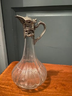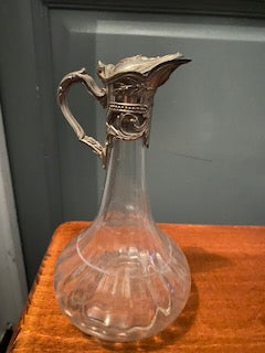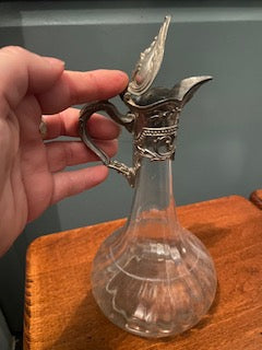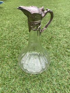 Petite carafe élégante en verre, avec un bec verseur en laiton ou étain.