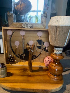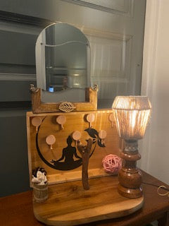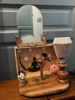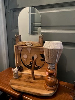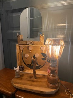 petite coiffeuse tout en bois à poser sur une commode ou une table : ensemble original et unique composé d'un miroir en hauteur posé sur une petite étagère, un arbre à bijoux, une lampe à éclairer, une pomme de pin, ainsi qu'un petit petit pot à fleurs séchées, le tout disposer sur une ancienne planche à fromage. Ce qui en fait, une petite coiffeuse très originale et unique. (Vendu sans bijoux)