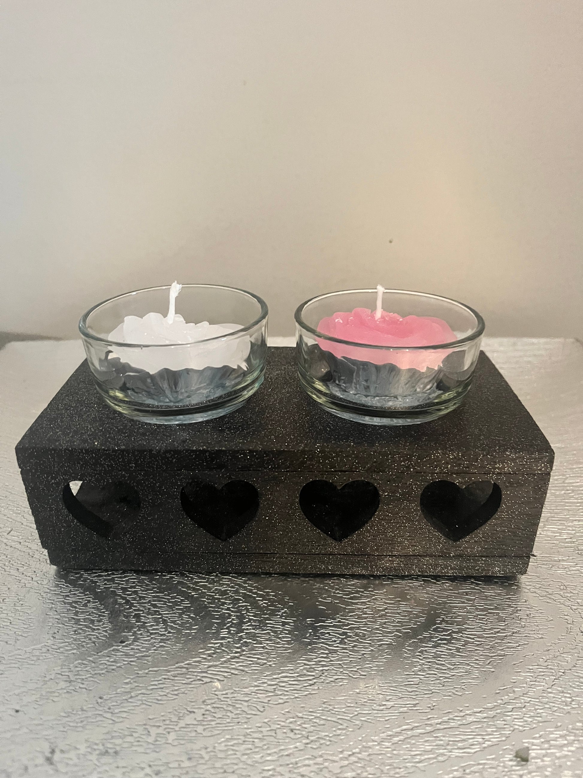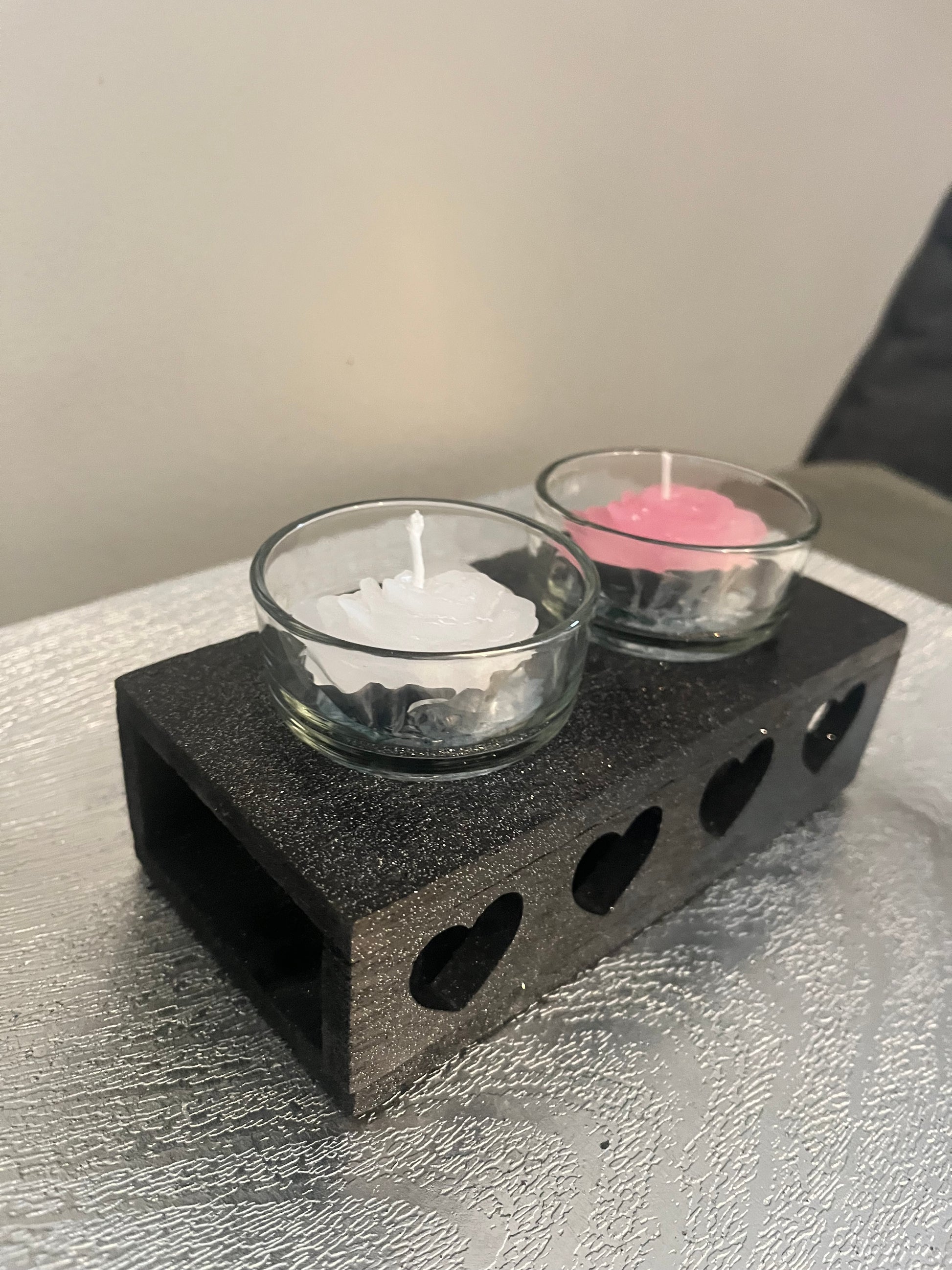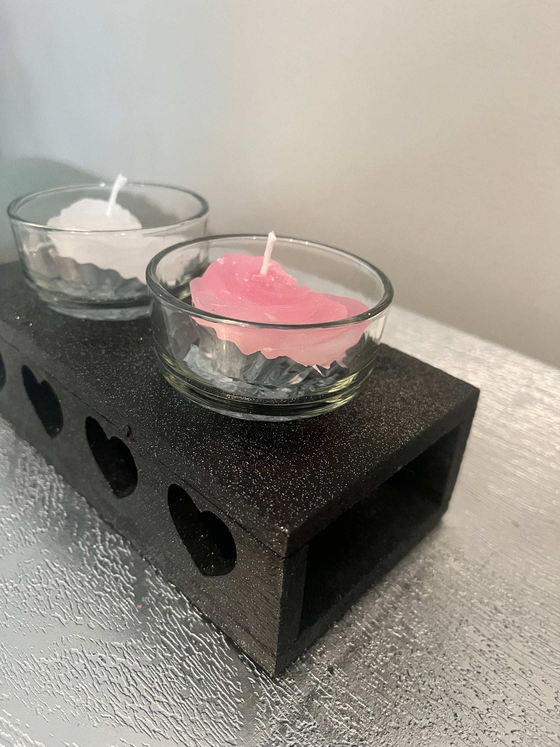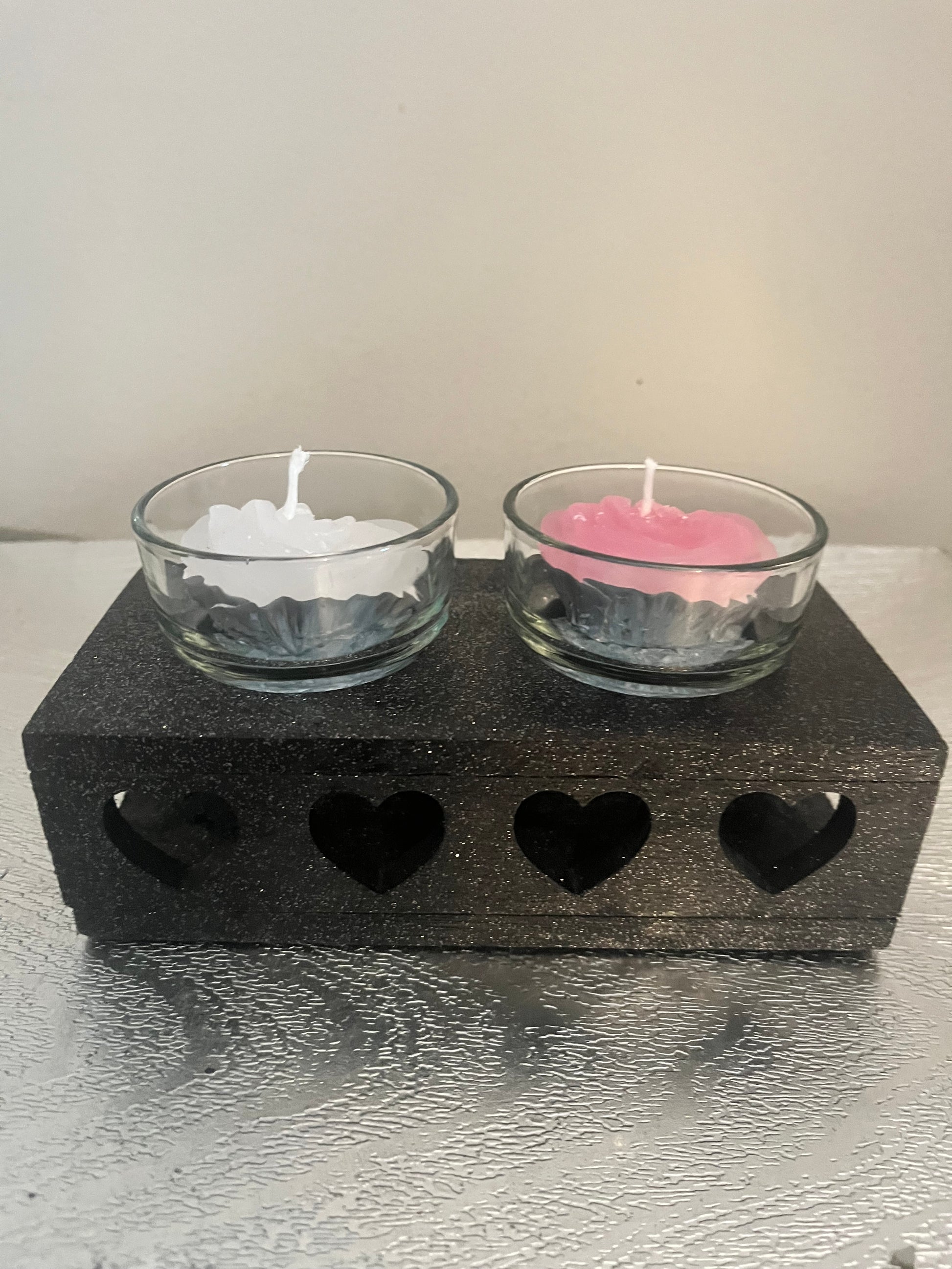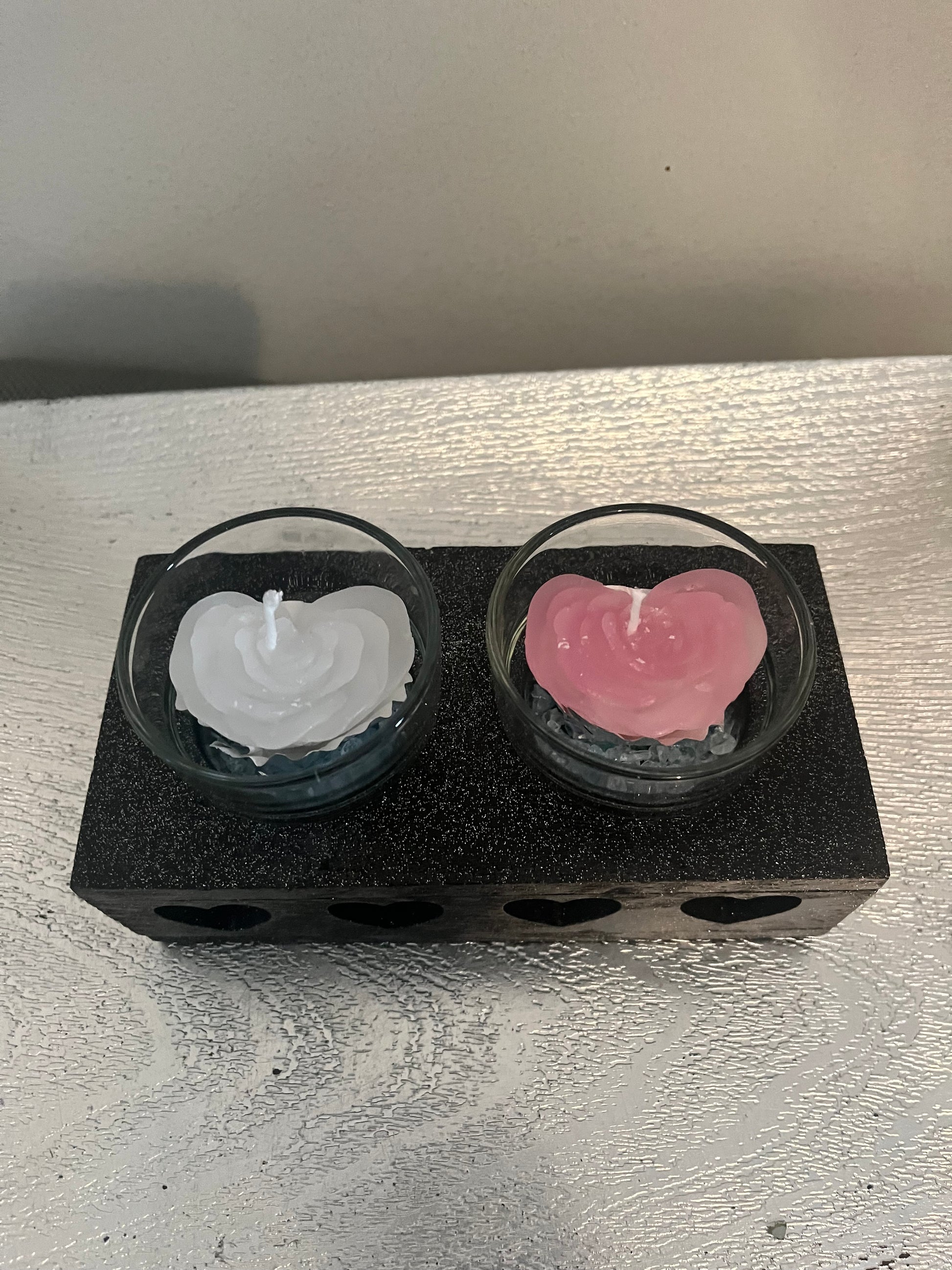 Beau porte bougie en bois noir brillant, avec décors cœurs. Les bougies sont également en forme de coeur. Cet objet pourra ensuite servir de vide poche, ou autre.